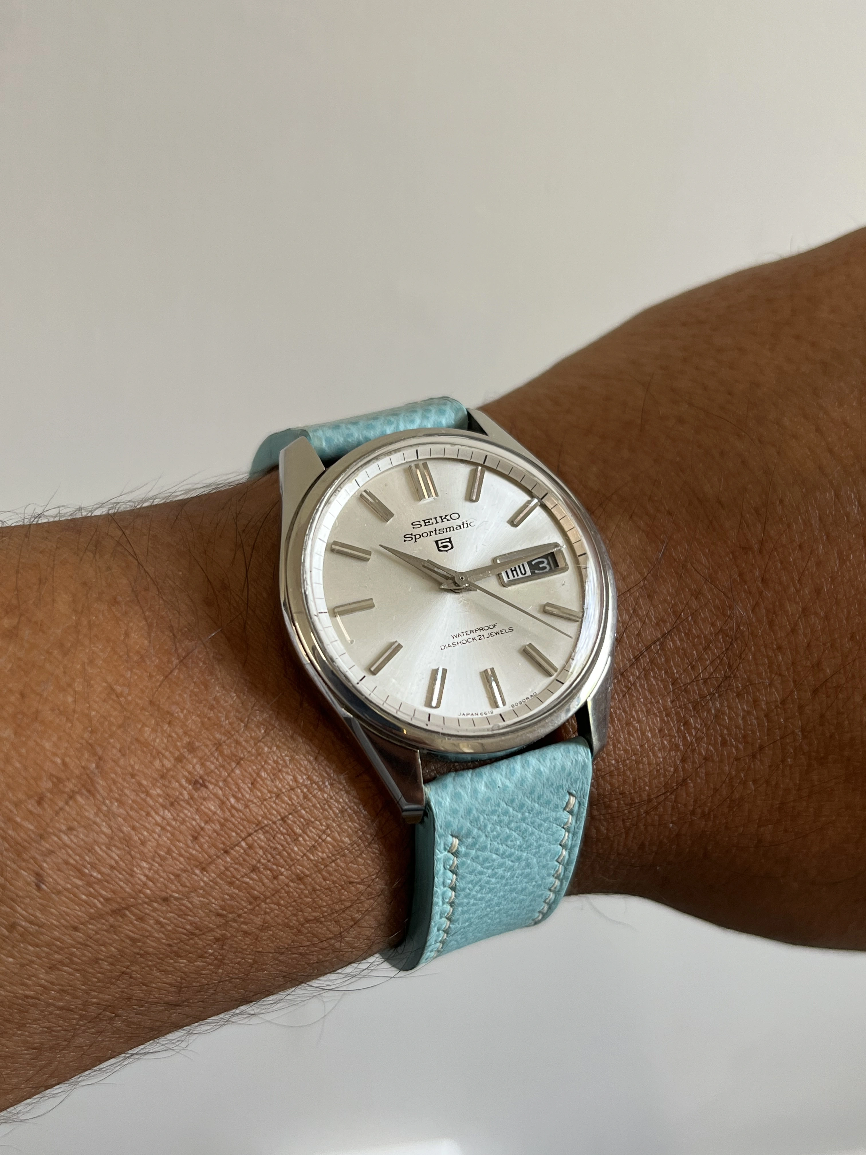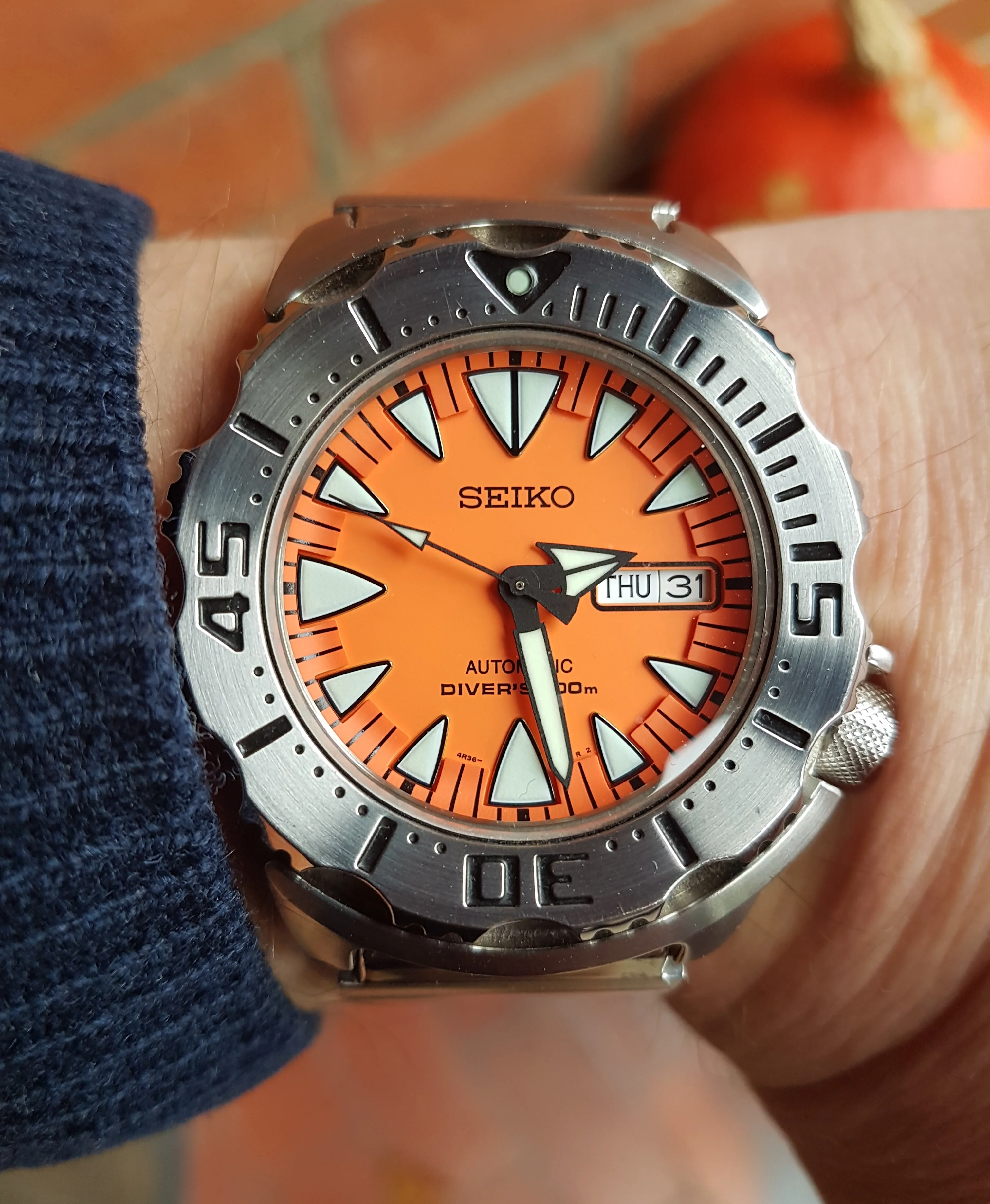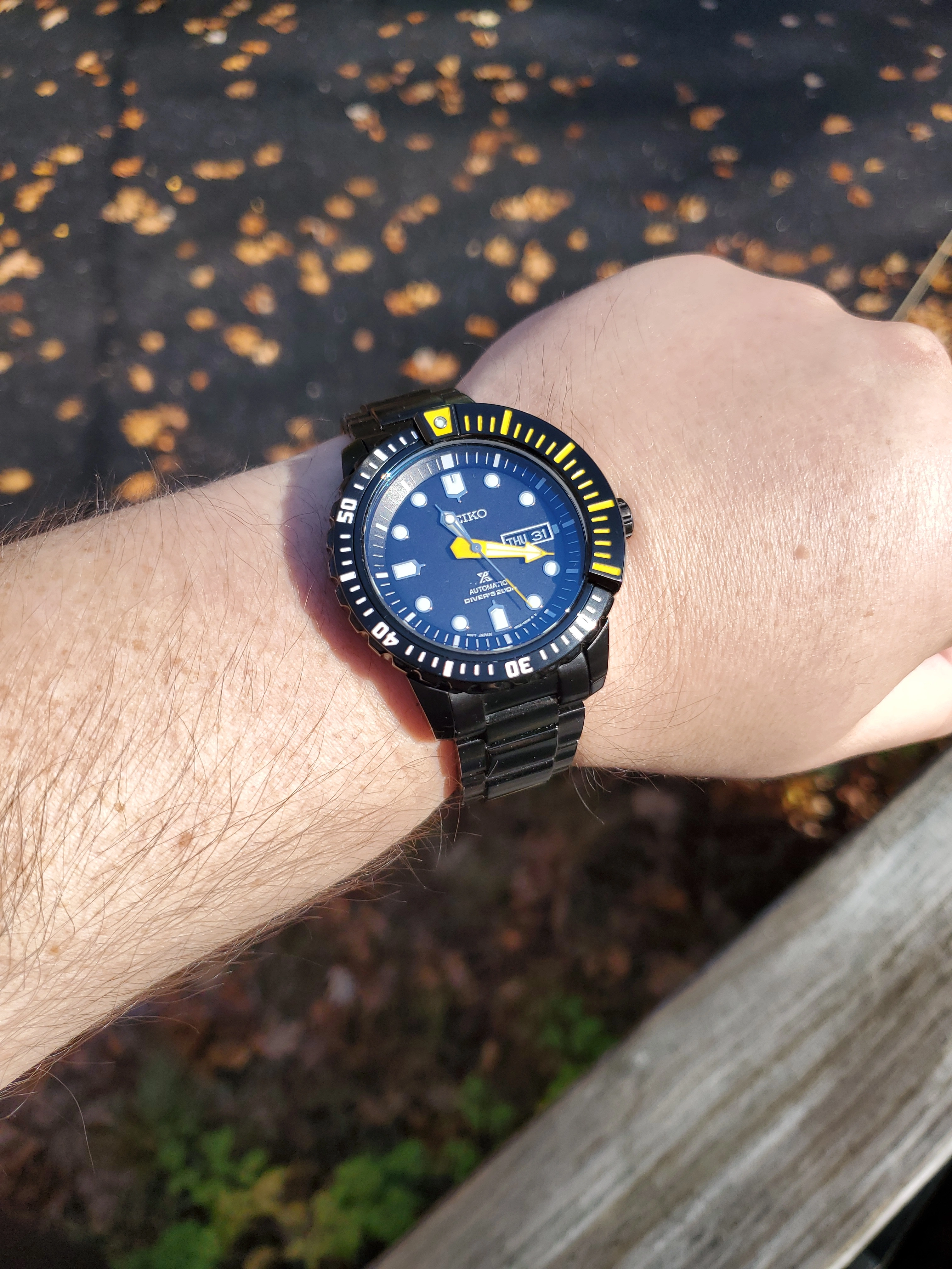 This "Mohawk" started as a ref. SRP633 salesman's sample. No movement, hands mounted on an arbor taped to the back of the dial, cut sections of the day and date wheel taped also, no case back gasket, weird looking crystal. I bought a new 4R36 movement, all new seals, I broke the crown stem so I had to go aftermarket and get a new crown and cut a new stem, and a new flat sapphire crystal with internal AR. It took some time, but it all came together. Not too bad for a first timer.