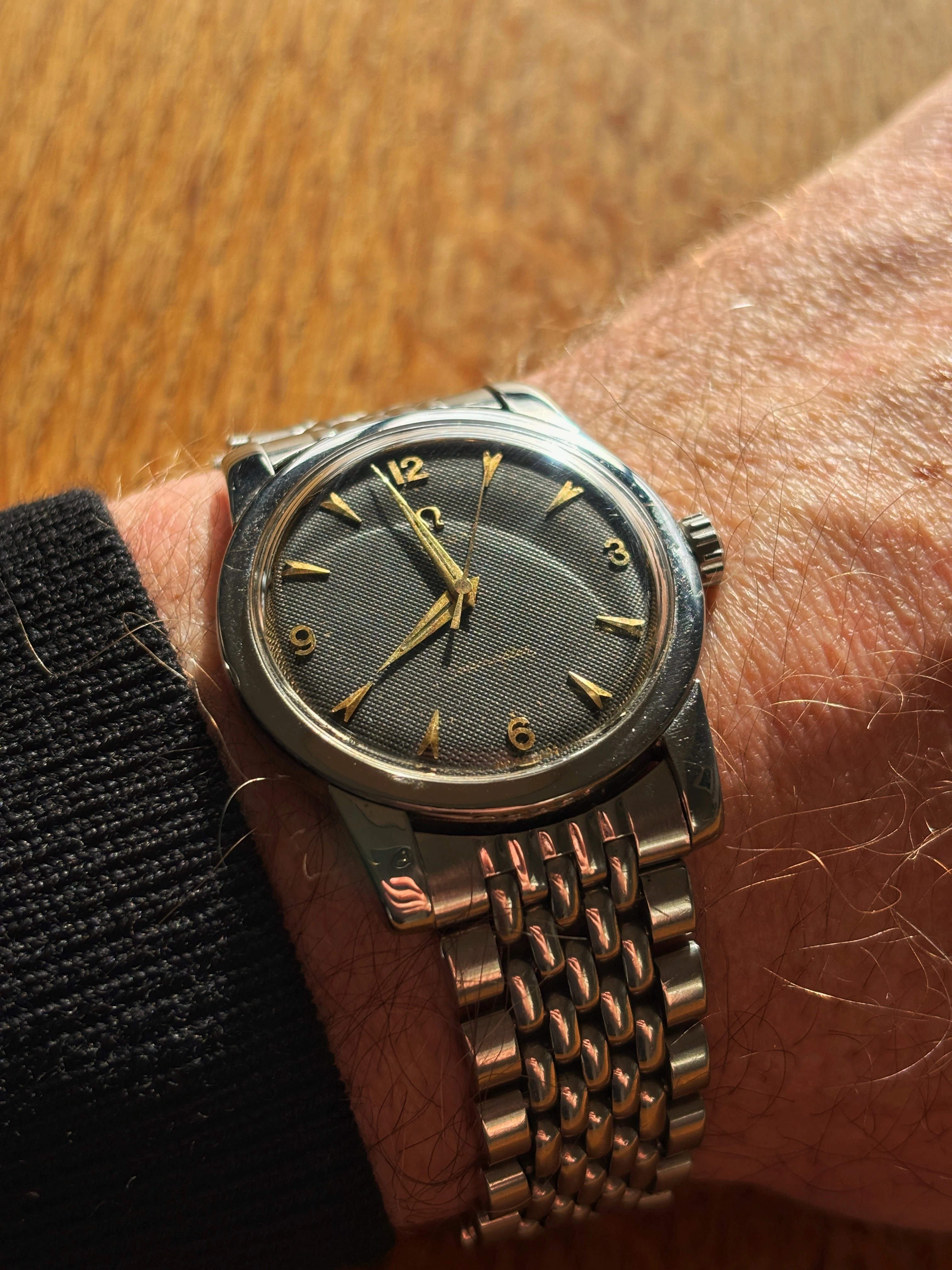 Posts 599 Likes 4,952 Makesbelieve ·Nov 4, 2024 Seamaster Reference: 2761 1SC Year: 1954 Cal: 420 Dial: Waffle Black Dial w. gold furniture Bracelet/Strap: Beads of Rice 1502