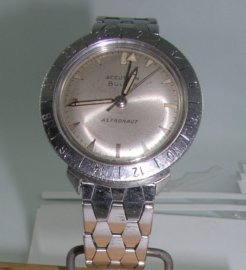 This is not on my wrist yet, but it will be later today. So I'll show a file photo of it. Accutron 214 Astronaut from 1964. During a watch exhibit recently, a friend and I consolidated our collections of 24 running Accutron 214 and 218 watches into one cabinet. In a quite room, you could hear them running from 3 feet away!