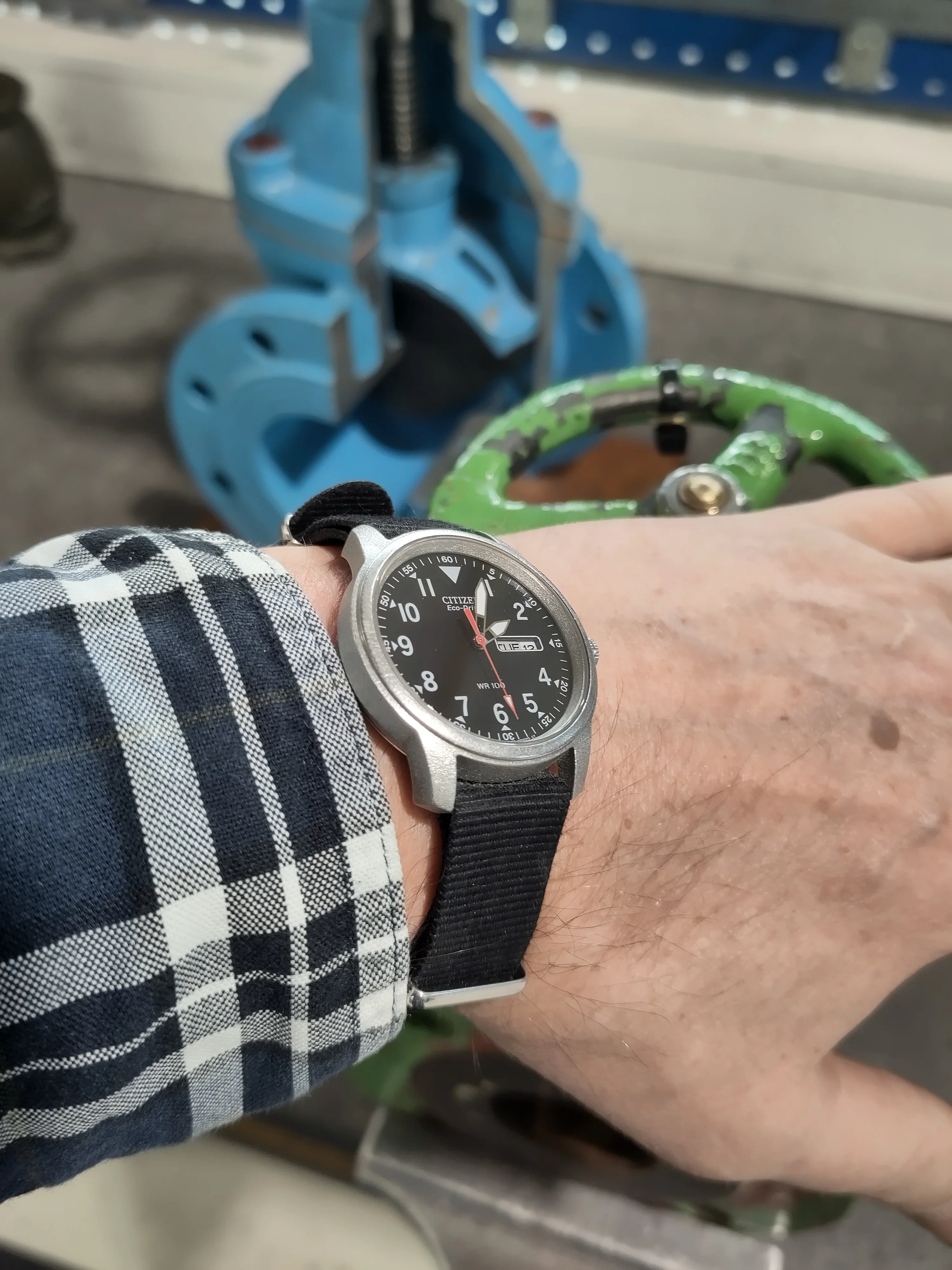 Citizen BM8083-E3 (or something like that). I got more fond of this little solar powered field watch after I sand blasted it and swapped to sapphire crystal. If it only had stronger lume, it would have been perfect. There is valve week in the workshop.