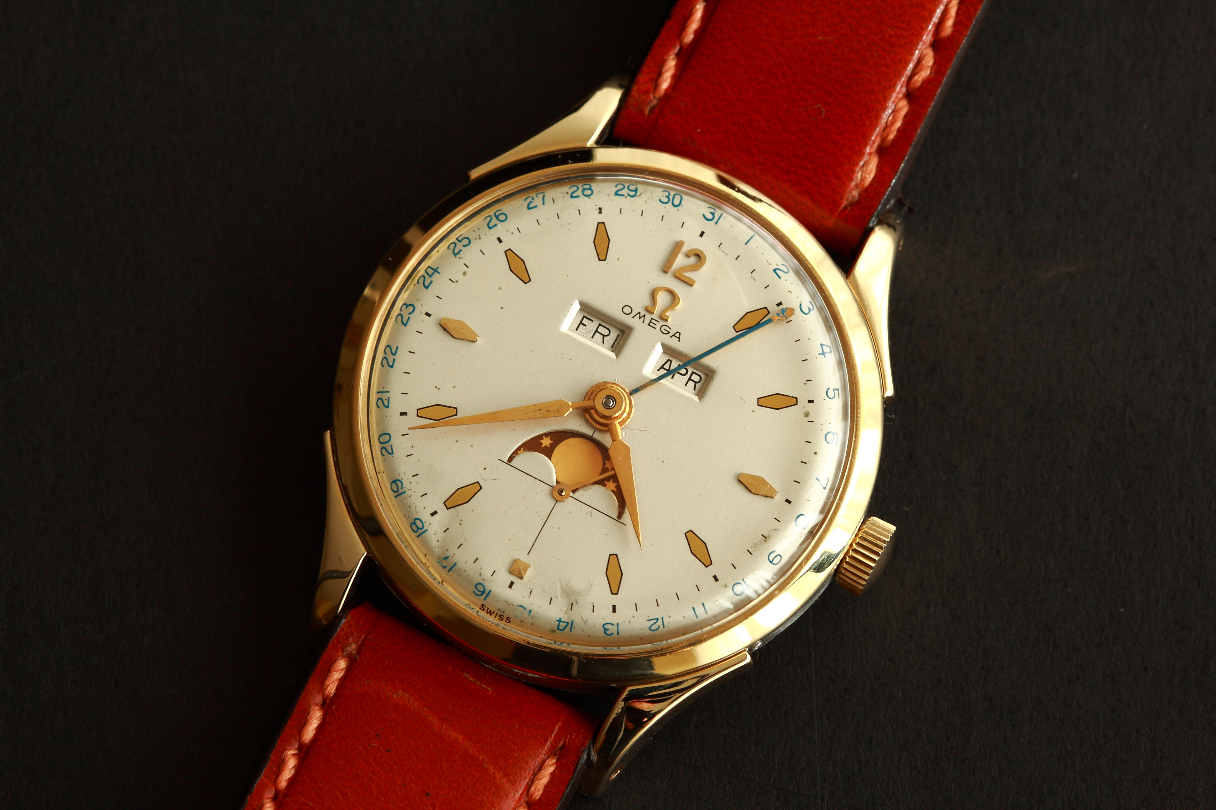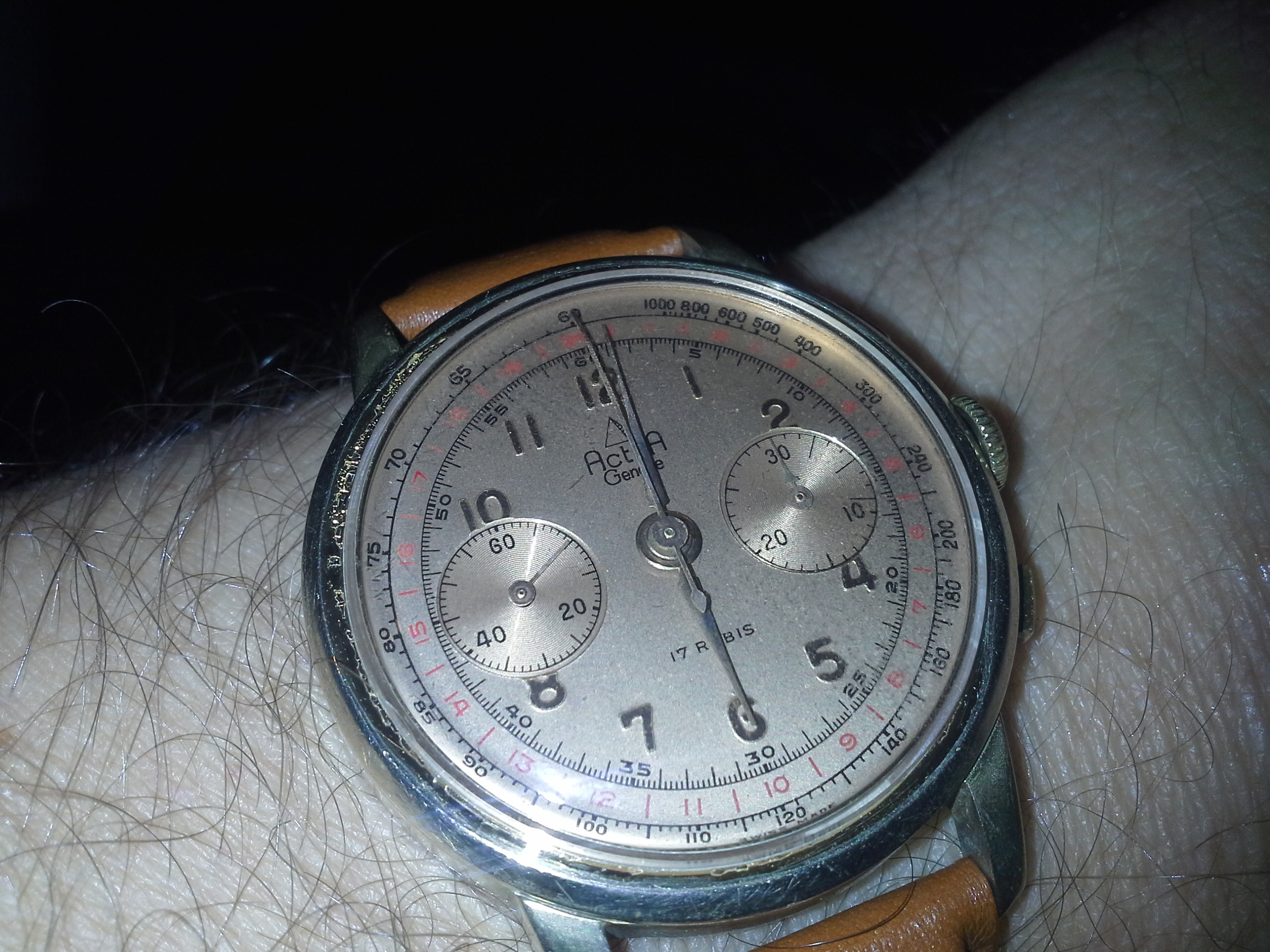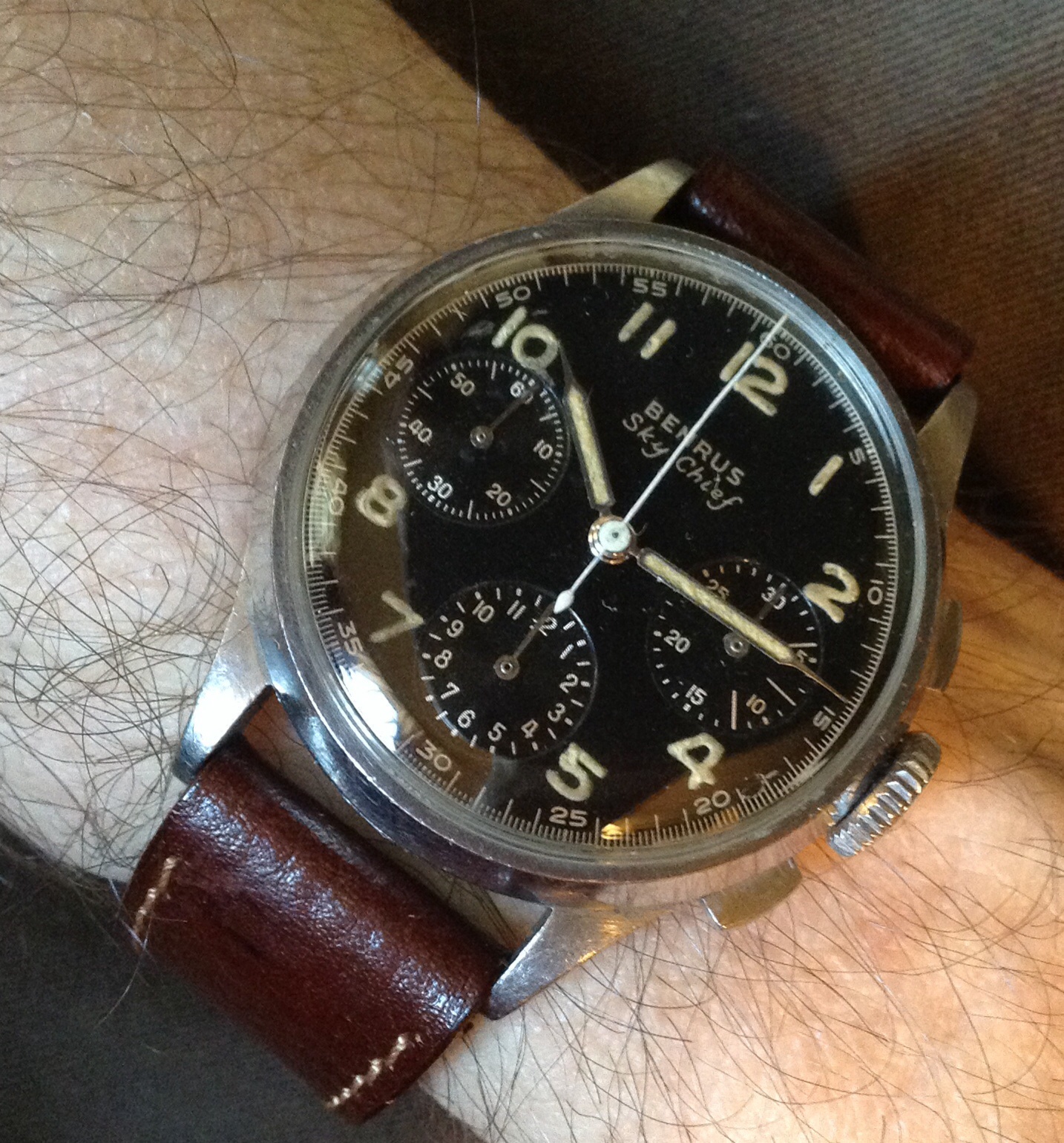 The dial decided to go tropical out of nowhere. Just over the last (2) years or so. The pictures show black but this dial is brown to the eye...I know the term is widely abused but this one is turning to milk chocolate... And,the movement is scary good quality (tuned up Lemania)
