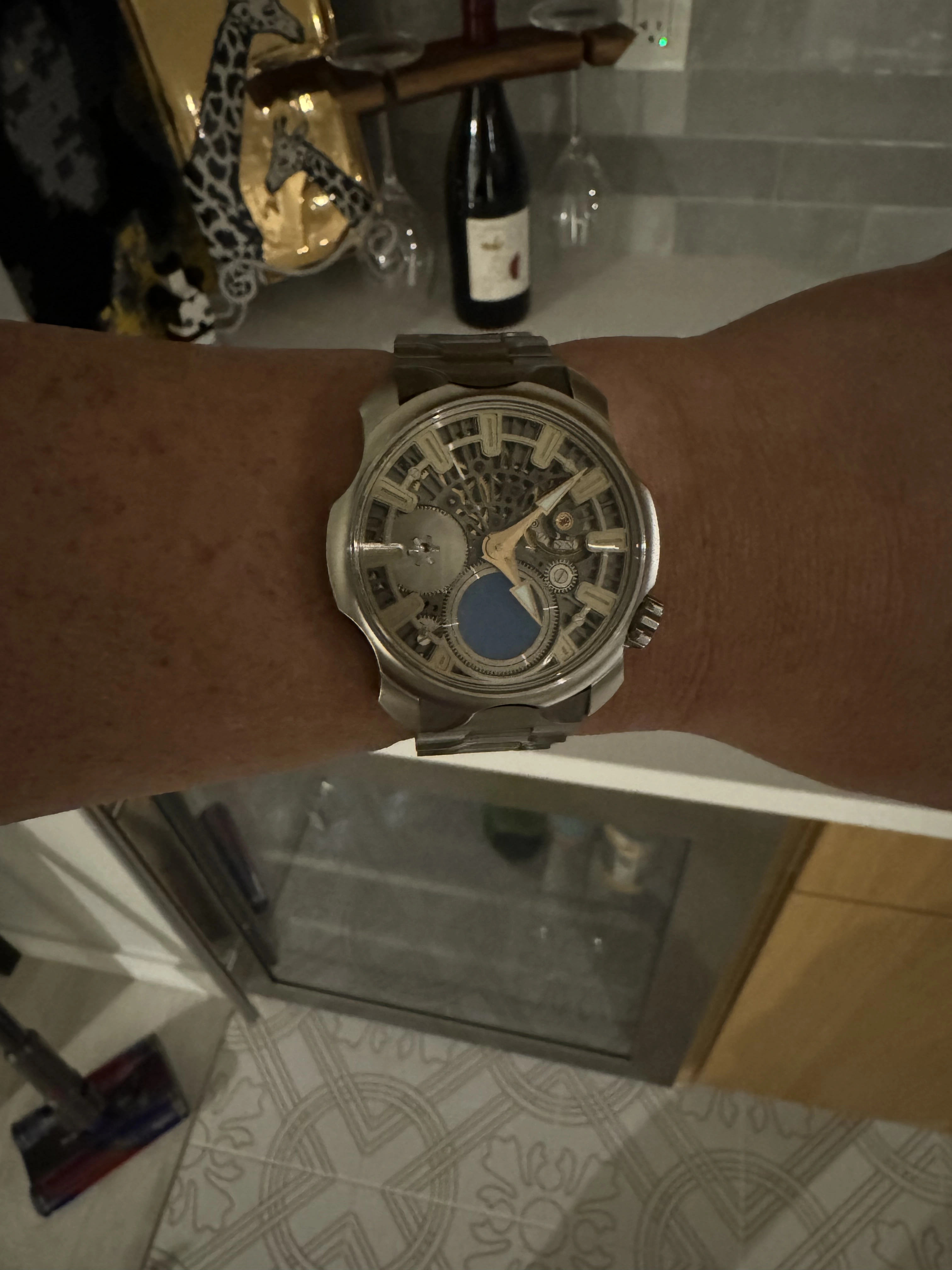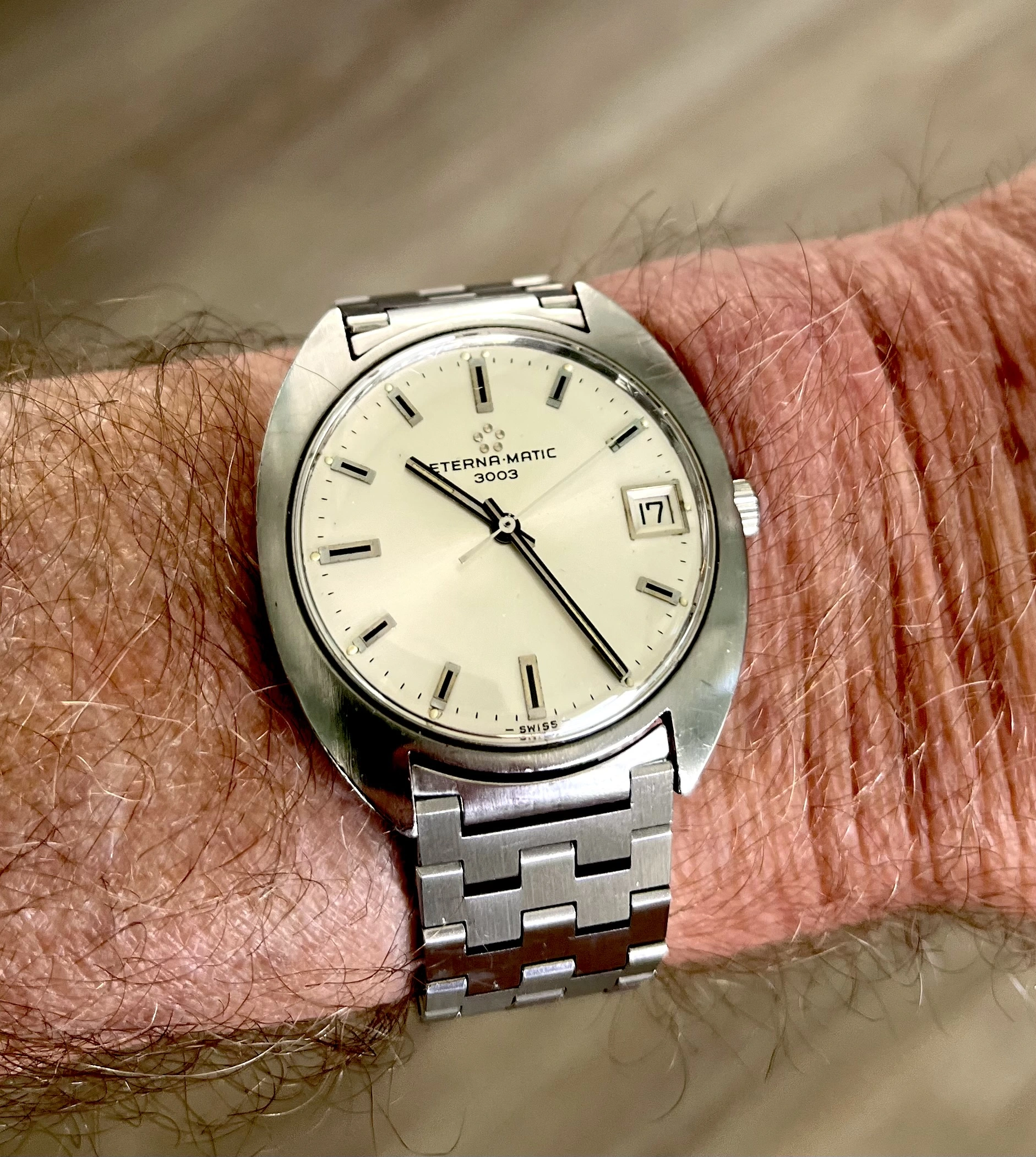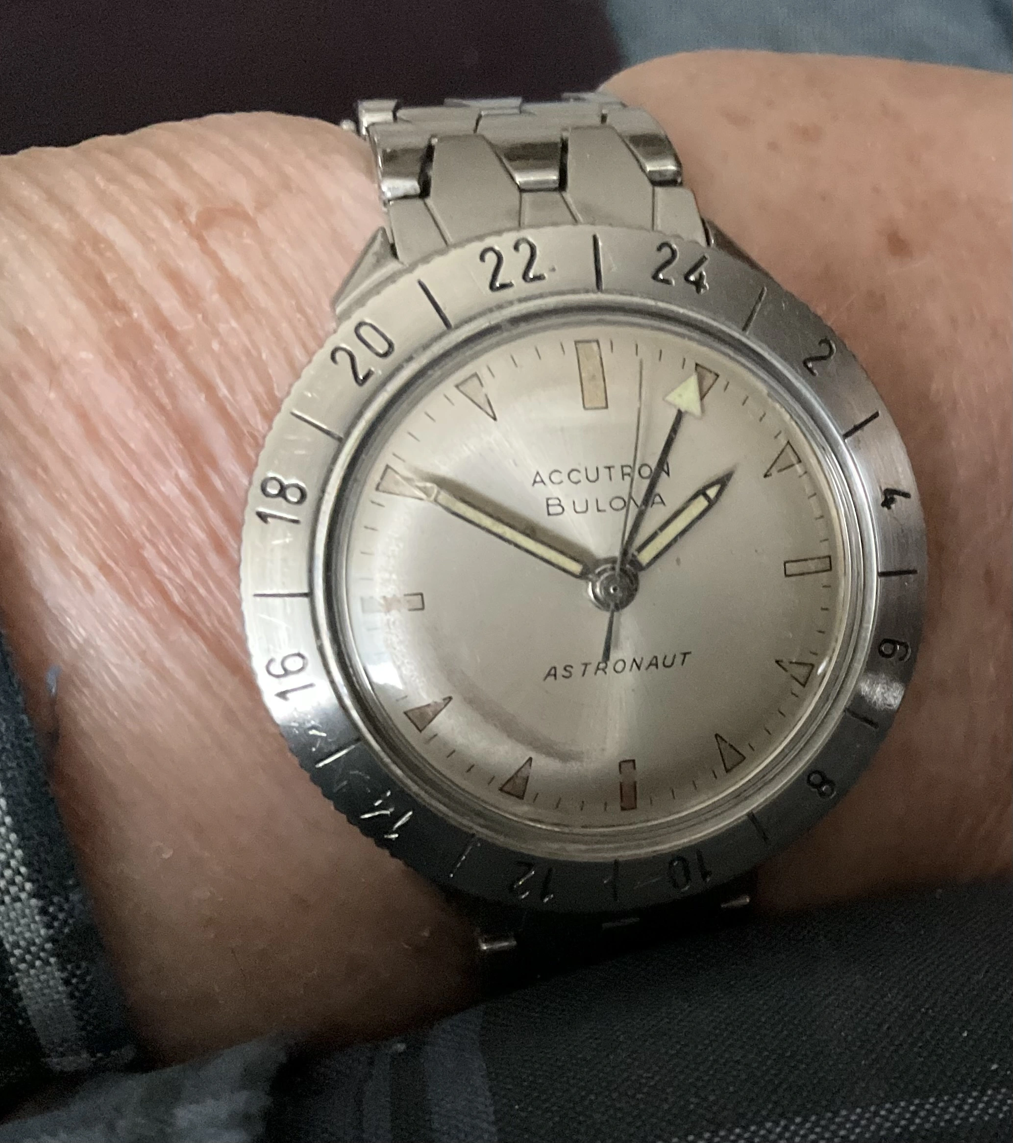 I’ve owned this watch for nigh on 35 years. I knew it would be a “project” watch when I bought it, but never got around to doing what was necessary to resuscitate it…….until just recently. A 1967 Accutron Astronaut. I bought the “coffin” stainless steel bracelet at the same NAWCC mart. I spent far too much time trying to salvage the original movement, and finally conceded that it was a lost cause. But my Accutron stash yielded a good donor movement, and I was able to make one watch out of two. Far from perfect (I know where the warts are), but it will do until a better one comes my way.