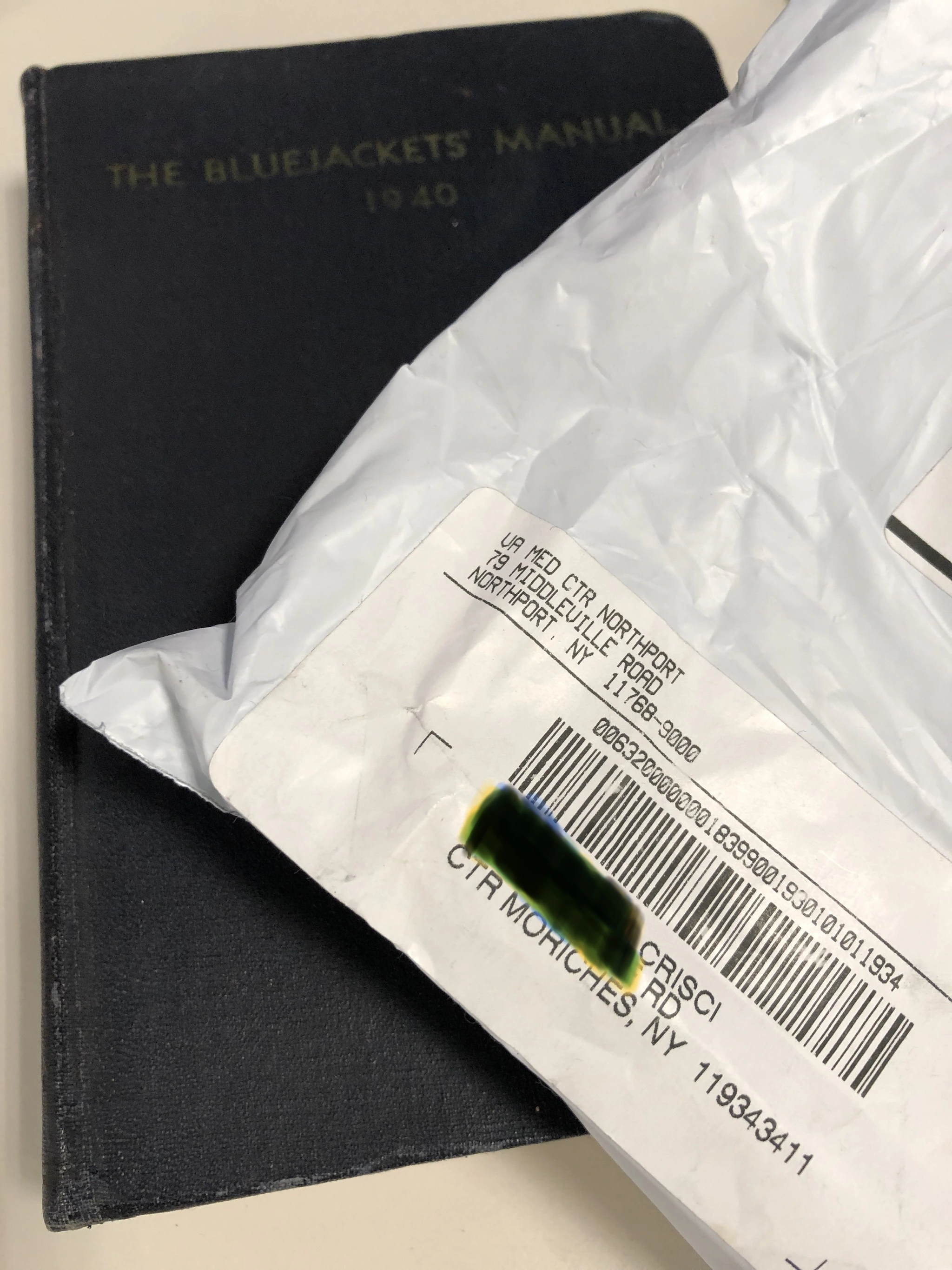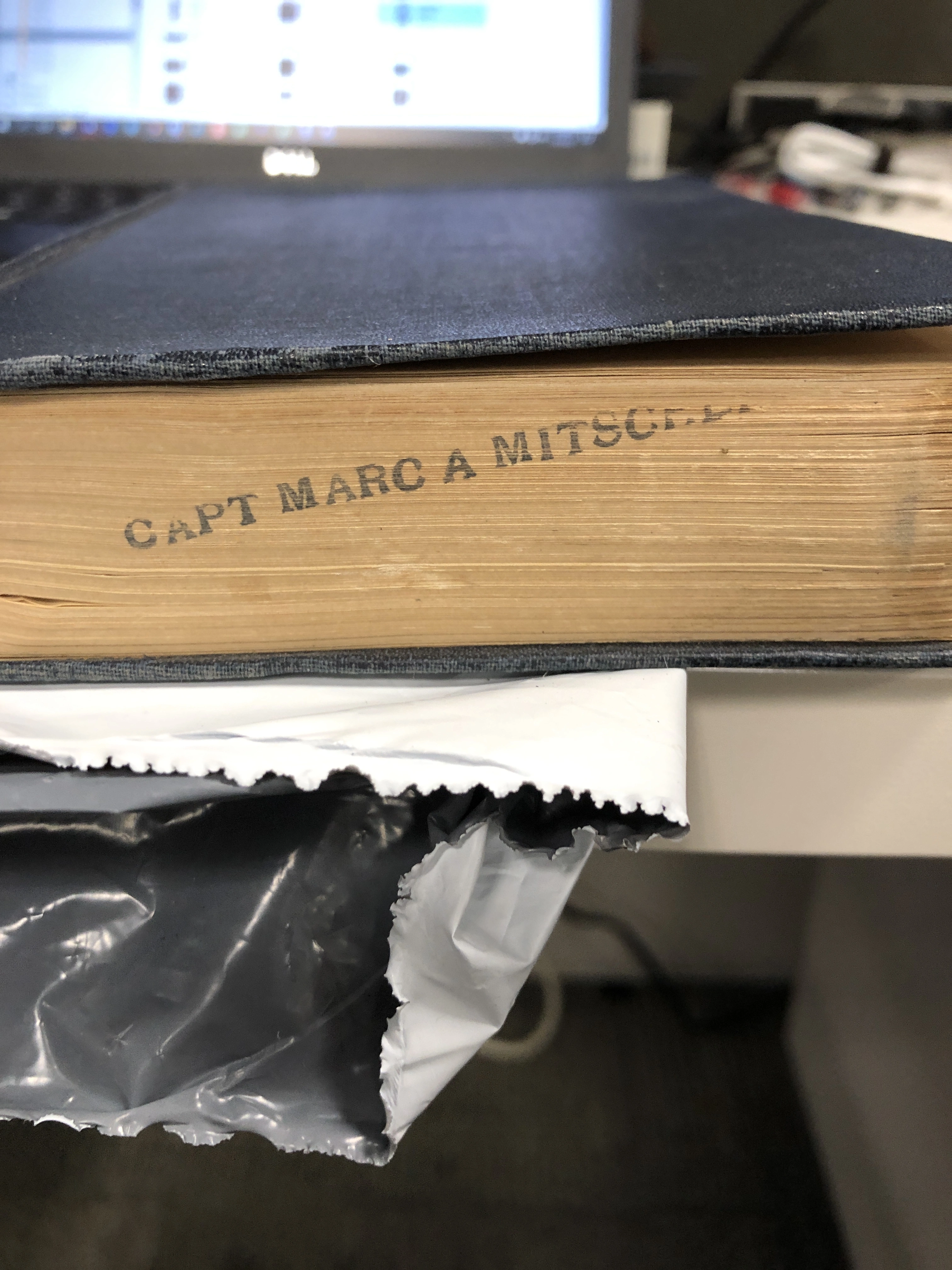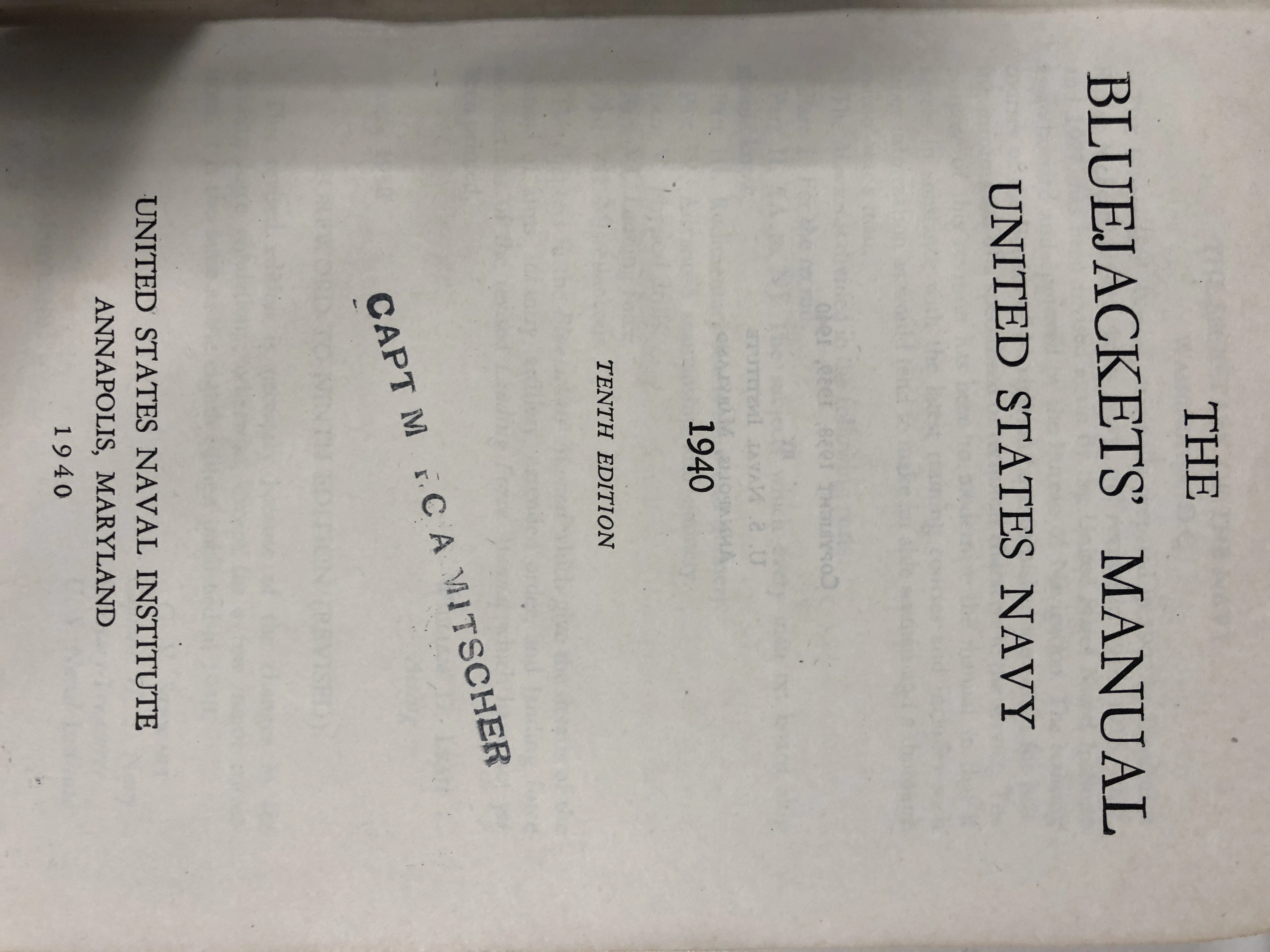 Tony was an Airforce Staff Sargent in charge of the motor pool repairs. One day in 1970s while on duty an officer came to him with a wrecked car. SSgt Tony C. took care of it. In return he got a map case with Capt. Marc A. Mitcher's Blue Jacket, a Navy standard operating procedure manual of sorts. This 1940s edition was stamped with his name on it.