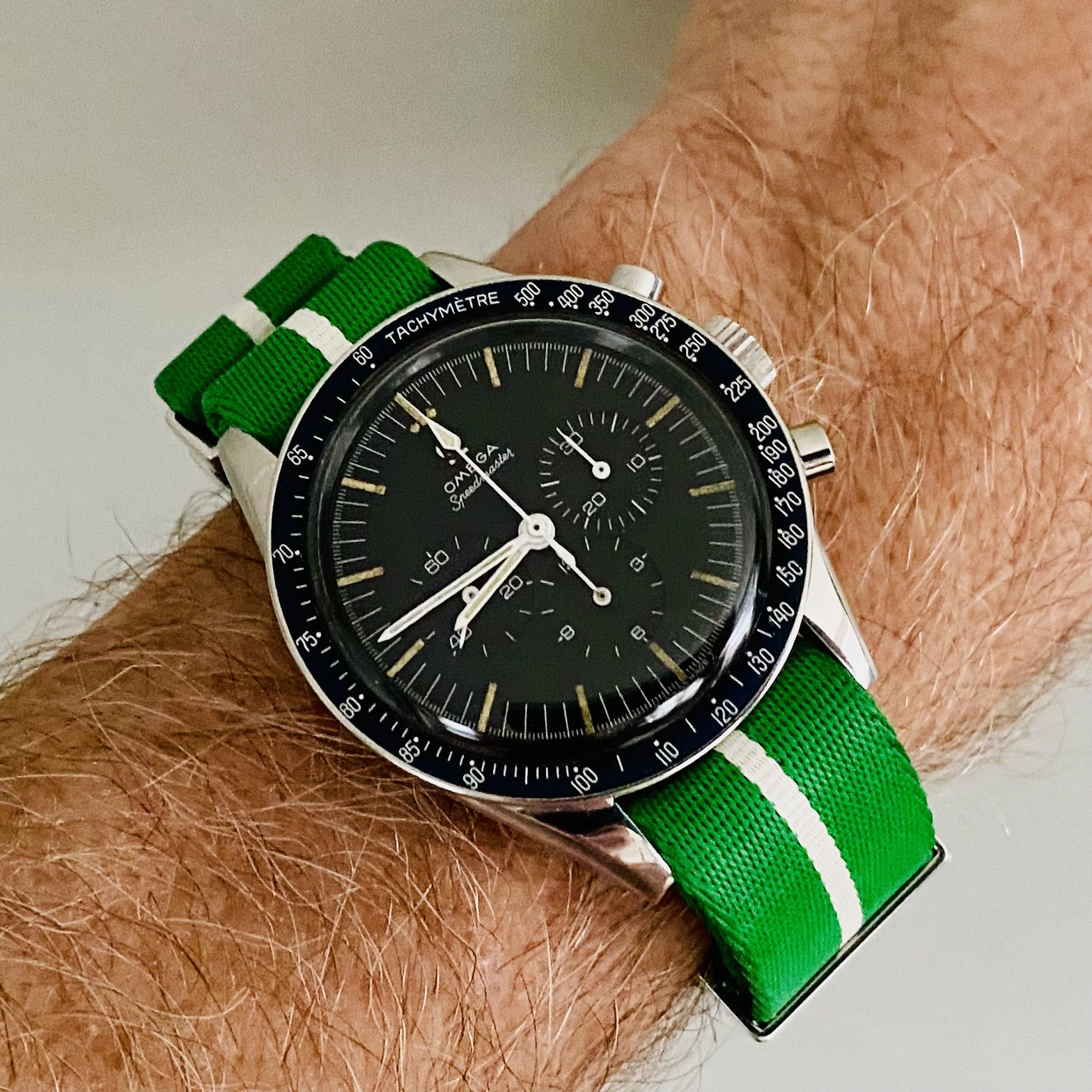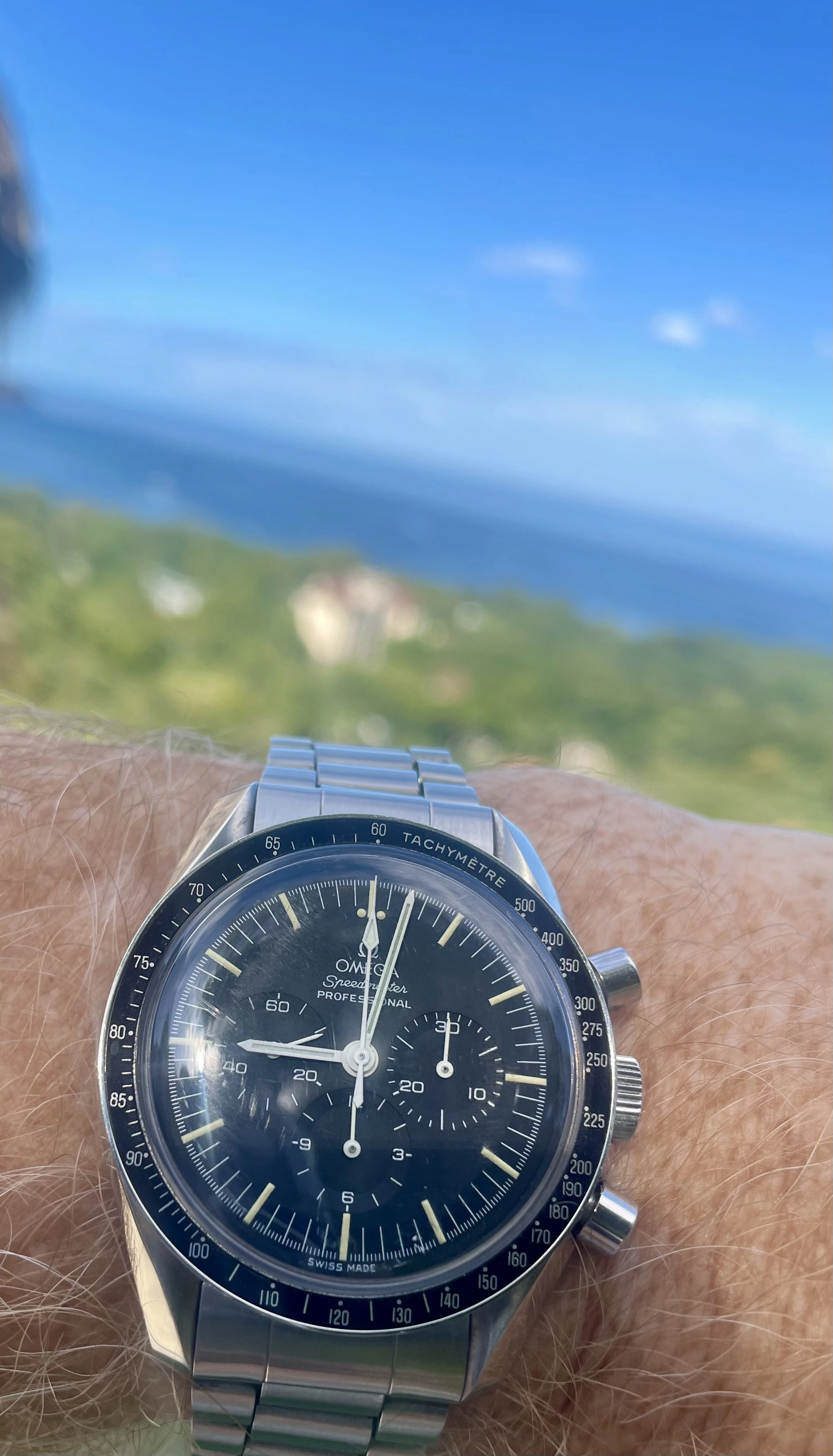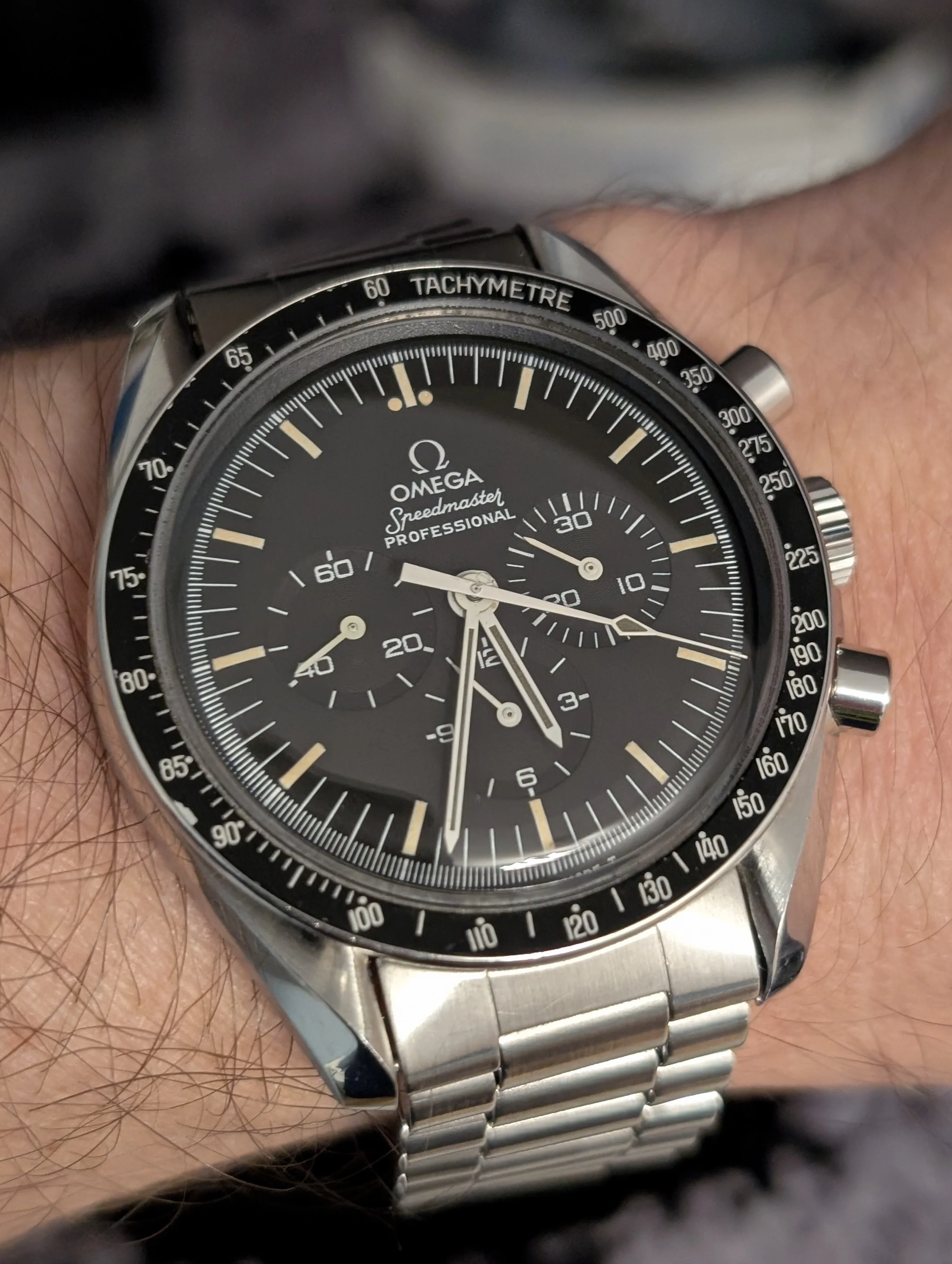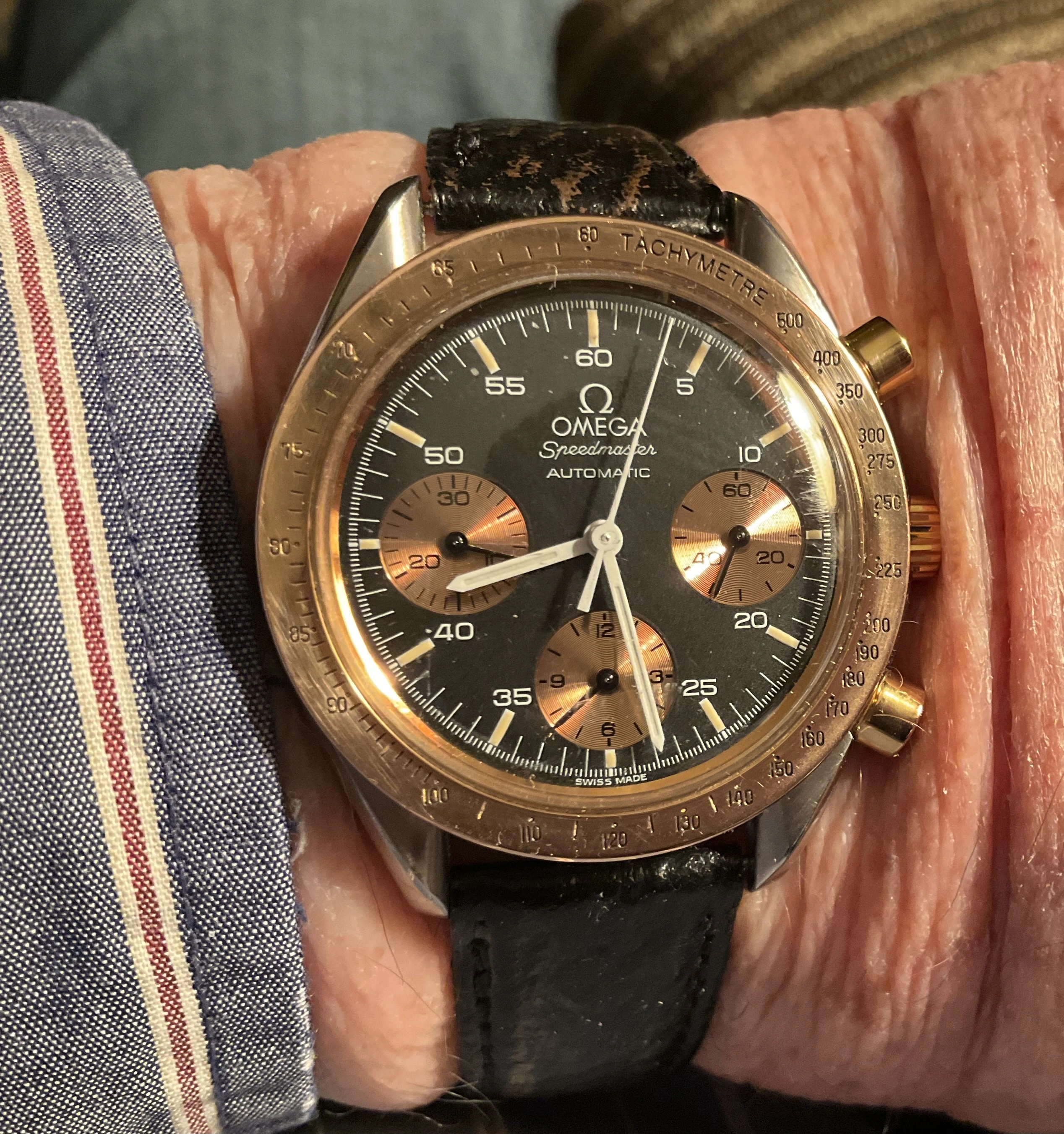 A rare Tuesday. A day on which I just happen to be wearing a Speedmaster (reduced). 175.0033, introduced December 1989, 18-karat rose gold bezel, rose gold sub dials, steel case. Europe only, and for a short time only. I am the second owner, bought pre-owned, in 1991.
