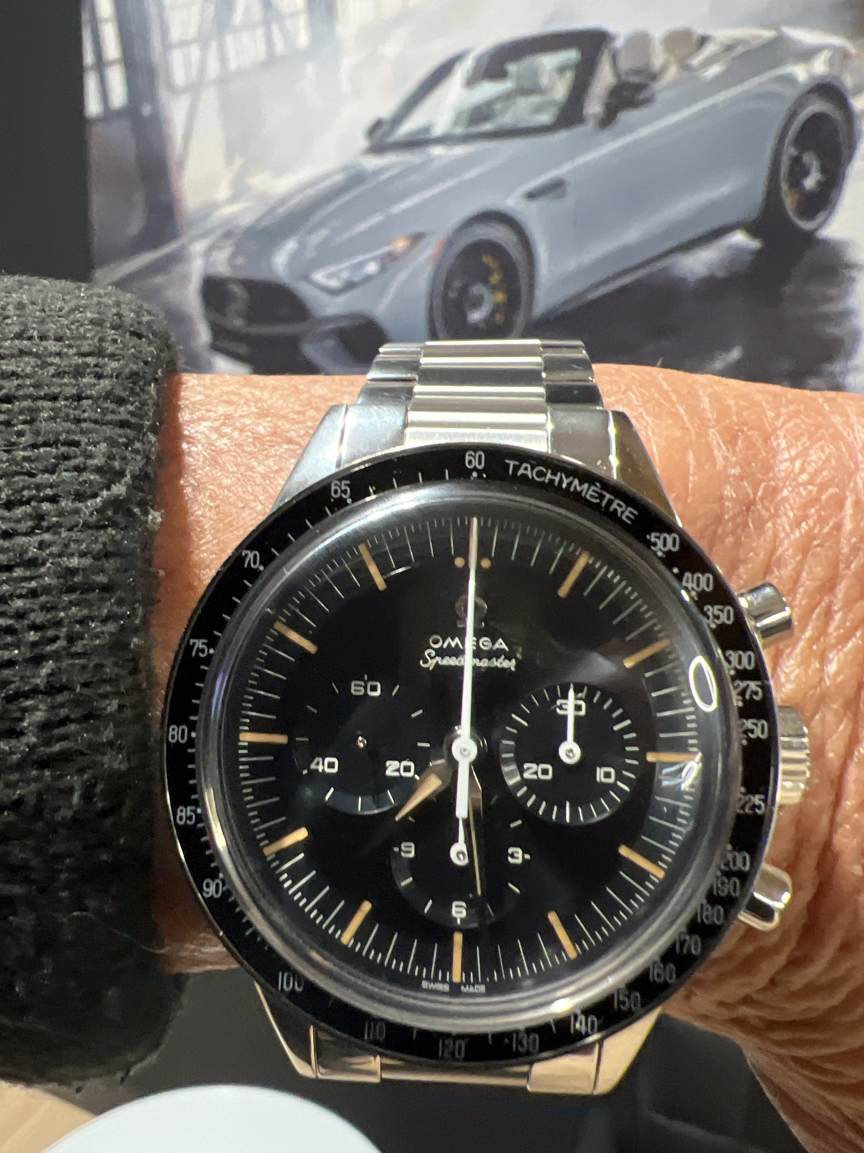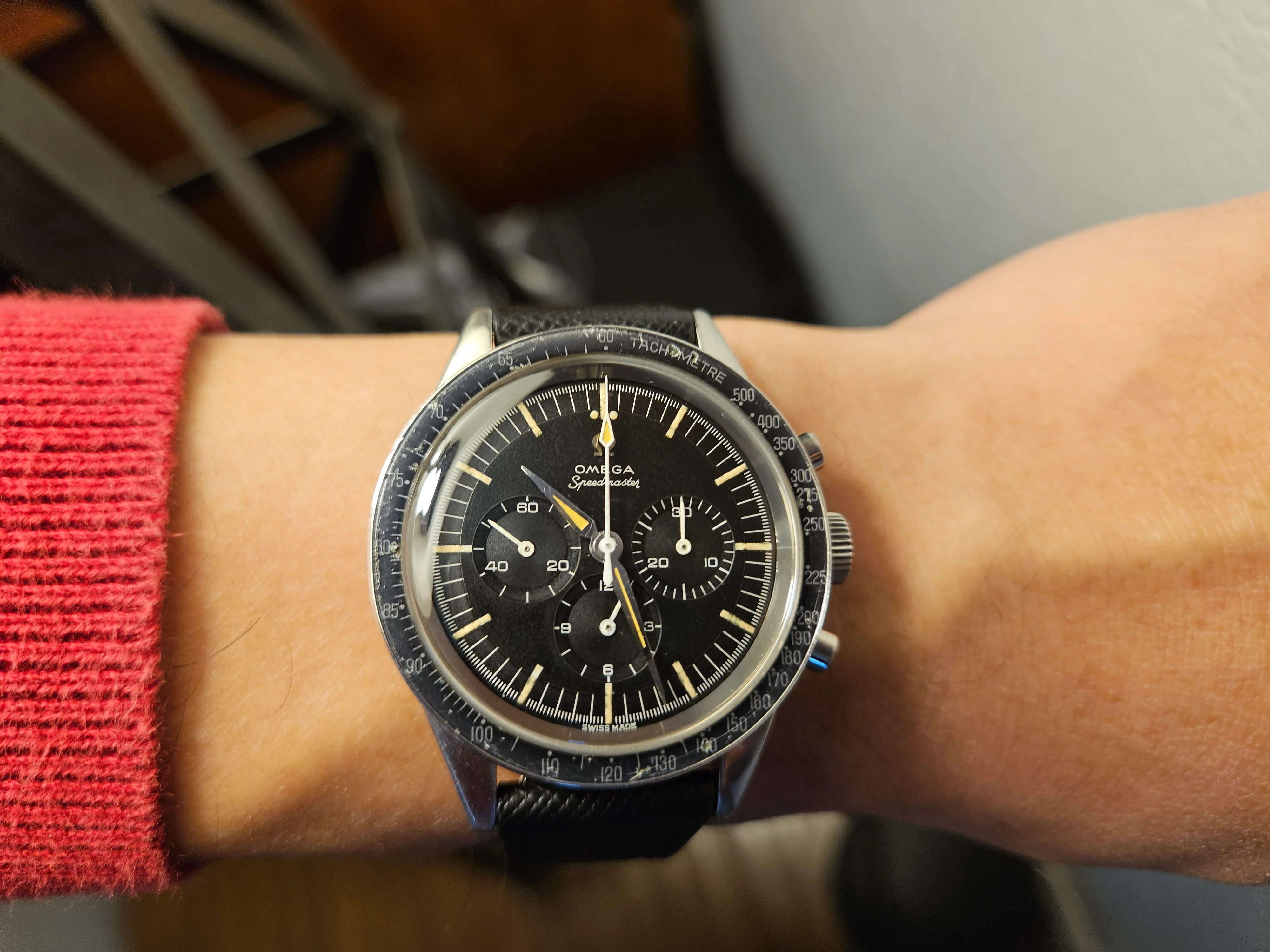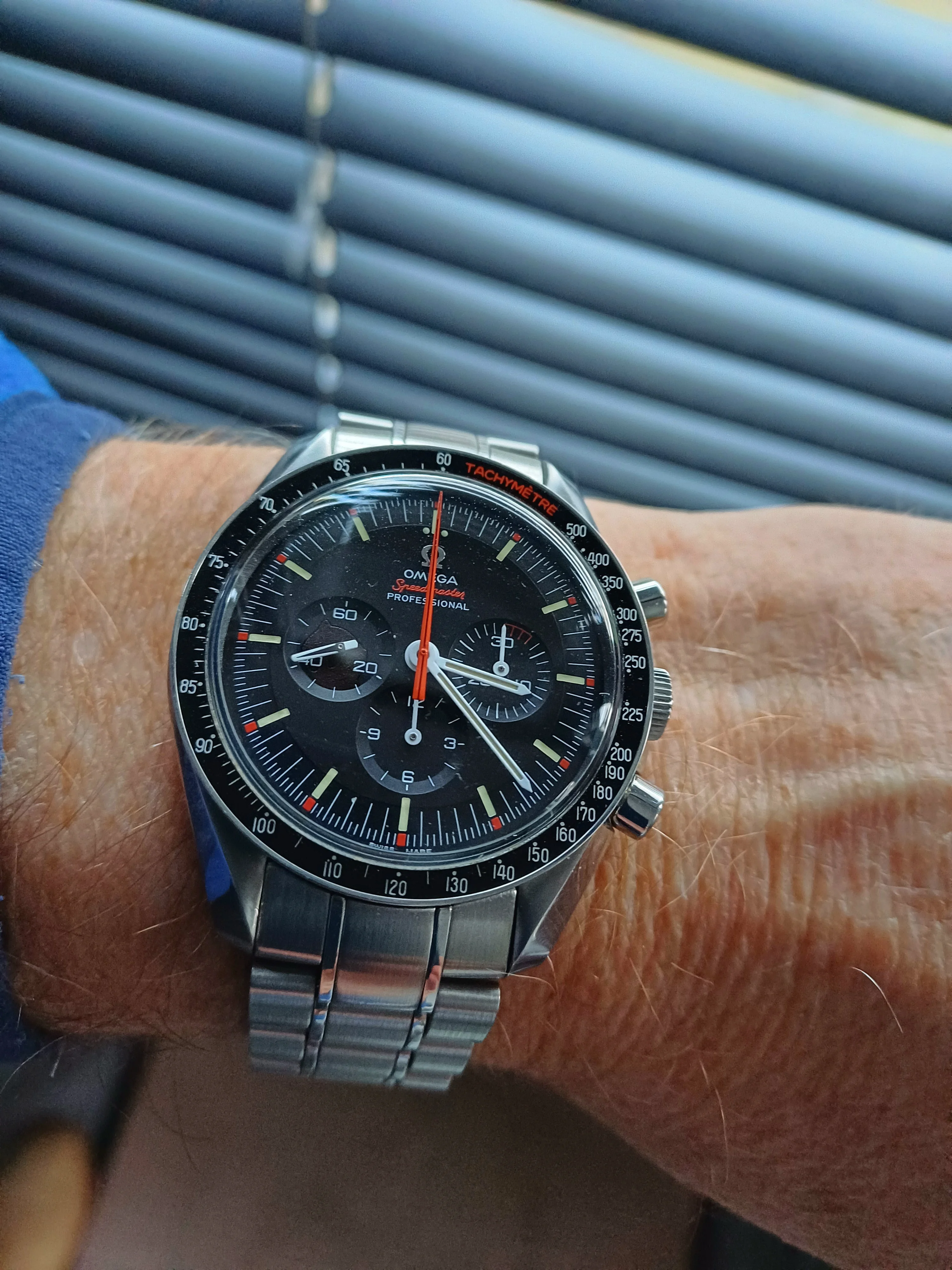 Been waiting for another Speedy Tuesday to post my 105.002-62 after getting some service done. Definitely needed the original crystal with the silver retention ring for that pop and the alpha hand adds to the look. But my A1 crown is still stuck at a Belgium airport! One of the harder wrist shots due to so many reflections.