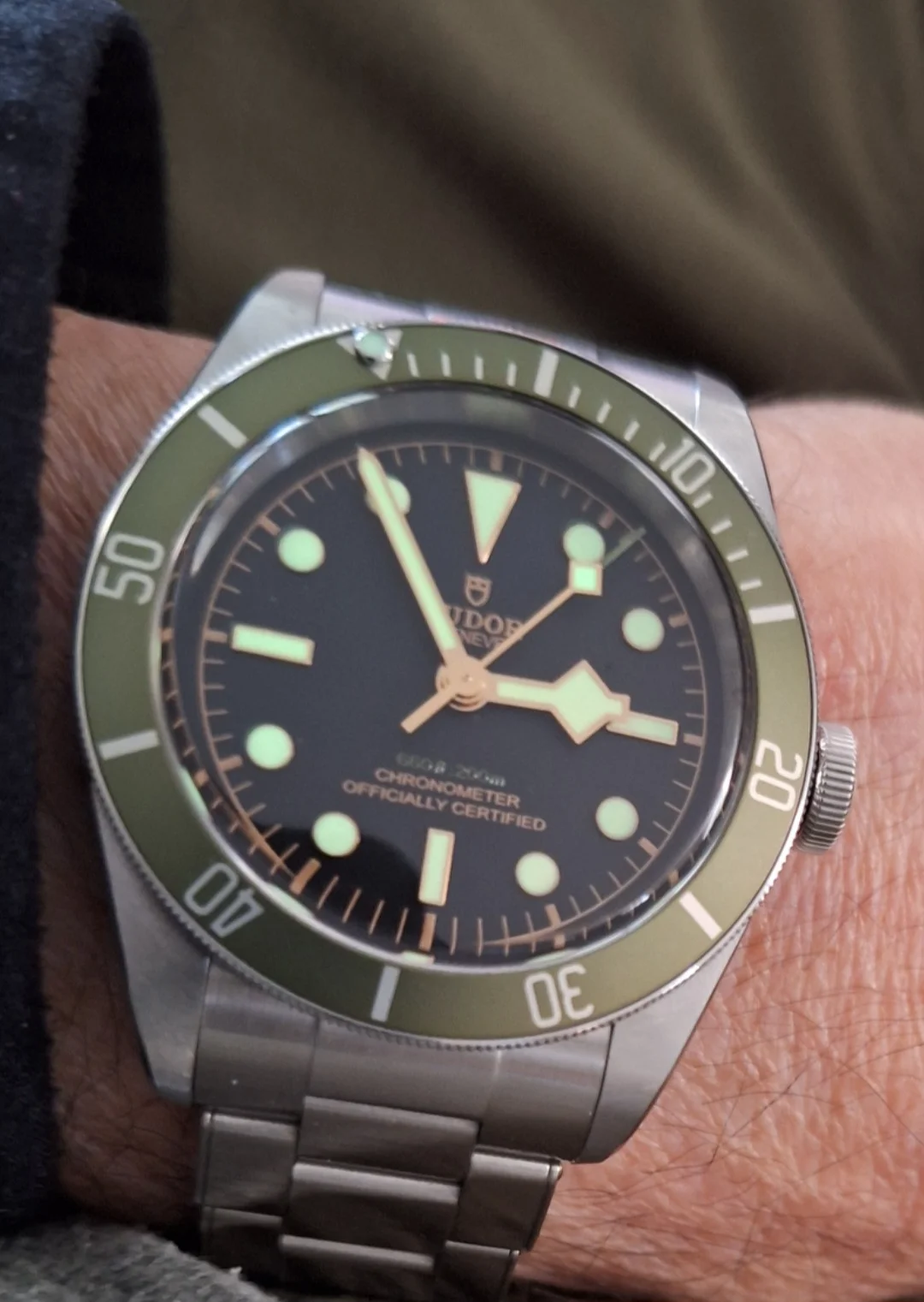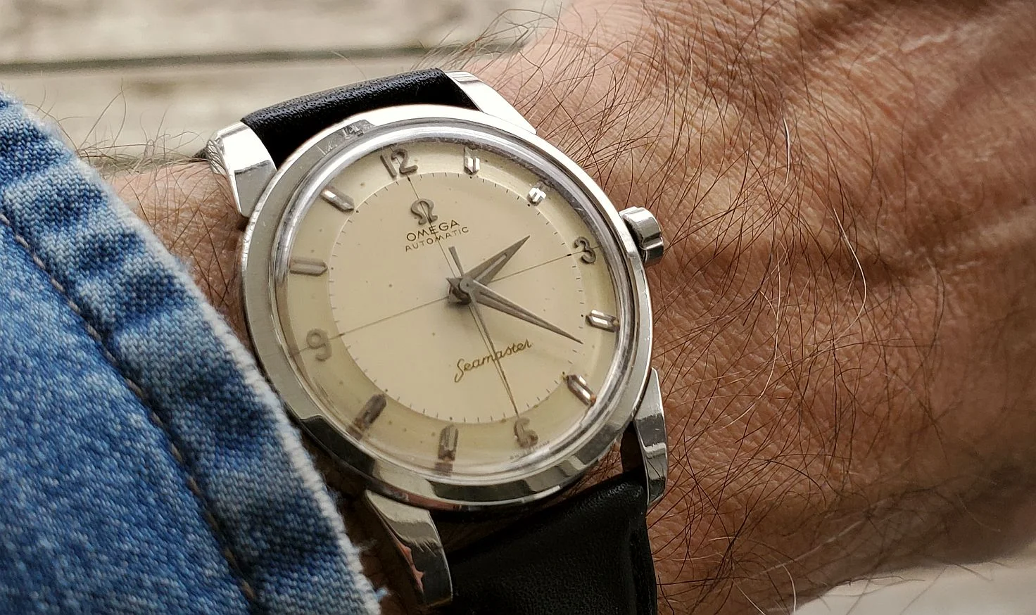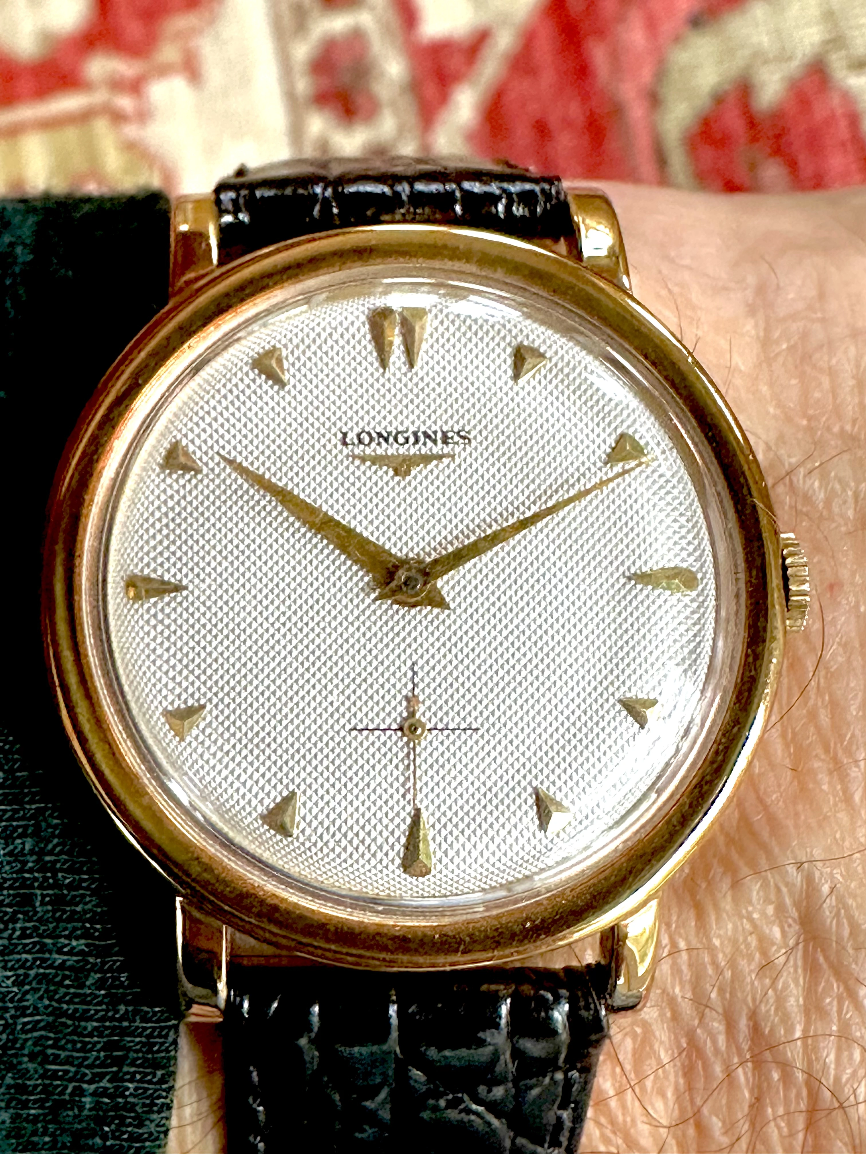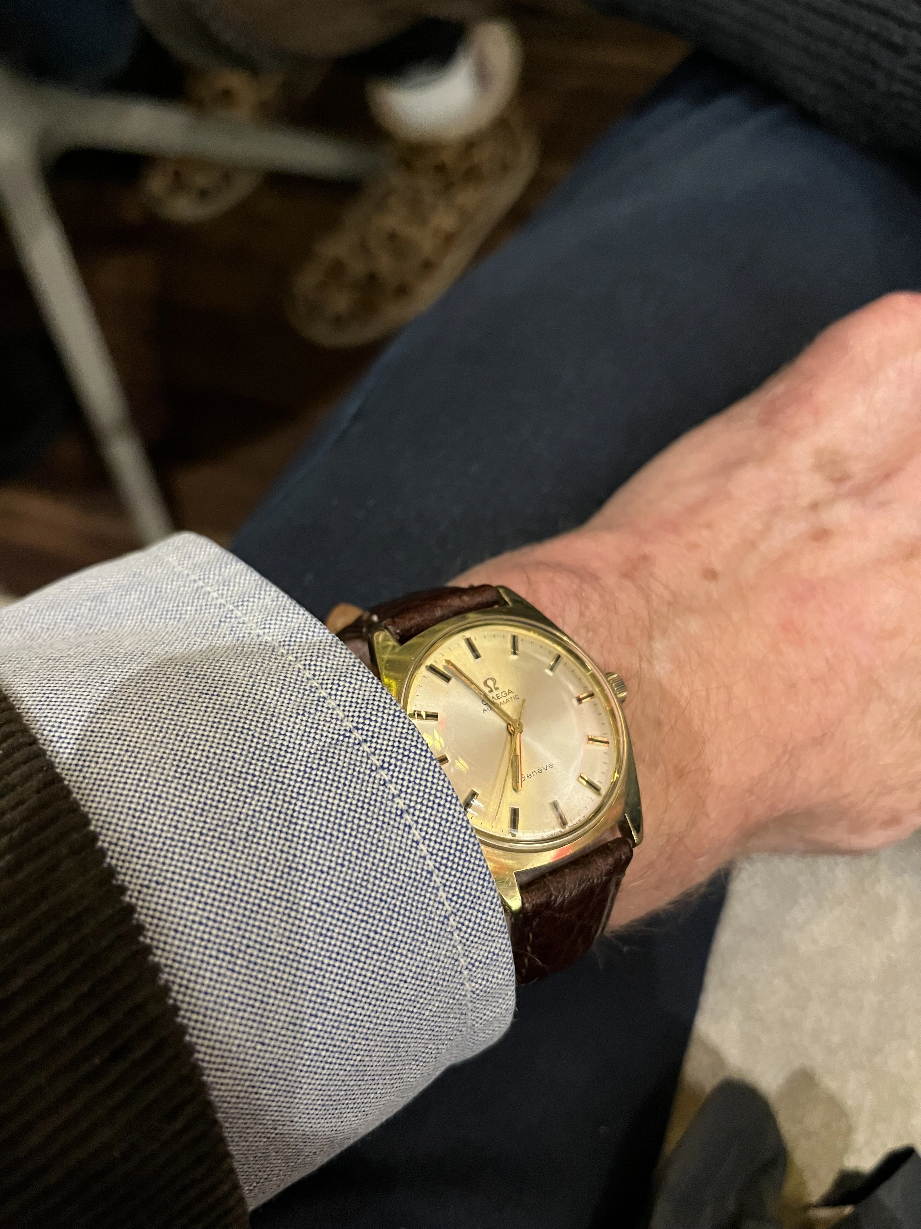 ·Today, and likely until after New Year’s Eve, my 70 year old (approx.) Omega date at 6 bumper automatic with calibre 355 movement. My late father was a watchmaker/jeweller. I inherited the residue from his business which included a lozenge tin with a Dymo label on it, listing the contents as”Omega parts”. He passed away almost 50 years ago. I rarely opened that tin, but about 5 years ago, I was looking for a centre wheel for a bumper automatic, for a friend. I had the one he needed in that tin, but I also discovered this dial! Further delving resulted in my finding the entire calibre 355 movement (but no case), in pieces, in that tin! I serviced it, and put it aside. I later was contacted by a chap in Madrid, Spain, (thanks again @Tritium), who sold me the case the movement is now in. Don’t ask for dibs on this one. @Tritium owns dibs on this treasure!