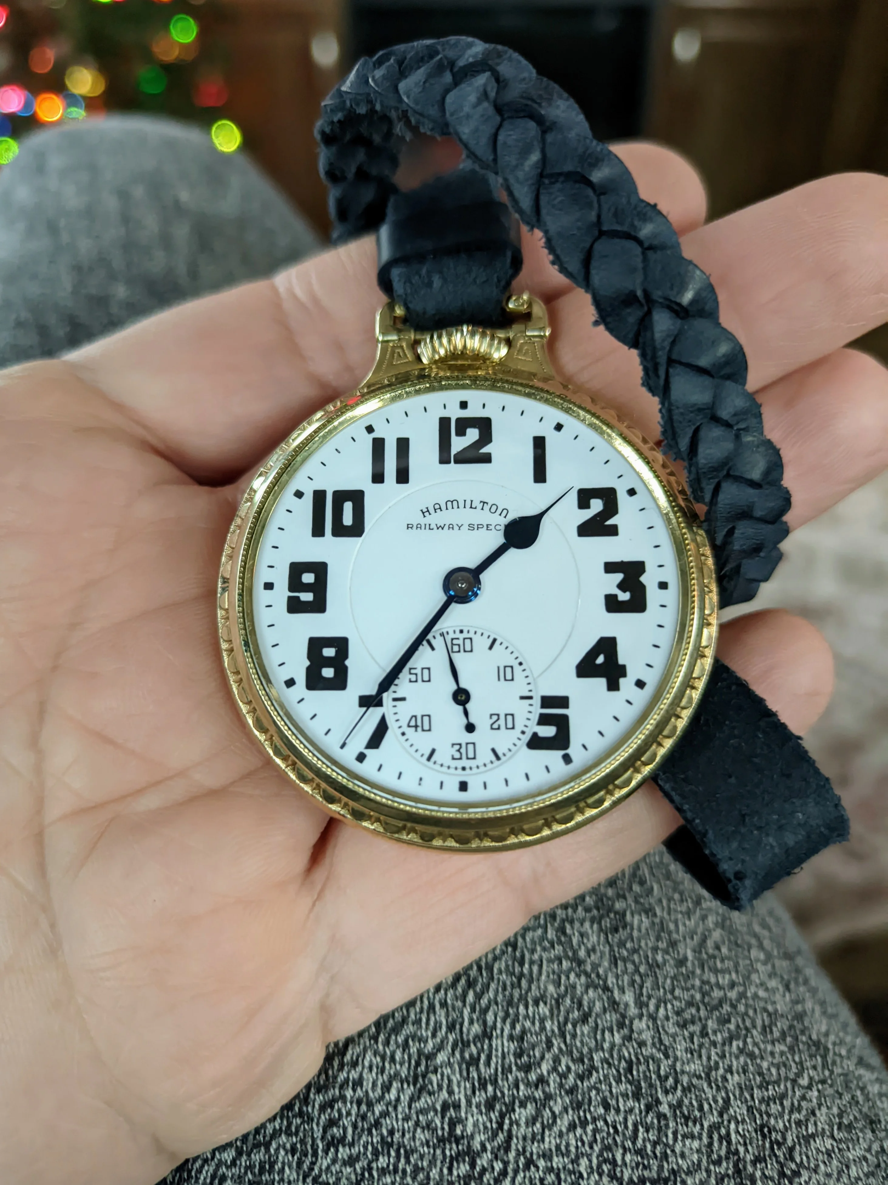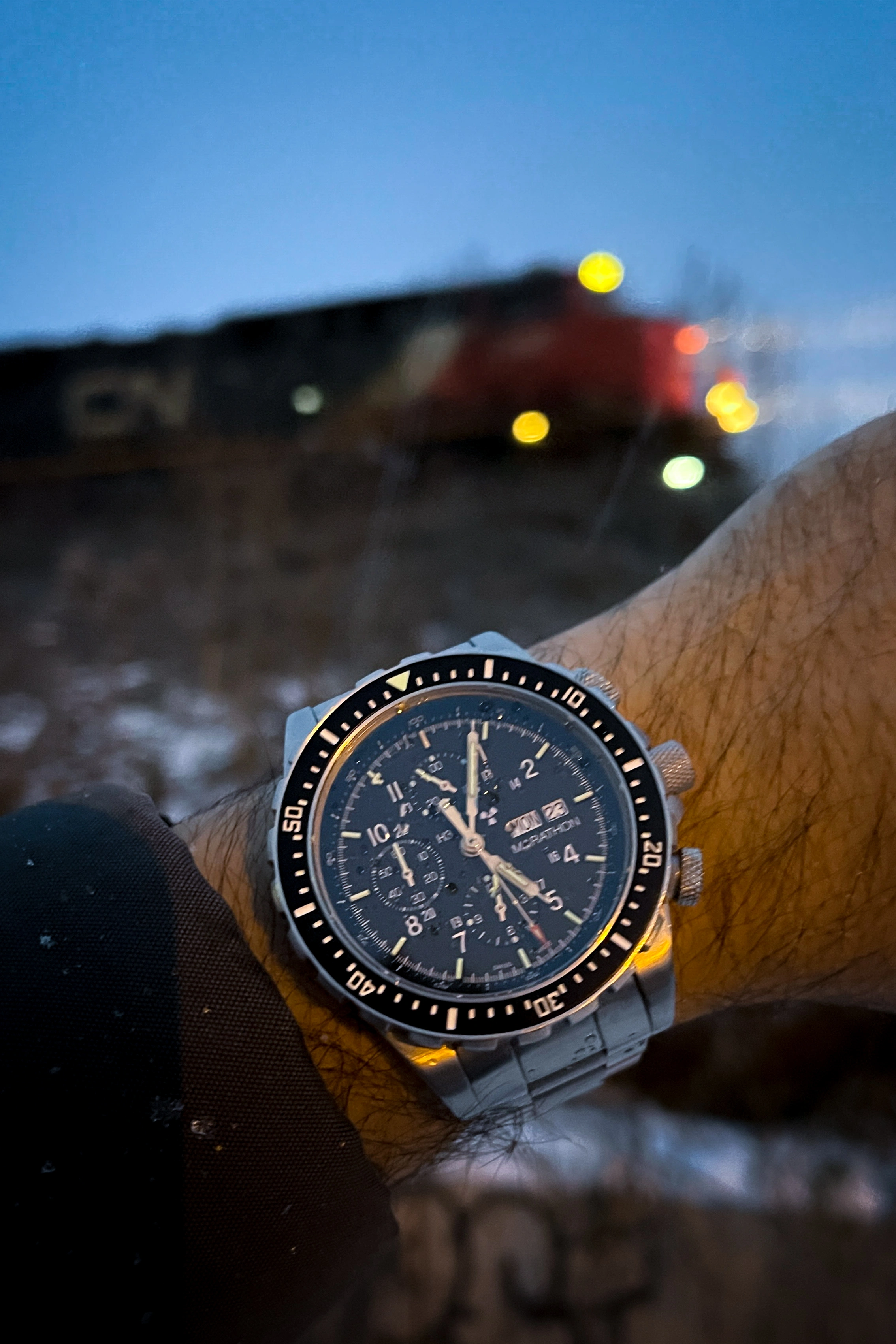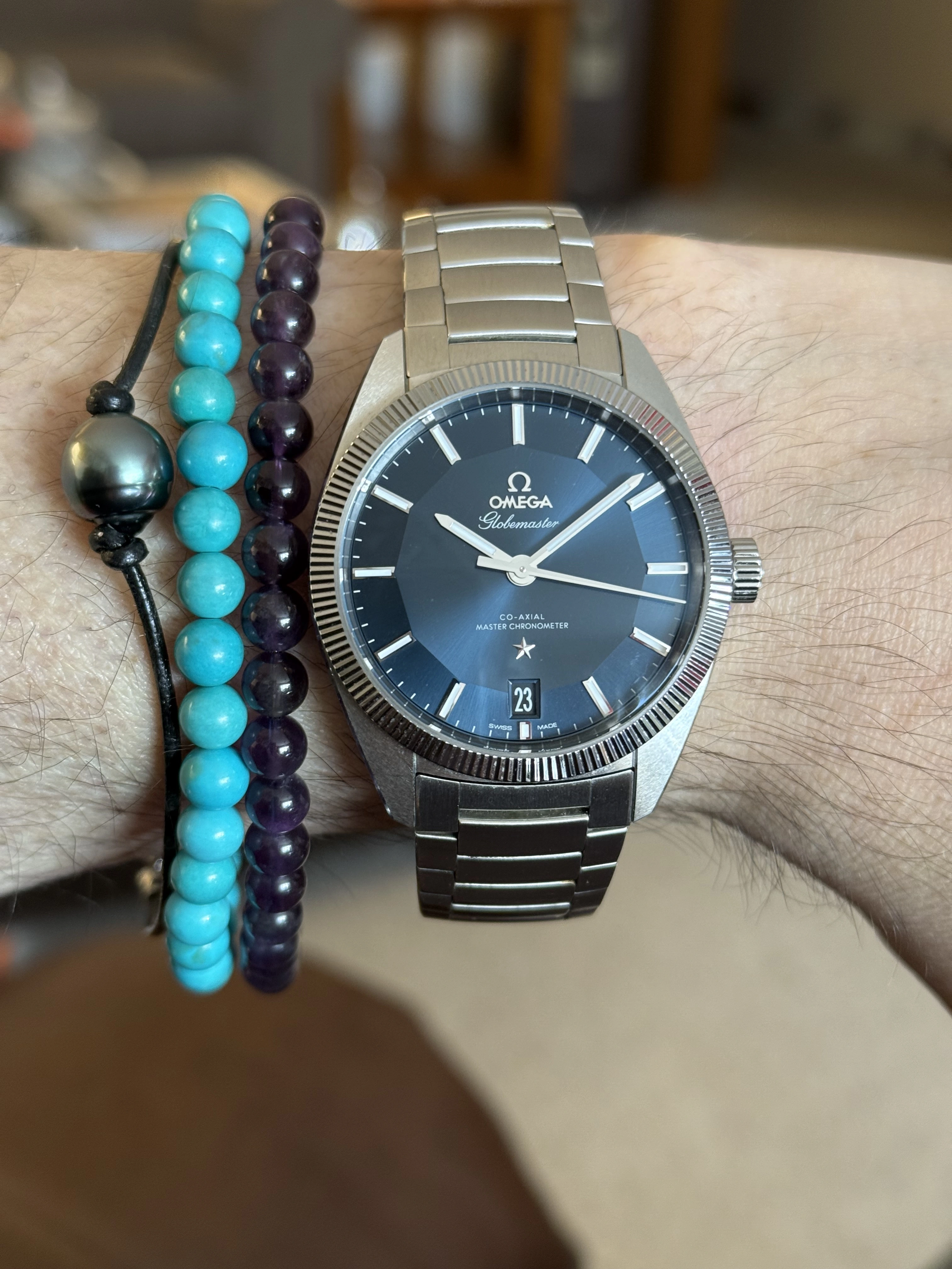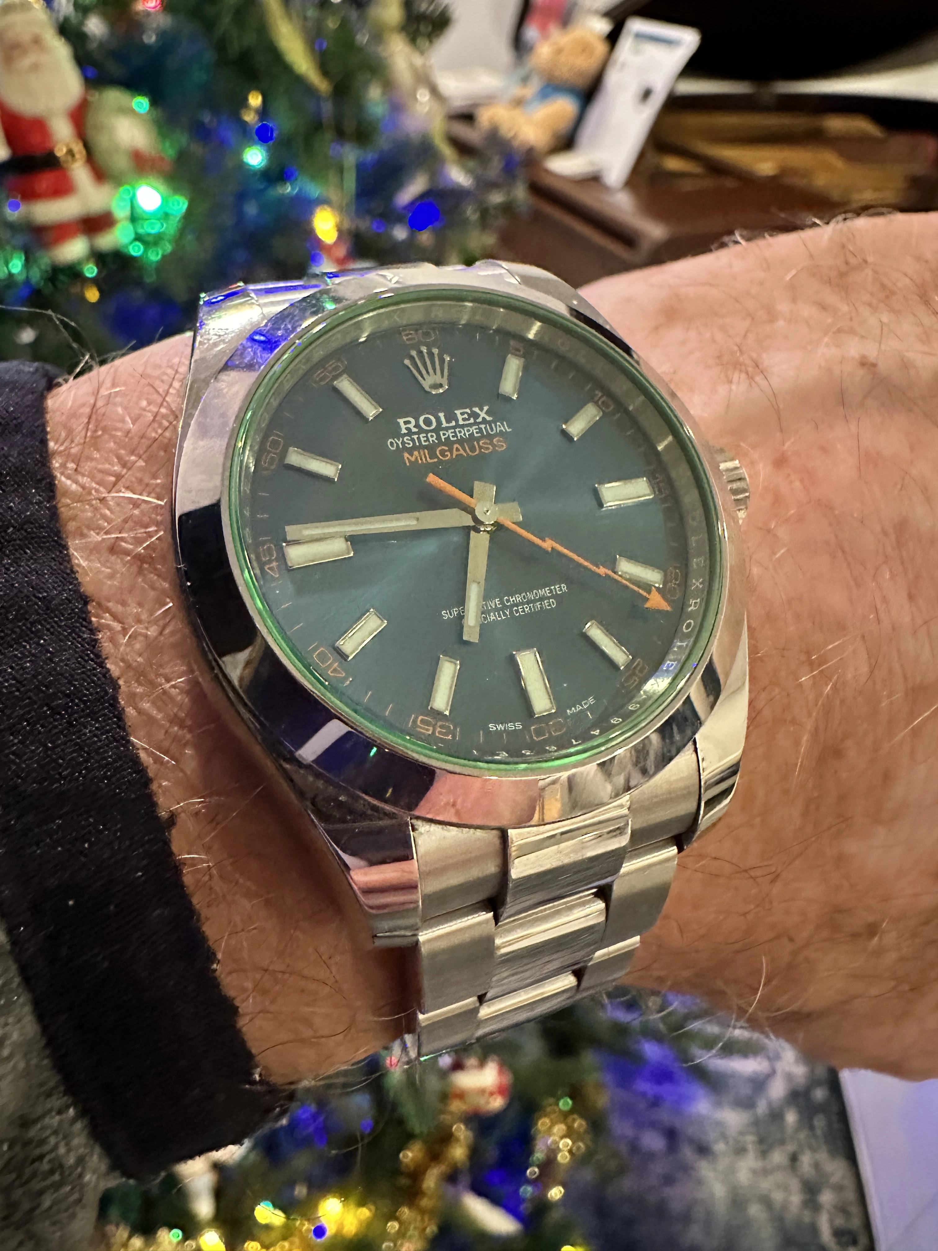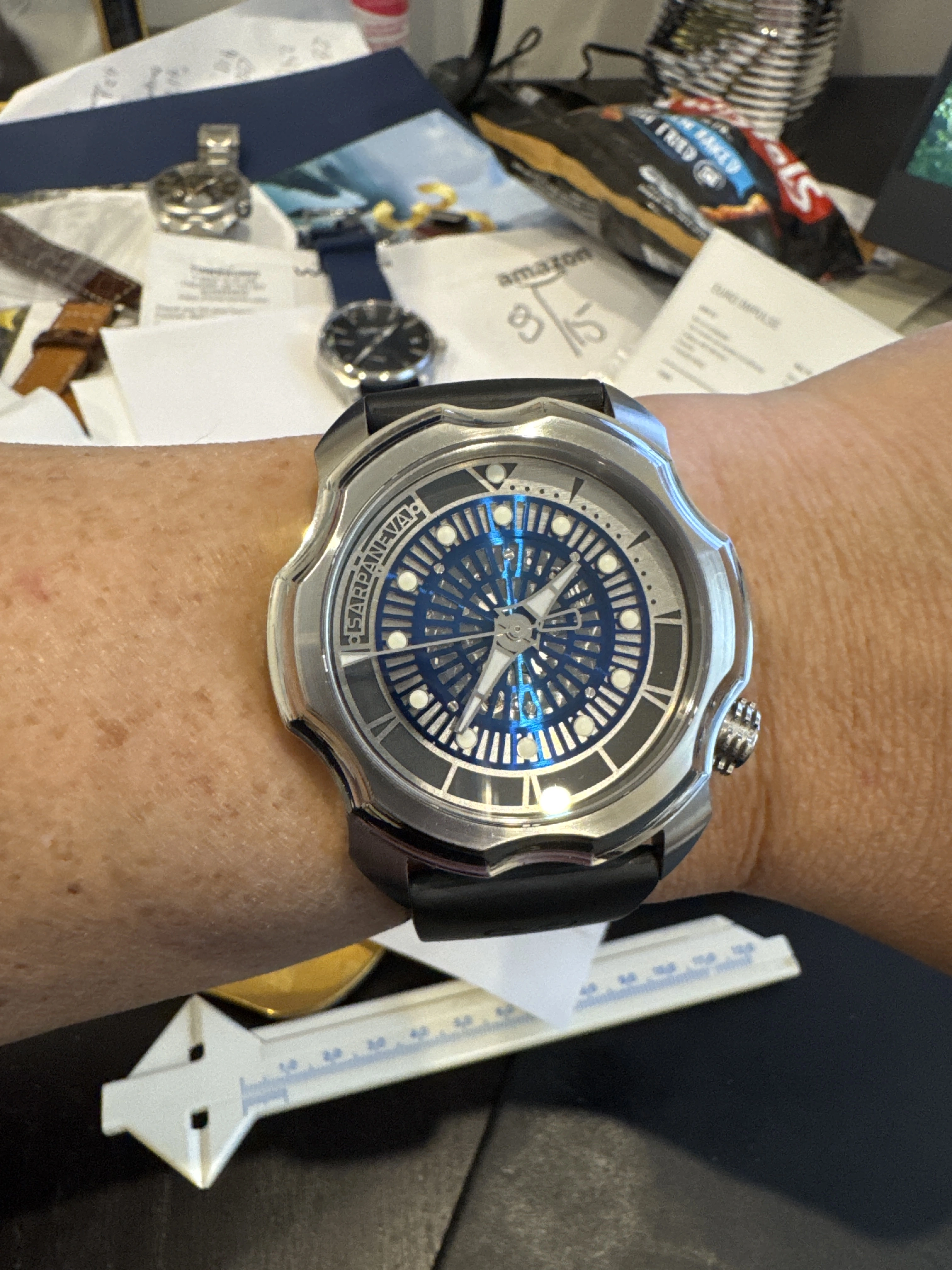 ·Today, and likely until after New Year’s Eve, my 70 year old (approx.) Omega date at 6 bumper automatic with calibre 355 movement. My late father was a watchmaker/jeweller. I inherited the residue from his business which included a lozenge tin with a Dymo label on it, listing the contents as”Omega parts”. He passed away almost 50 years ago. I rarely opened that tin, but about 5 years ago, I was looking for a centre wheel for a bumper automatic, for a friend. I had the one he needed in that tin, but I also discovered this dial! Further delving resulted in my finding the entire calibre 355 movement (but no case), in pieces, in that tin! I serviced it, and put it aside. I later was contacted by a chap in Madrid, Spain, (thanks again @Tritium), who sold me the case the movement is now in. Don’t ask for dibs on this one. @Tritium owns dibs on this treasure!