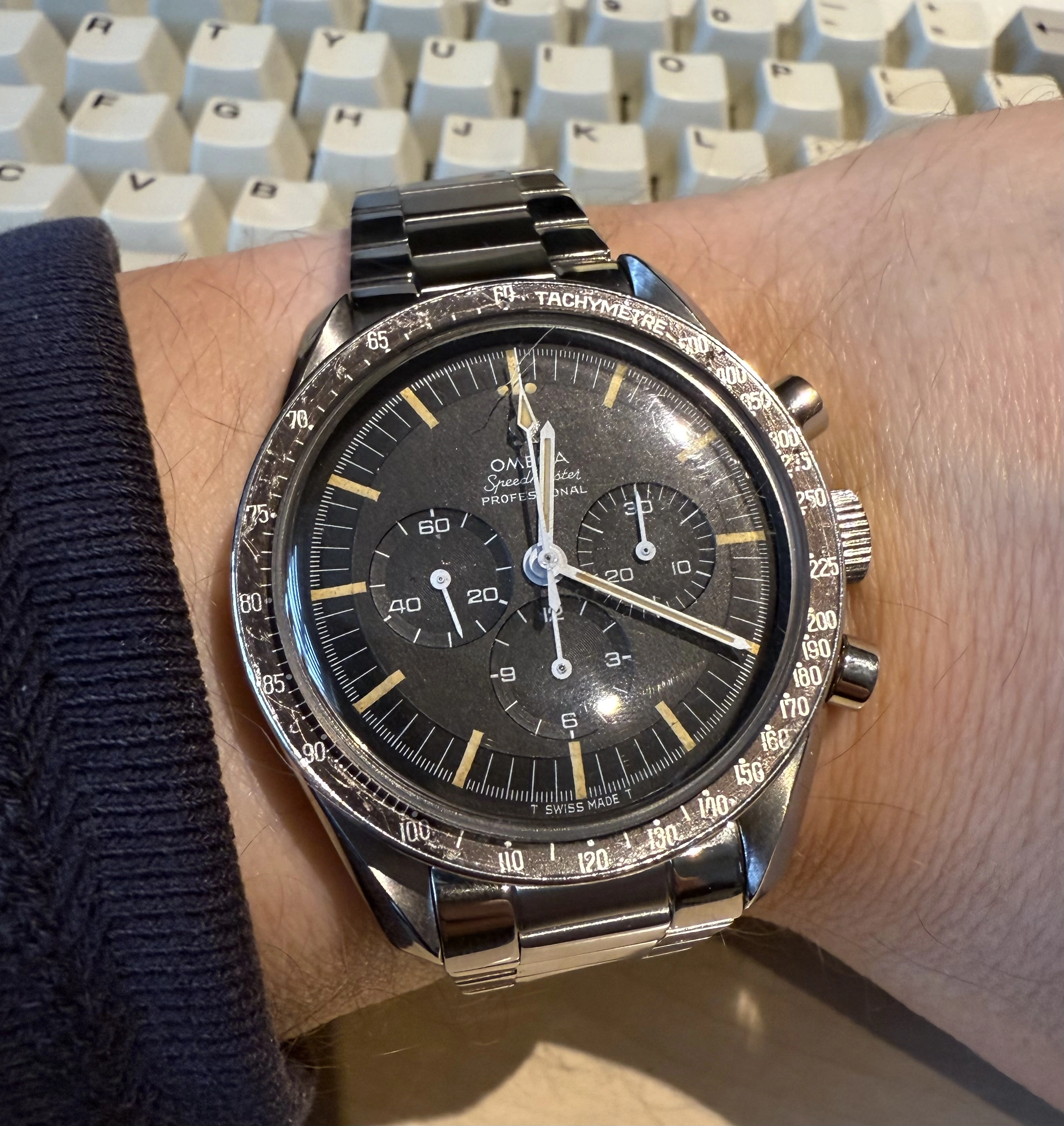 Posts 1,845 Likes 12,779 ahartfie ·Jan 20, 2025·The black sheep in the Spee-ee-eee-eedmaster flock Greatoldone Speedy on my new Forstner flat link bracelet. Is that an IBM Model M in the background? Also I think you put the bracelet on backwards, but maybe it’s just me.