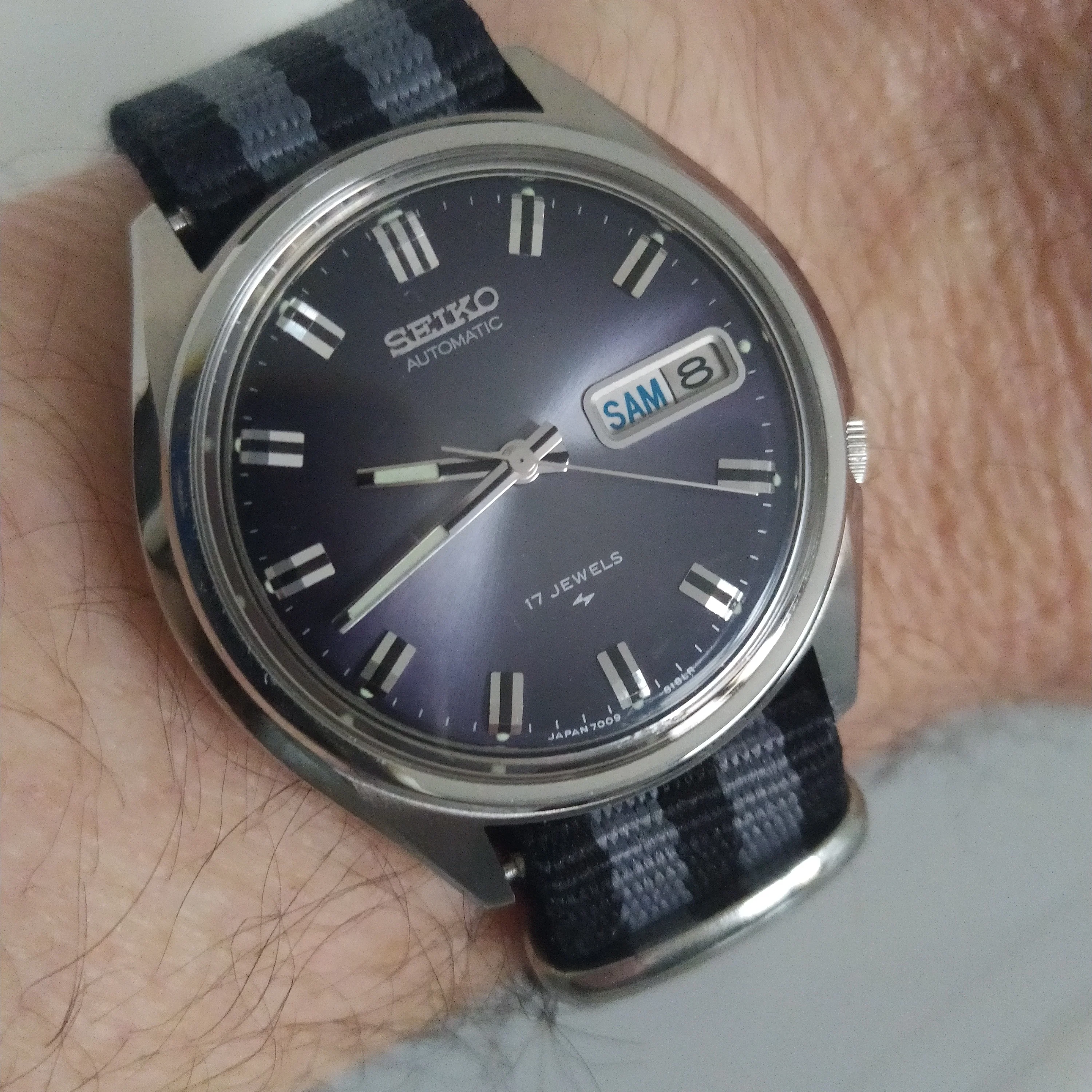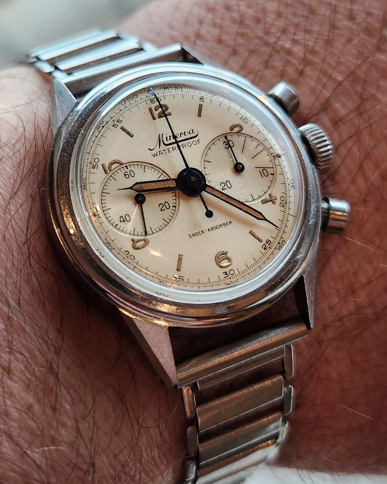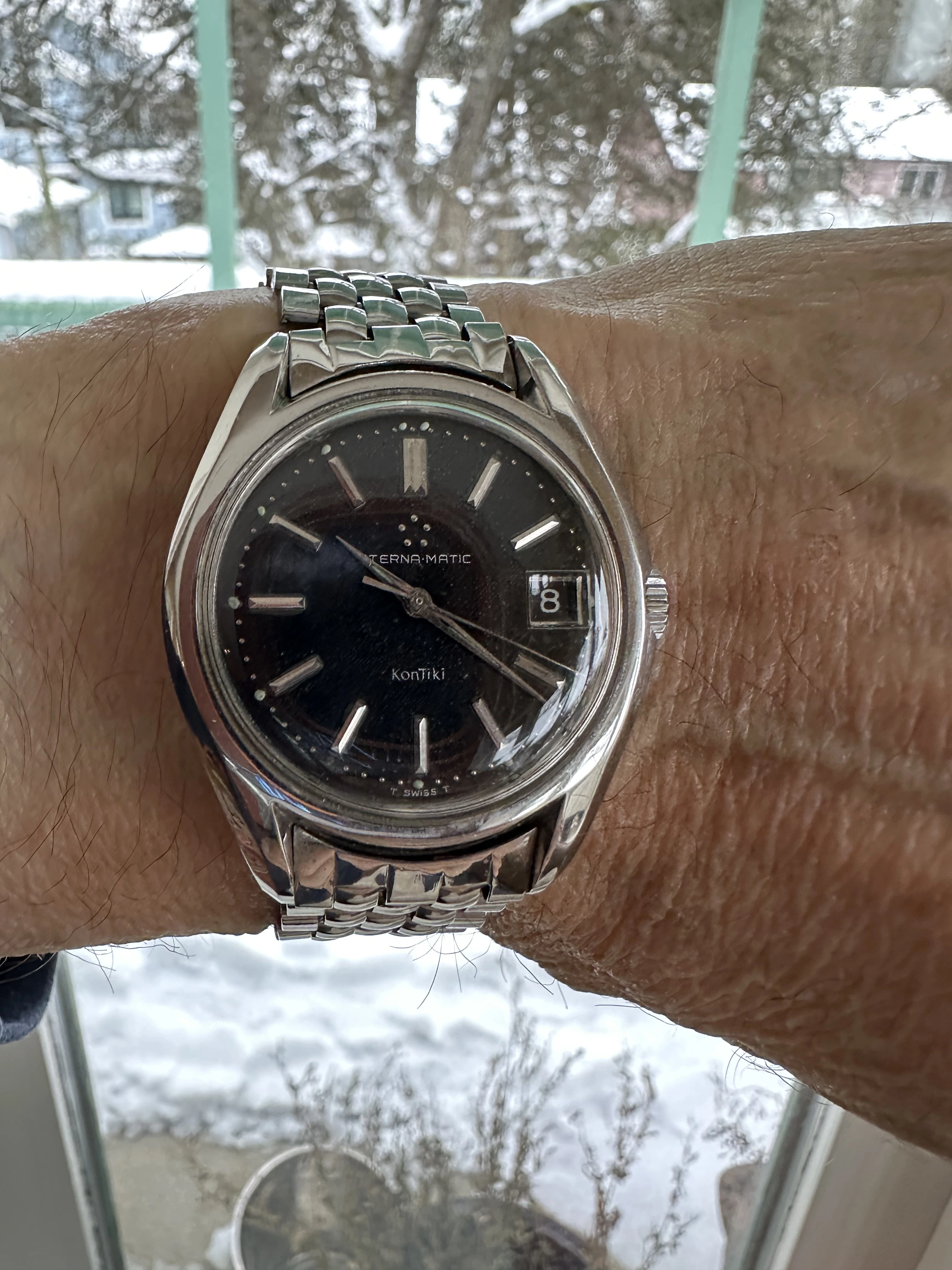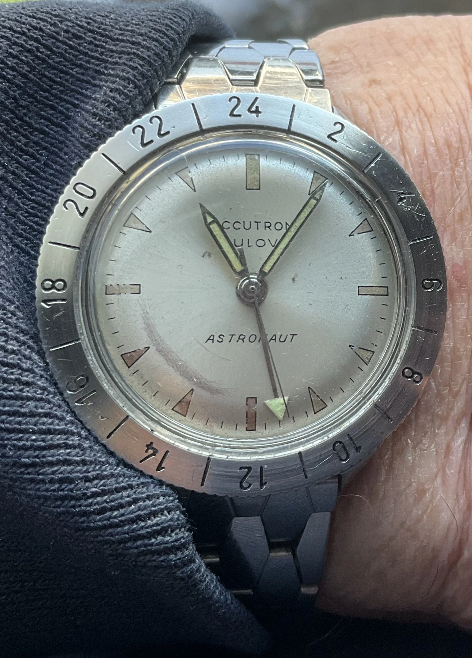 Another day, another Accutron. This time, my 58 year old Astronaut. Bought as a fixer-upper about 40 years ago. Languished among my project watches until late in 2024 when I grabbed the bull by the _ _ _ _ _ and serviced another Accutron movement, and resuscitated the Astronaut. Not perfect as you doubtless can see, but at least I now can wear it. Original “coffin” link Kreisler bracelet.