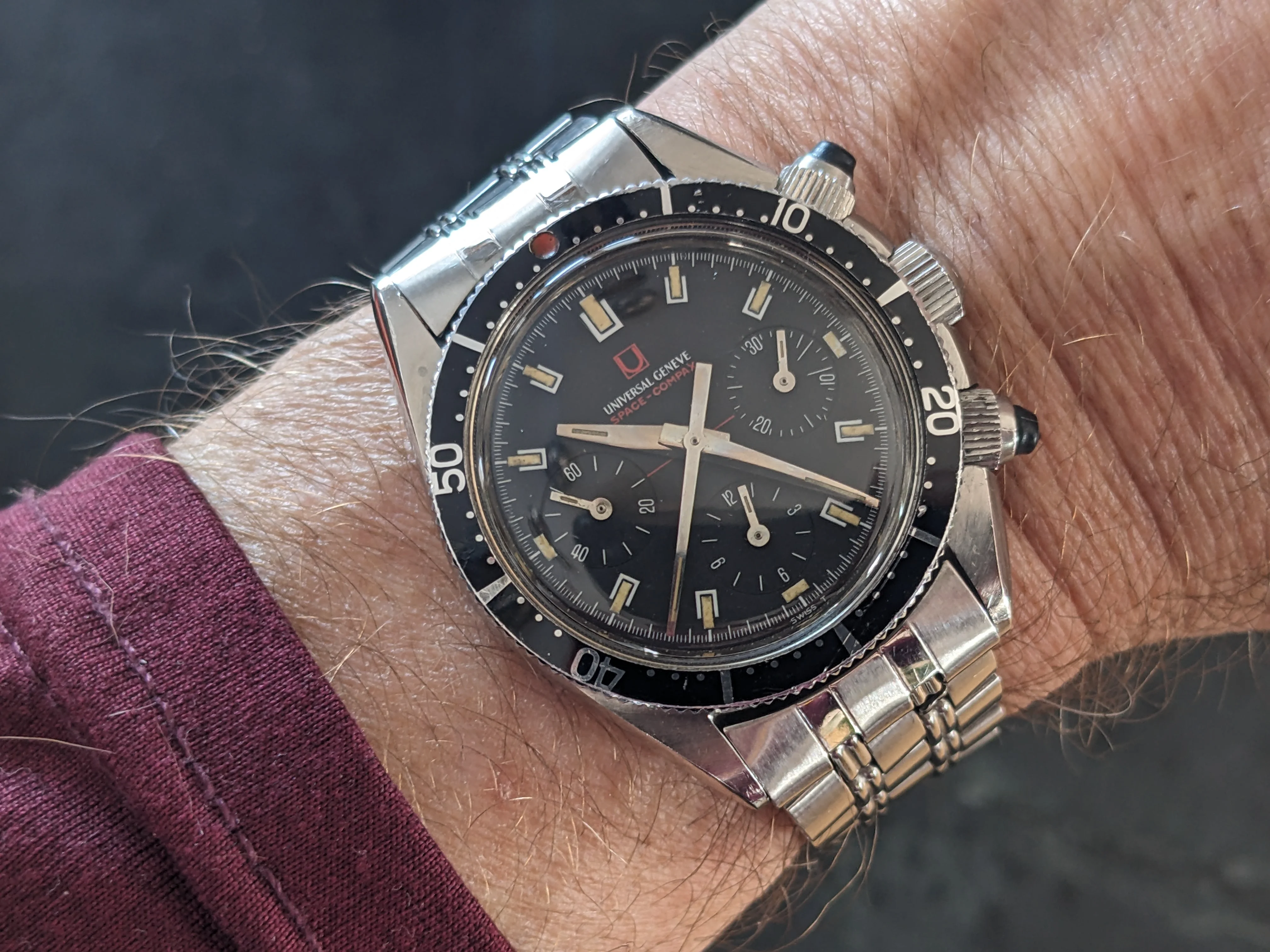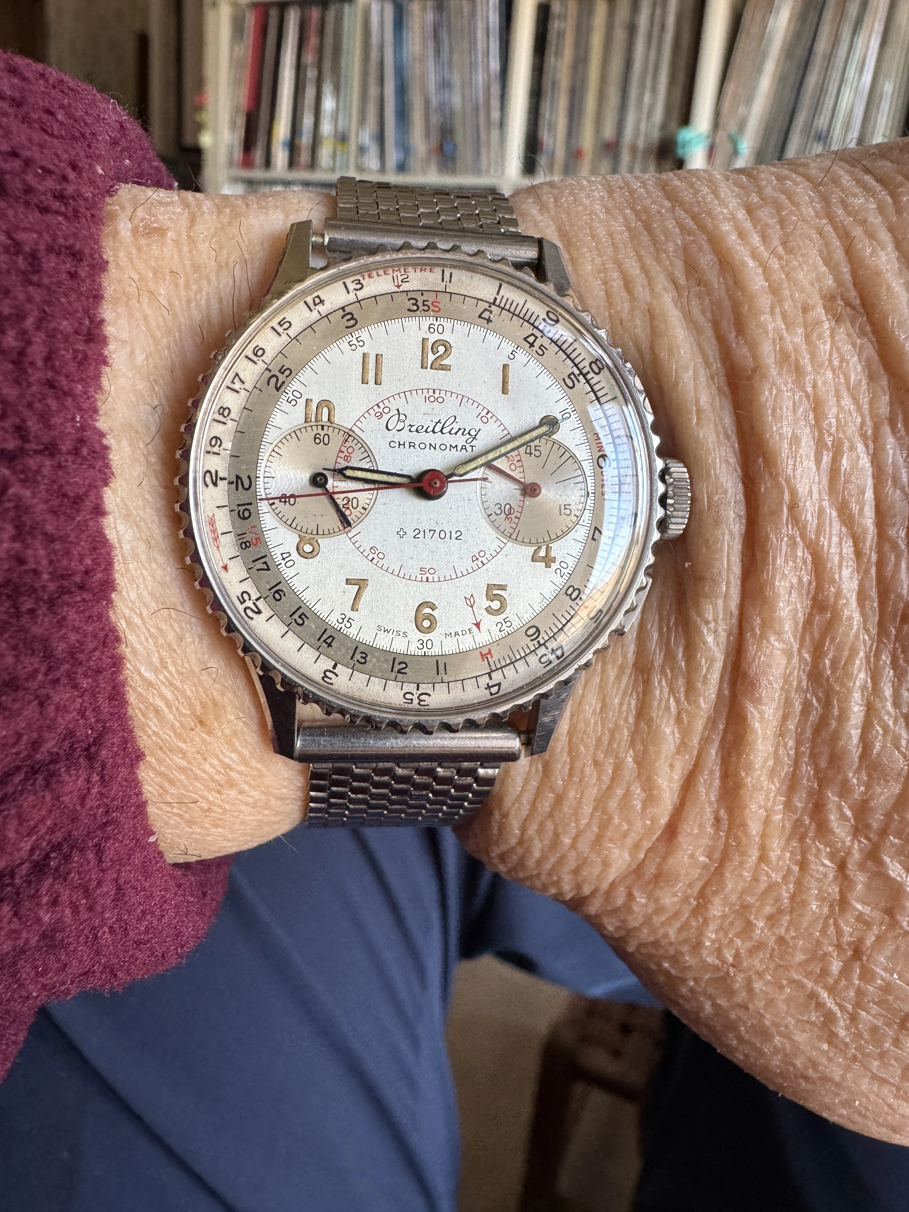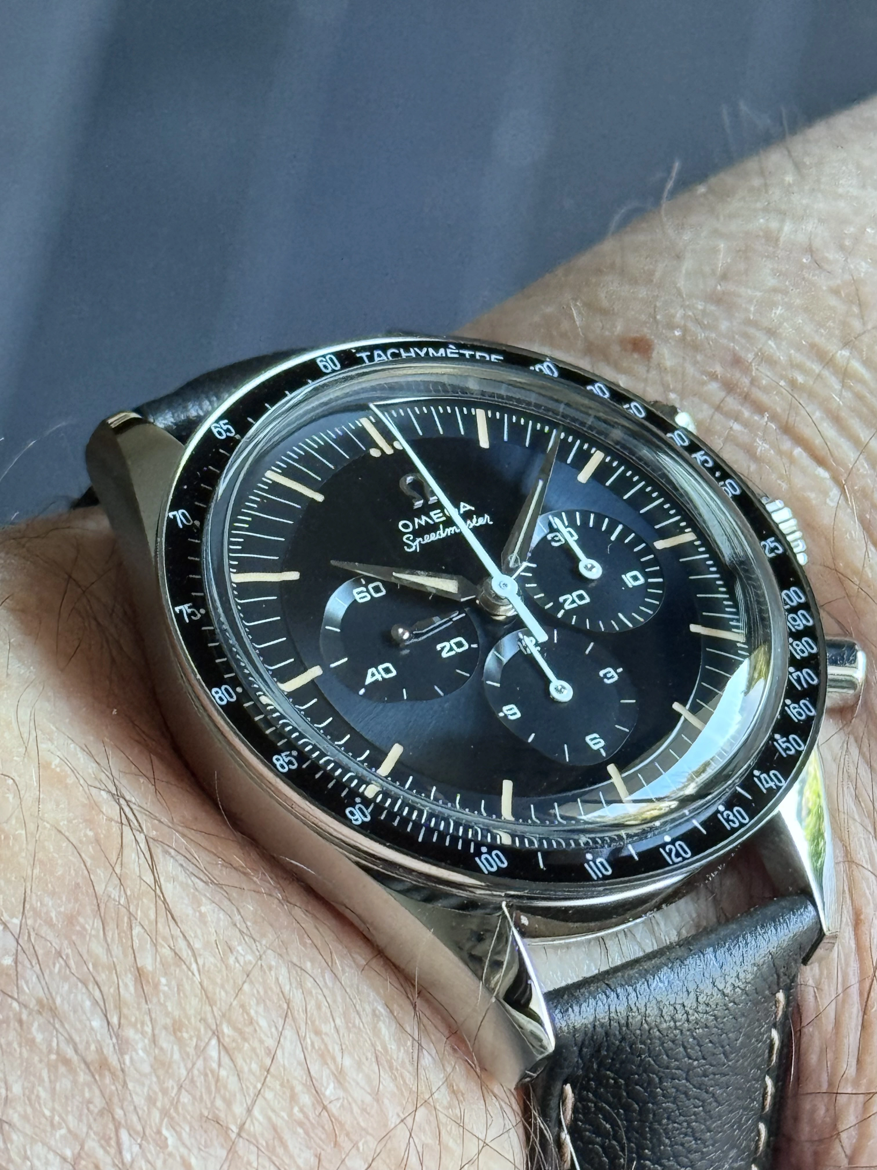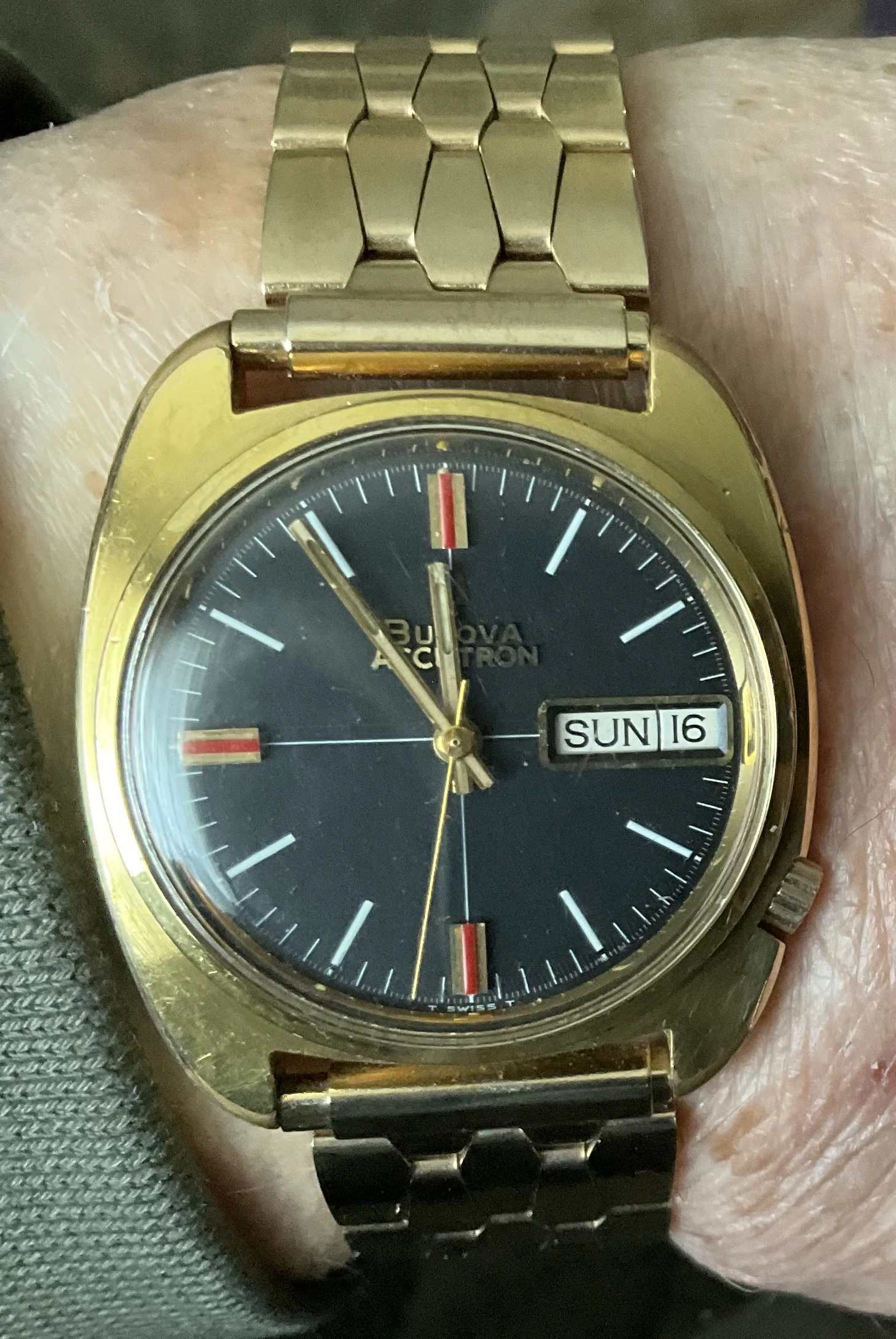 I’ve enjoyed wearing Accutron 214s for the last few weeks. Problem? No calendar! So today, to Hades with feng shui! Proportion, balance, call it what you will. Time for a watch with a calendar. In 1969, I worked for a Bulova dealer. I sold this watch to the original owner that year. That’s 56 years ago! Circa 2010, he’d lost his wife, and was in ill health, and had vision problems. He could no longer read his beloved Accutron, and nobody in his family wanted it. So he phoned me, and asked me to pay a visit. It was then that he gave me this watch. He wanted it to go to a good home. This was a popular model of Accutron in those days. Bulova closely associated this model with Apollo 11, the landing on the moon. In their point of sale signage and in their advertising, this model was often featured.