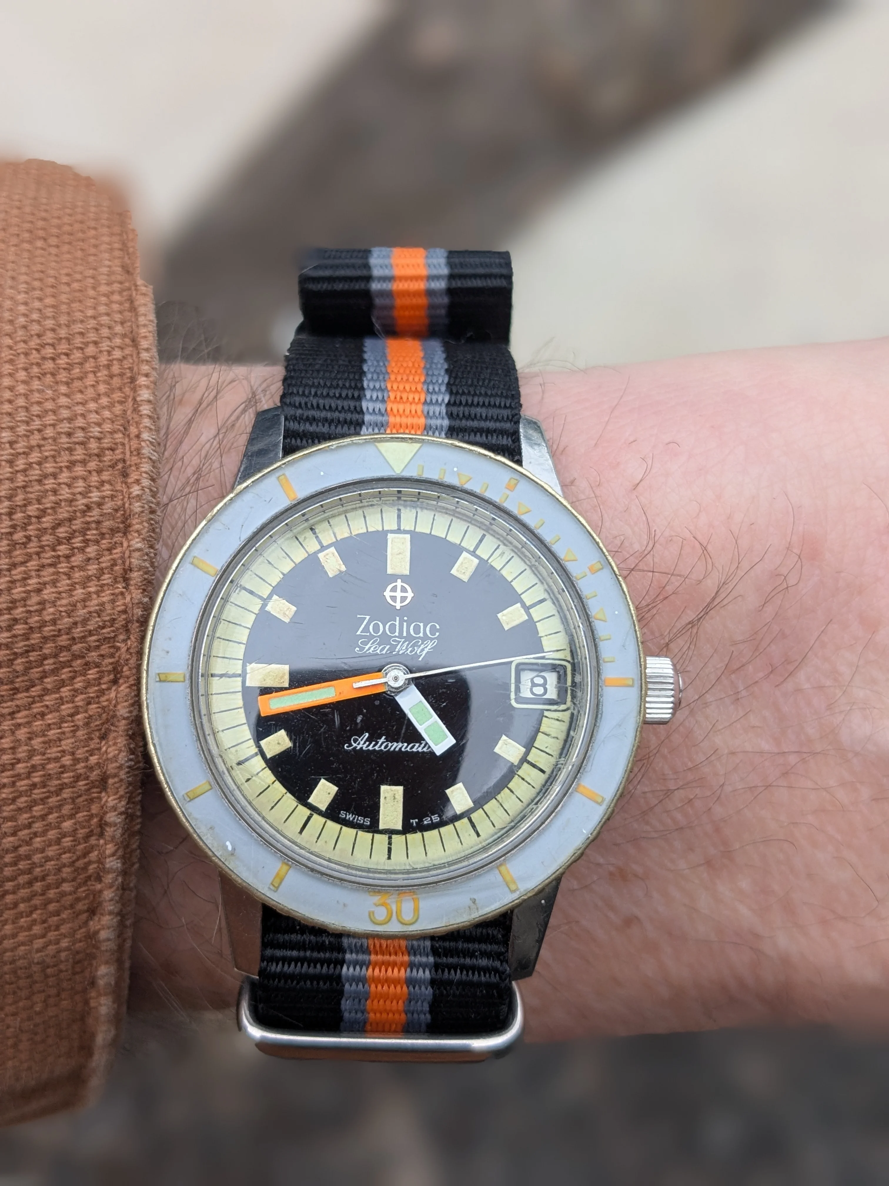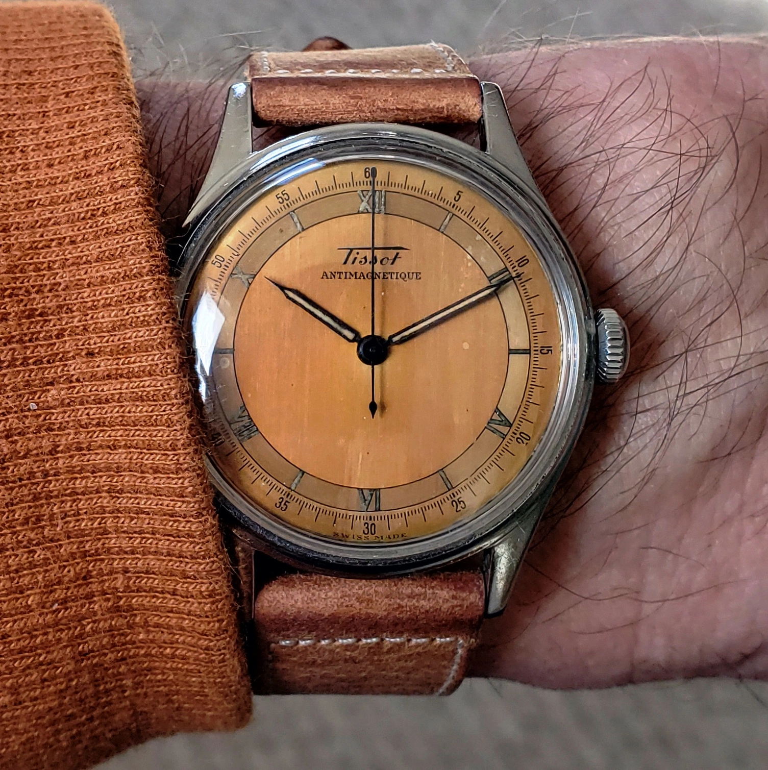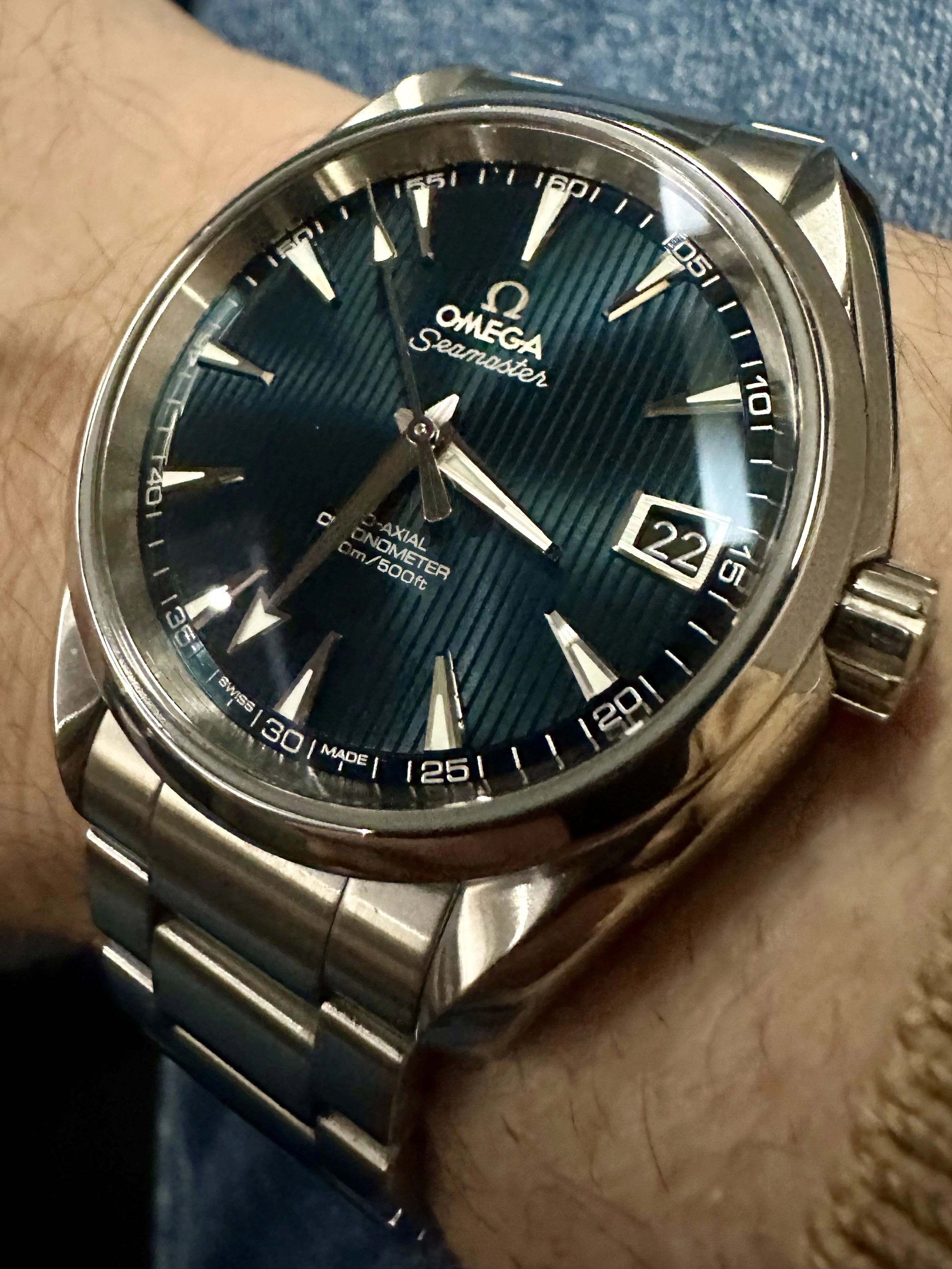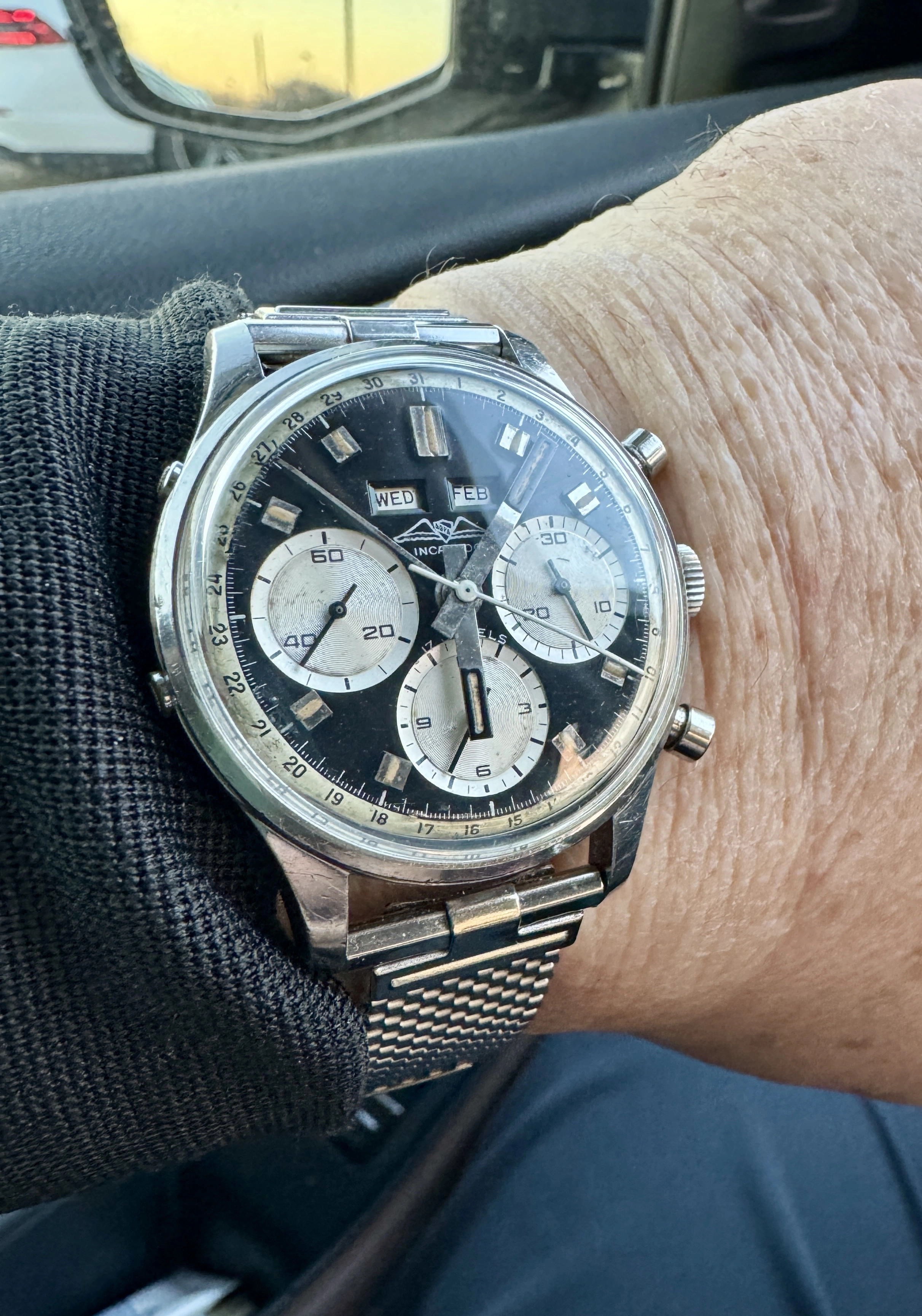 Electric blue in its "new" home. Case from a 2561.80 with what I think was significant water damage. Whatever happened destroyed the dial, hands, and movement. The 2263.80 was also a "for parts or repair" pickup as its HEV and crown were both rusted out, though surprisingly the dial and hands seem pristine. Still needs some work though. The crystal in the good case has a smudge on the inside near the date window that will bug the heck out of me, and the movement from the 2263.80 is flaky. I don't expect to find a 1538, so I'll probably put in an ETA 255.462.