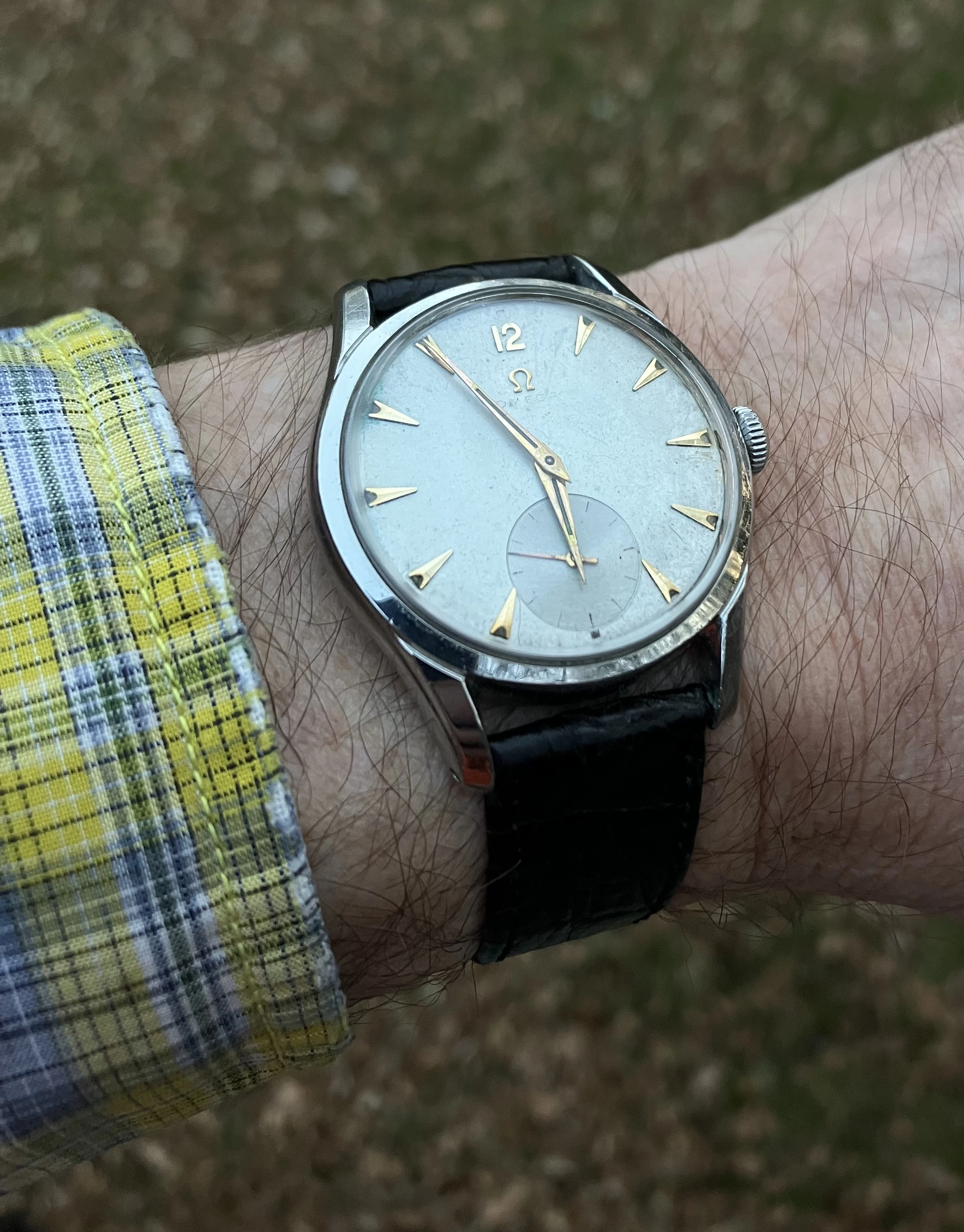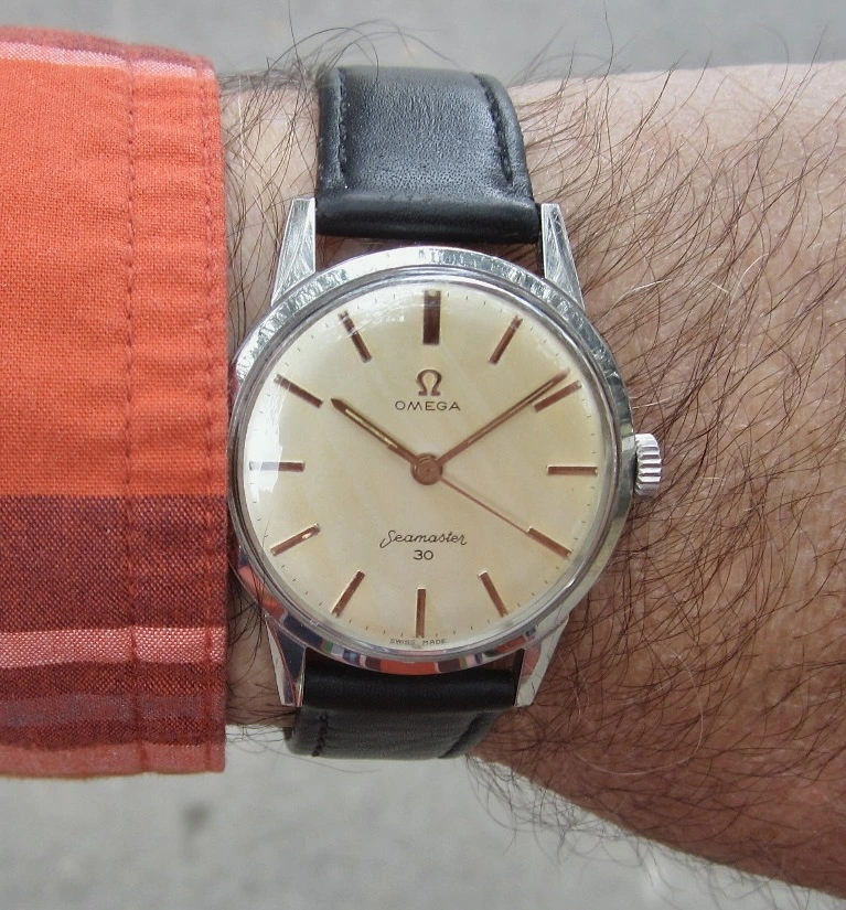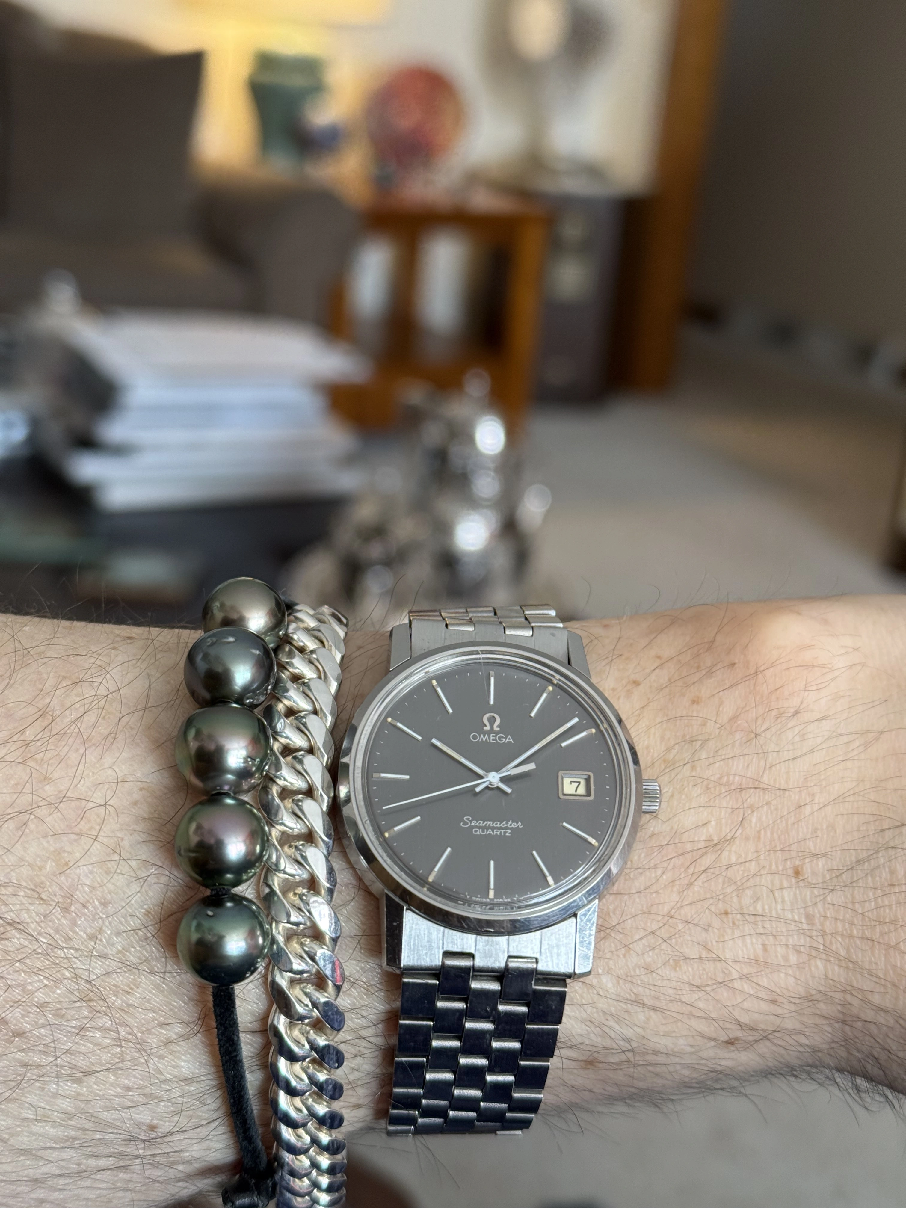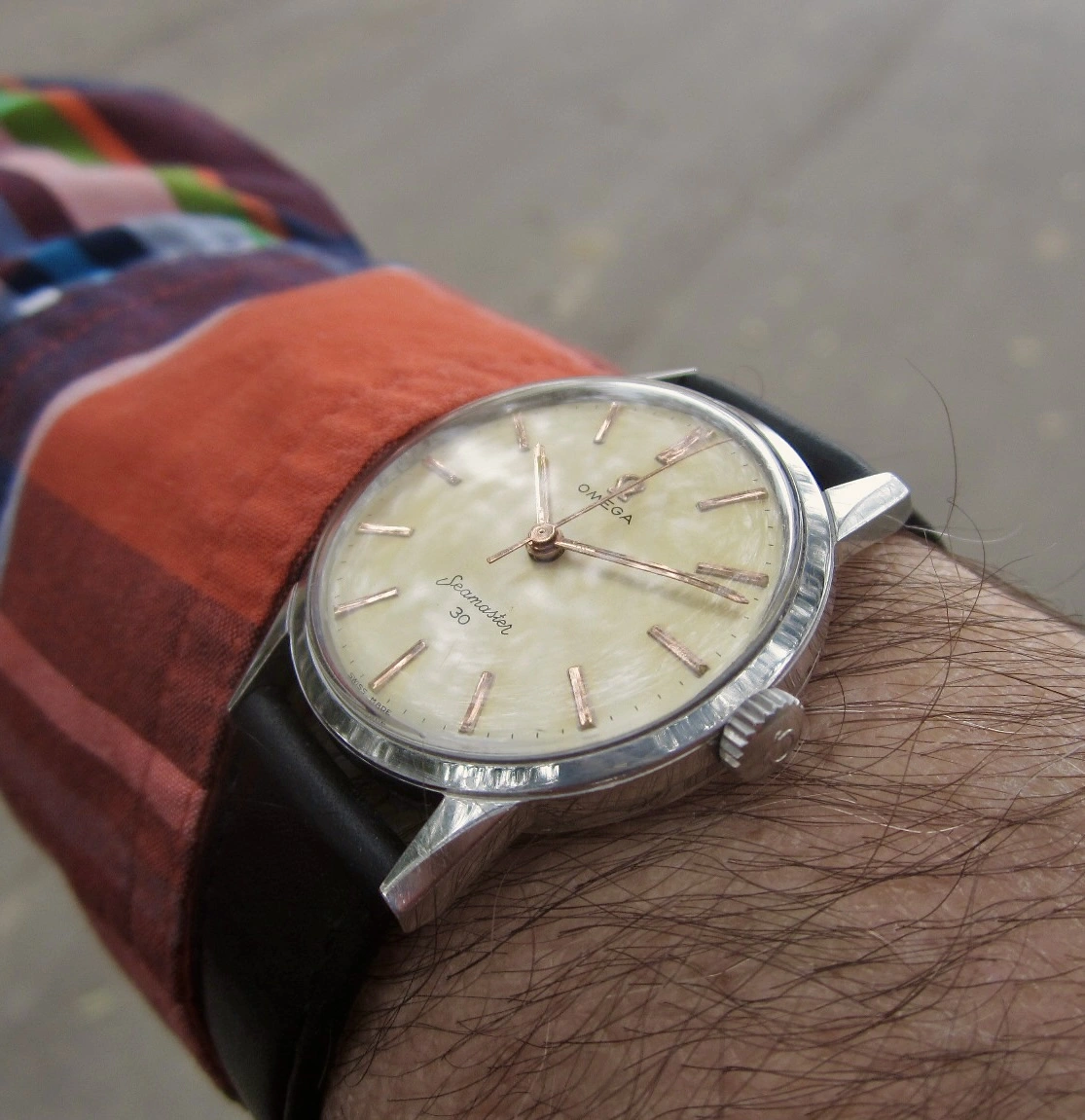Worn dial, cleaned, but my favorite dial layout. Worn strap, although original Omega. Worn shirt. Buckle is a gift from an old friend, belonged to his dead Seamaster Quartz from 1974.