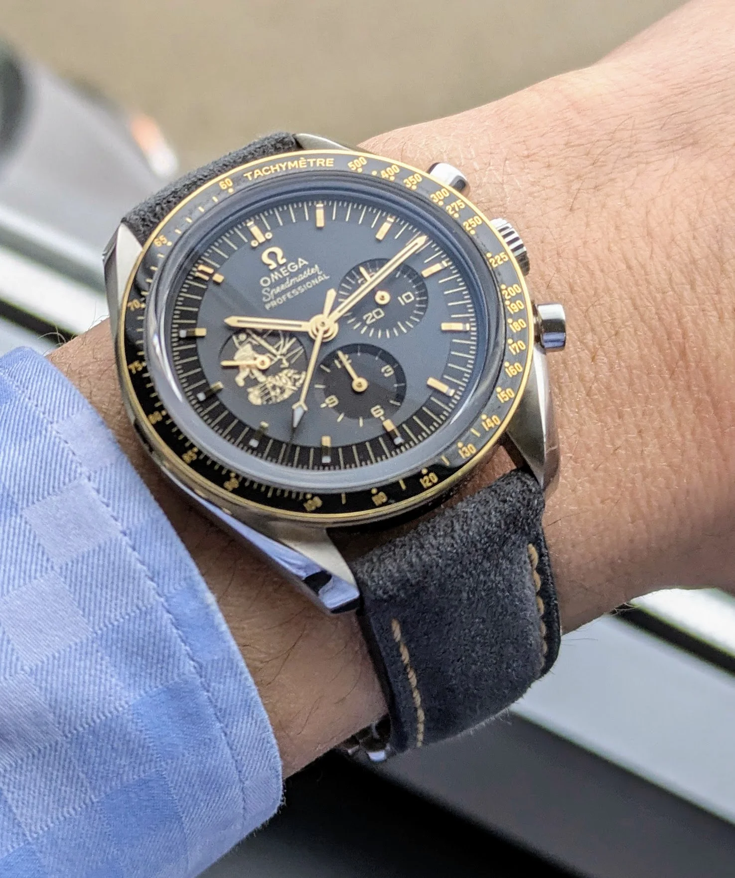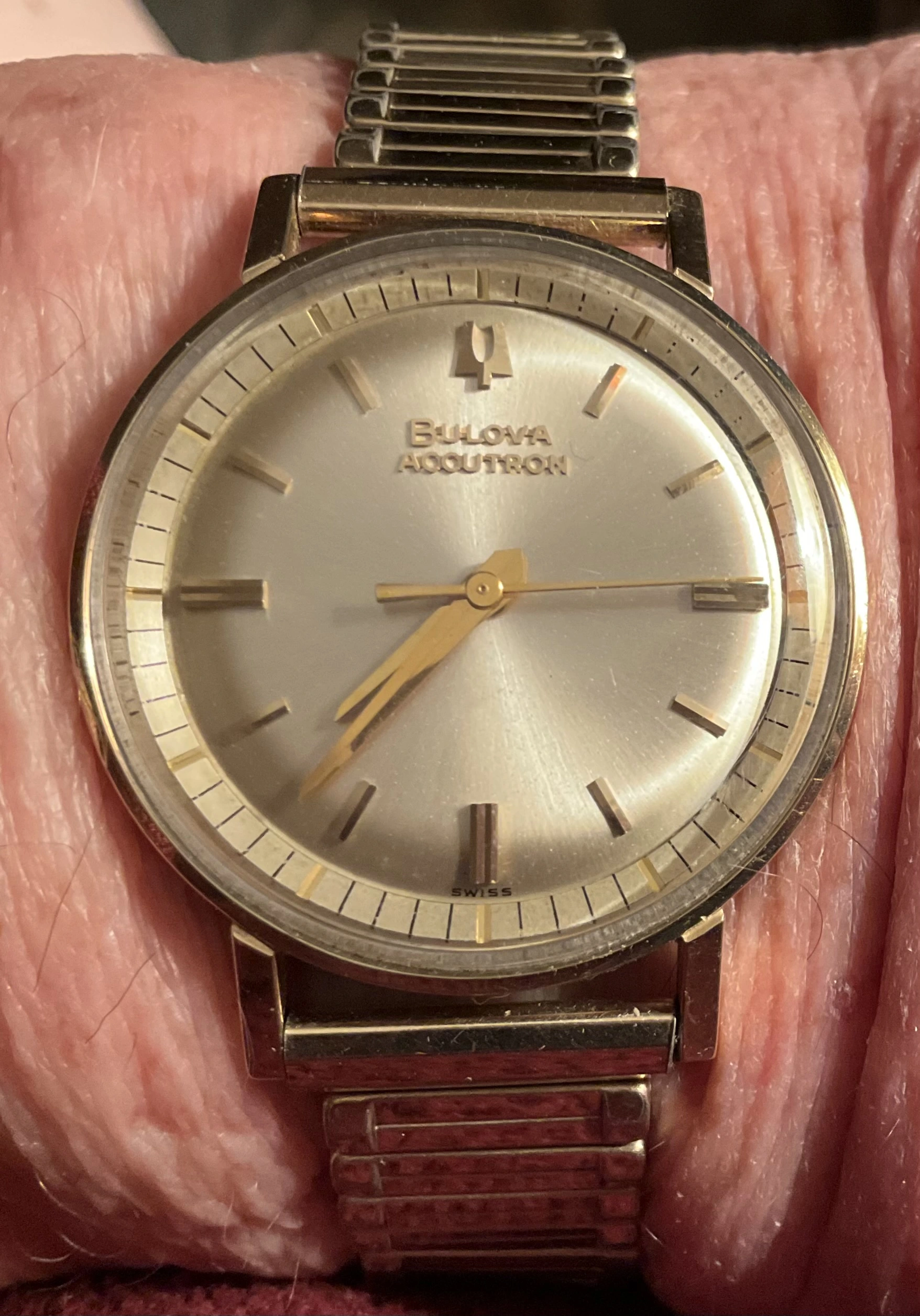 This one came to me from @Laneside of Scotland, as a non-runner. Bulova Accutron 214, unusual gold shell over steel case. Rust damage meant the original movement could not be salvaged. It is 60 years old, this year. It may have been a problem watch over all of its years, result being it looks virtually as new. I went to my stash and located another movement which performs as new with a thorough service, new cell, new gasket. Dial features applied markers. Lucky to have it!