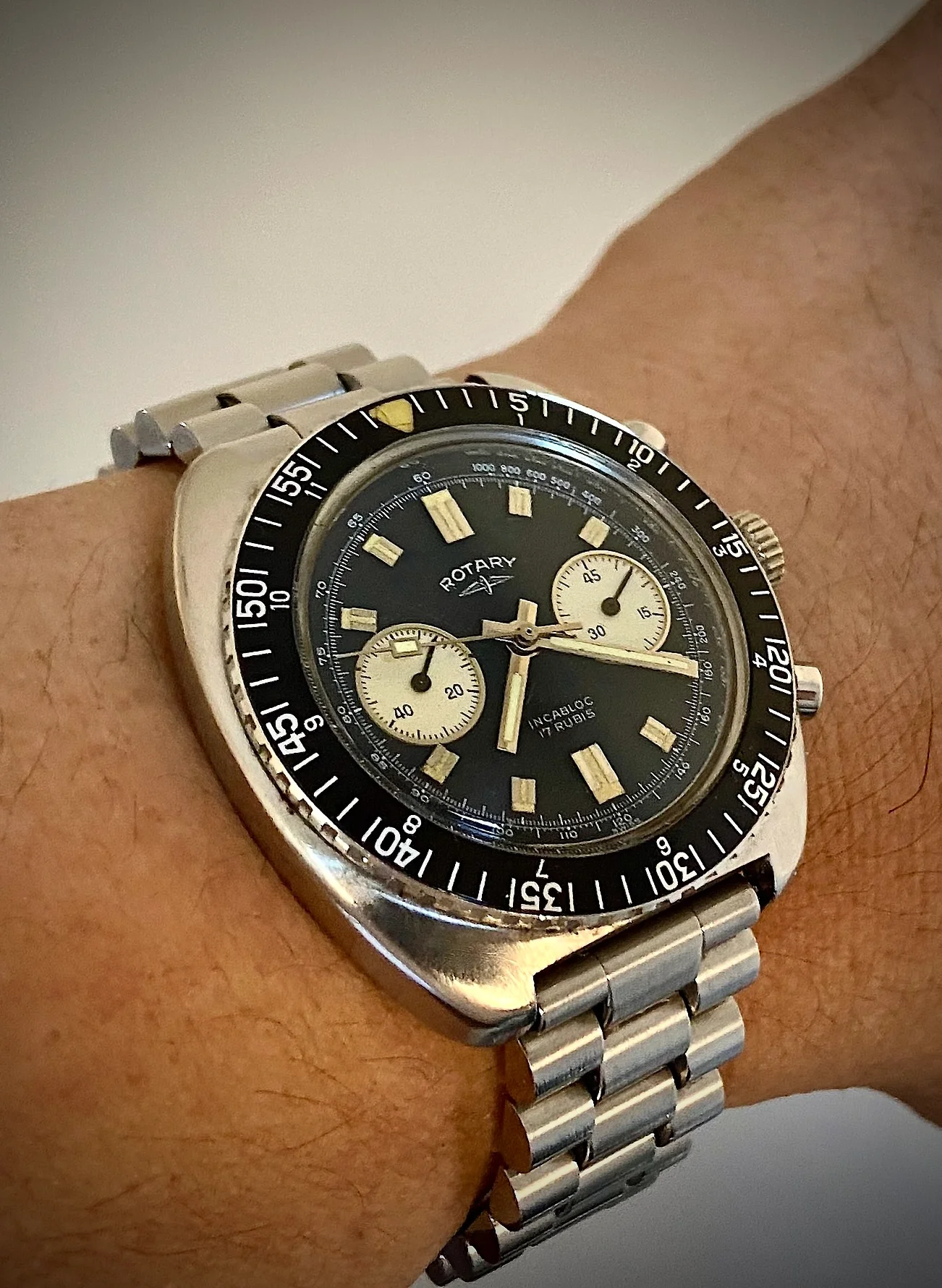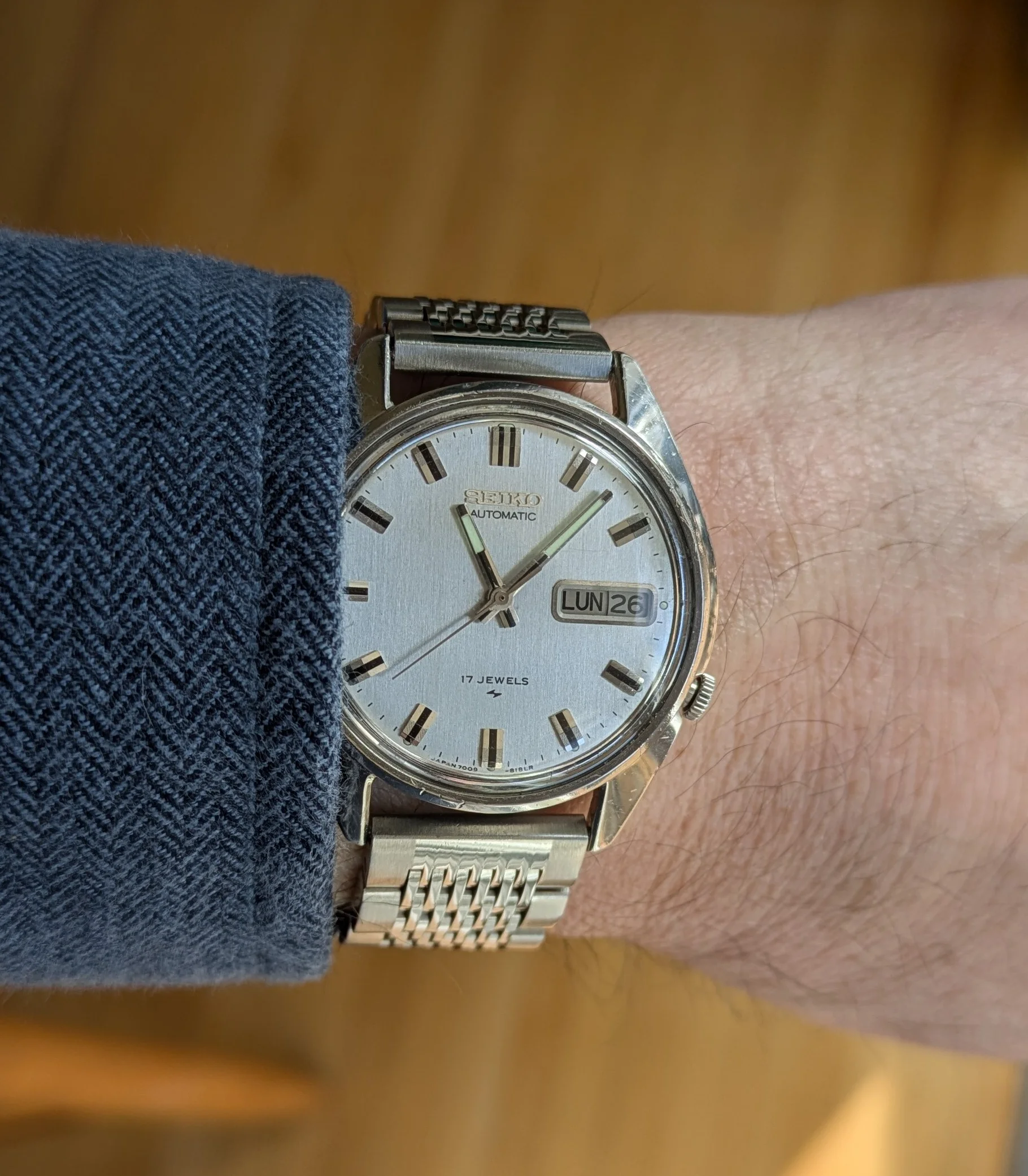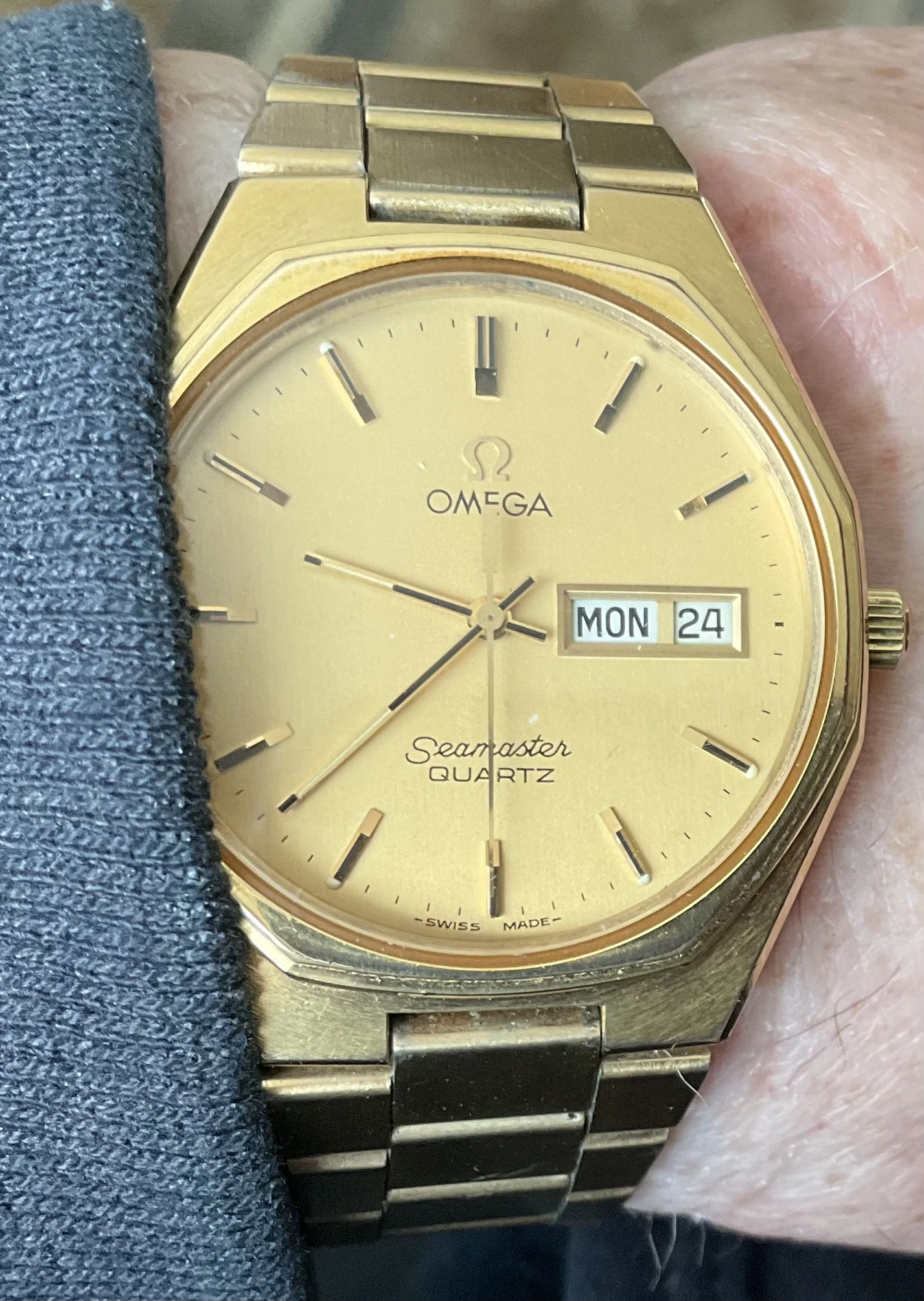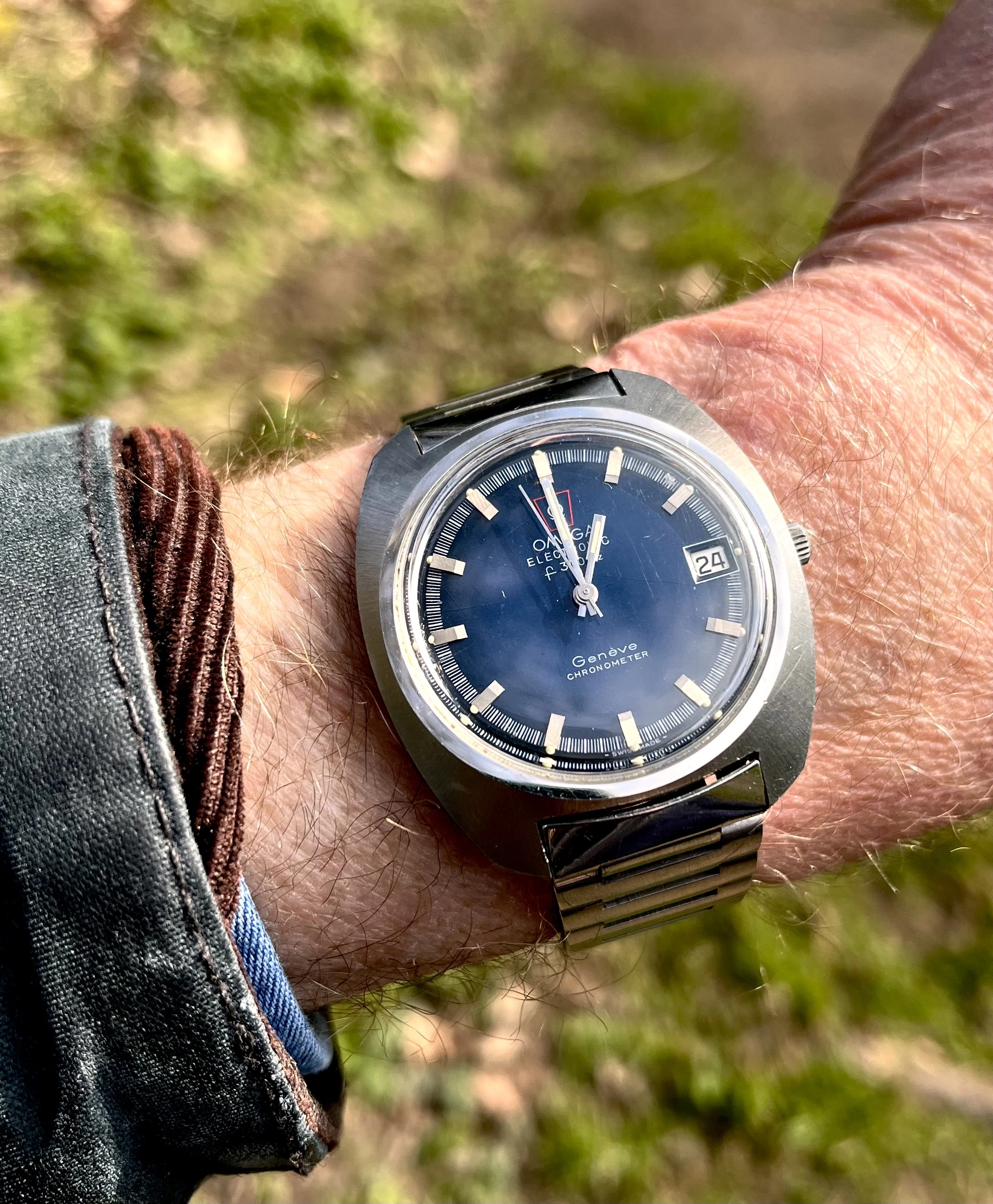 This one I haven’t worn for several years. For two reasons. Several years ago, it quit! I tried a new cell, to no avail. So it has sat in my vault until last week when I happened to look at it, to find it was running! This one is likely from the early to mid-1970s, before Omega was absorbed by Swatch. This one is a stepper motor quartz. It came my way when the husband of a friend whose watch it was, passed away. Nobody in the family wanted it, and she wanted to find a good home for it. So she gave it to me. The bracelet is too tight a fit on my large wrist, so I likely won’t wear it very often.