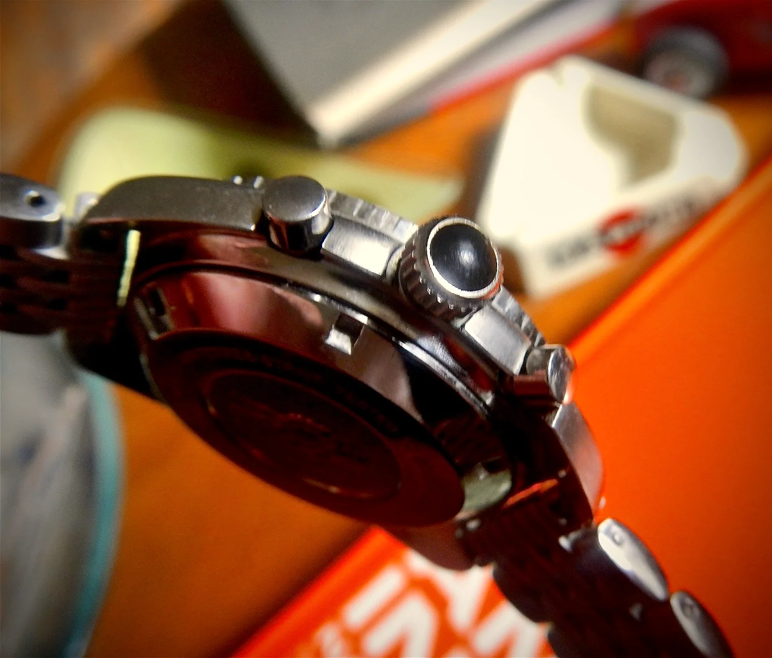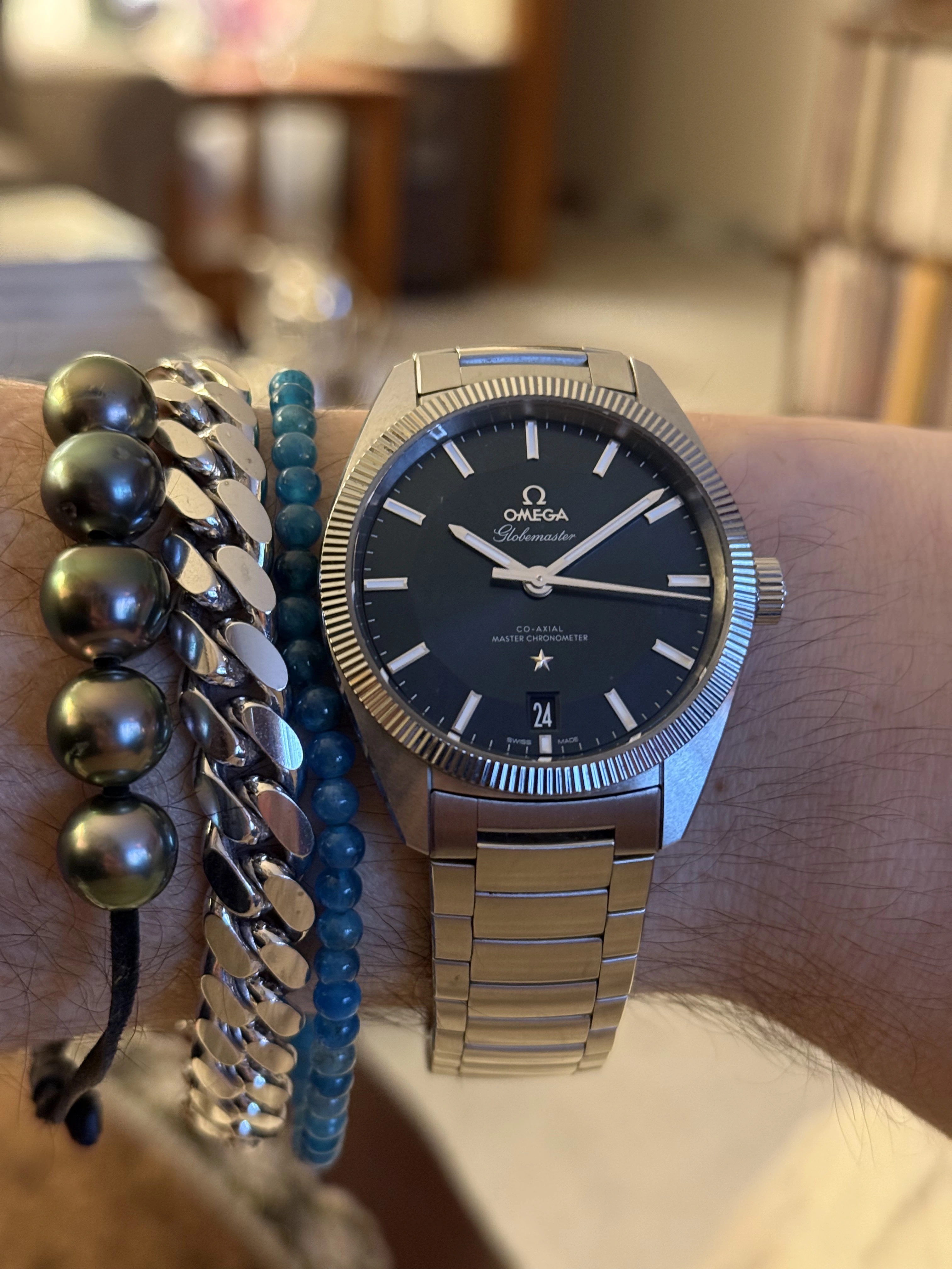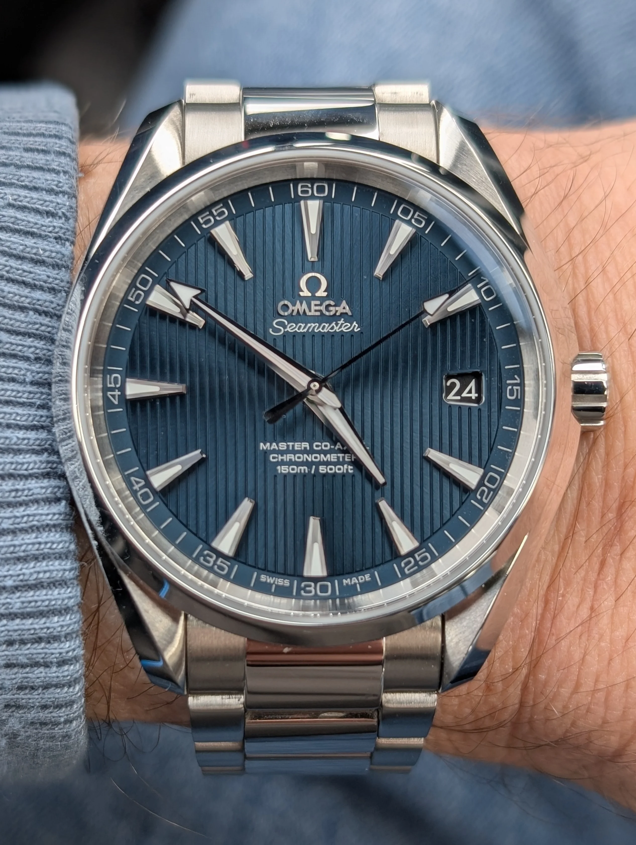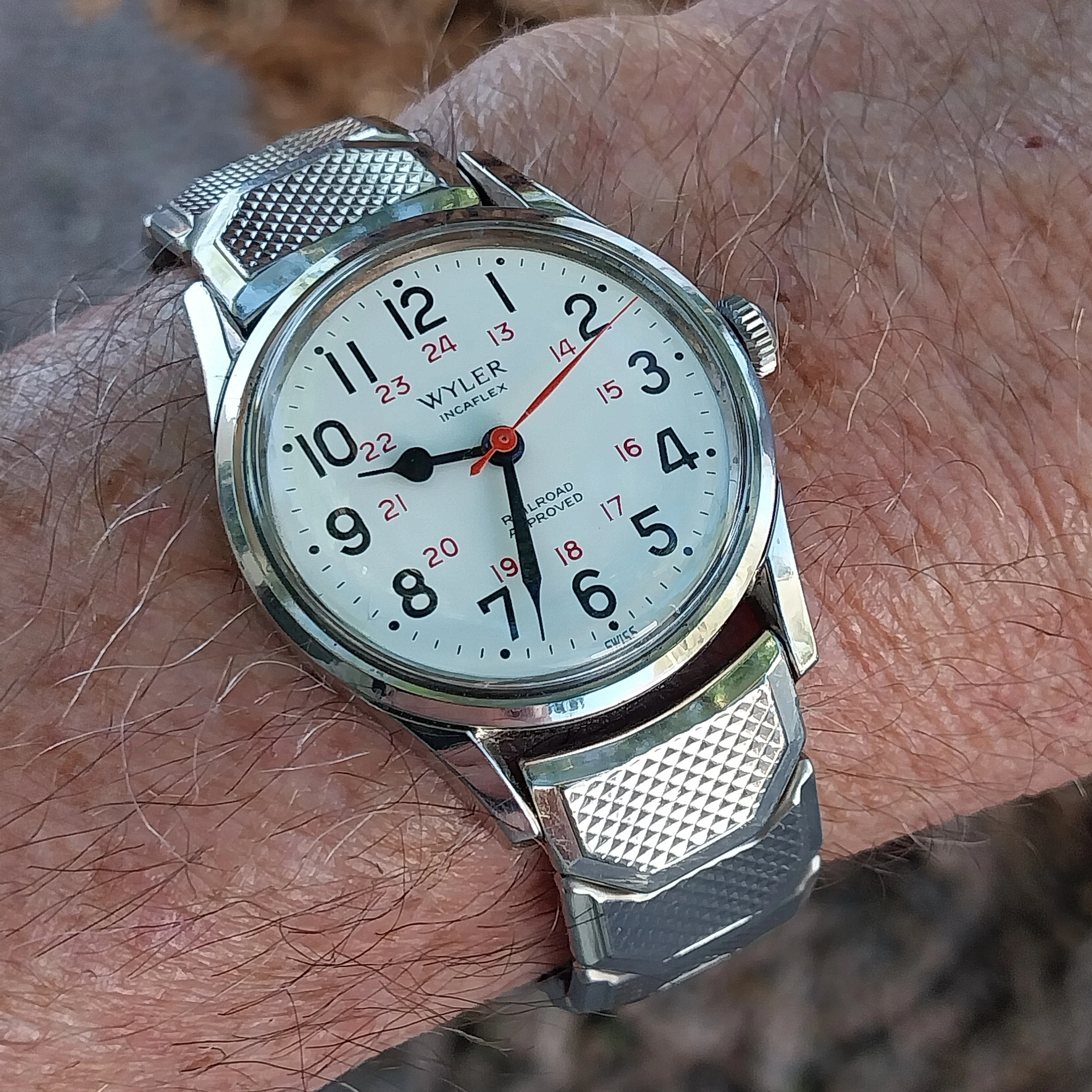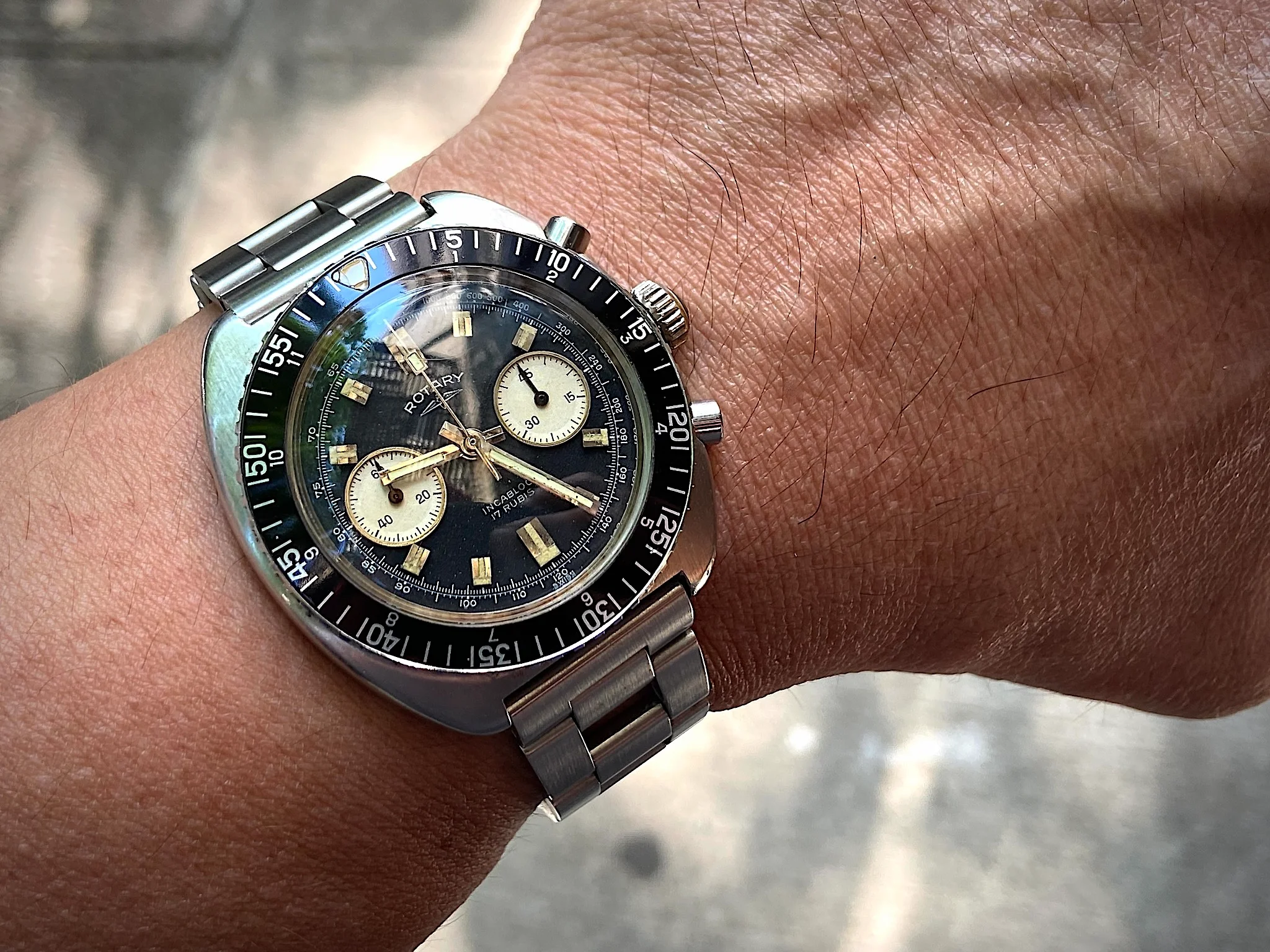 This one I haven’t worn for several years. For two reasons. Several years ago, it quit! I tried a new cell, to no avail. So it has sat in my vault until last week when I happened to look at it, to find it was running! This one is likely from the early to mid-1970s, before Omega was absorbed by Swatch. This one is a stepper motor quartz. It came my way when the husband of a friend whose watch it was, passed away. Nobody in the family wanted it, and she wanted to find a good home for it. So she gave it to me. The bracelet is too tight a fit on my large wrist, so I likely won’t wear it very often.