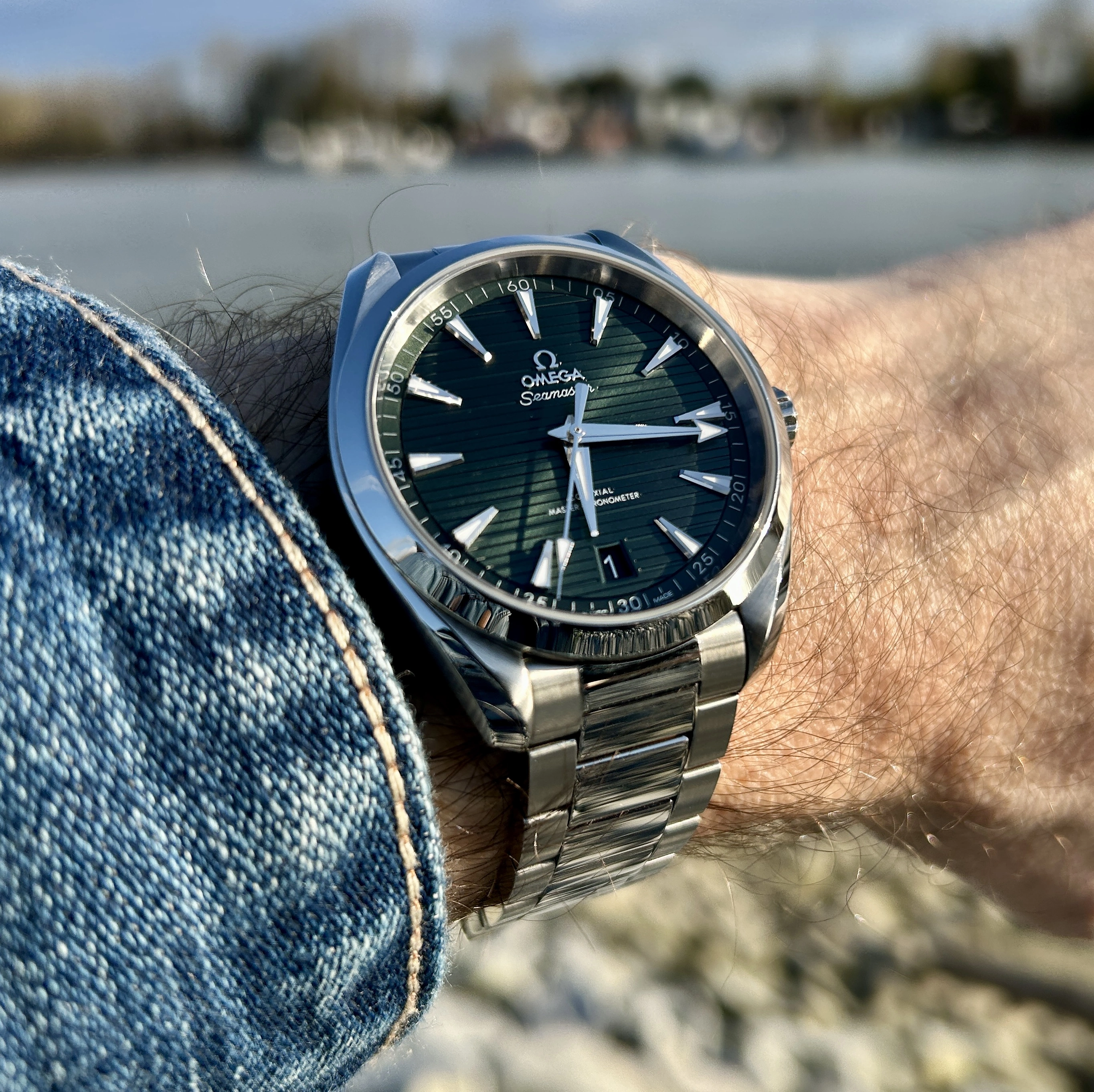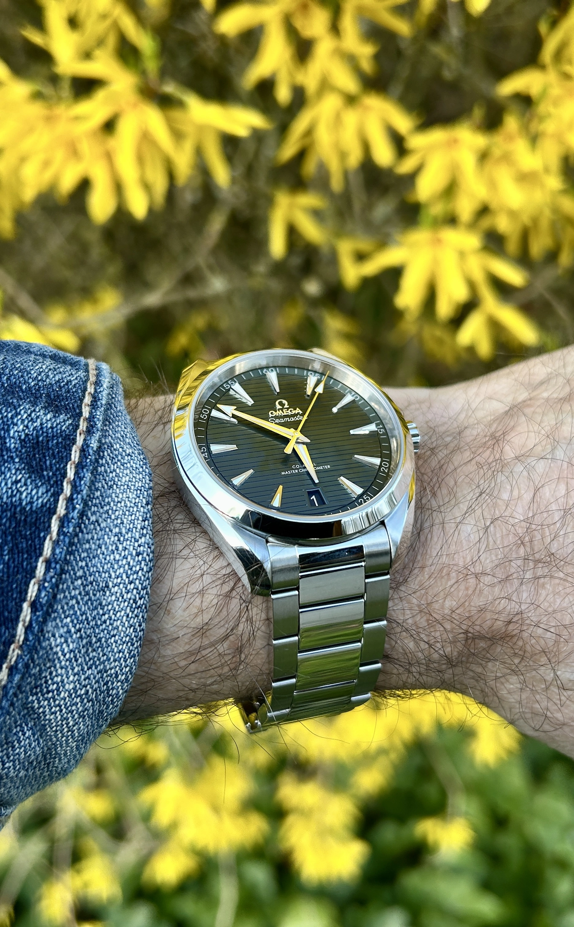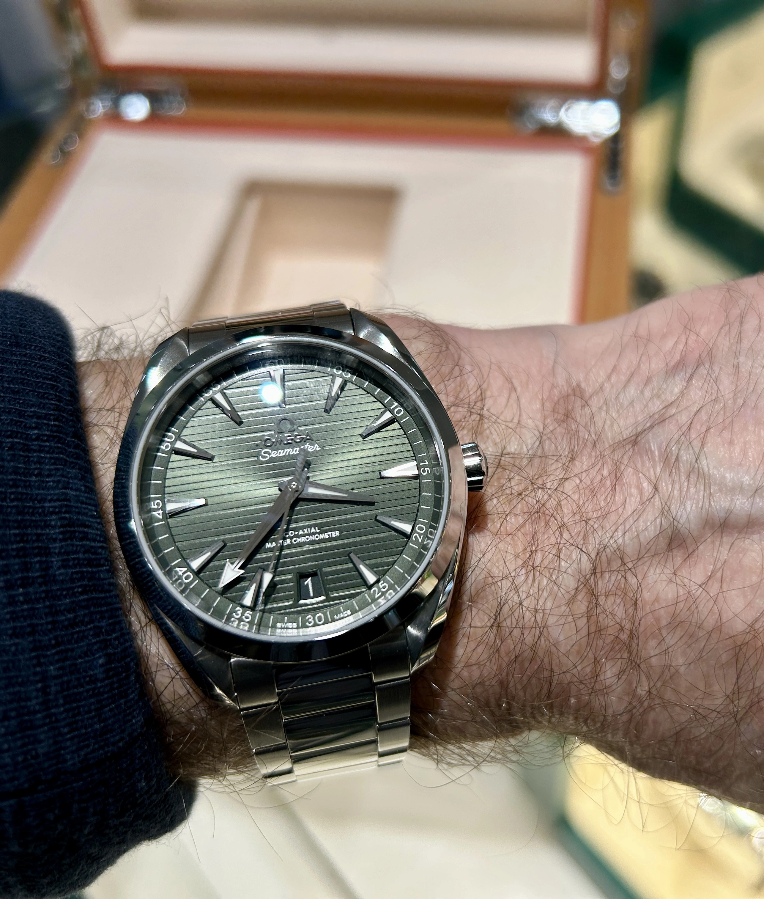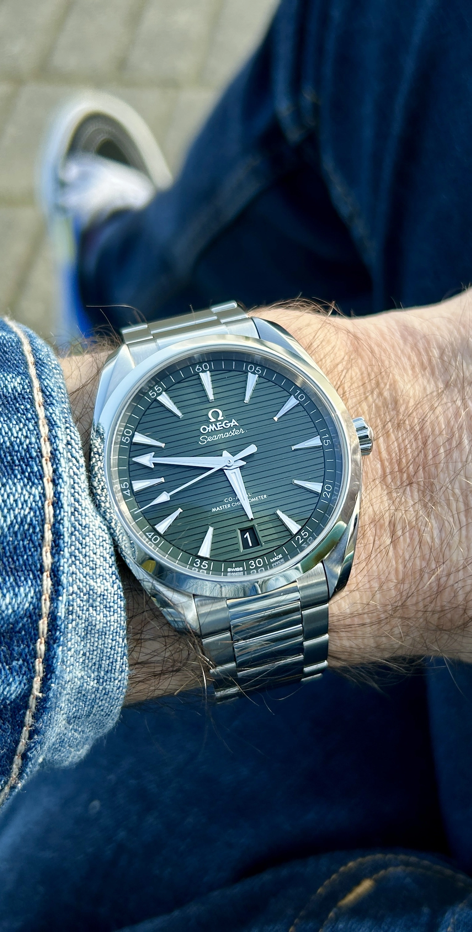 It’s been ages since I’ve posted here. I took my eye off the Omega ball for too damn long (dipping a few toes in the Tudor pool) but I’m back with renewed focus on my favourite watch brand. I am simply going bonkers for my new Aqua Terra 41, which I picked up yesterday. The green dial also appears black and slate depending upon the light. Beautiful.