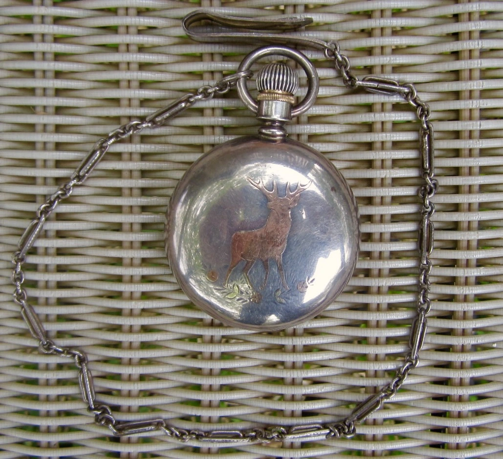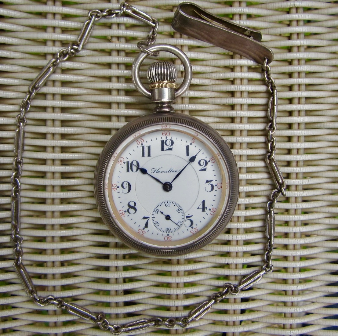 1908 vintage 18 size Hamilton 946 in its silver case and swinging from the "Kidder chain." A kind friend made a gift to me of his grandfather Kidder's solid silver watch chain. Only the fabulous Hamilton 946 is deemed worthy of the chain.