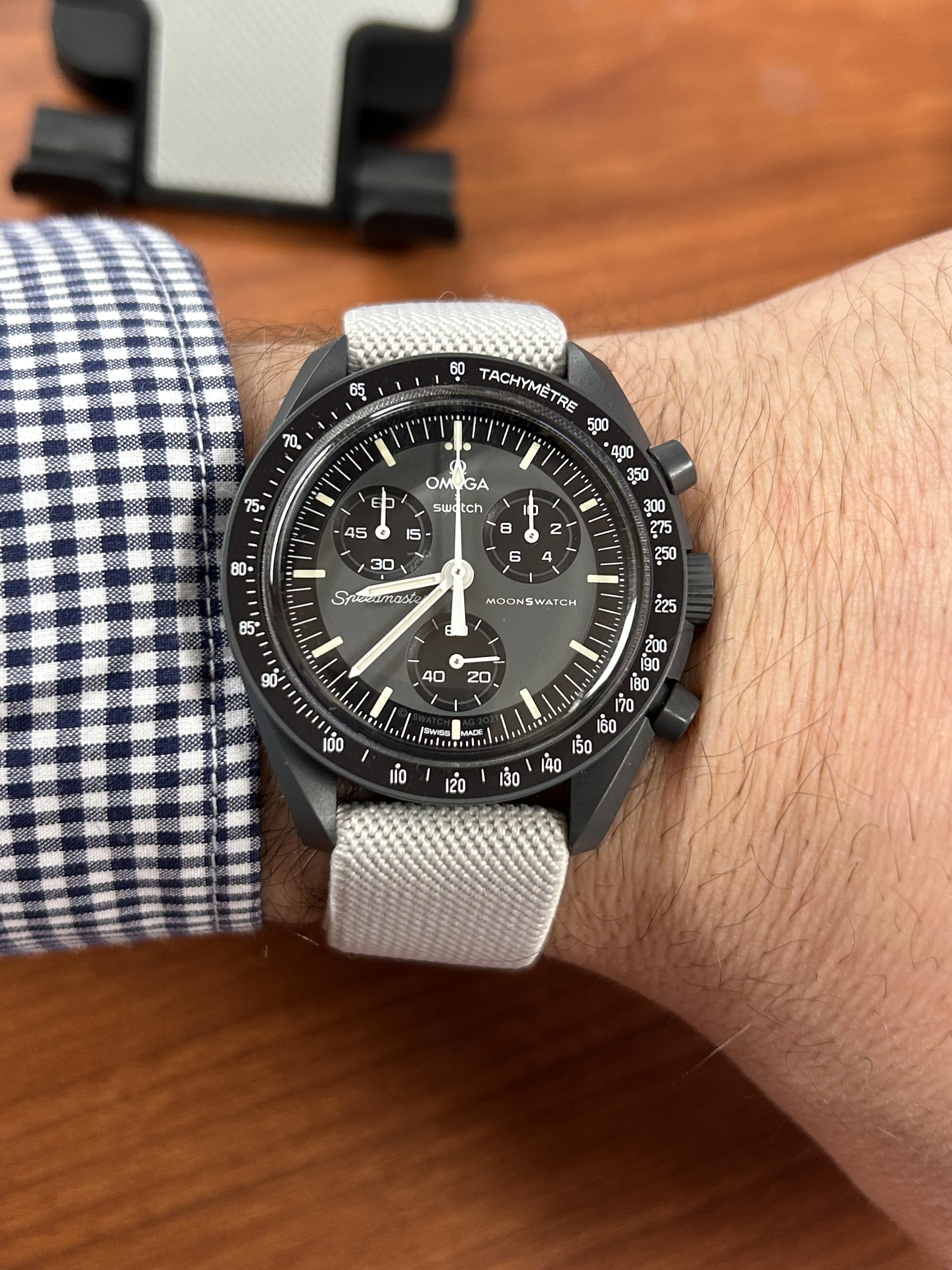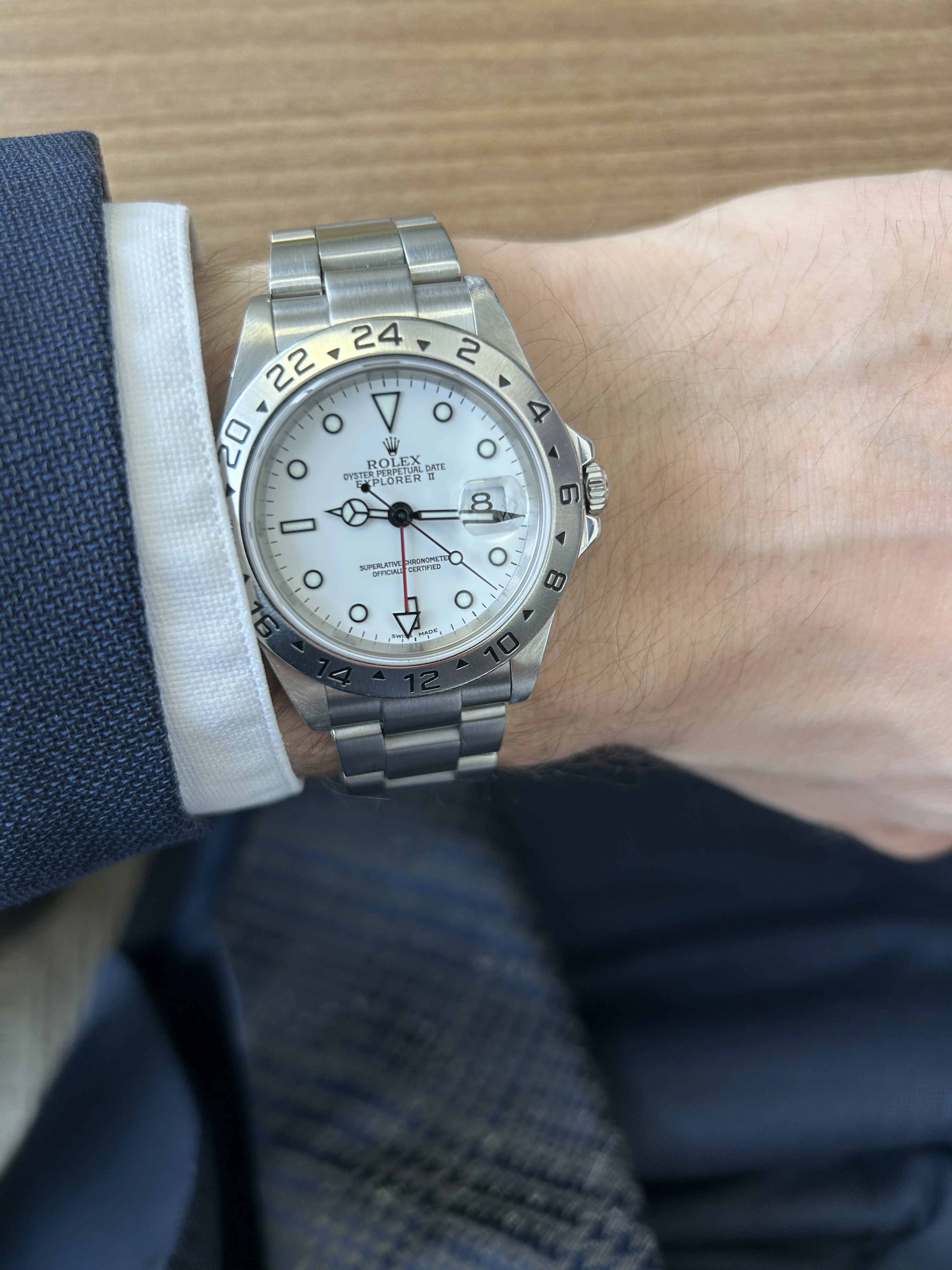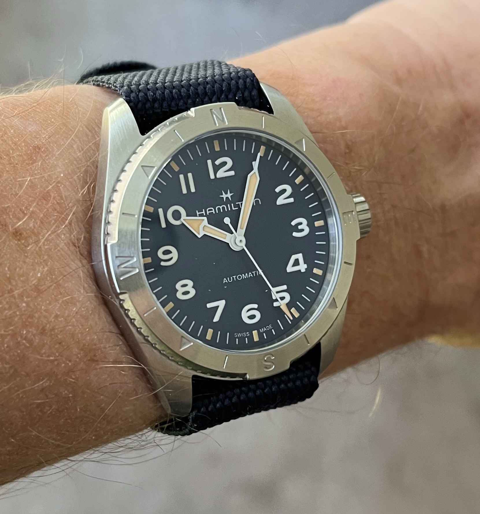 I can't recommend scheduling oral surgery on the morning of your birthday, but... it does give you an additional excuse to buy a new watch on that day. This Hamilton Khaki Explorer met the two essential requirements: its price was below the impulse purchase limit that I made up on the spot, and it was in stock at my local dealer. (Okay, the watch met the only essential requirement.) If a black or white dial had been available, I probably would have picked one of those, but after wearing the blue dial for a few days, I quite like it. Maybe that will fade as the pain diminishes, but so far it's looking like one of the few hasty purchases that turn out well.