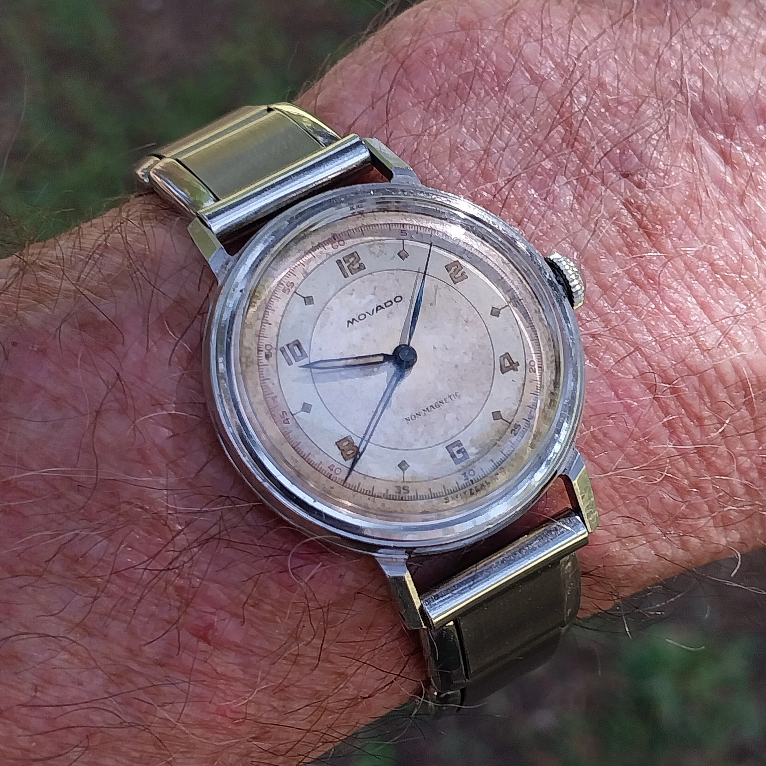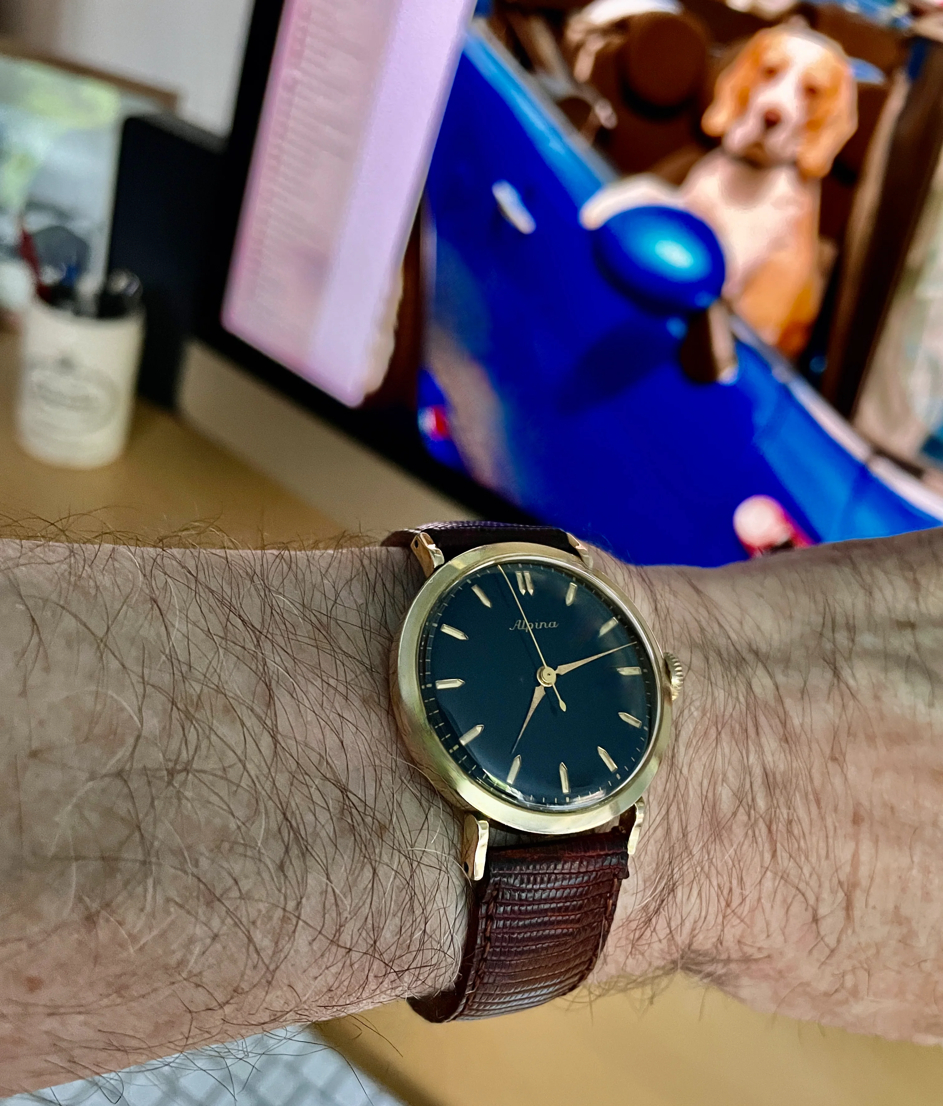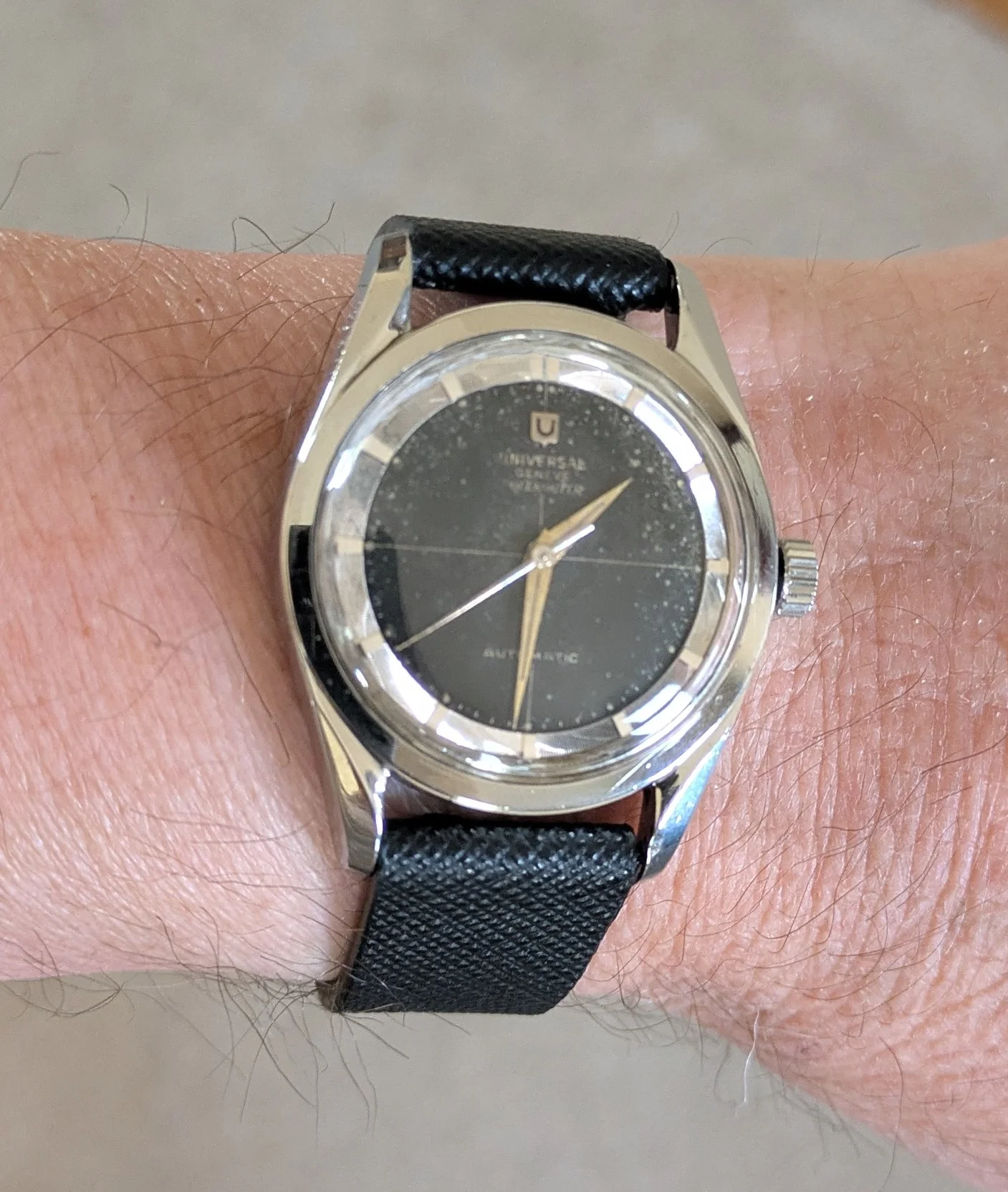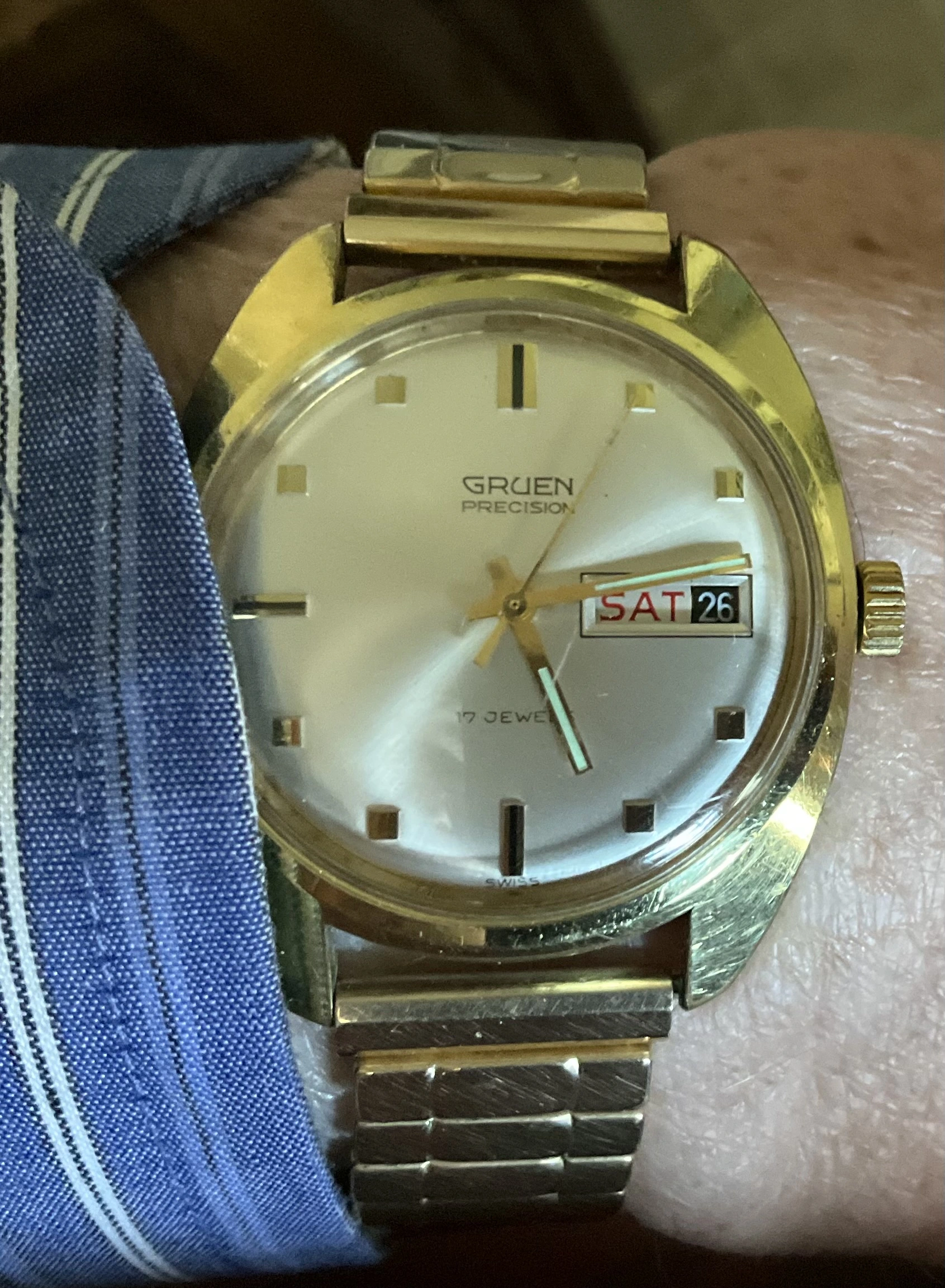 Time for a change. I’ve enjoyed the Accutron Spaceview, but I really miss having the date. So I have chosen a somewhat unusual watch. Unusual because it is a manual wind day-date model. A Gruen, probably from the late 1950s. Each time I choose this one, I have to retrain myself in setting the calendar. Not a quick change. Set the DAY first, then back and forth until the correct DATE. The day reverses but the date only advances. So once the day is set, it’s back and forth until the date is correct. Then, set it to time.