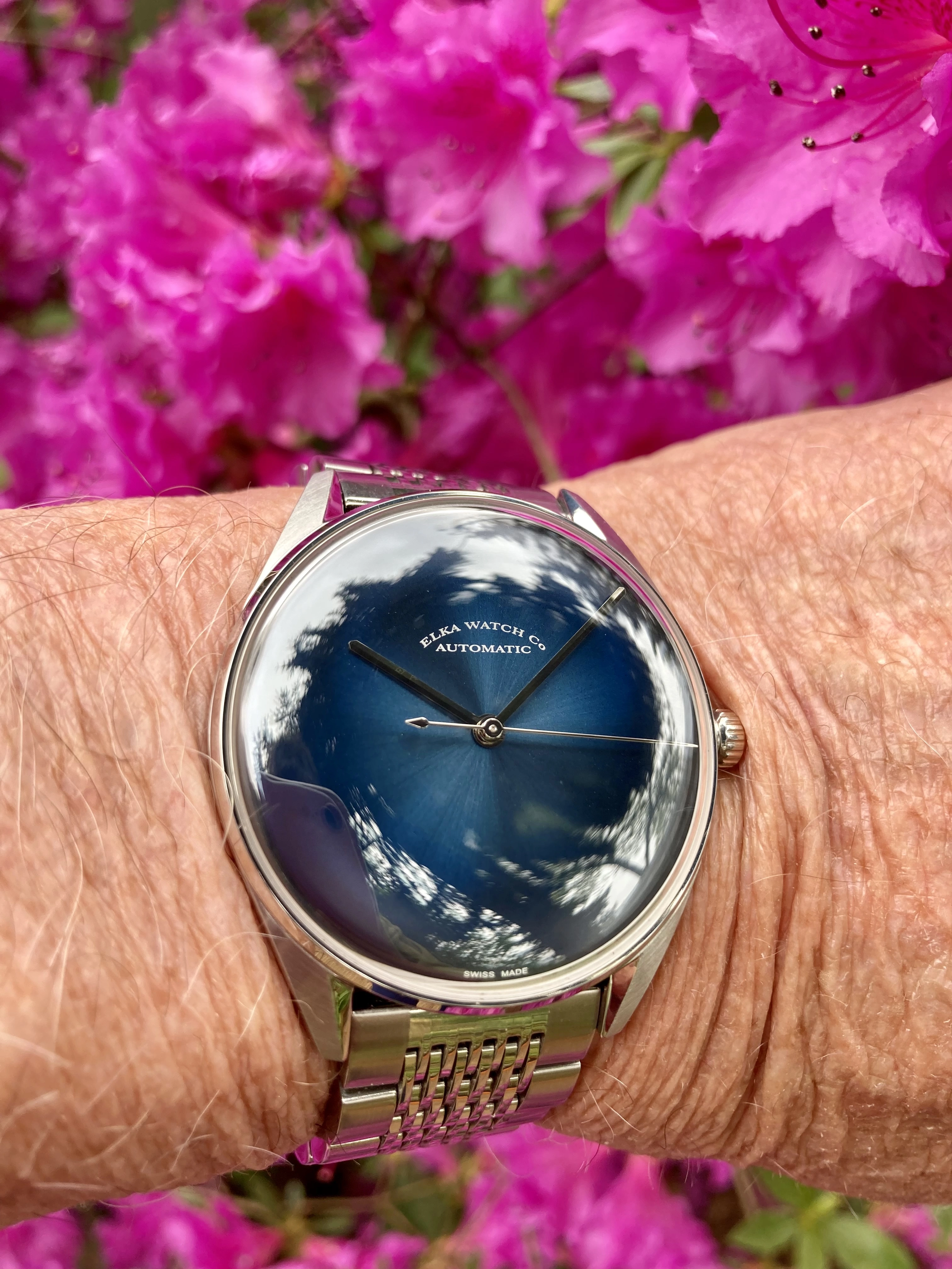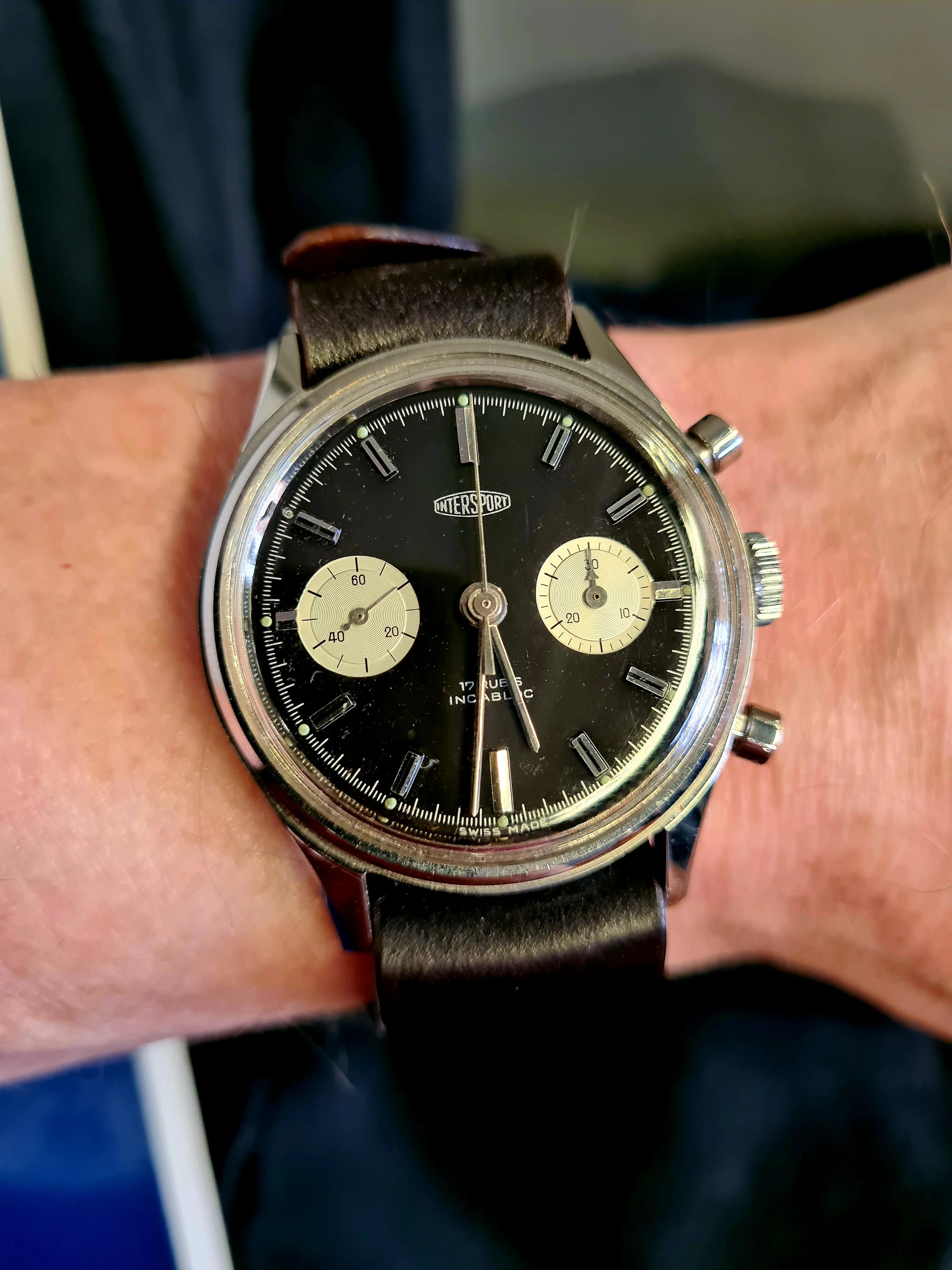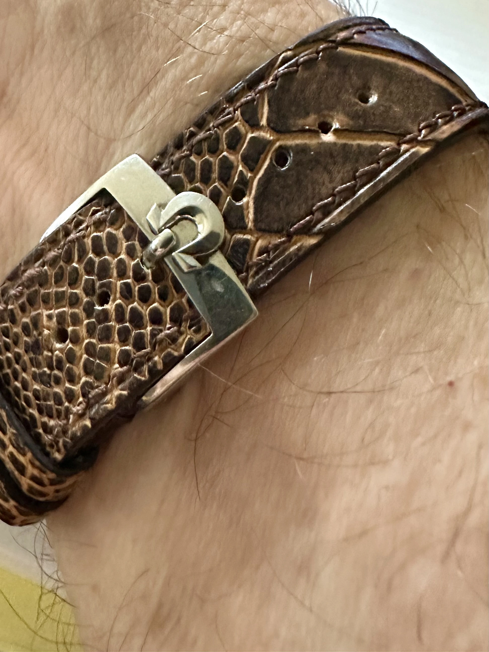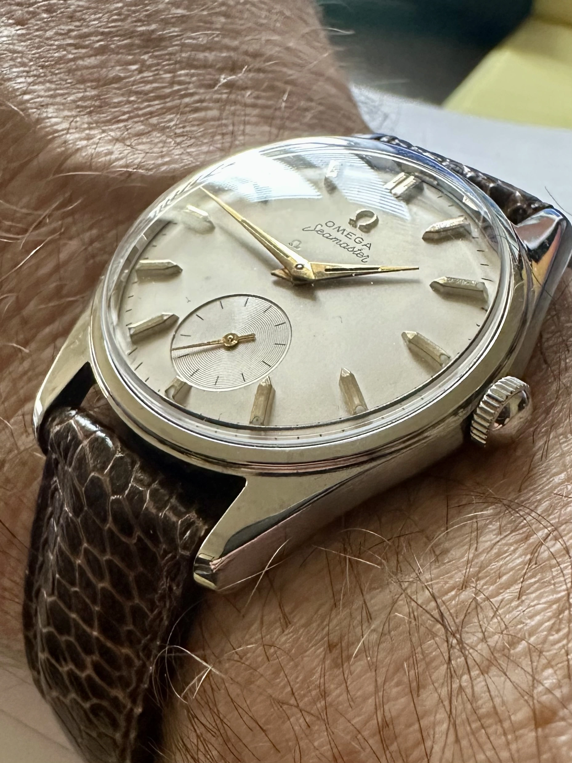 Time for a change. I’ve enjoyed the Accutron Spaceview, but I really miss having the date. So I have chosen a somewhat unusual watch. Unusual because it is a manual wind day-date model. A Gruen, probably from the late 1950s. Each time I choose this one, I have to retrain myself in setting the calendar. Not a quick change. Set the DAY first, then back and forth until the correct DATE. The day reverses but the date only advances. So once the day is set, it’s back and forth until the date is correct. Then, set it to time.