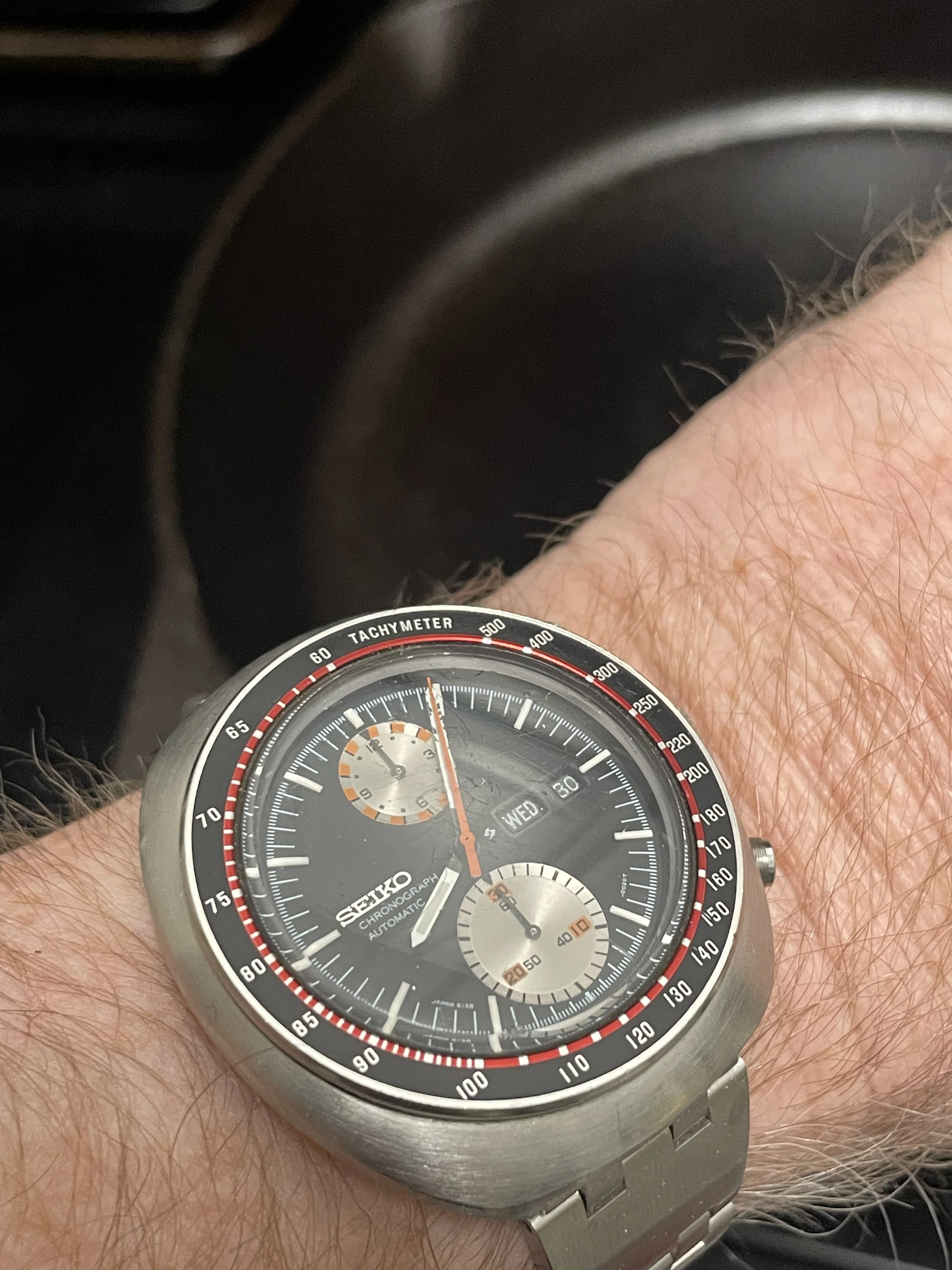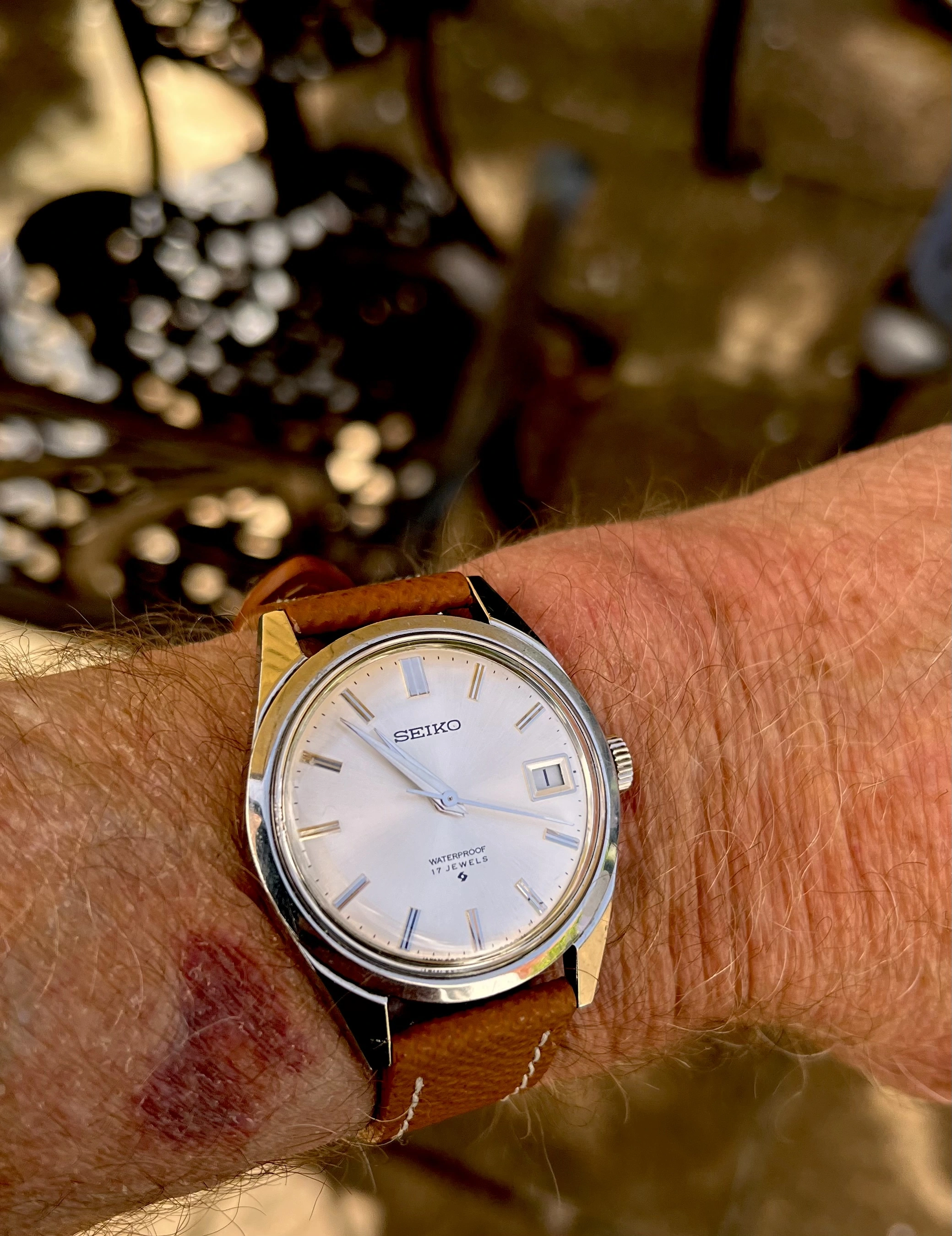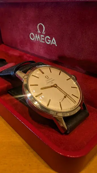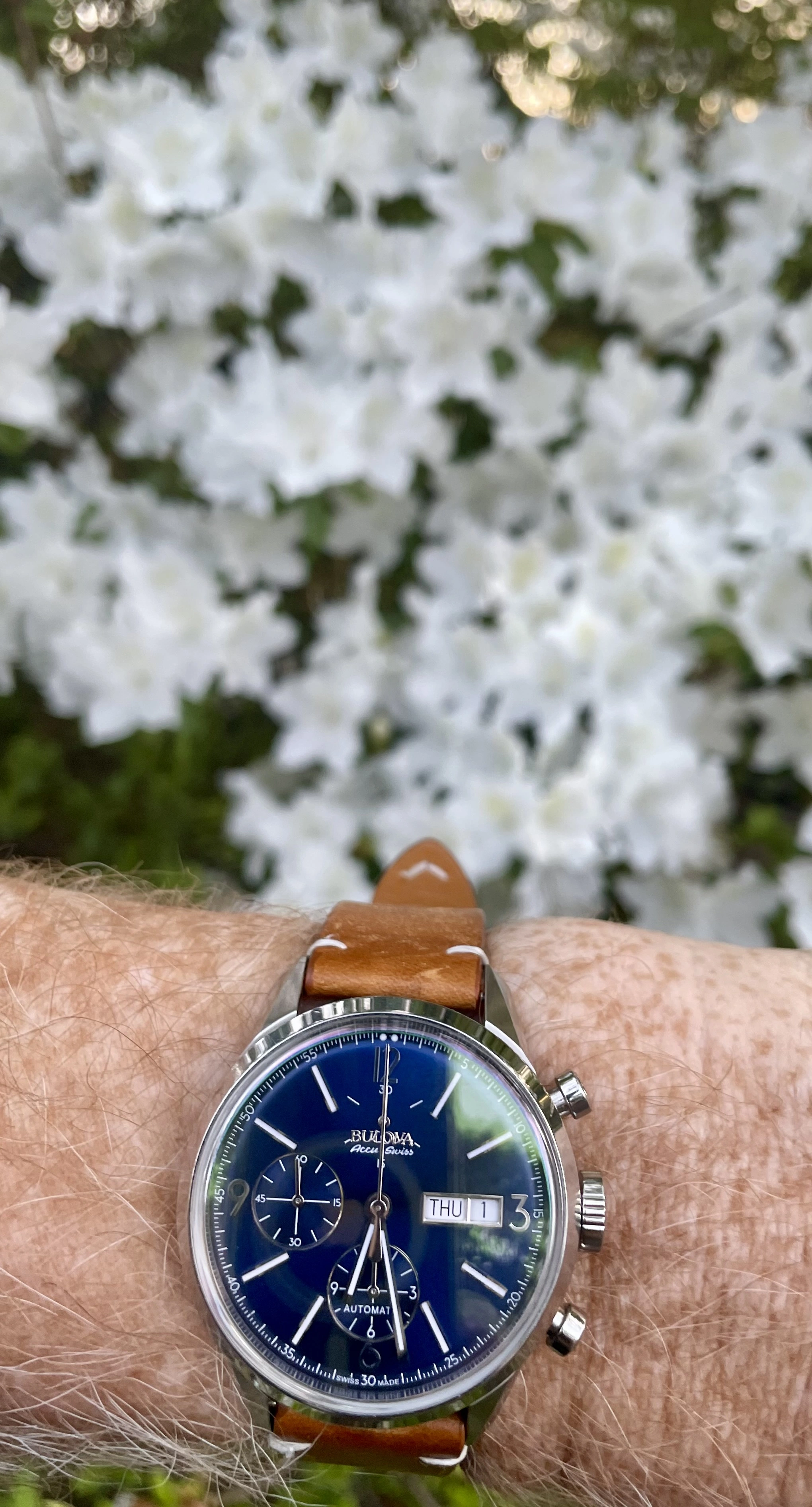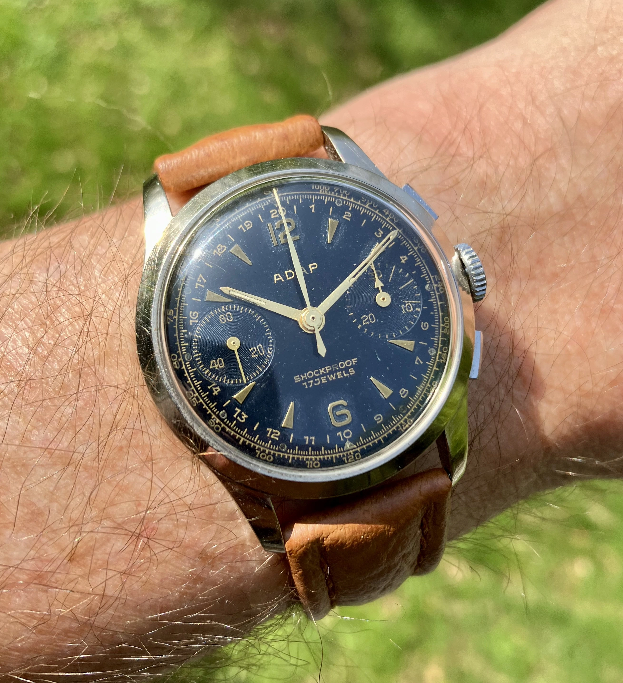 Mid day change owing to I needed a “beater” while doing some scut work. This one was originally in gawdawful electro-plated case which has been turfed. I found this better case in my stash with a nfg movement in it, so it was appropriated for this one. The movement is a German made Durowe model, manual winder. I’ll change again, later today. The dial name Alanbury means nothing to me, and I’ve never uncovered any information about it. One of very few black dials in my collection