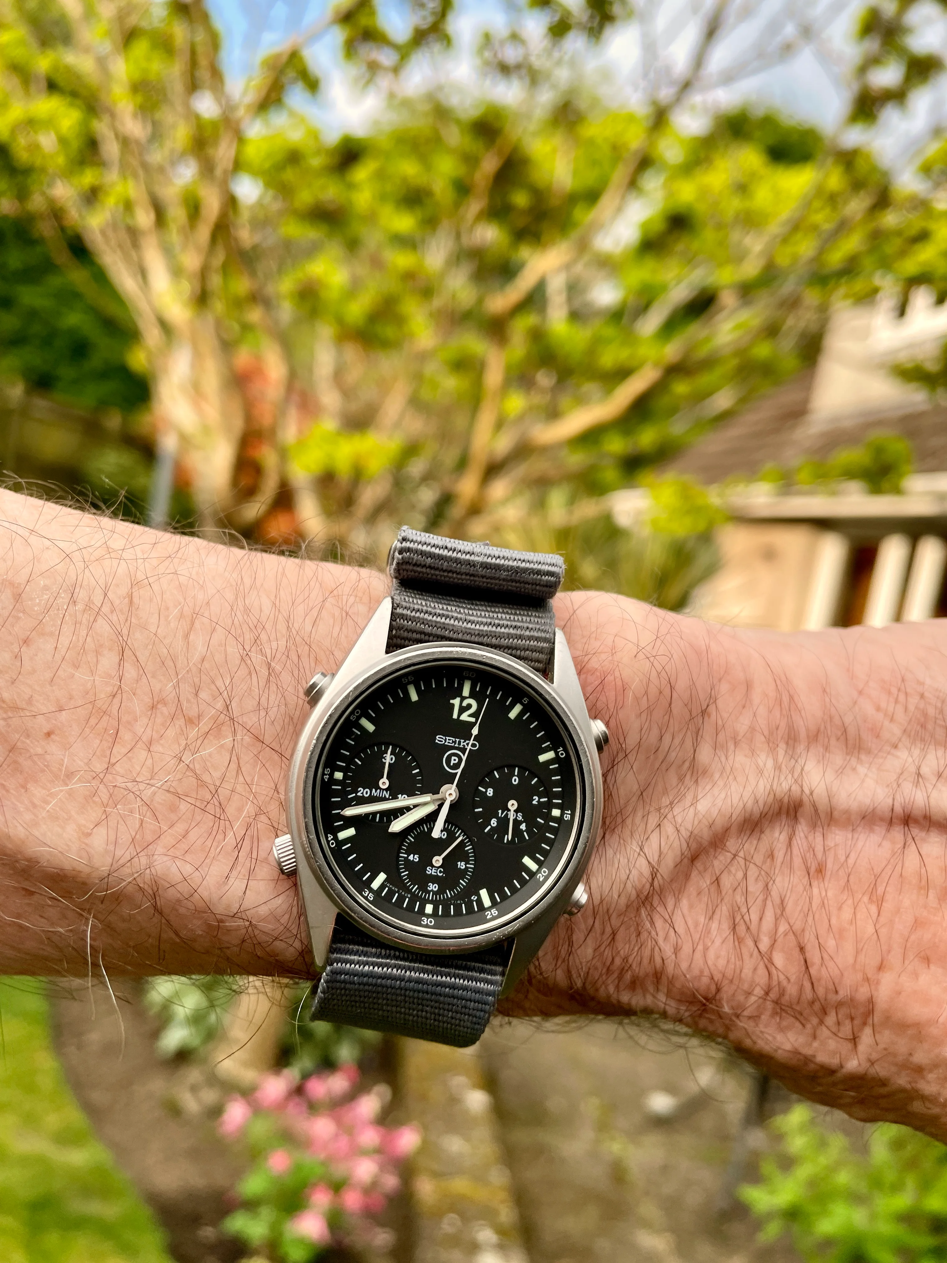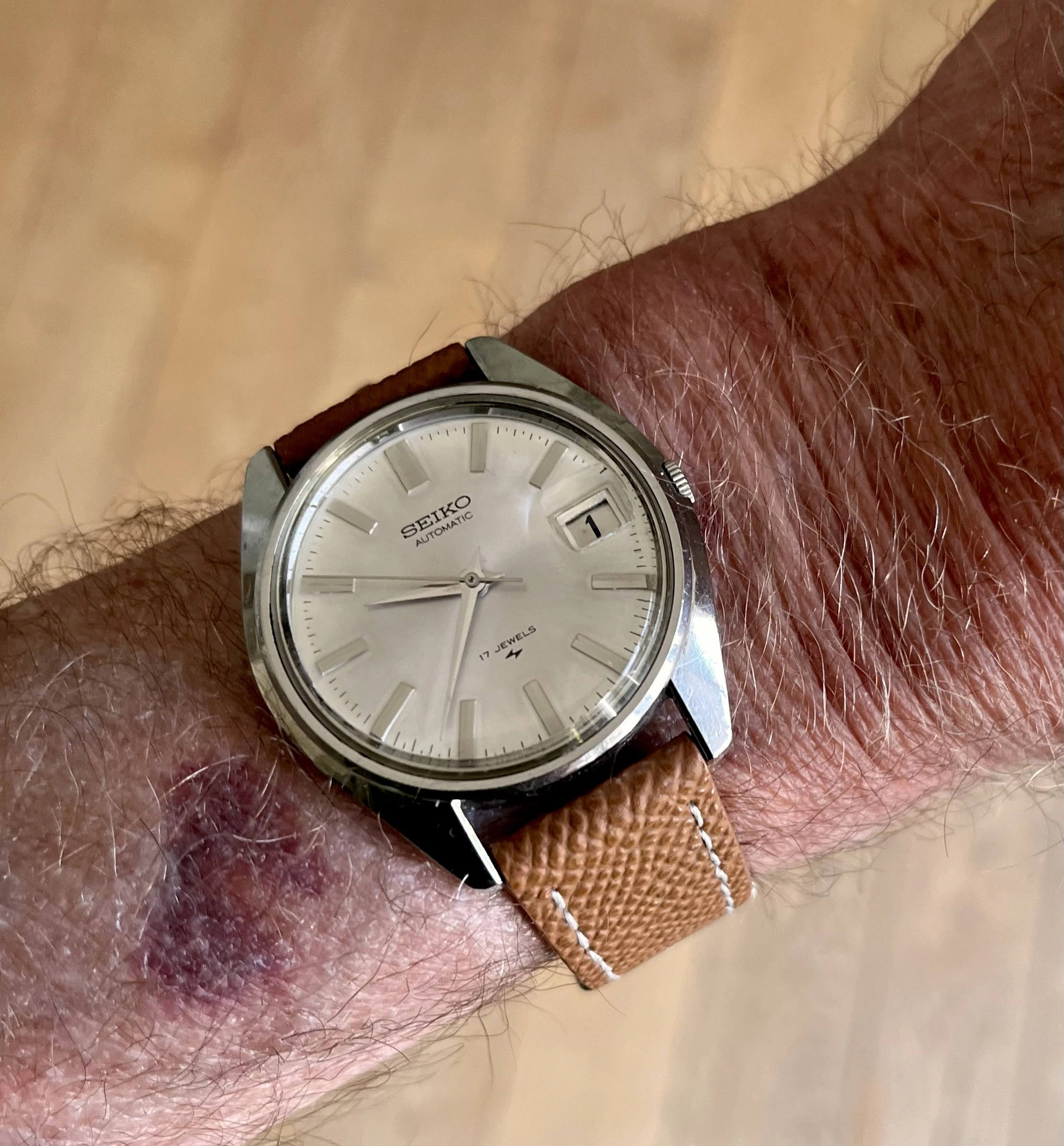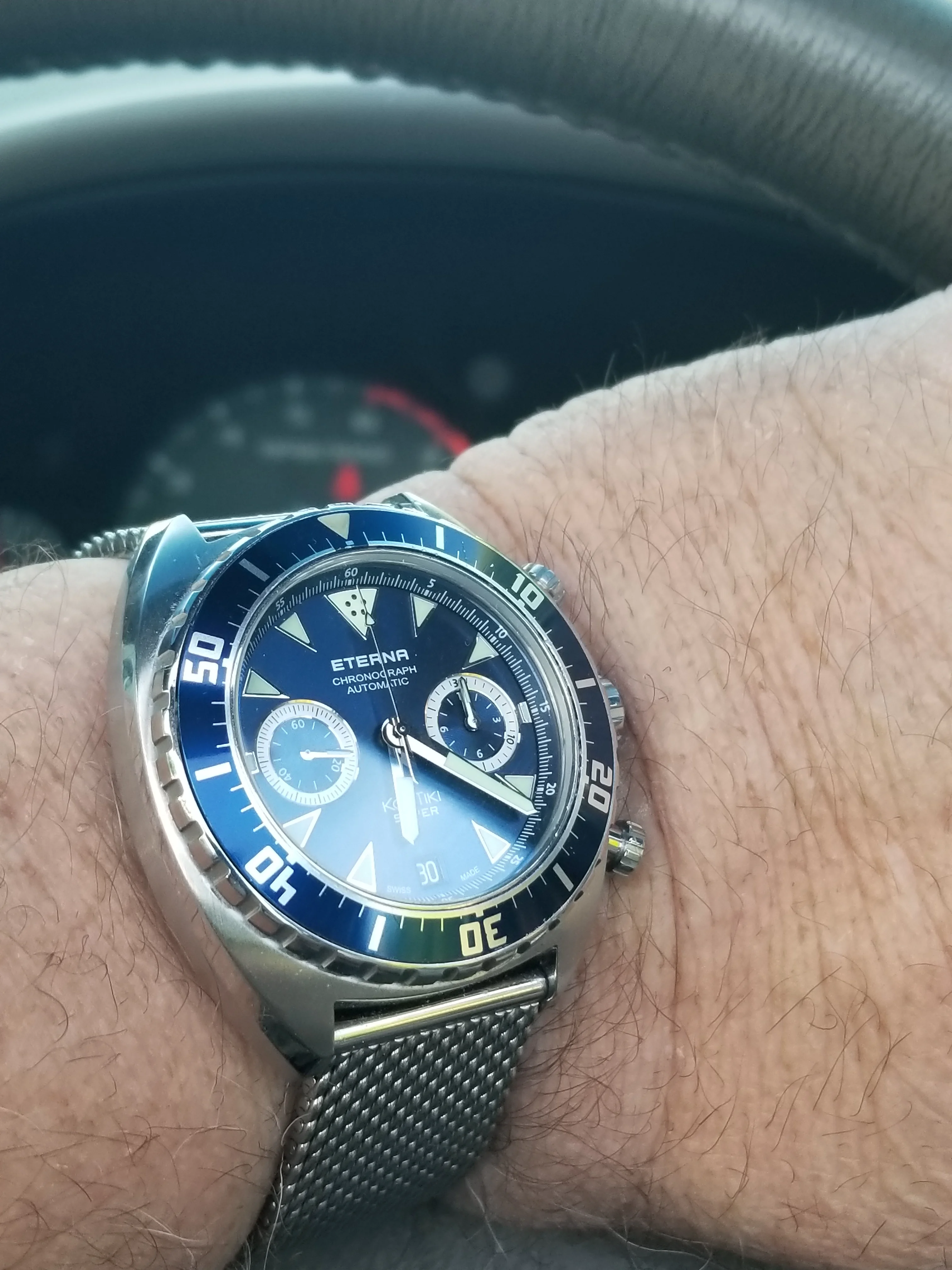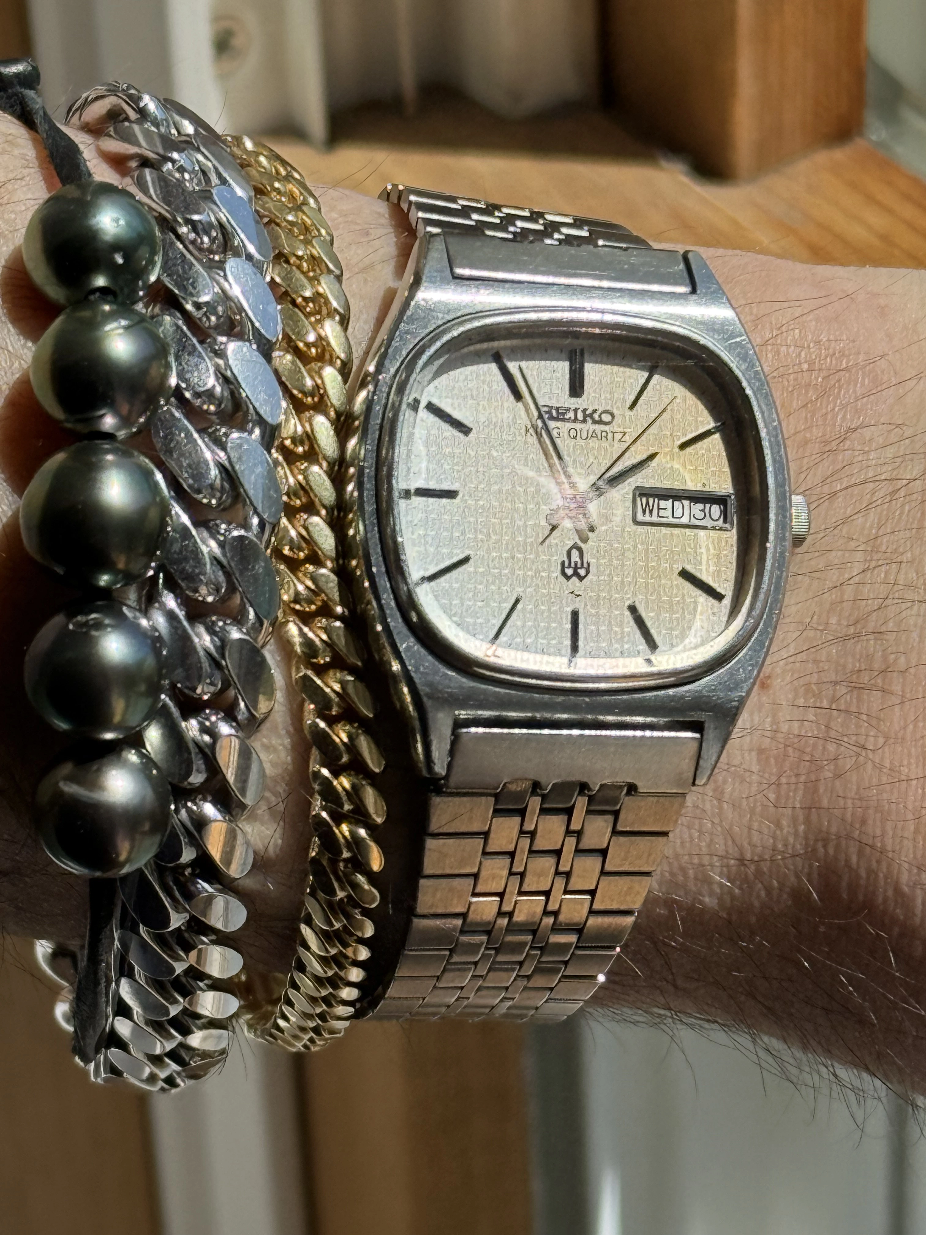 Mid day change owing to I needed a “beater” while doing some scut work. This one was originally in gawdawful electro-plated case which has been turfed. I found this better case in my stash with a nfg movement in it, so it was appropriated for this one. The movement is a German made Durowe model, manual winder. I’ll change again, later today. The dial name Alanbury means nothing to me, and I’ve never uncovered any information about it. One of very few black dials in my collection