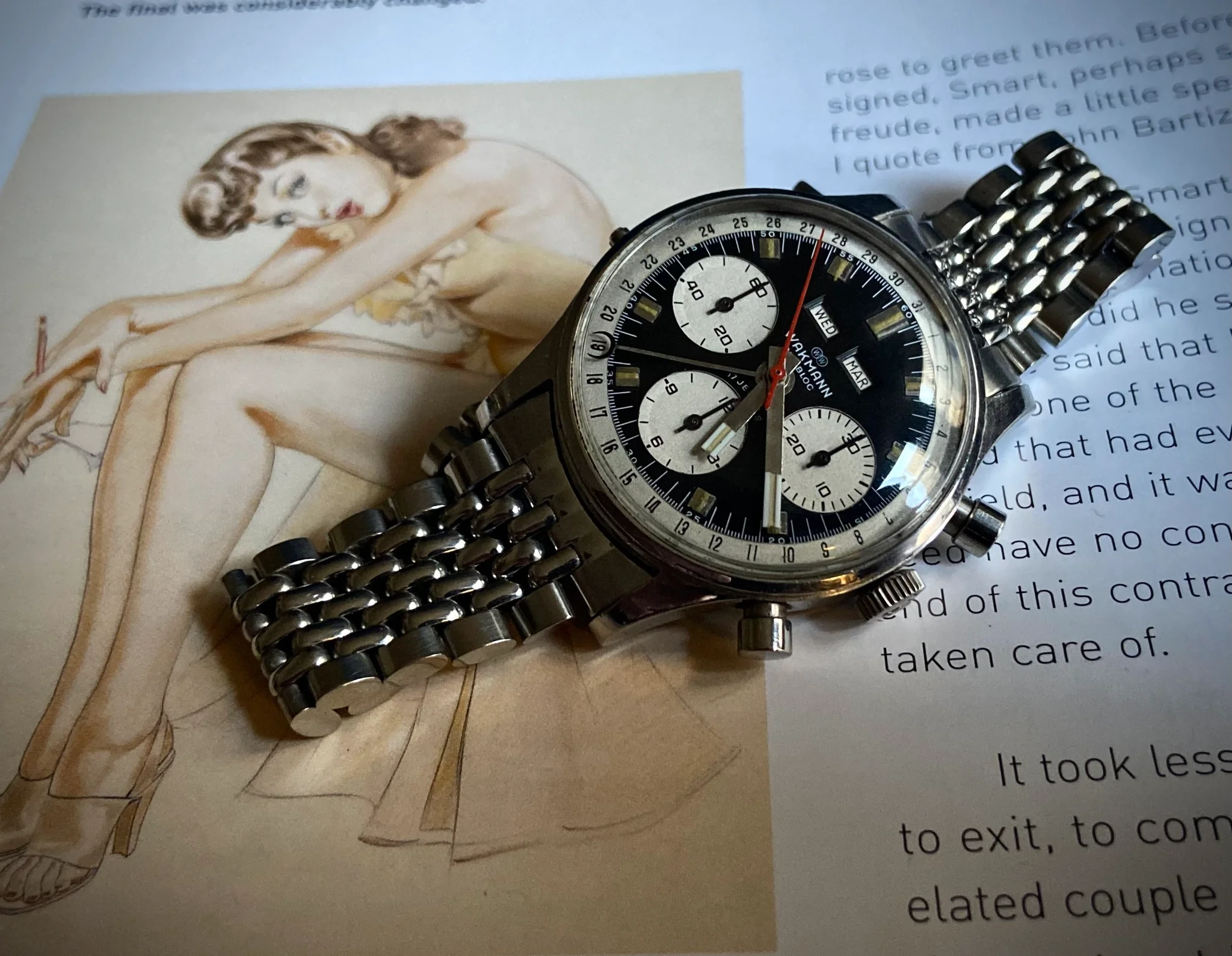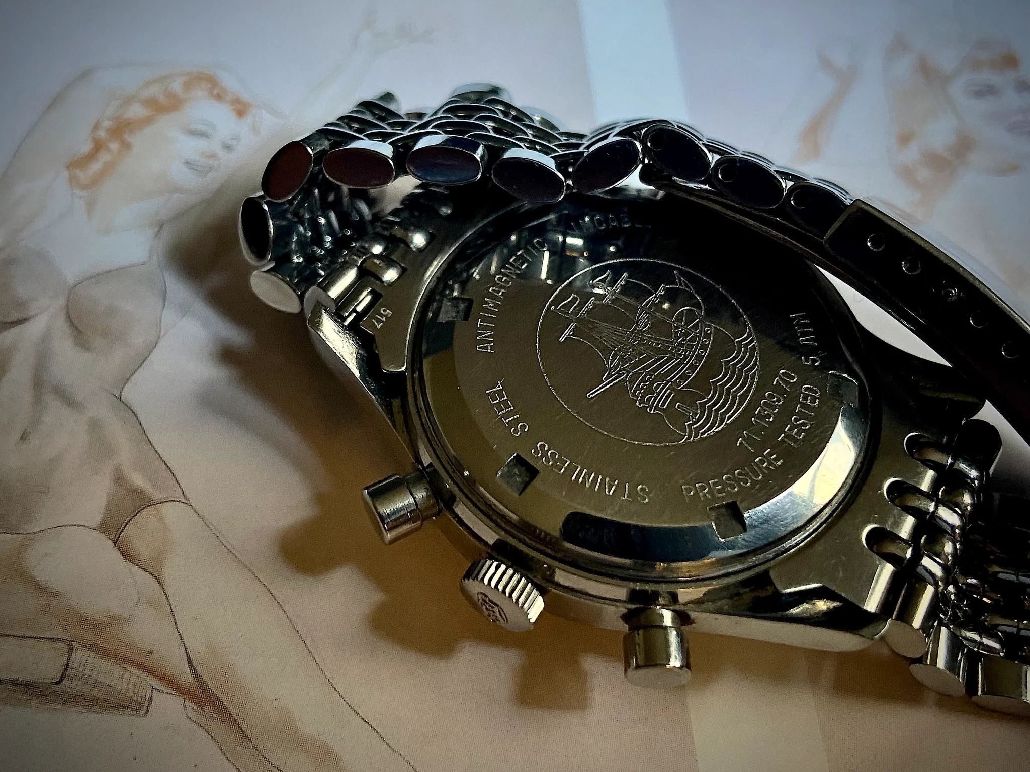 Posts 3,370 Likes 17,269 hmmmcamu ·May 9, 2025 WAKMANN Charles Gigandet Triple Date Chronograph Ref.# 71.1309.70Original Tritium lume, 37mm solid stainless steel case, Valjoux 730 manual-winding movement, 5 atmos (164 feet)
