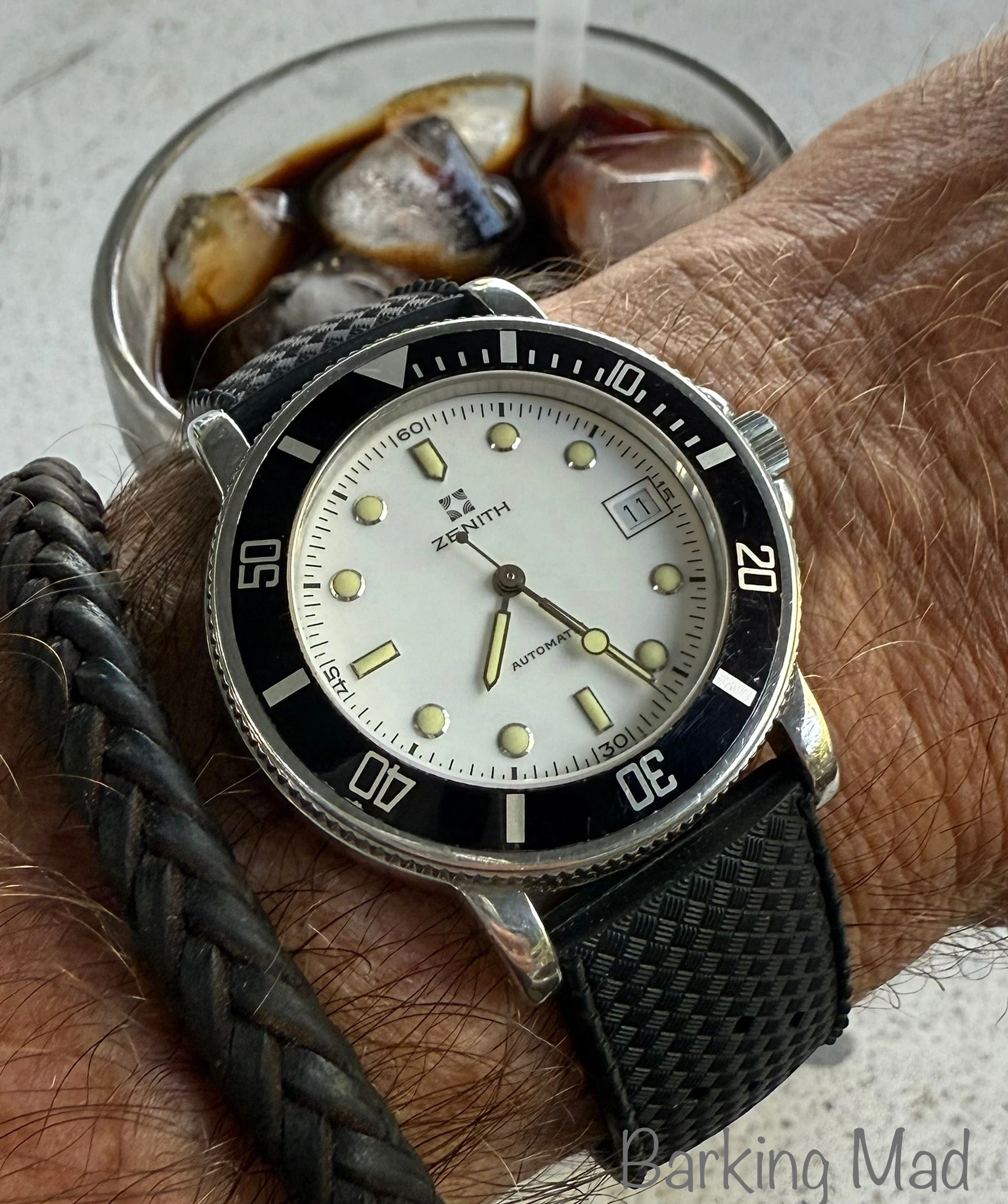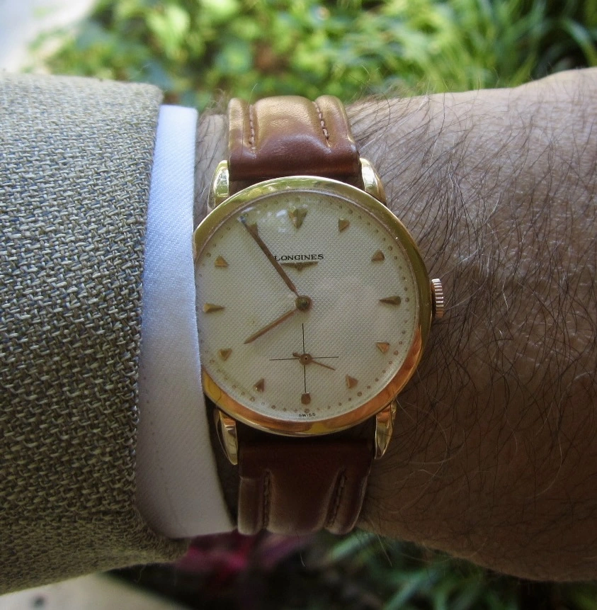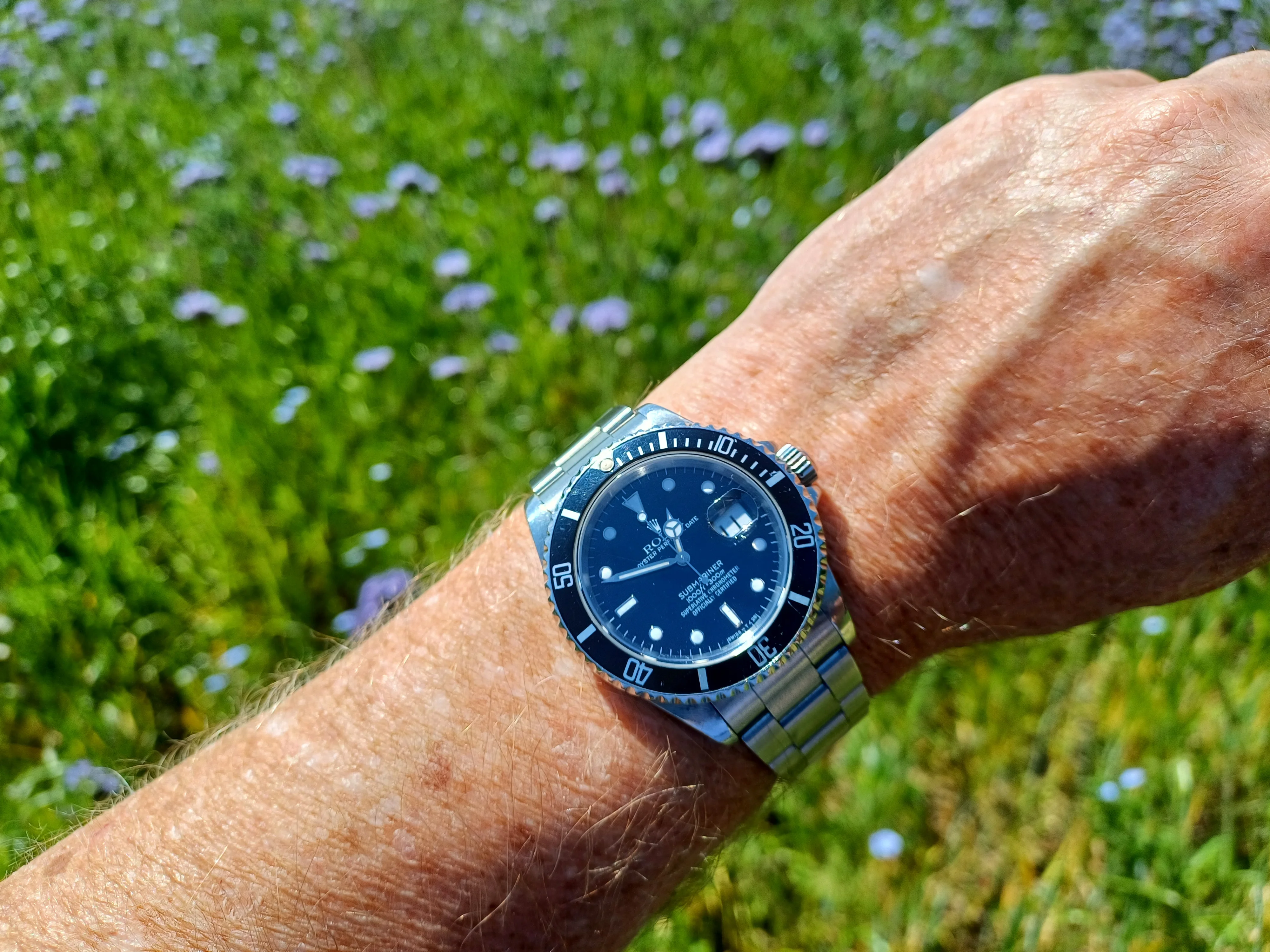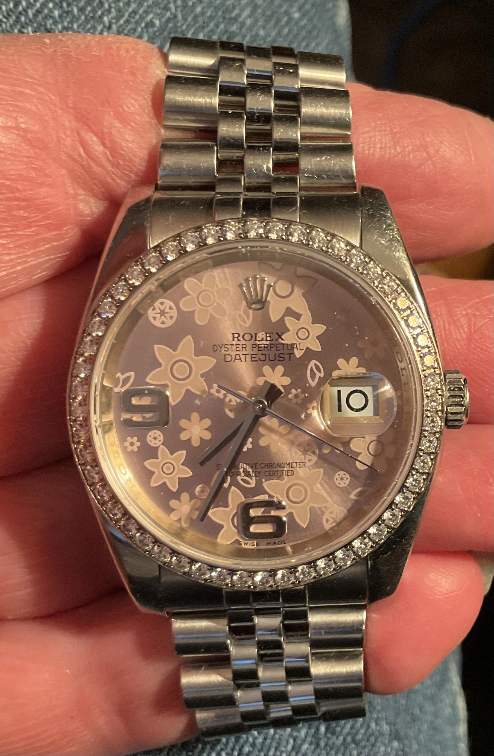 Not actually wearing this one, today. For two reasons, actually. First, Rolex calls this style a woman’s watch, and it is not something I would even wear to test it! It has been adjusted to fit a woman’s wrist, so there is no way I could wear it. It was brought to me by a friend for reconditioning, a task I completed, today. The movement is a 31-jewel, calibre 3135. I don’t know how long she has owned, it but it has 3 Rolex (Canada) repair numbers in it. All in all, it is in nice condition, with the exception of a number of very tiny chips on the surface of the synthetic sapphire crystal. The 50 diamonds are all nicely matched full cut stones, about 0.02 (2 points) each, adding up to about one carat total weight. I showed it to my better half tonite, telling her it was not her Mother’s Day gift. She was glad of that as she said she wouldn’t wear such a gawdy watch!