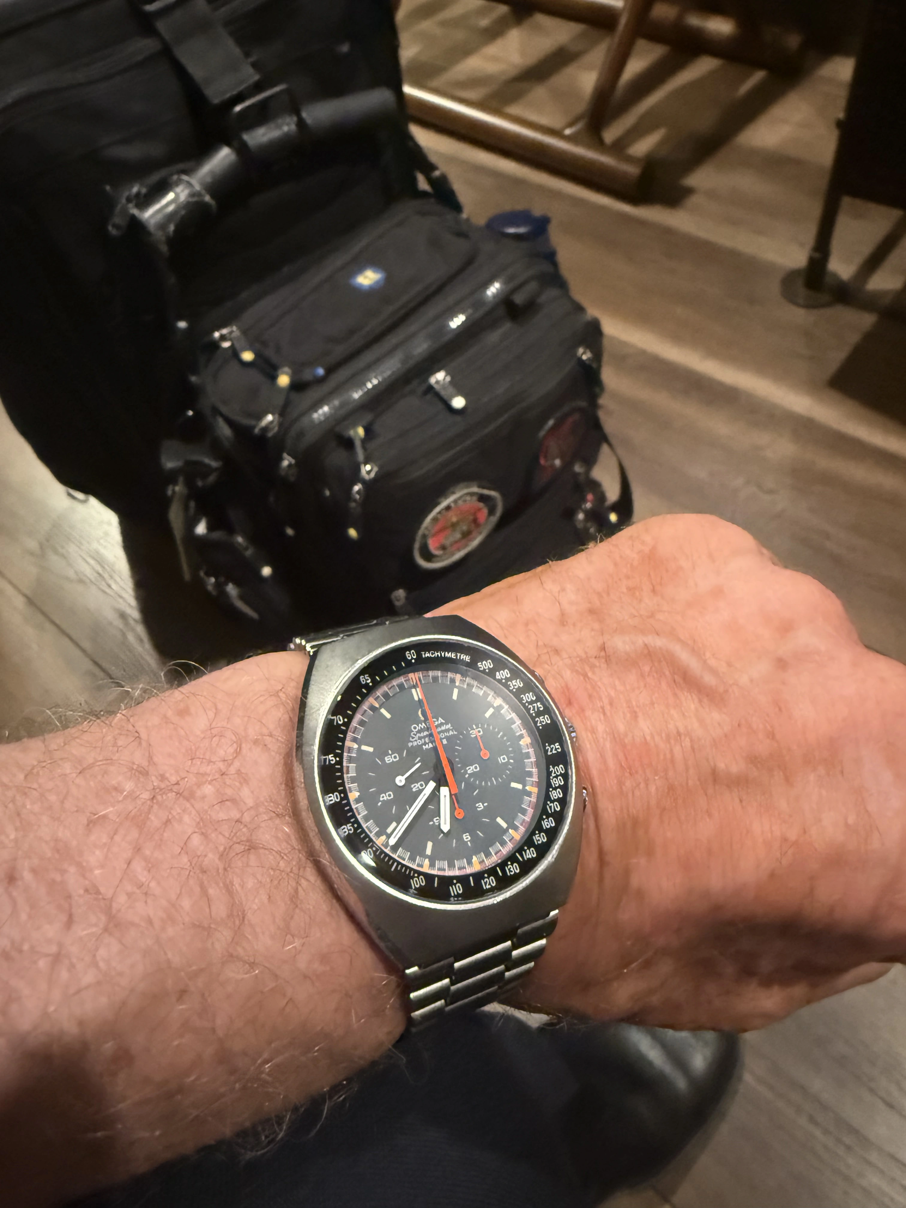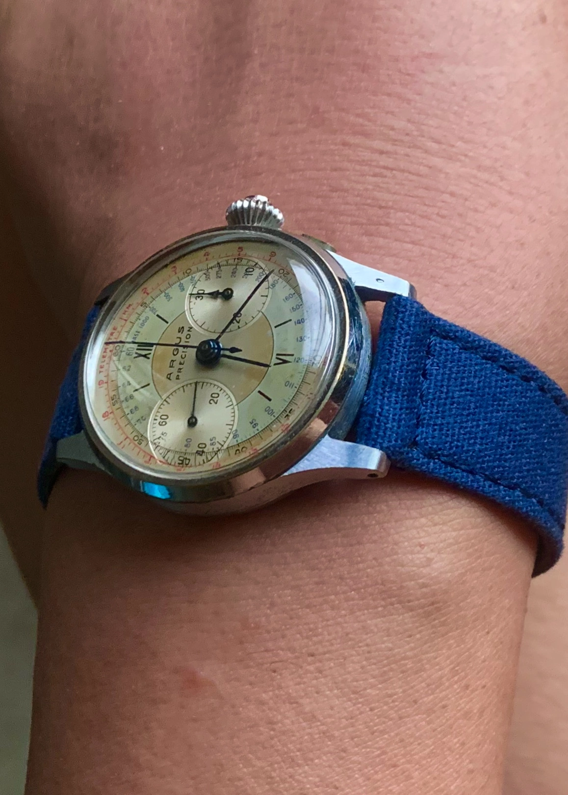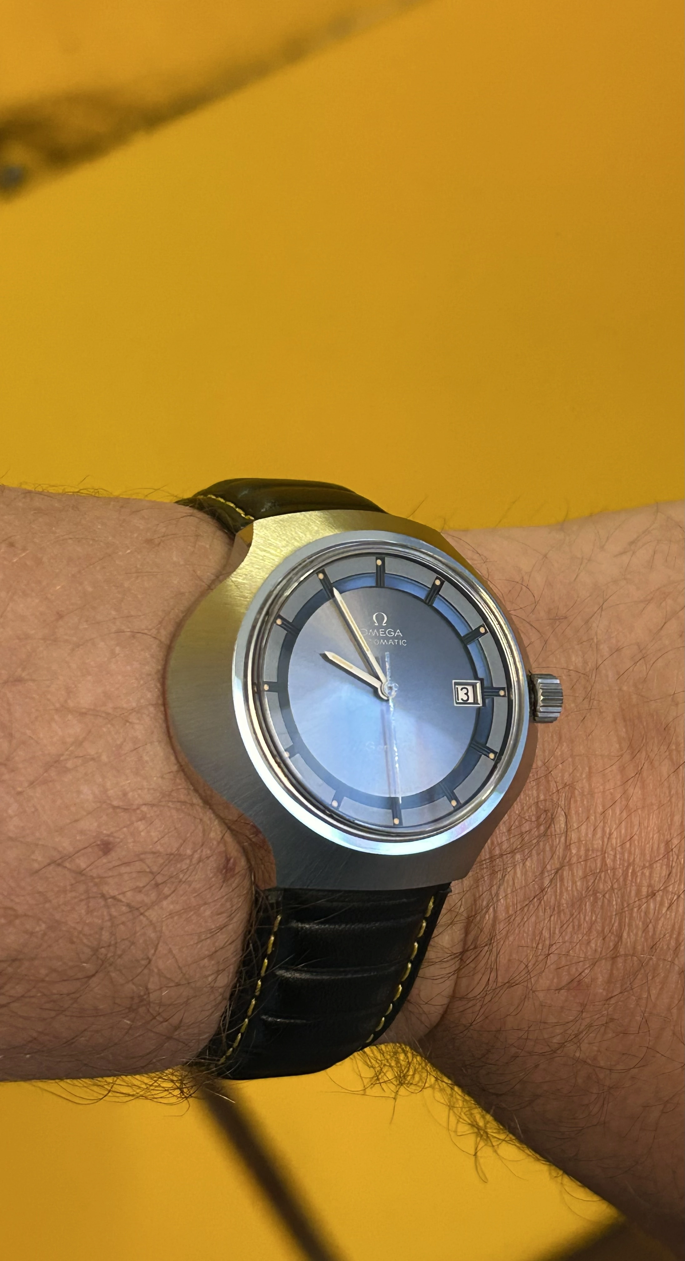 166.121 model Omega. Trimmed down a 22mm strap to fit and get a feel for what type of strap it wears best. Unique and comfortable. Now to get a bespoke strap with a few tweaks and refinement.