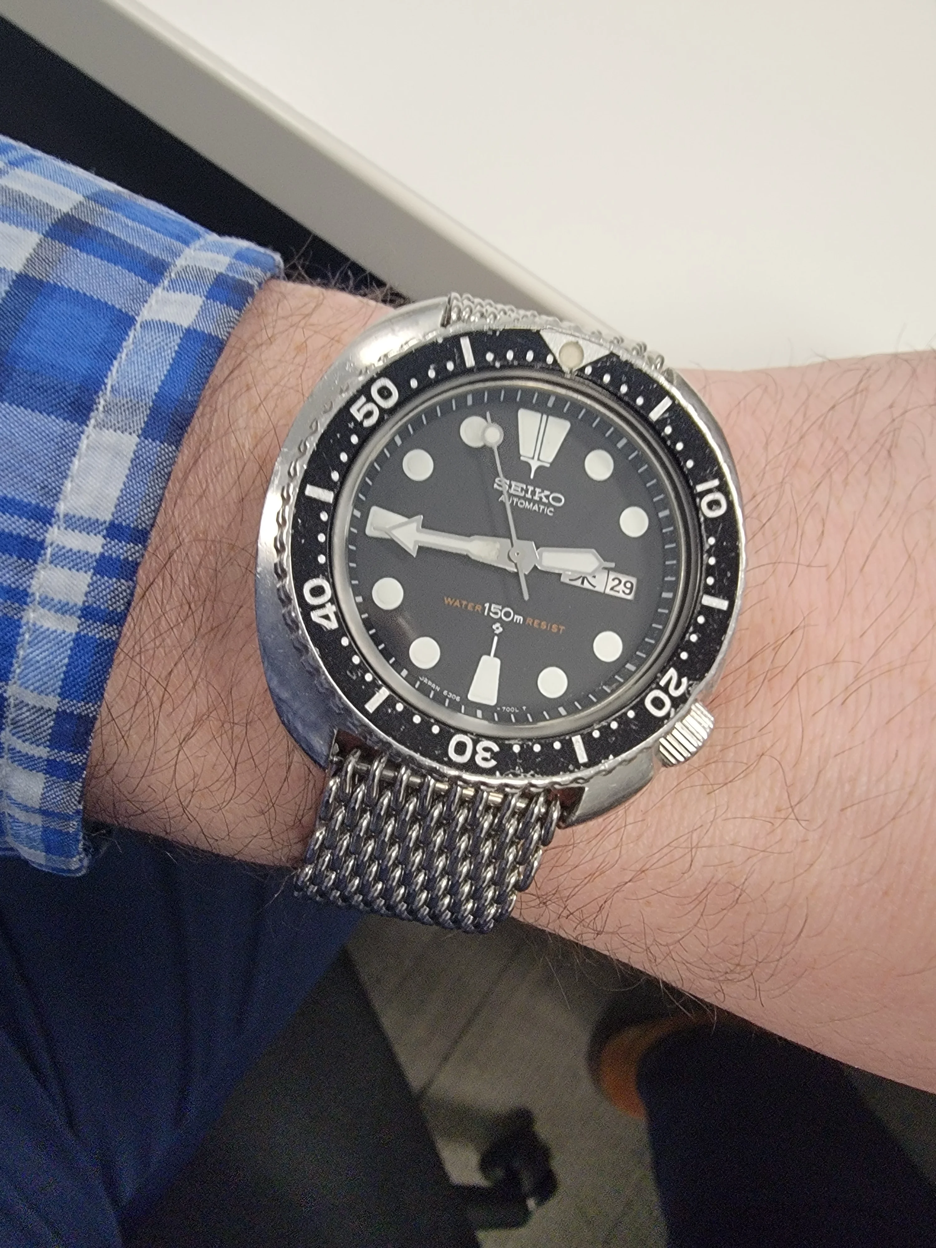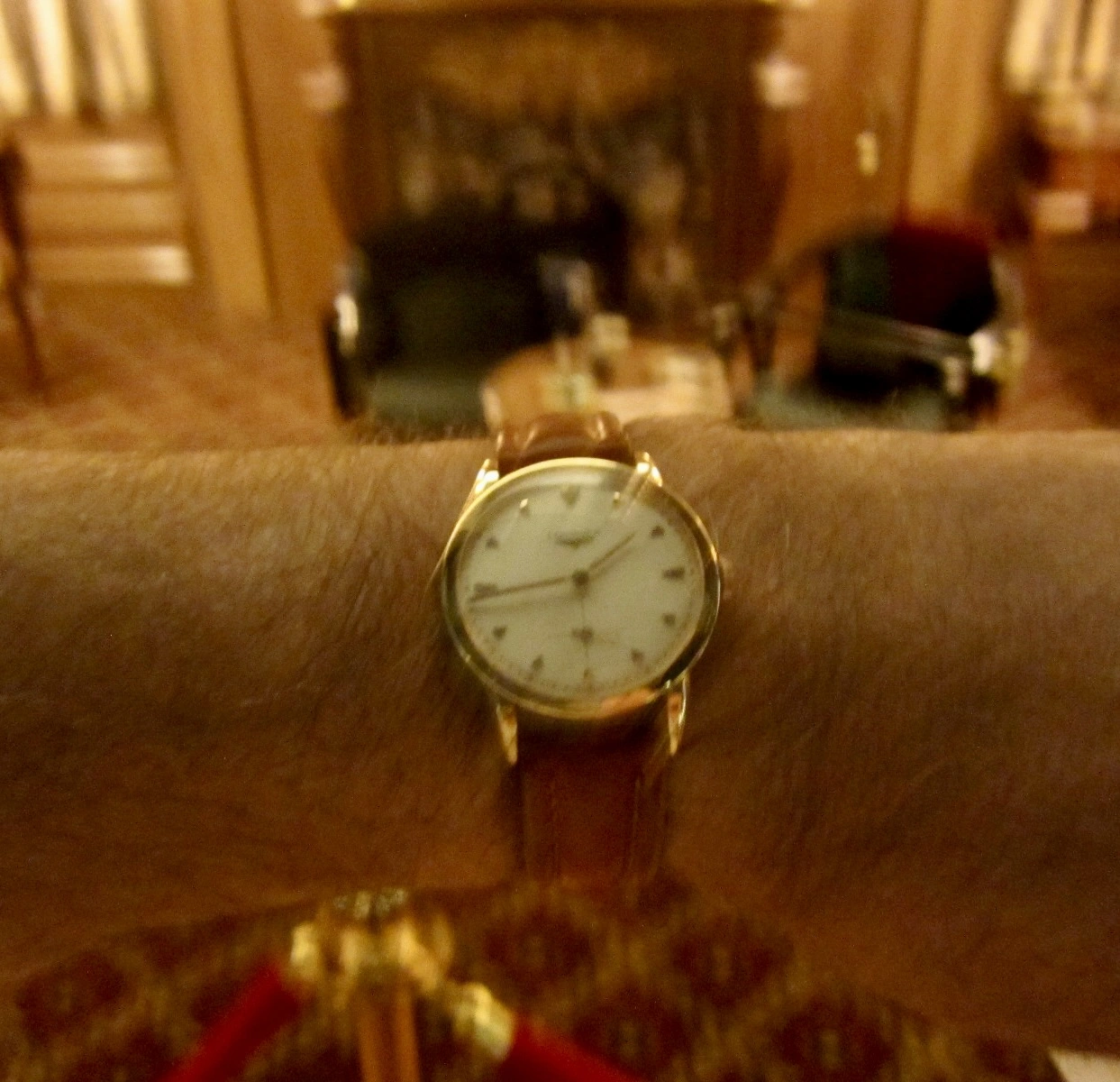 A crummy shot of this Longines watch in a reproduction of the Titanic's first class smoking lounge.