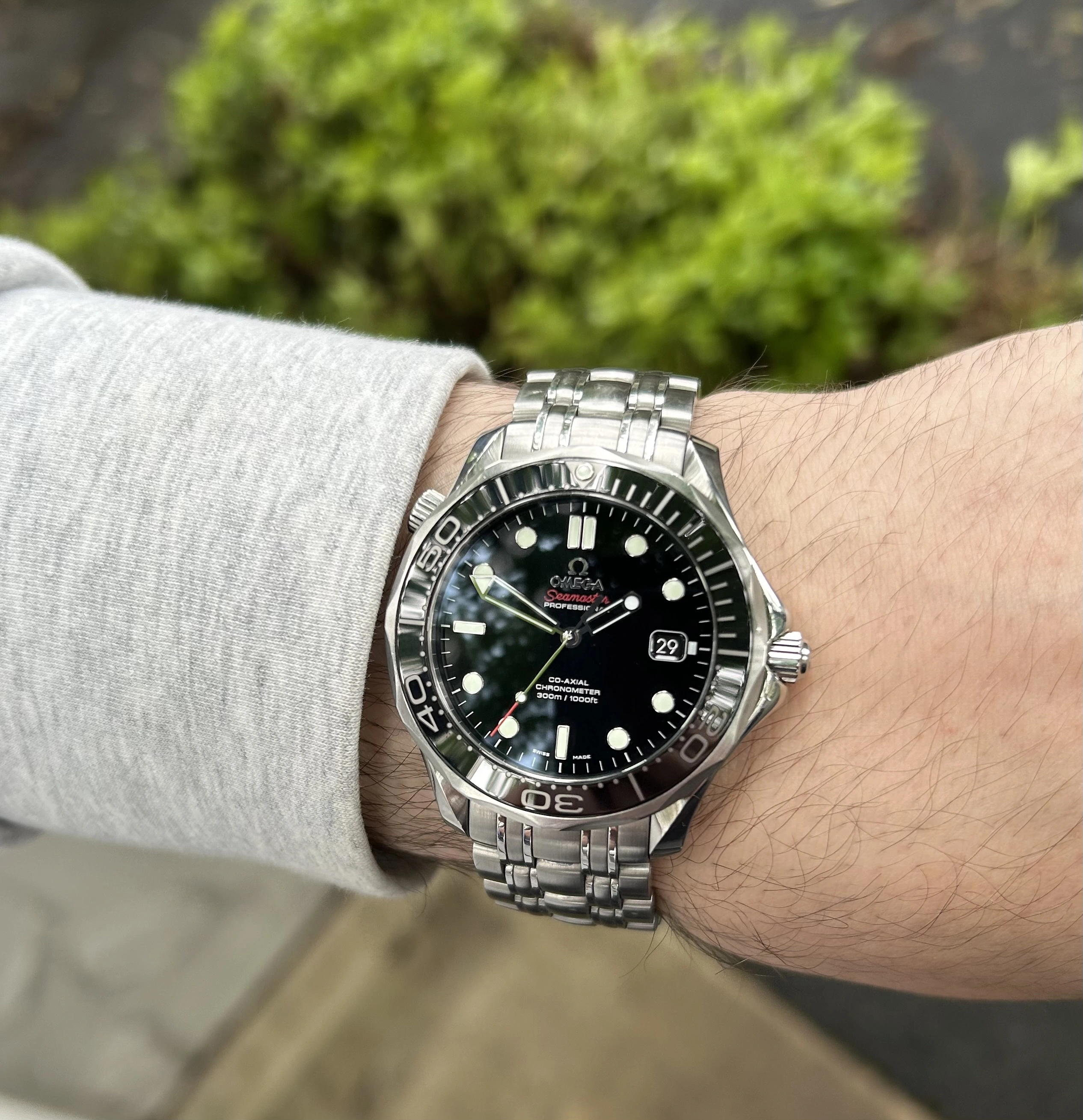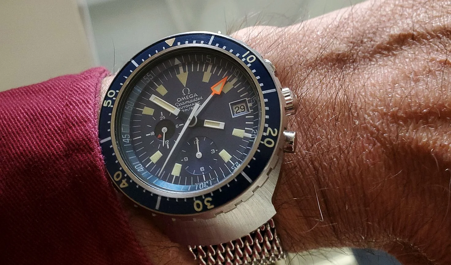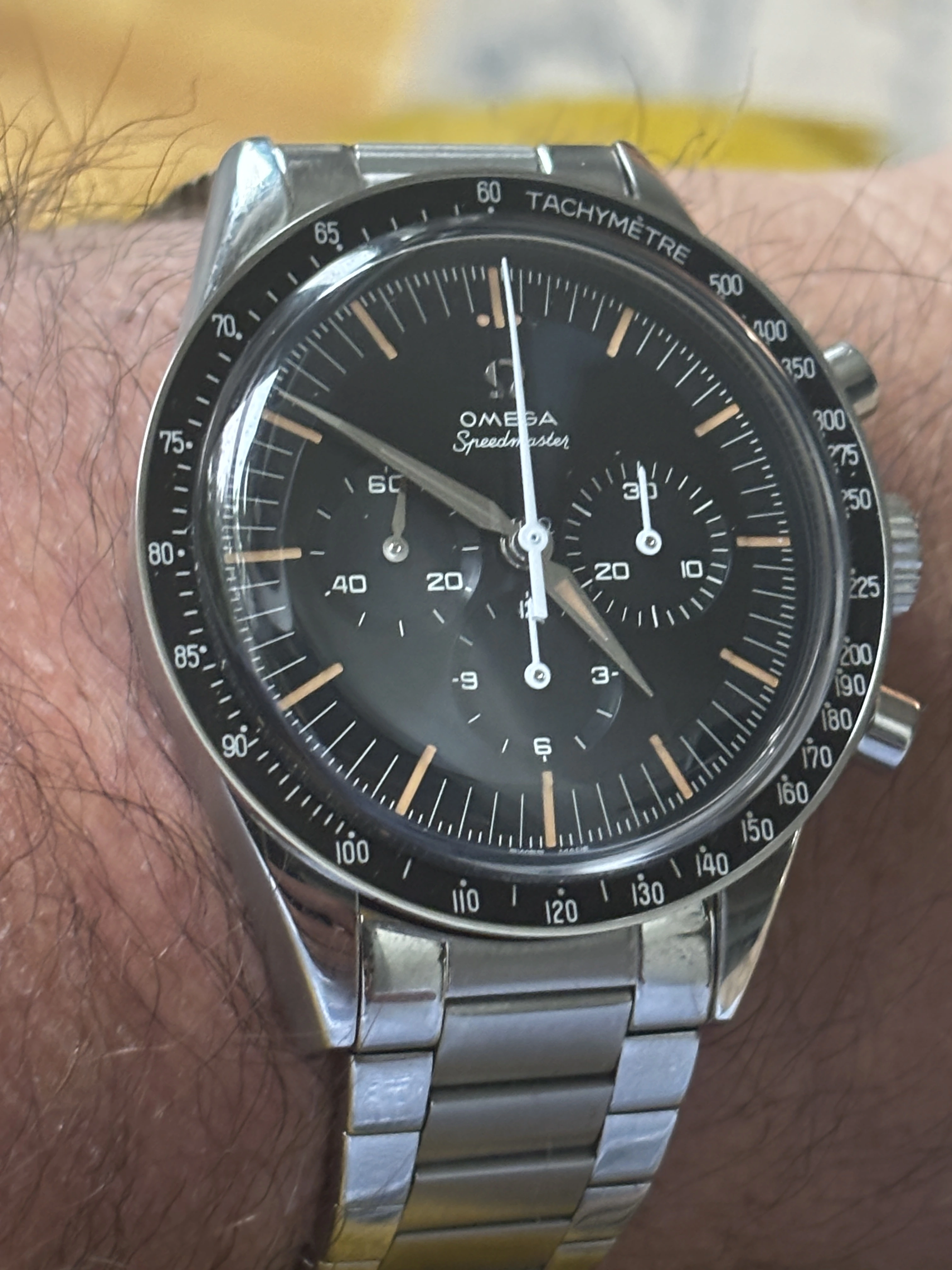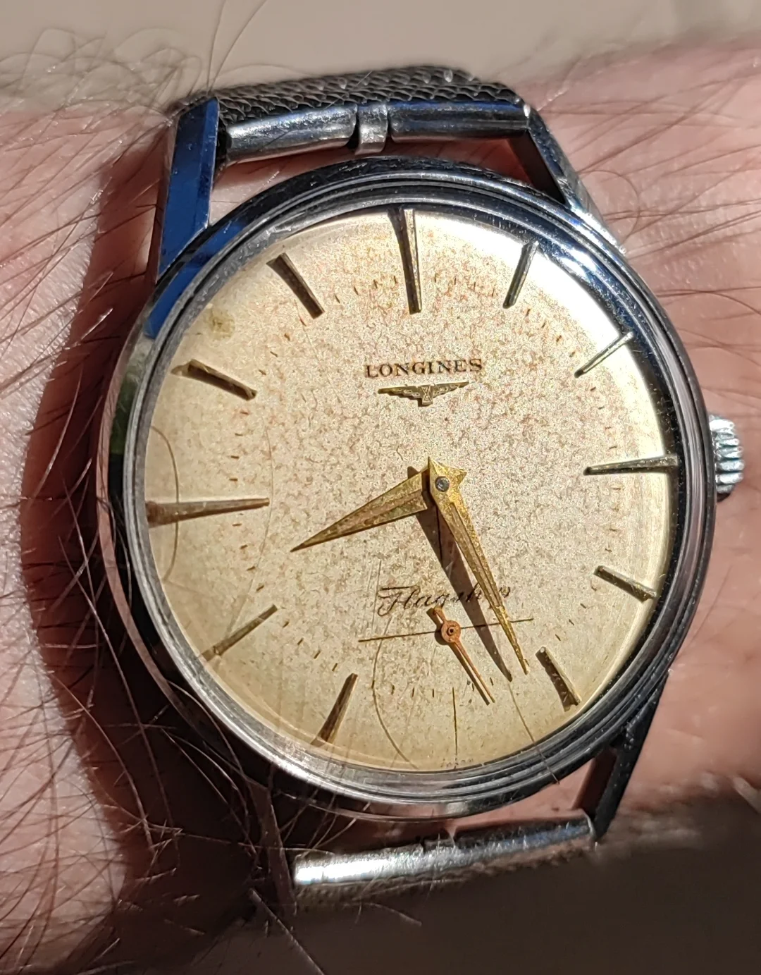 After a month of wearing Rolex and Accutron watches, I decided it was time for a change. This Omega F300 tuning fork model was a service award from a local utility company in 1977. The recipient passed away about 12 years ago, and the heirs likely decided to replace the cell, and to use it. It wouldn’t run! Perhaps they needed a quote for servicing it, and when a/ they couldn’t find someone to service it, or b/ didn’t like the quote, they decided to dispose of it, at auction. Being a non-runner, I was the only bidder, and I bought it for $25.00 (Cdn.). Call it taking a chance. The circuit and tuning fork powered right up with a new cell, so I cleaned it. I rarely run into watches as seized with gummy oil as this one was. It performs beautifully, and I was able to locate a new genuine crystal for it ($90.00), and this is the result.