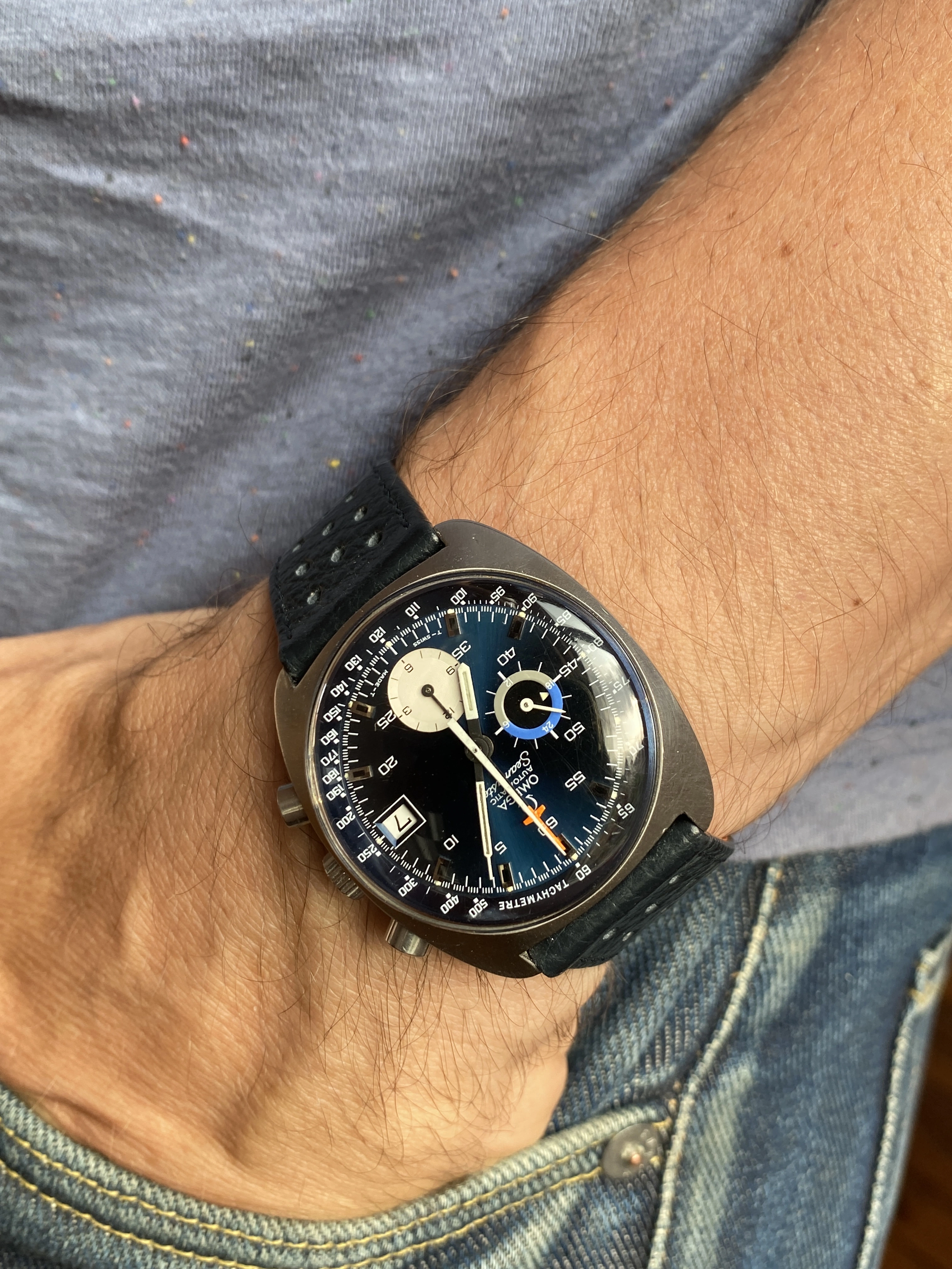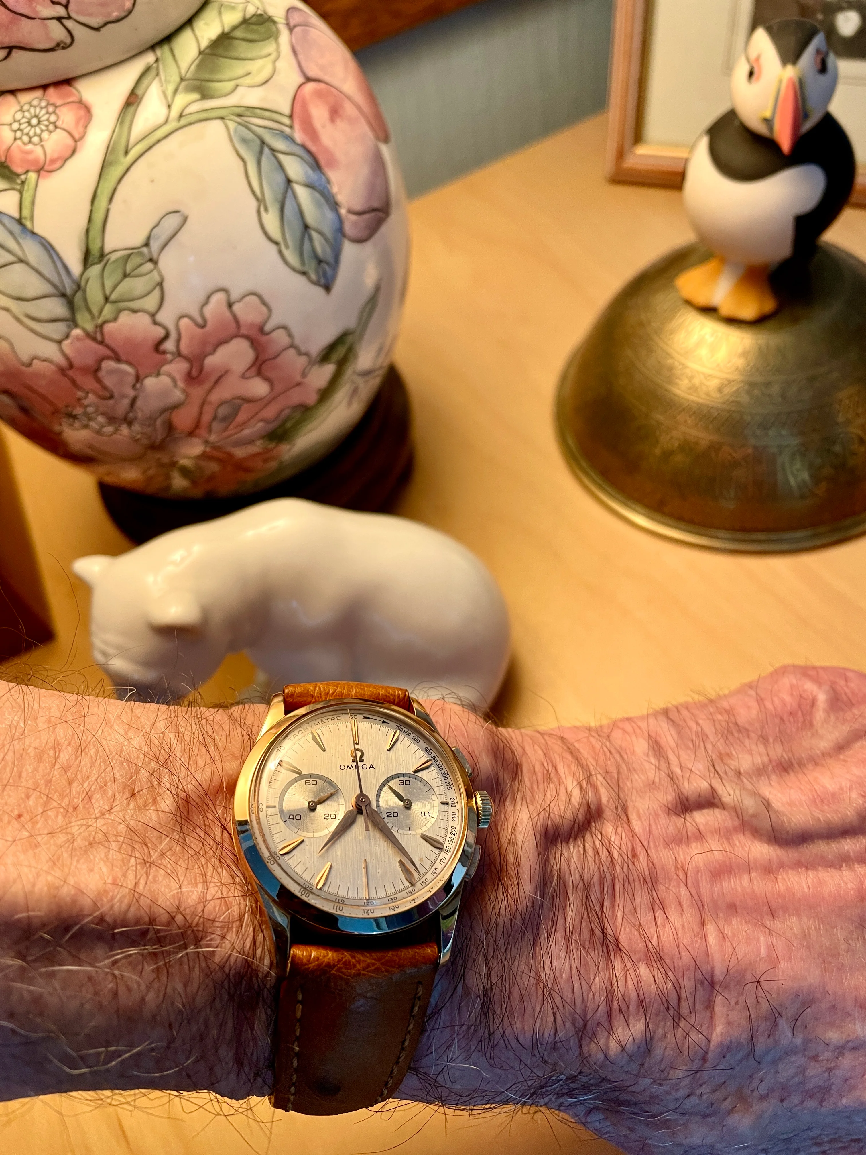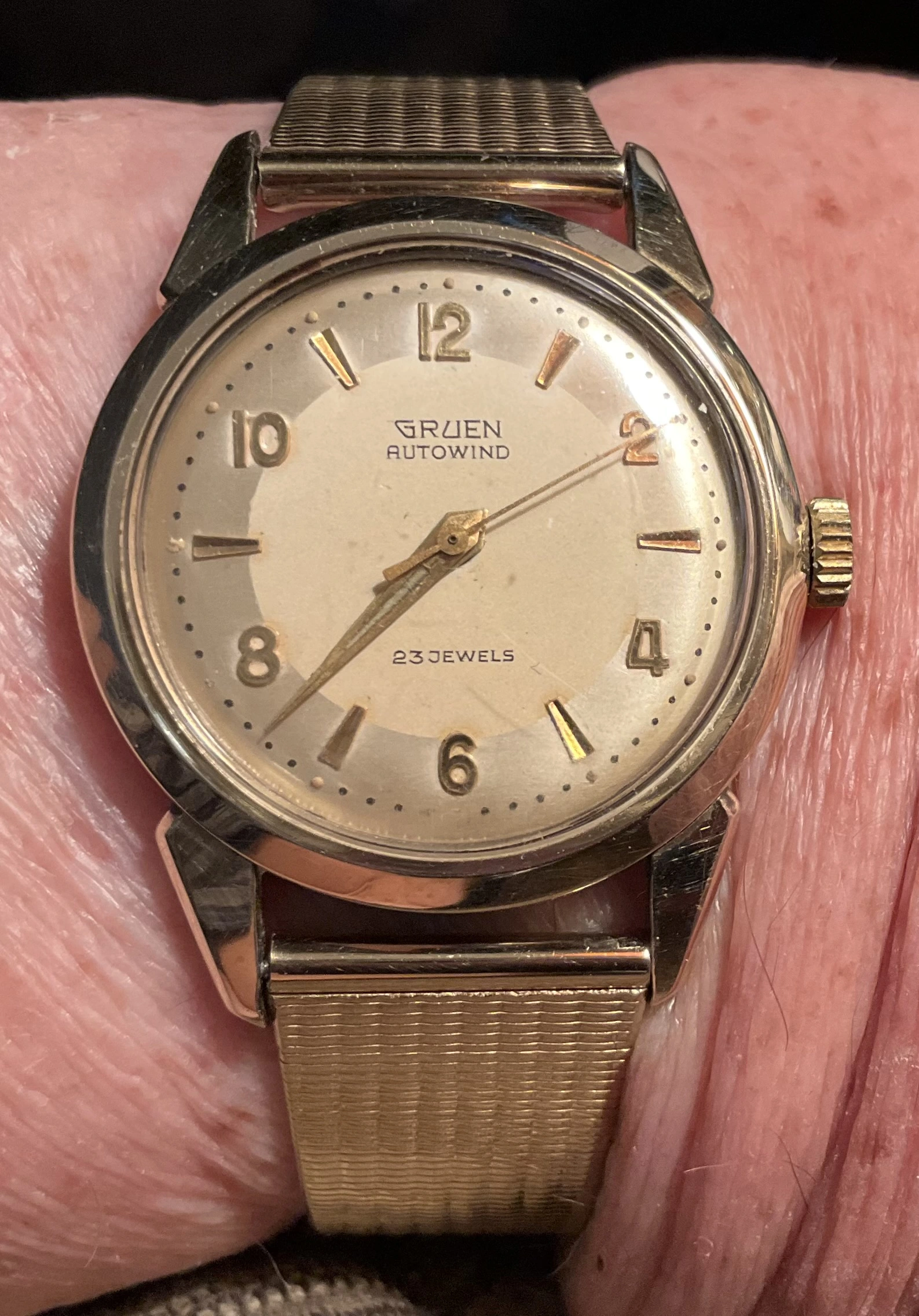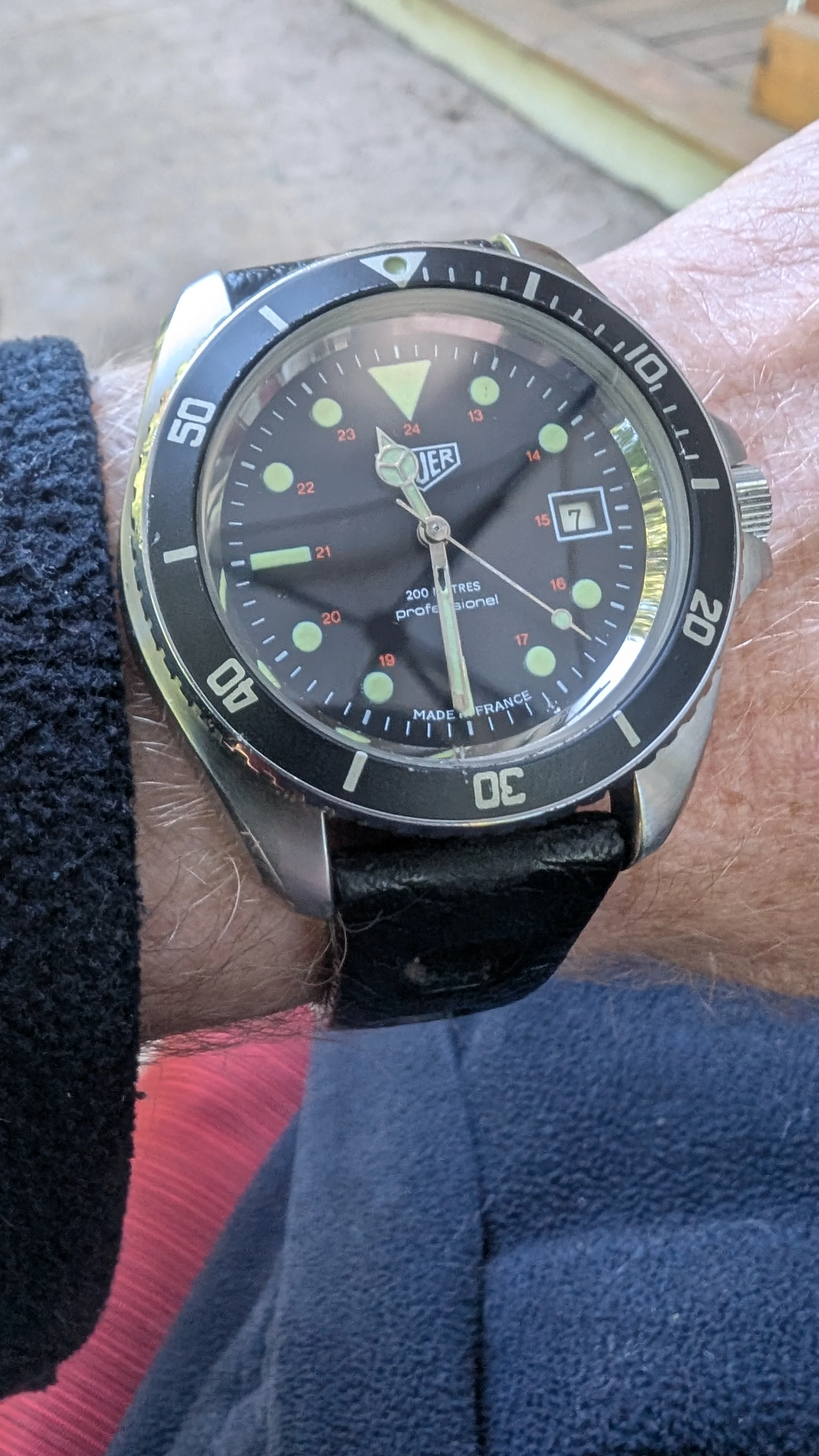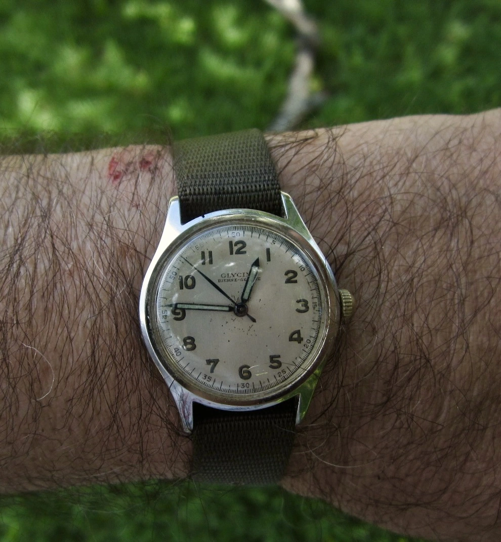 I was on a ladder, trimming large limbs out of an oak tree. One just broke and its butt end plunged down, right on to the "watch indexing location" on my wrist. Good thing I was wearing the beater watch loosely for it was forward of where the limb struck. I'll heal, but don't want the ol' Glycine watch-of-wonder to suffer injury. Could have lost the crystal, might have lost the dial, maybe even warped the case or lugs.