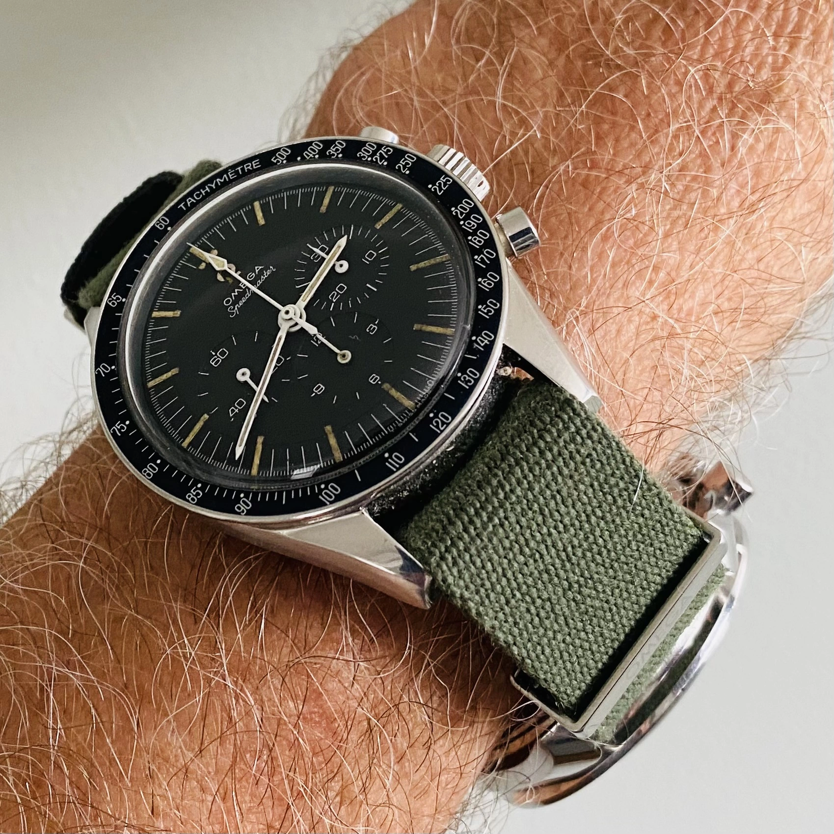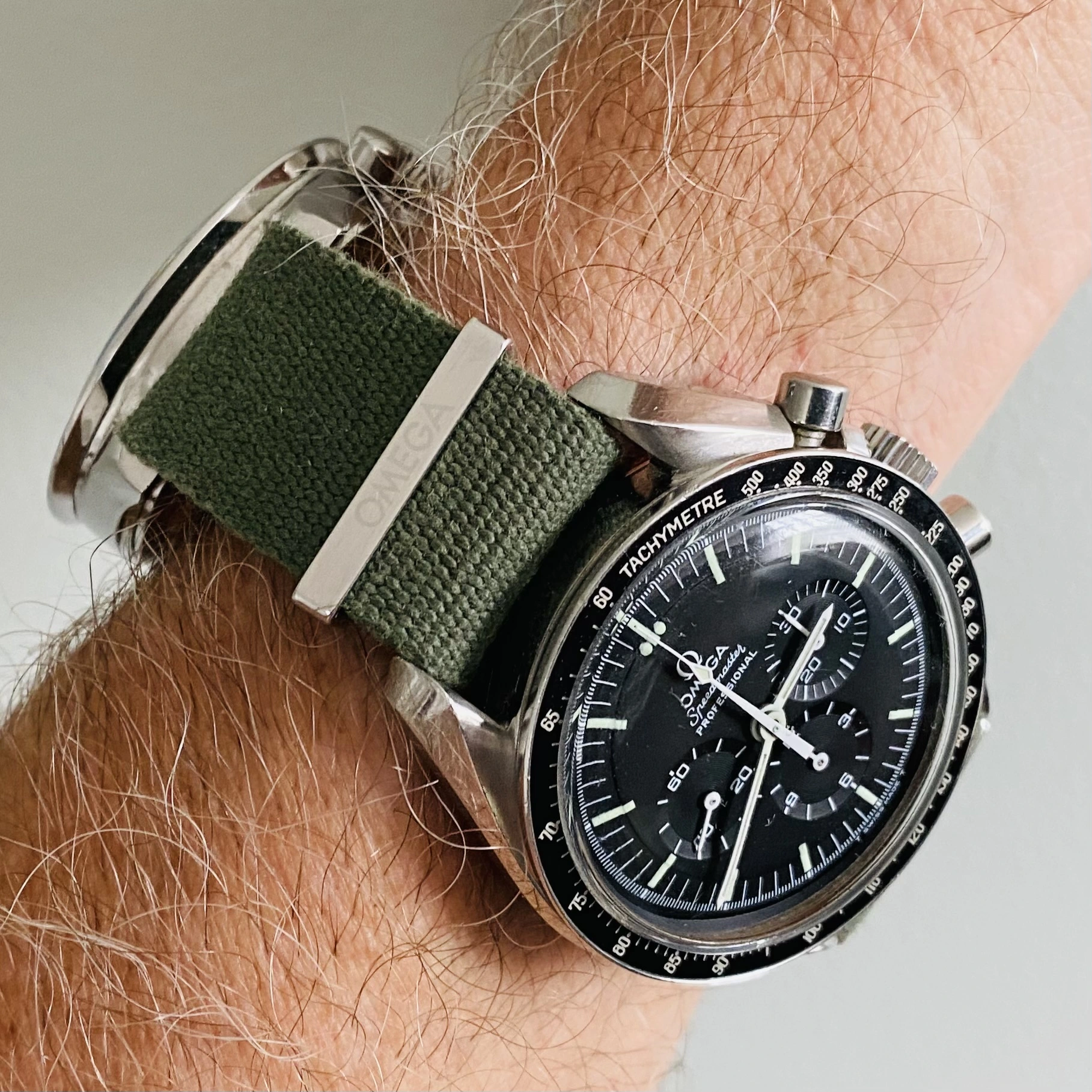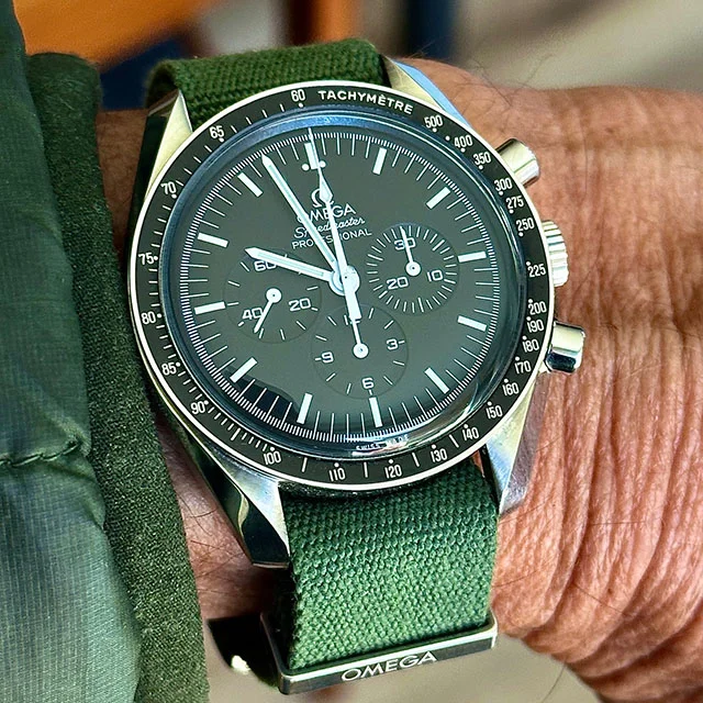 And how about that Omega mil green polyester NATO? It’s so amazing…looks good AND comfortable! I never would’ve thought that I could dig polyester! I dig that Omega mil green polyester NATO so much that I bought four of them for my whole fleet of four Speedmasters…