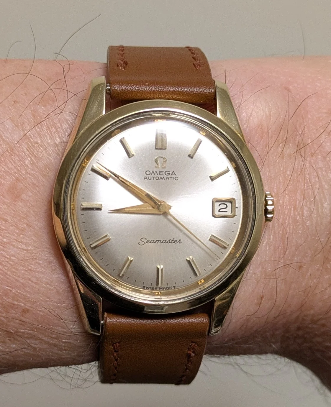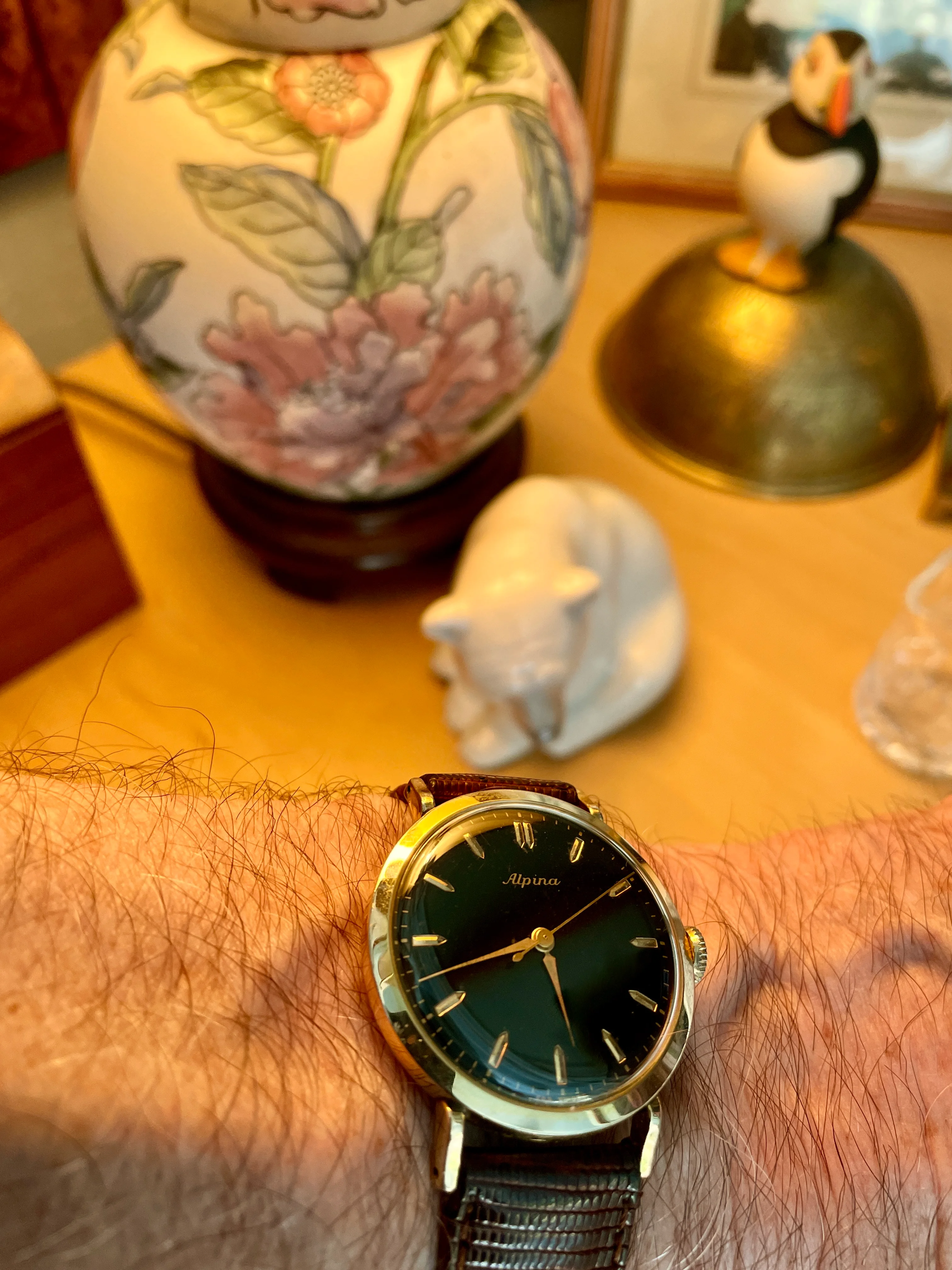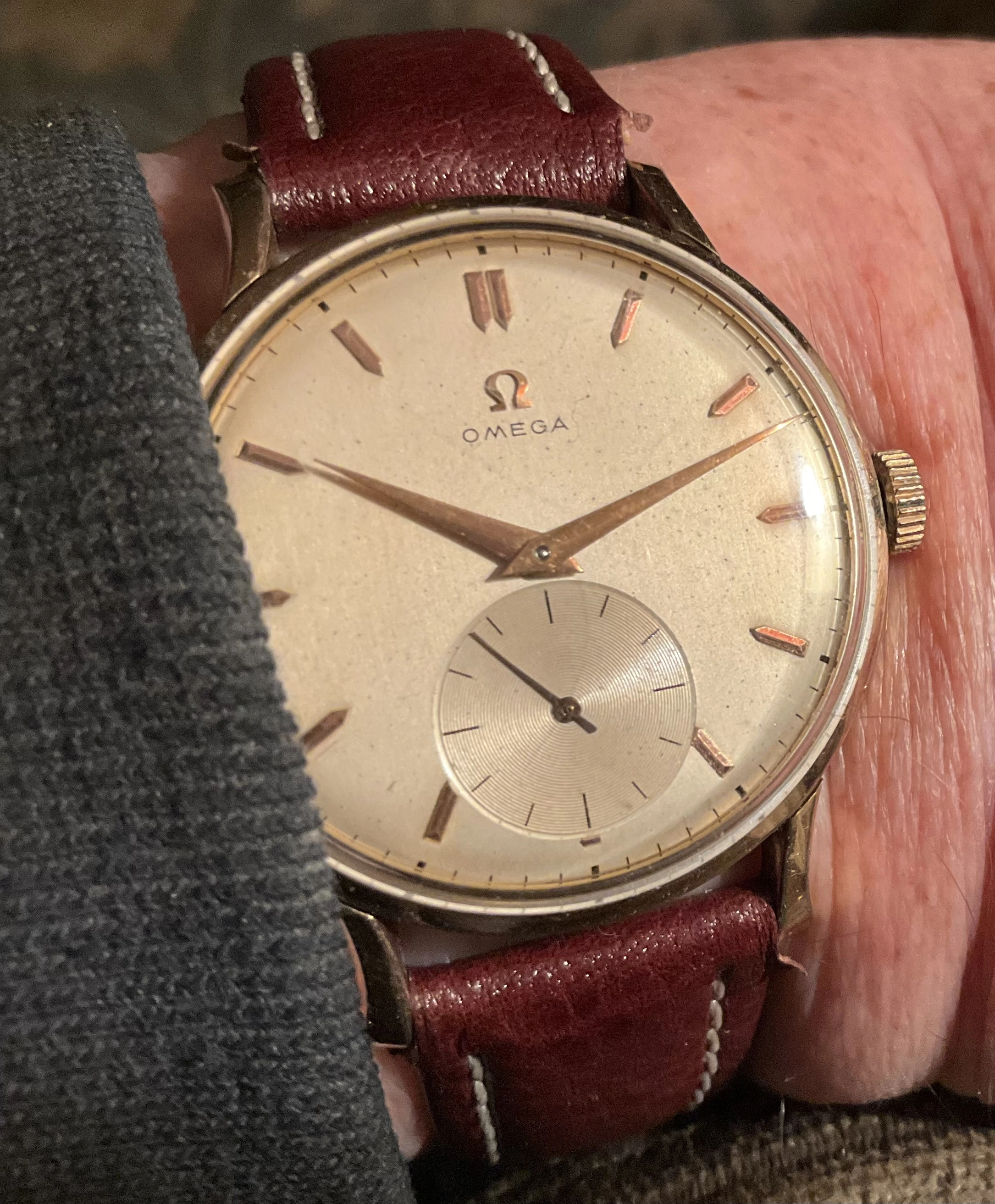 From circa 1955. I acquired it about 40 years ago from a retired geologist who had it on his wrist when the helicopter he was in, crashed. Both he and the watch survived. In its 70 years of existence, it has been serviced twice. Once in 1961 (not by me), and again by me, when I acquired it circa 1985. Manual wind, calibre 266, rose gold filled case. I should wear it more often. Diameter ~ 38 mm, suits my big wrist. Bison calf strap.