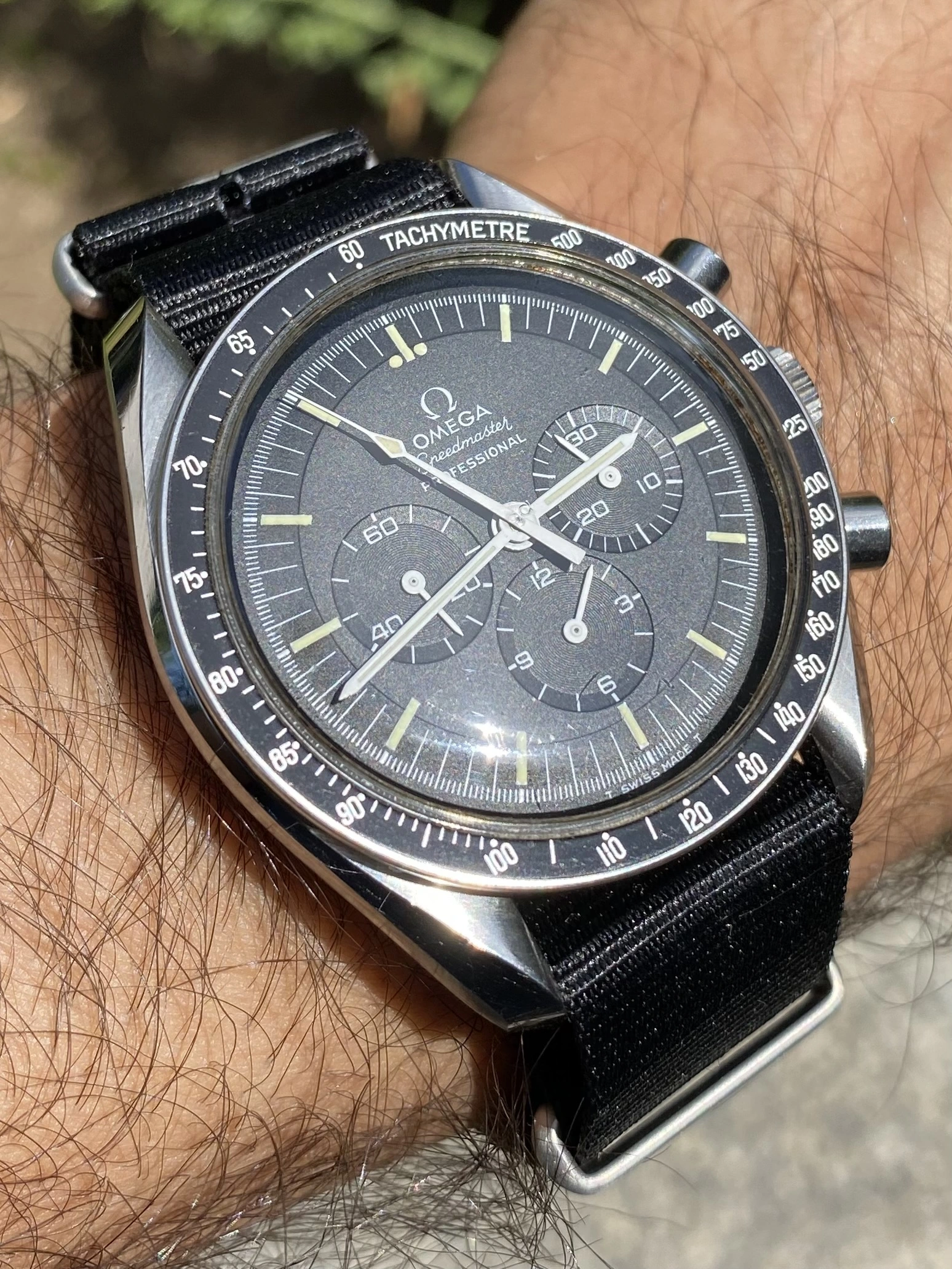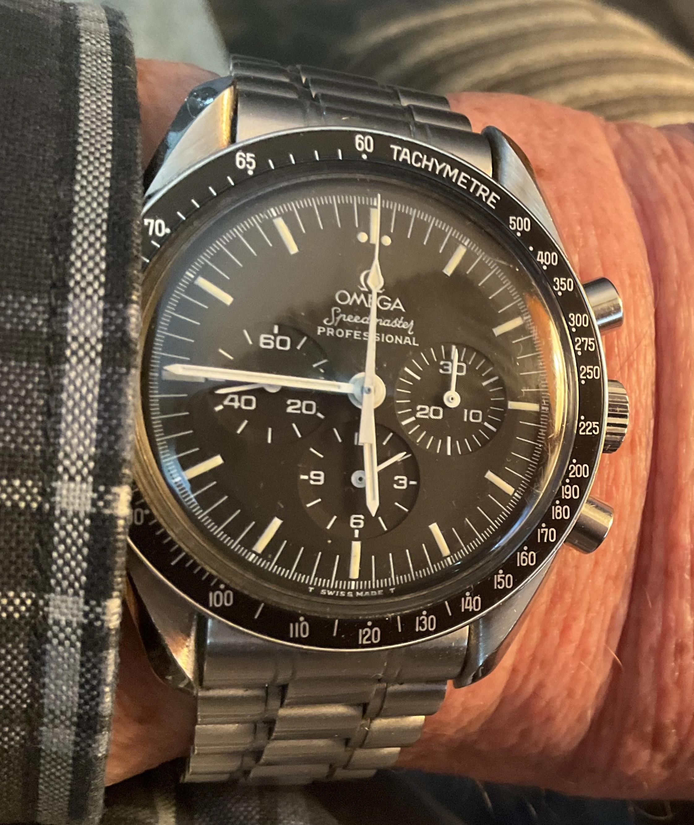 Ready for Tuesday, my one owner, 34 year old Speedmaster 345.0808. The first Speedmaster with a sapphire case back. Introduced in 1980. I serviced this watch in early 2024, and have only worn it for about two weeks since then. So many watches!