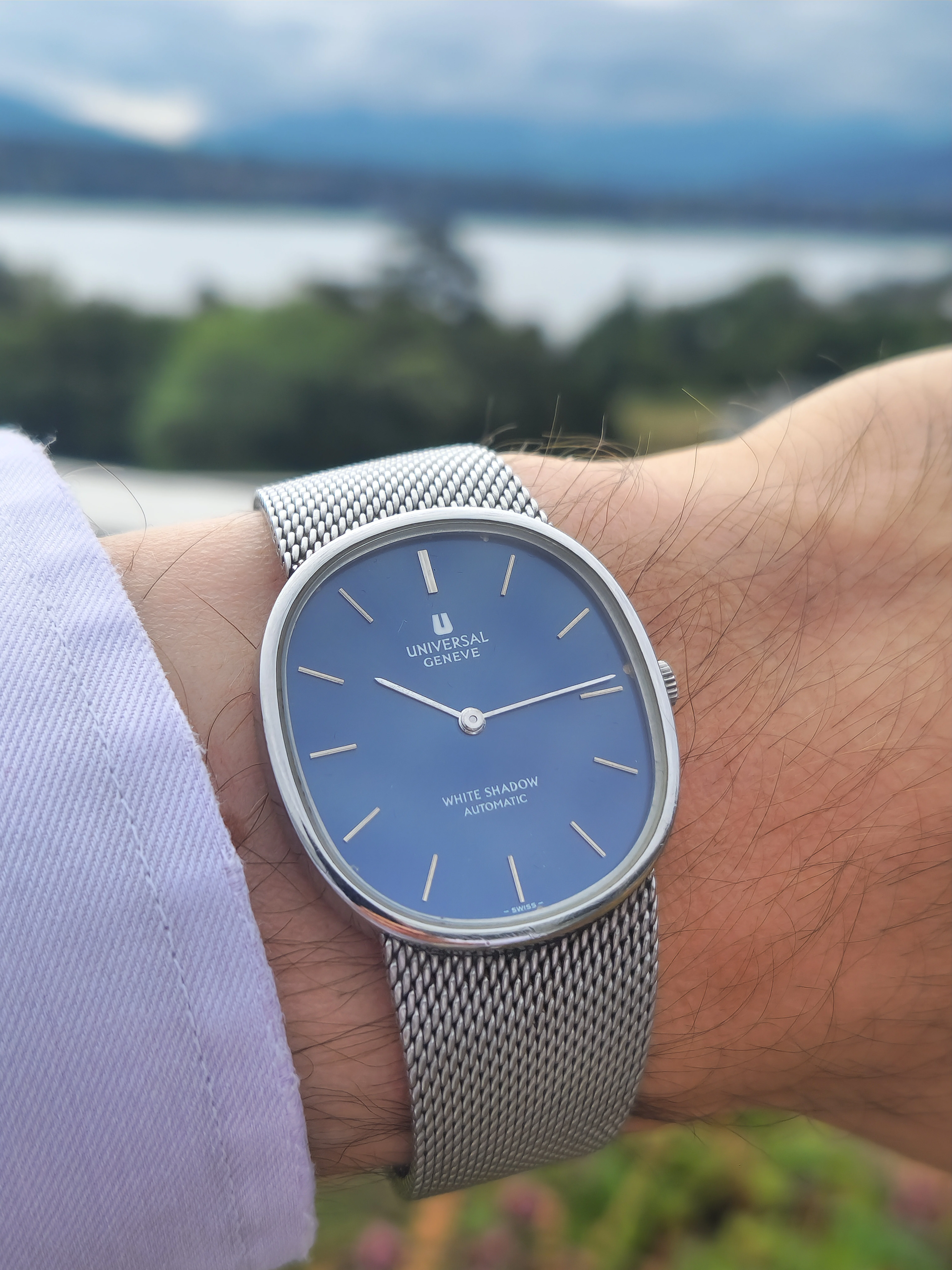 Posts 246 Likes 388 Knebo 路Jul 8, 2025 My beloved Universal Gen猫ve White Shadow with micro-rotor movement. In front of Lake Geneva, it's hometown.