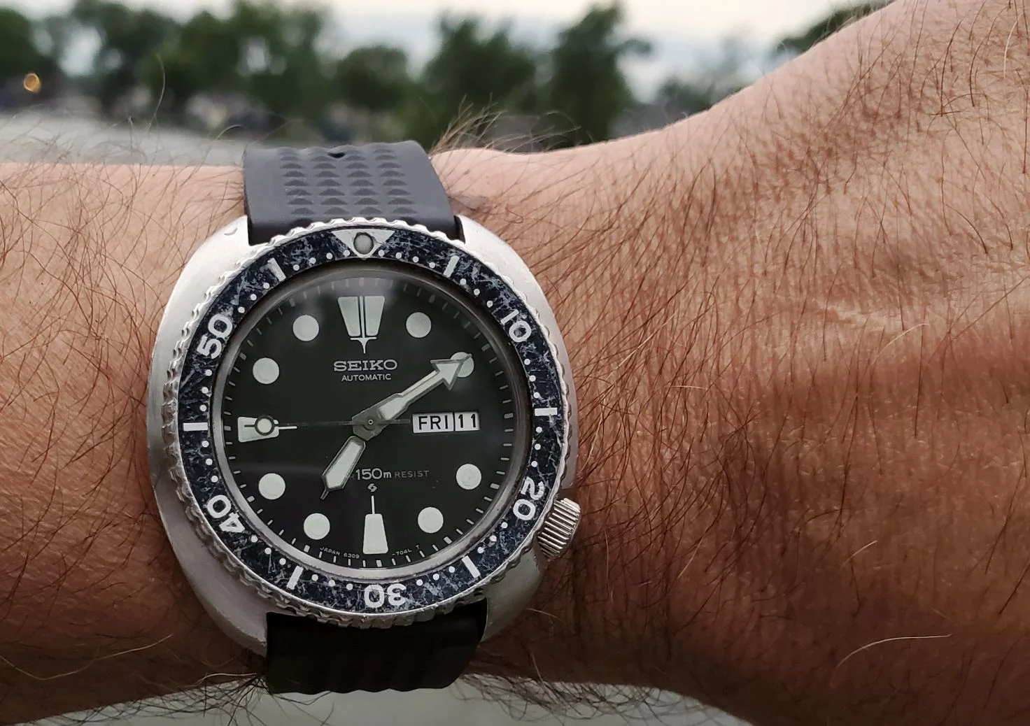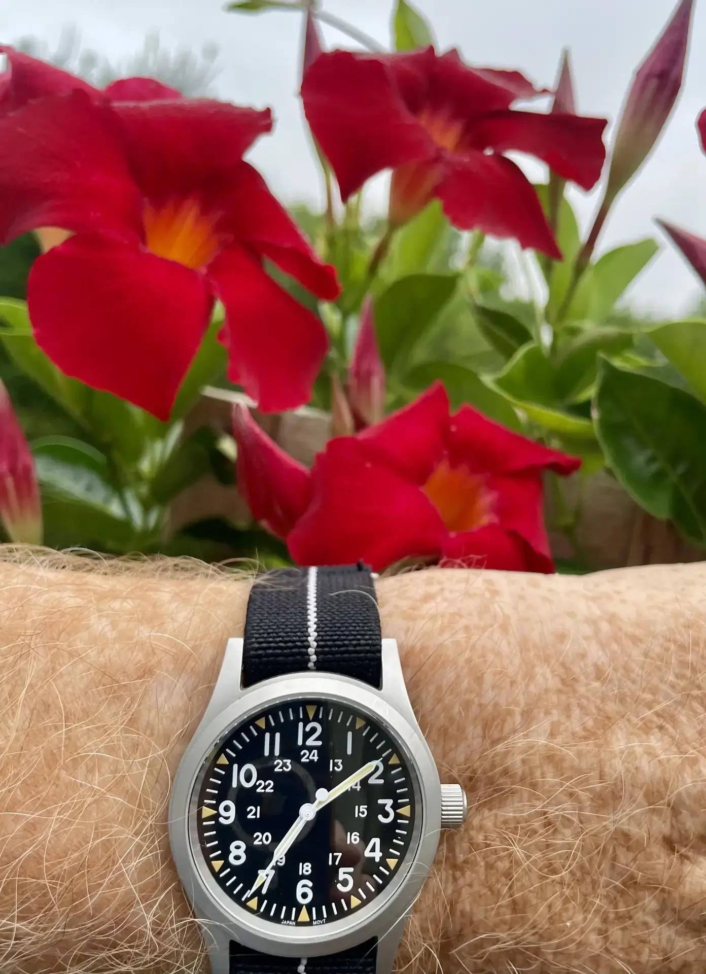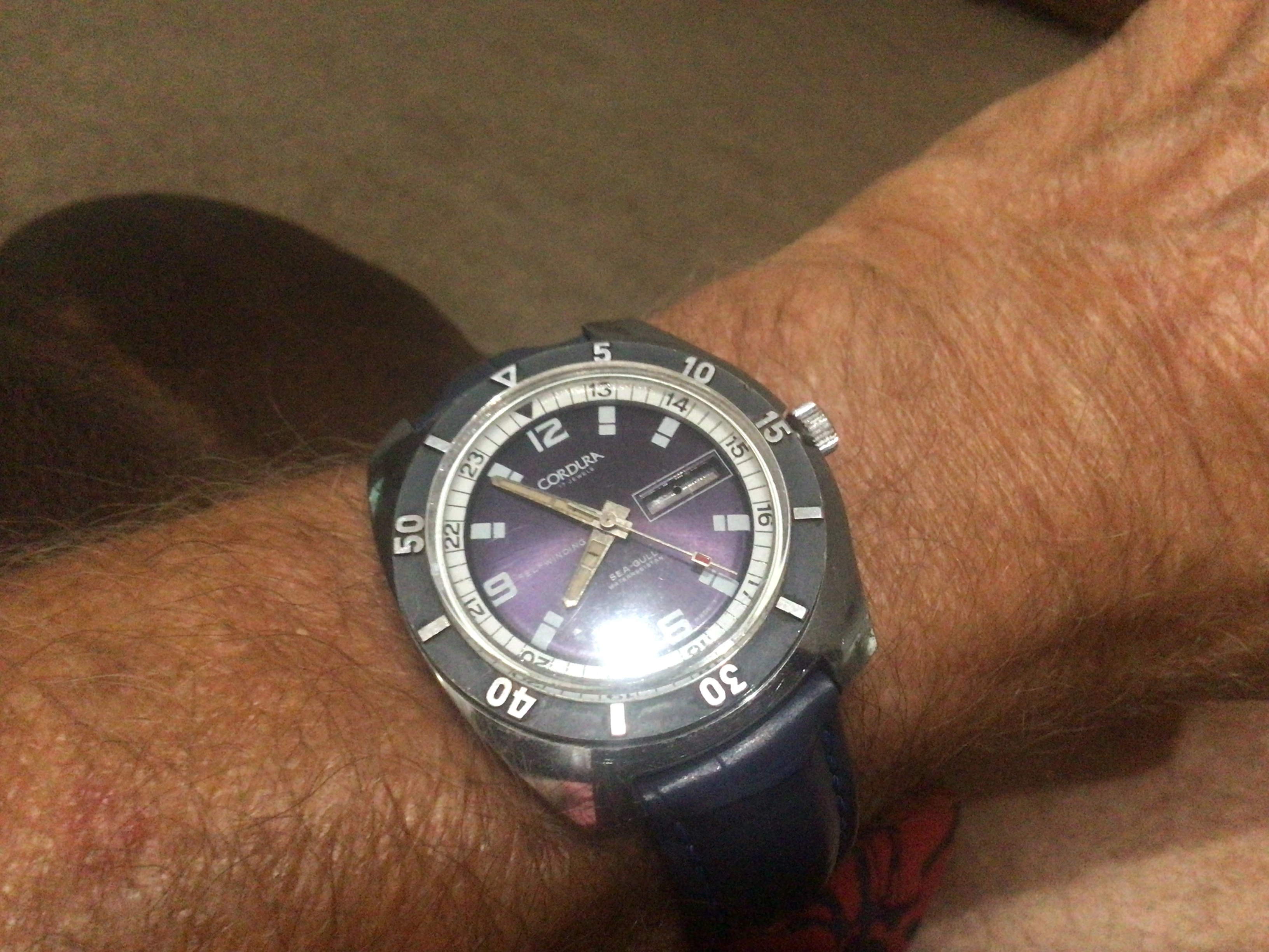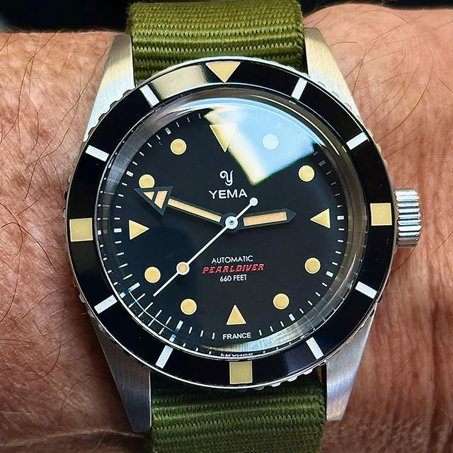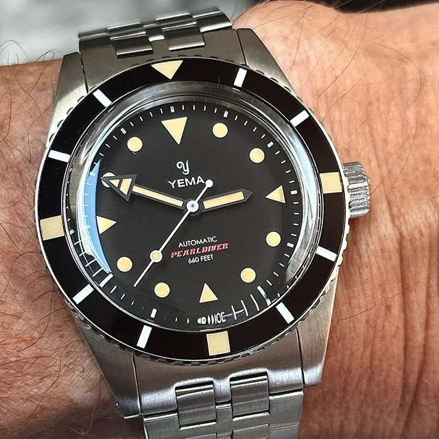 ··Not in LA anymore.A retirement gift to myself. I'd been looking for a 38mm diver with 20mm lug width and this one fit the bill perfectly. The massively domed acrylic crystal was a big bonus, as well as drilled lug holes. And...Yema was holding a fire sale, got it for $500, including steel bracelet with dive extension.