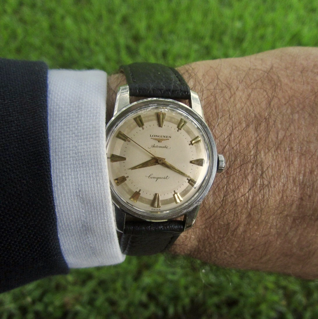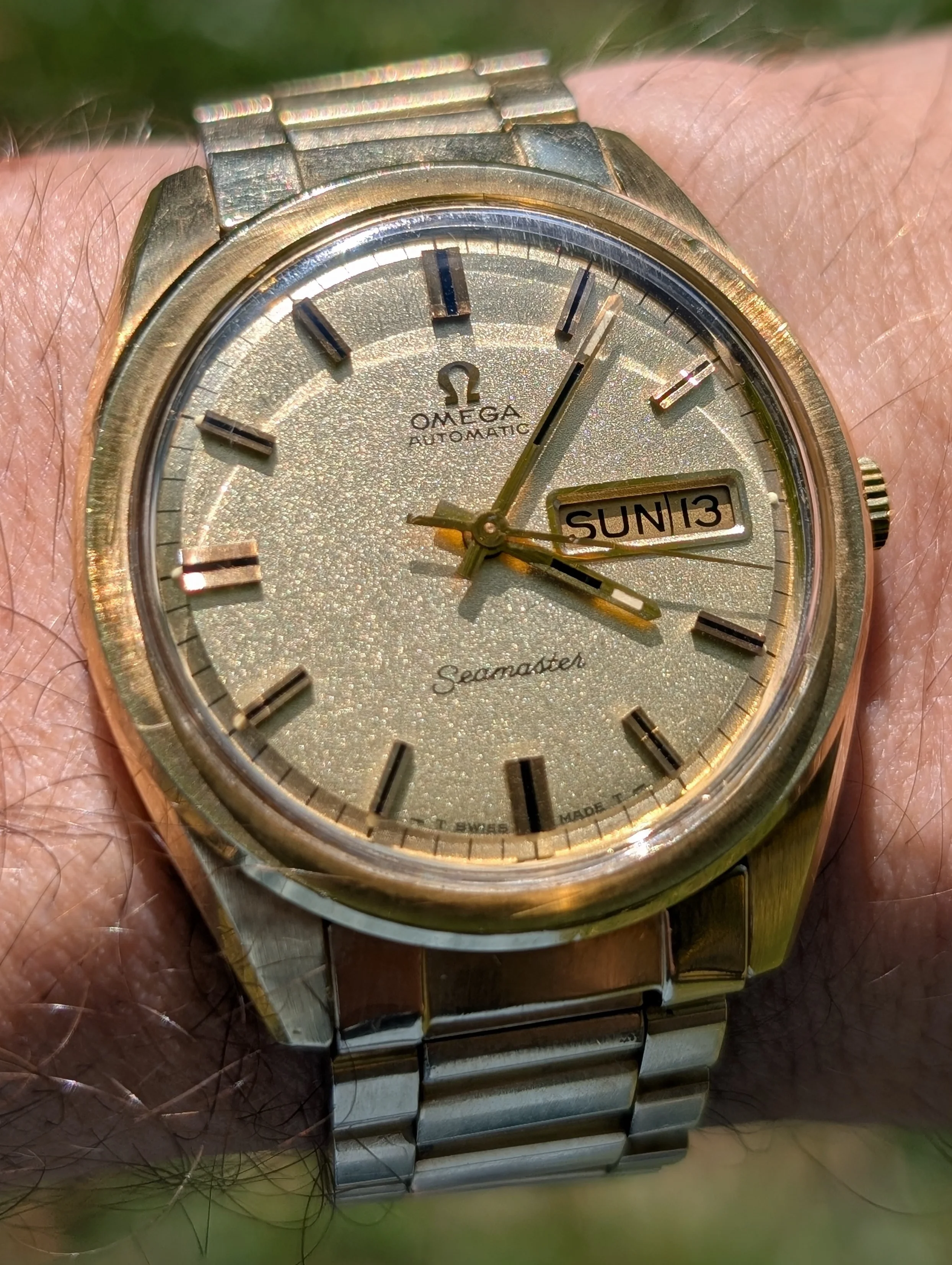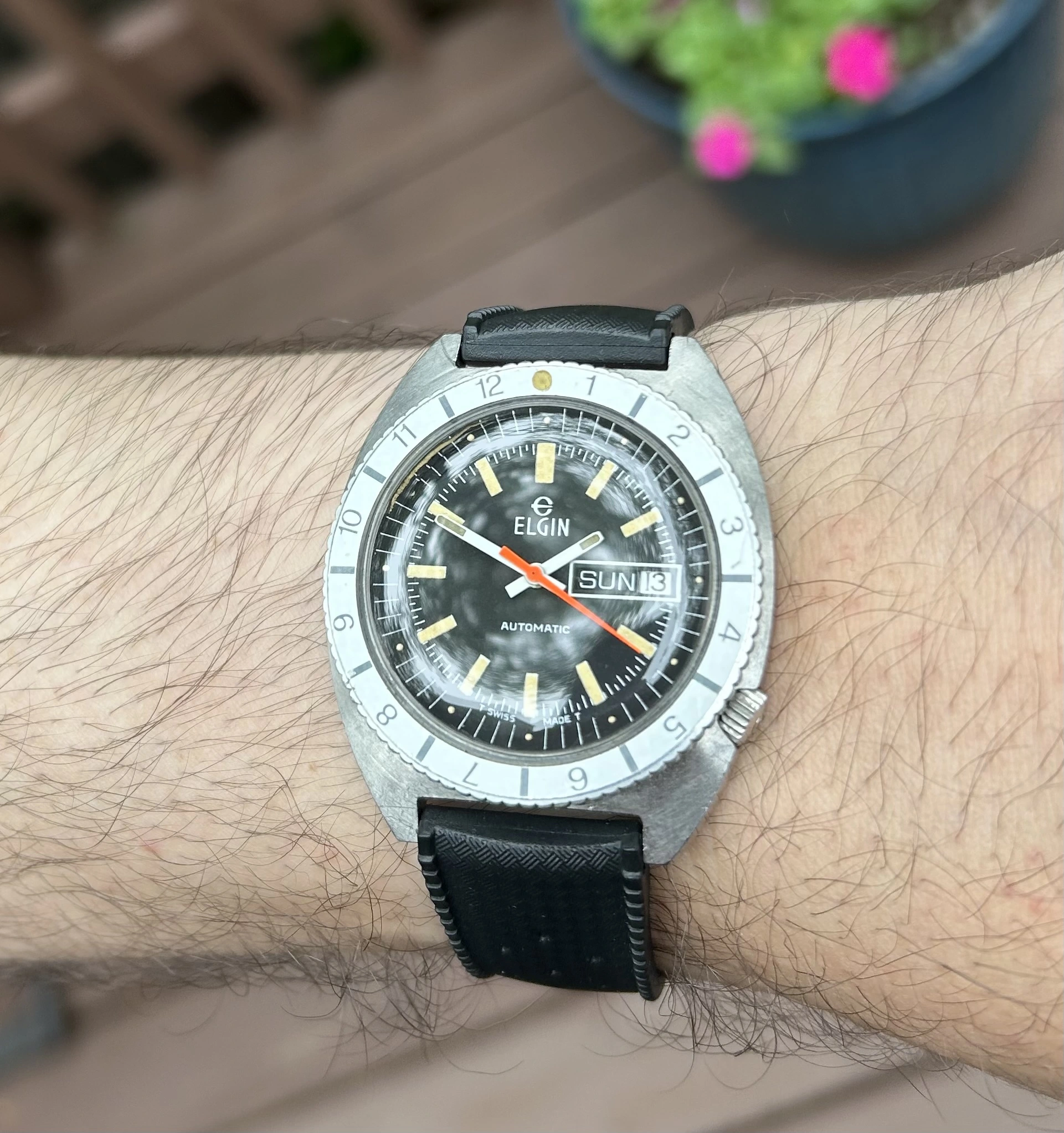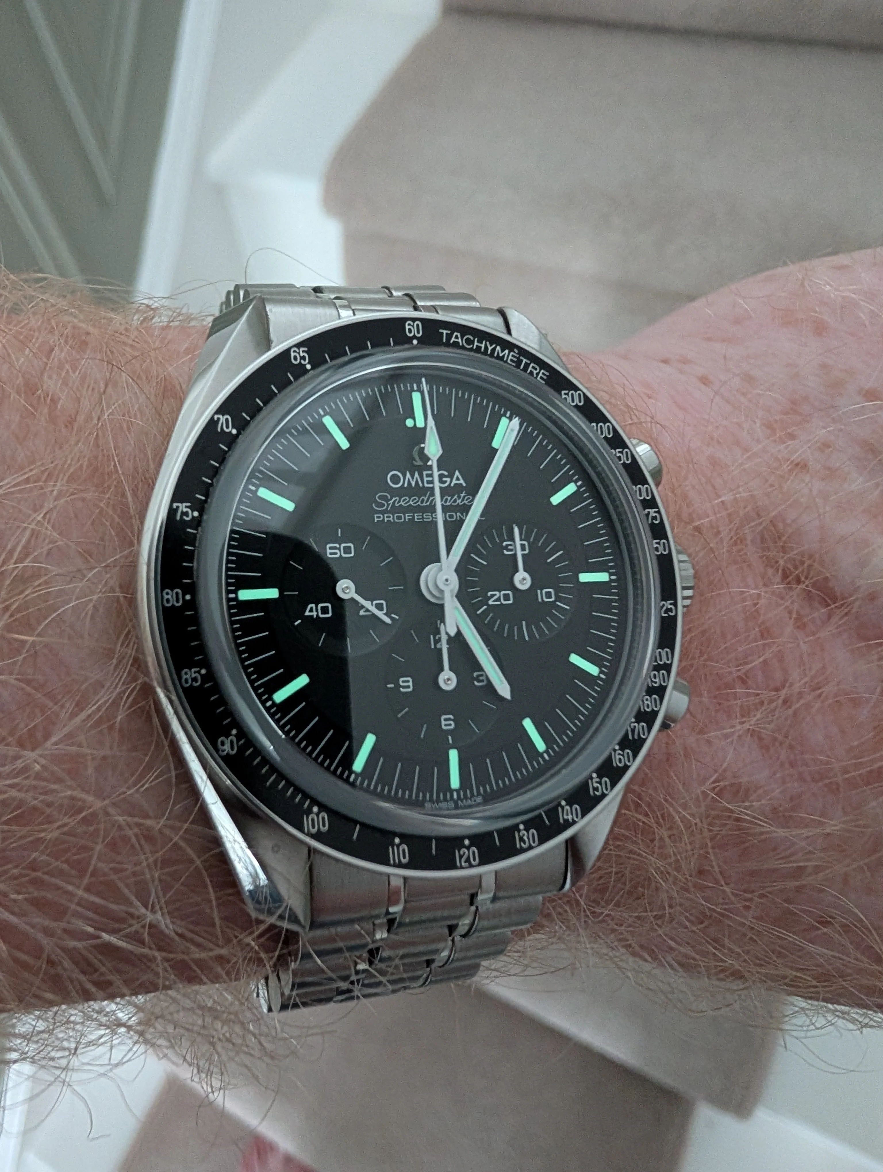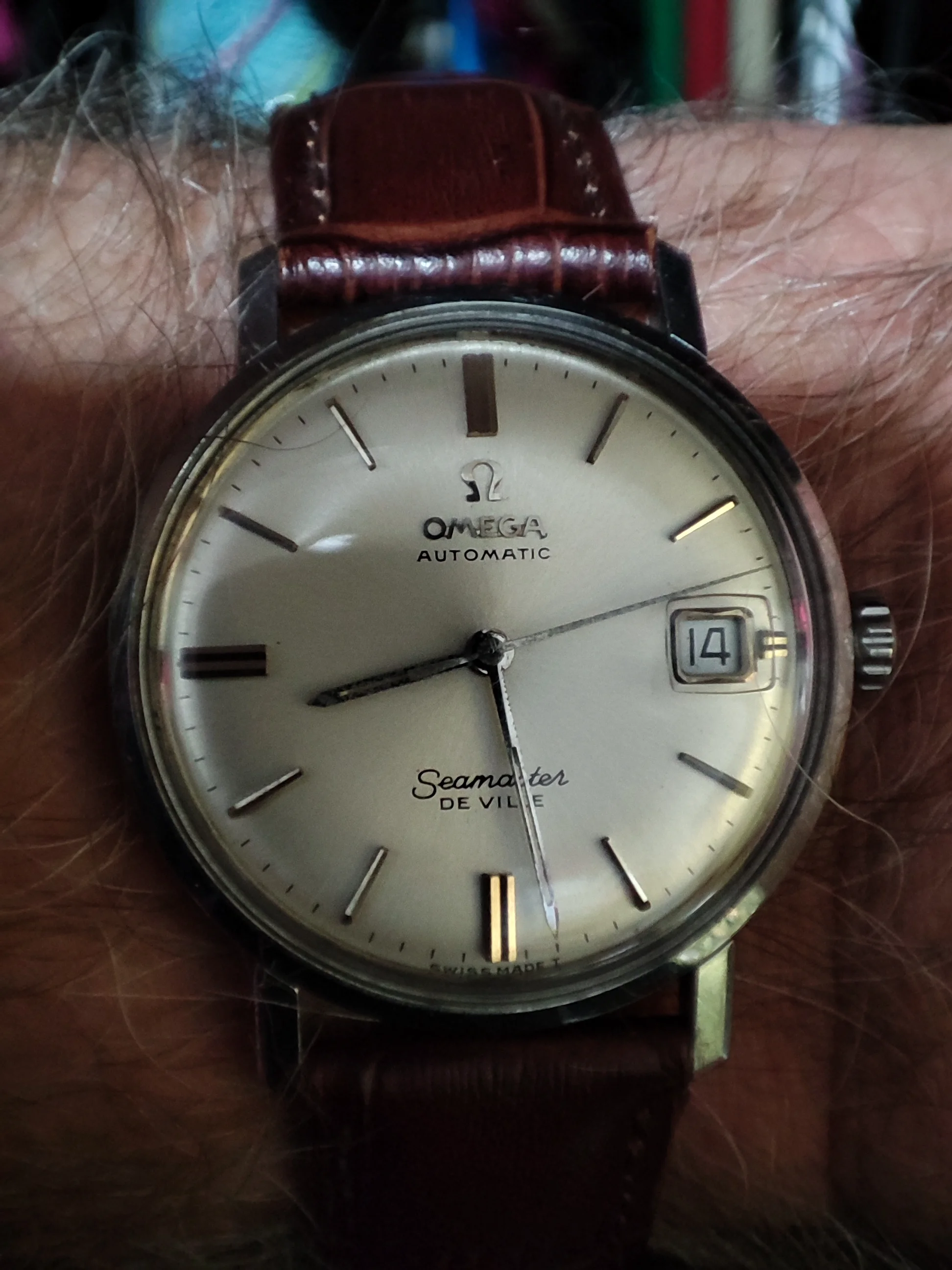 After a couple weeks of wearing Speedmasters, it was time for a change to a favourite which doesn’t get enough exposure. I acquired a box of Accutron parts from a (now deceased) guy who fancied himself a watchmaker. He never learned that you’re not a watchmaker until after you can take ‘em to pieces, re-assemble them, and make ‘em run! This Spaceview was built out of parts out of that box. All genuine Accutron. Donor case back says 1966, but I can only guess that might be close to its age.