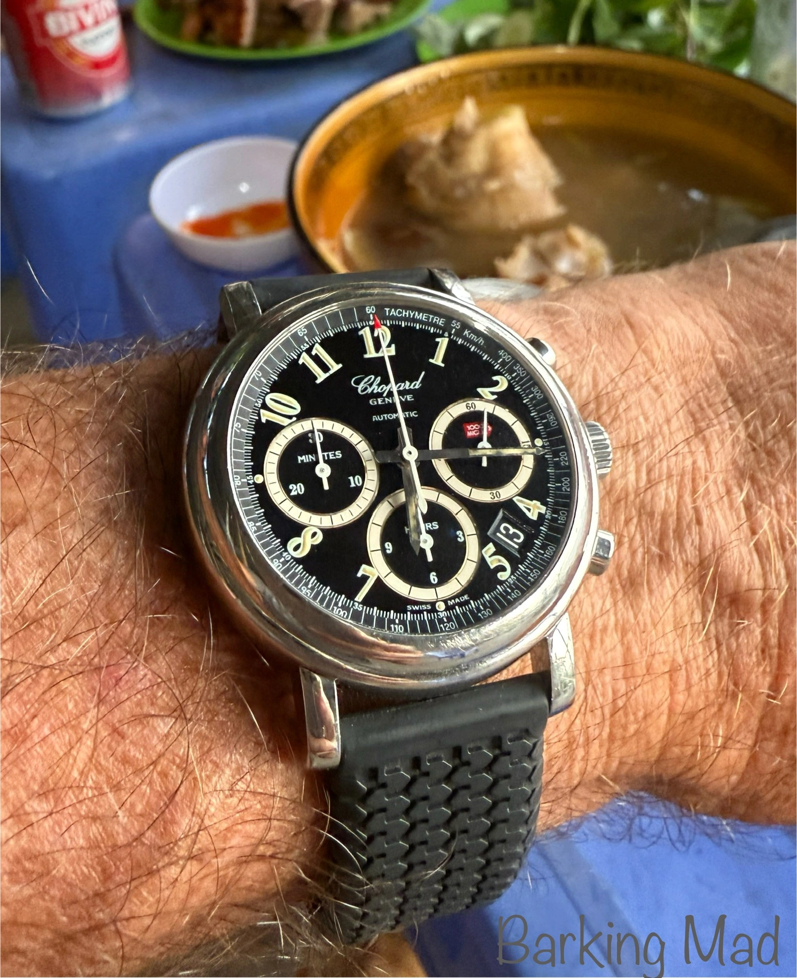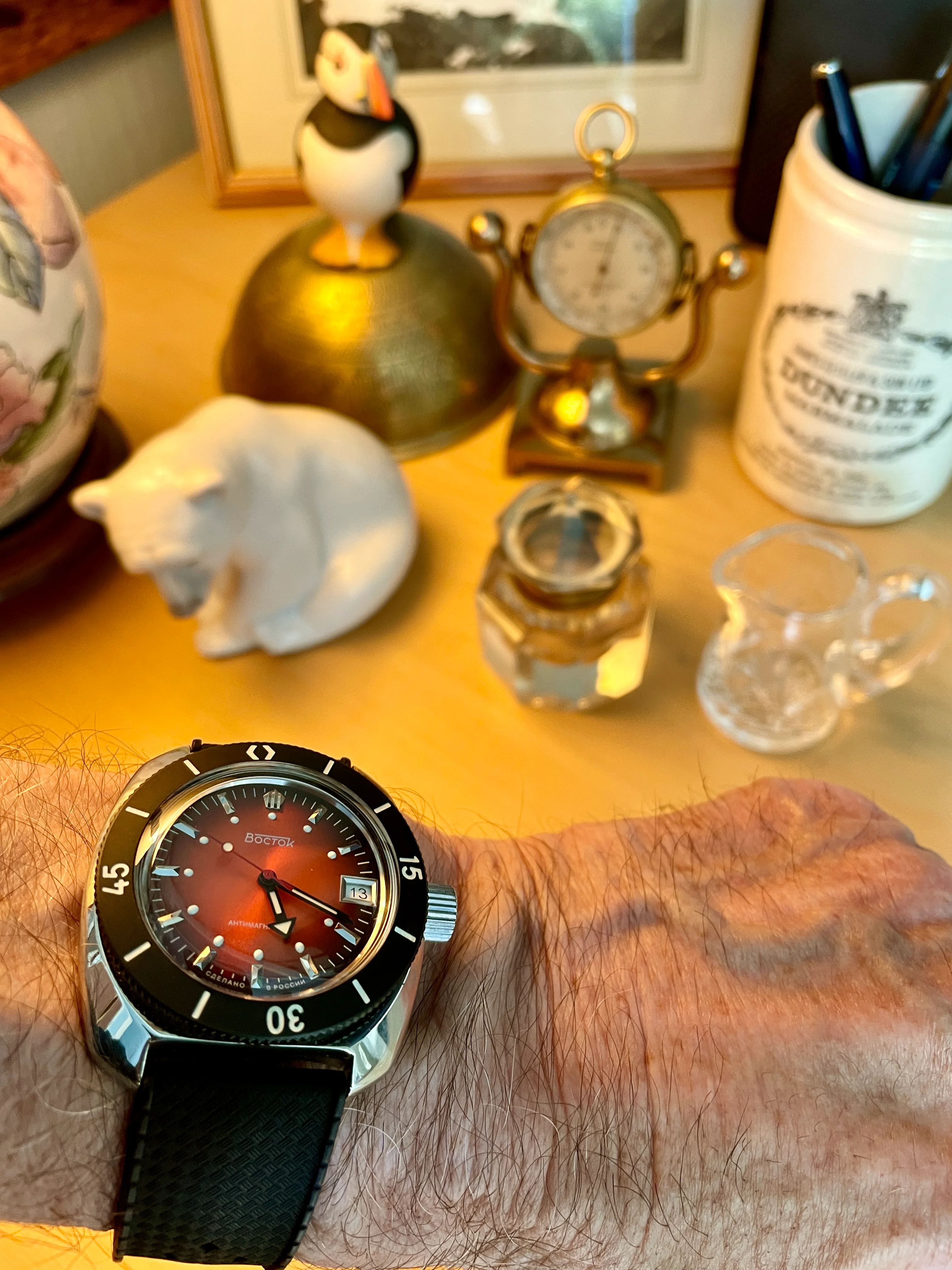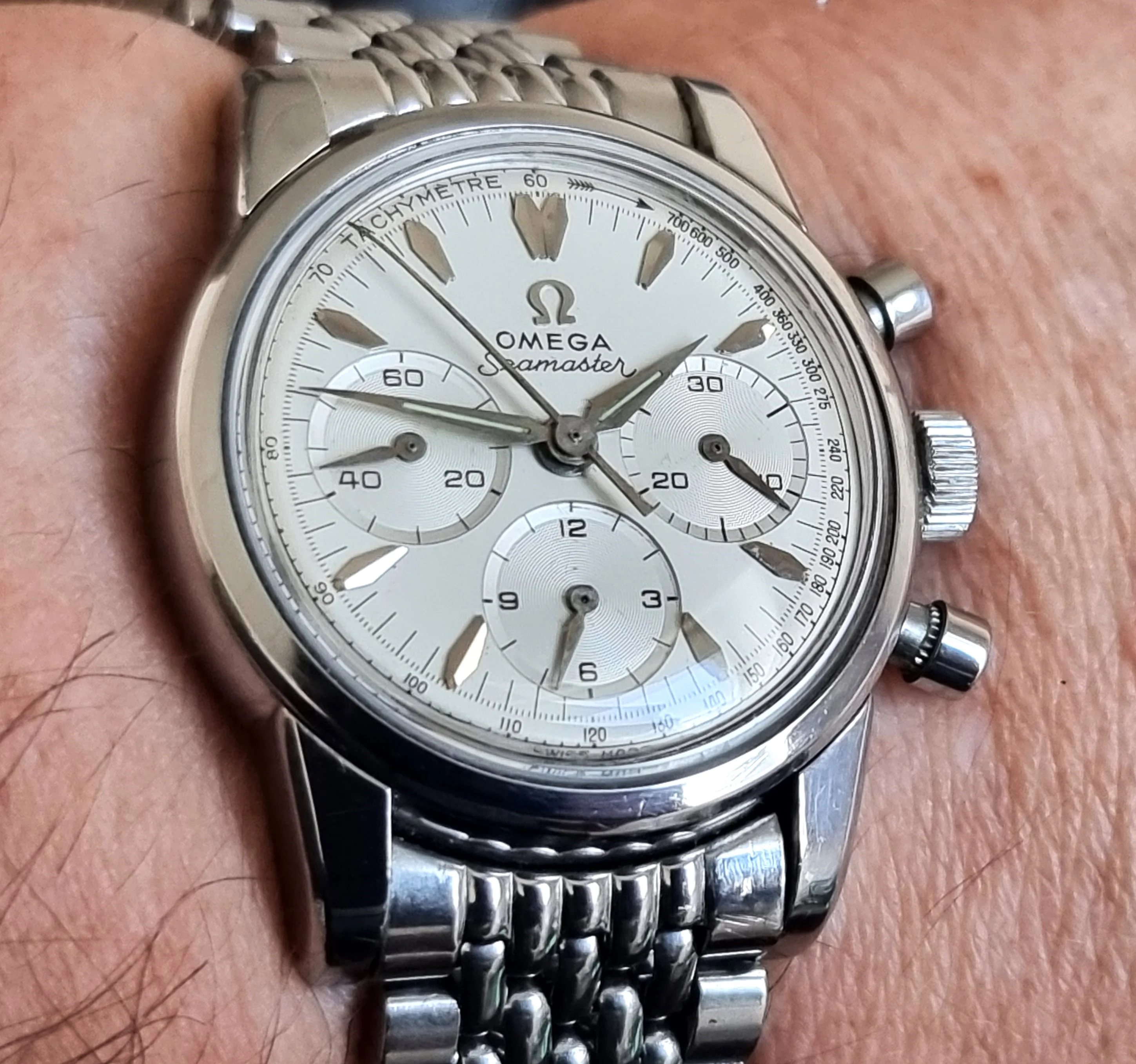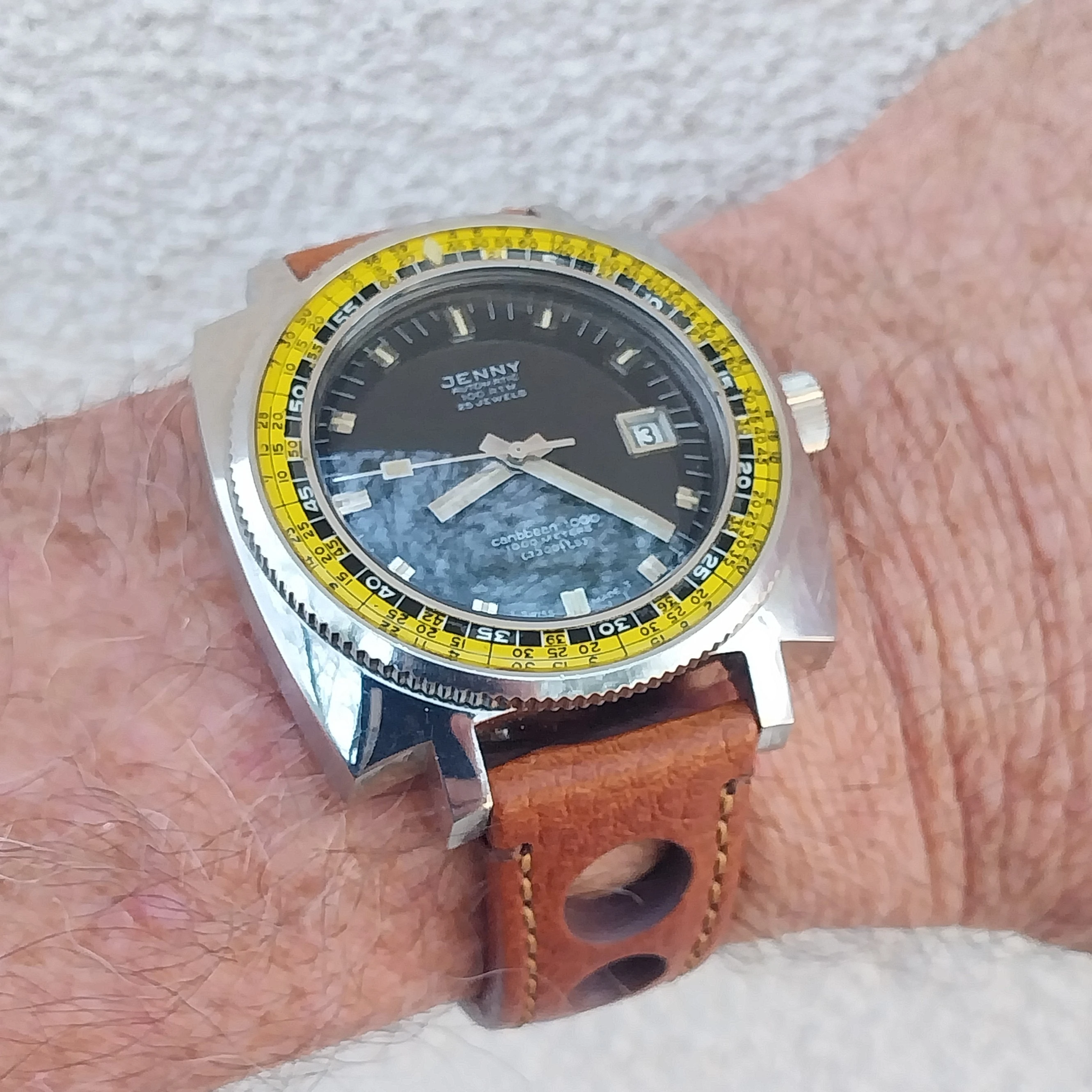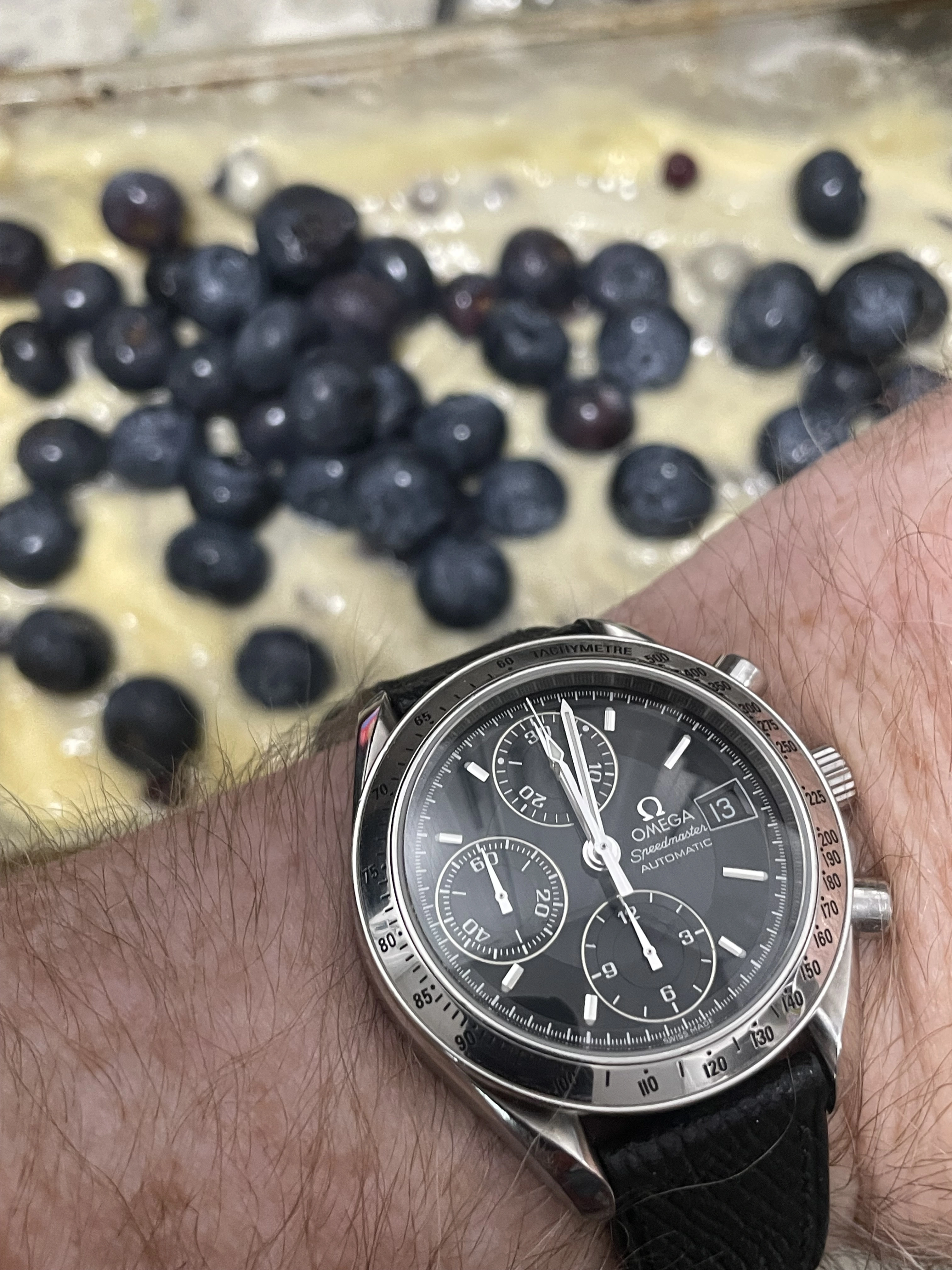 After a couple weeks of wearing Speedmasters, it was time for a change to a favourite which doesn’t get enough exposure. I acquired a box of Accutron parts from a (now deceased) guy who fancied himself a watchmaker. He never learned that you’re not a watchmaker until after you can take ‘em to pieces, re-assemble them, and make ‘em run! This Spaceview was built out of parts out of that box. All genuine Accutron. Donor case back says 1966, but I can only guess that might be close to its age.