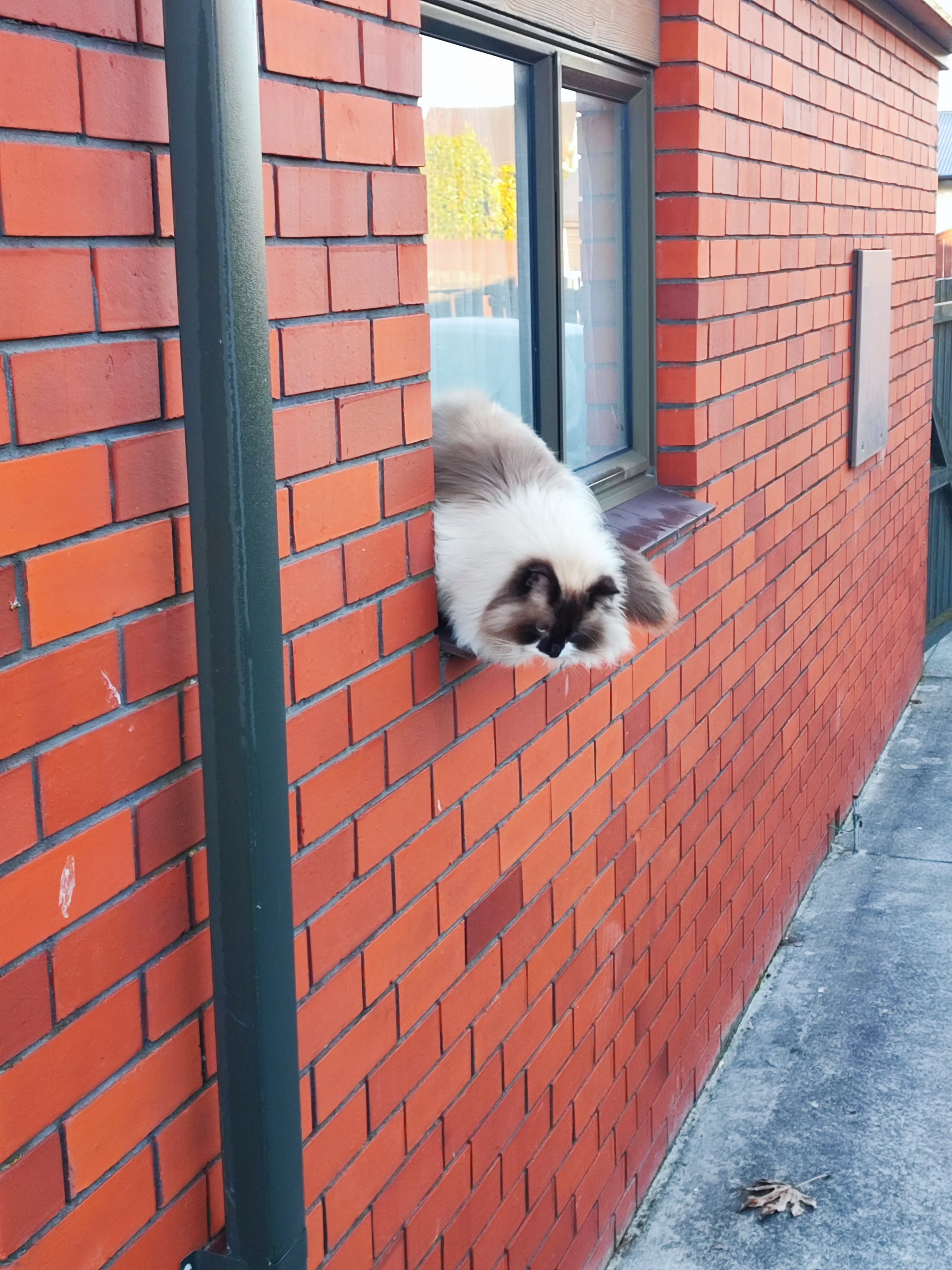 This mornings entertainment, next door neighbour cat sitting against a closed window on a ledge just 3 inches wide.