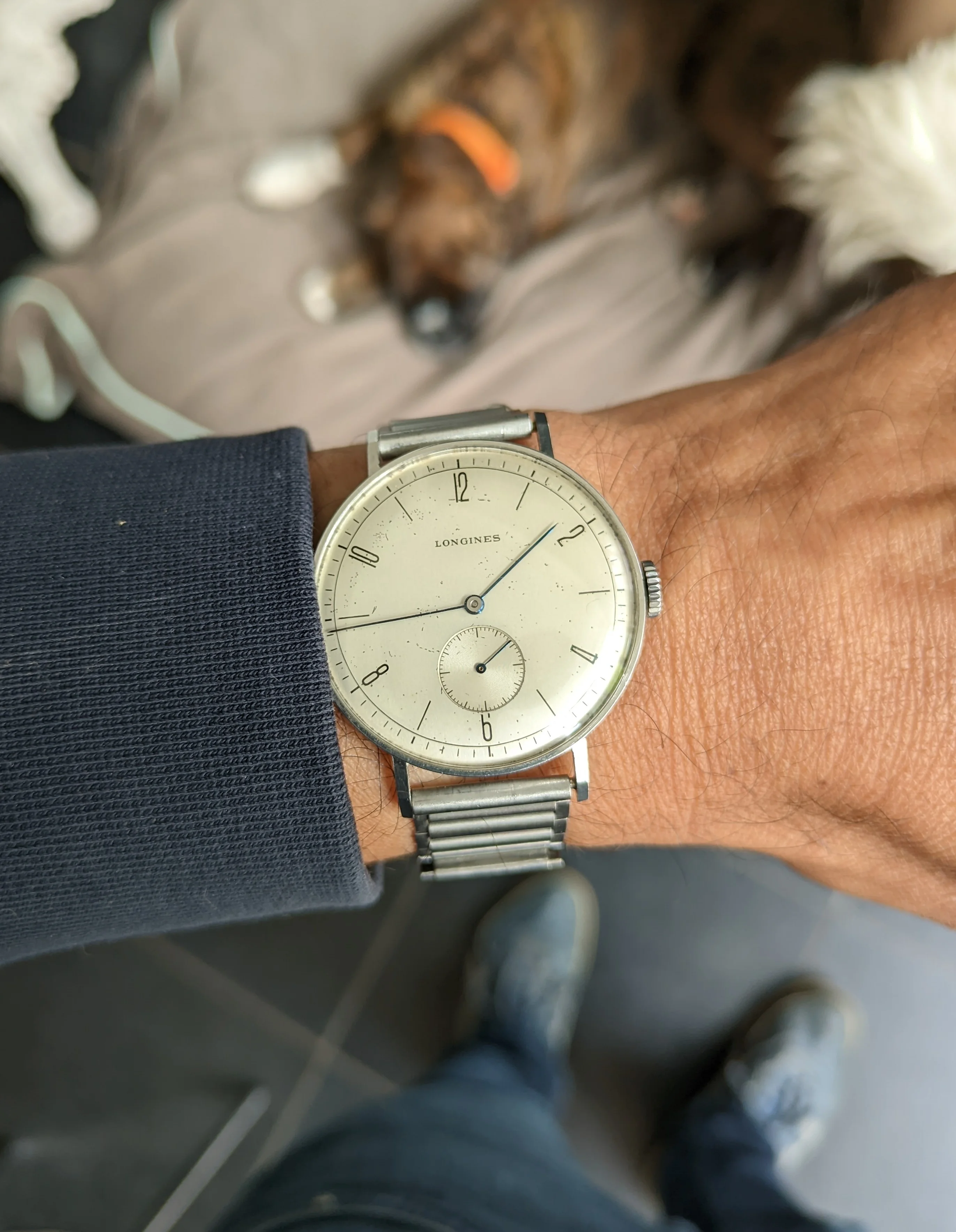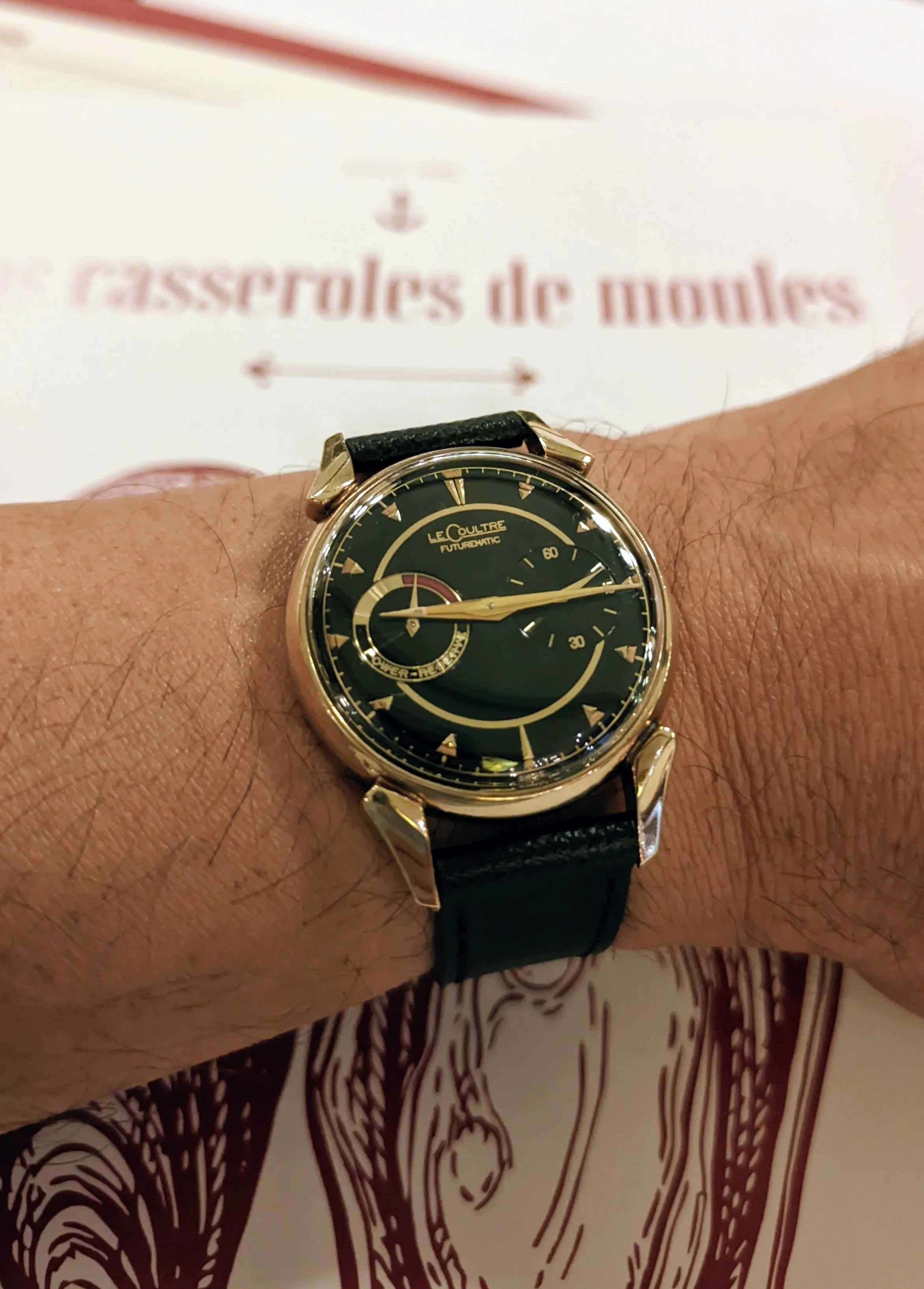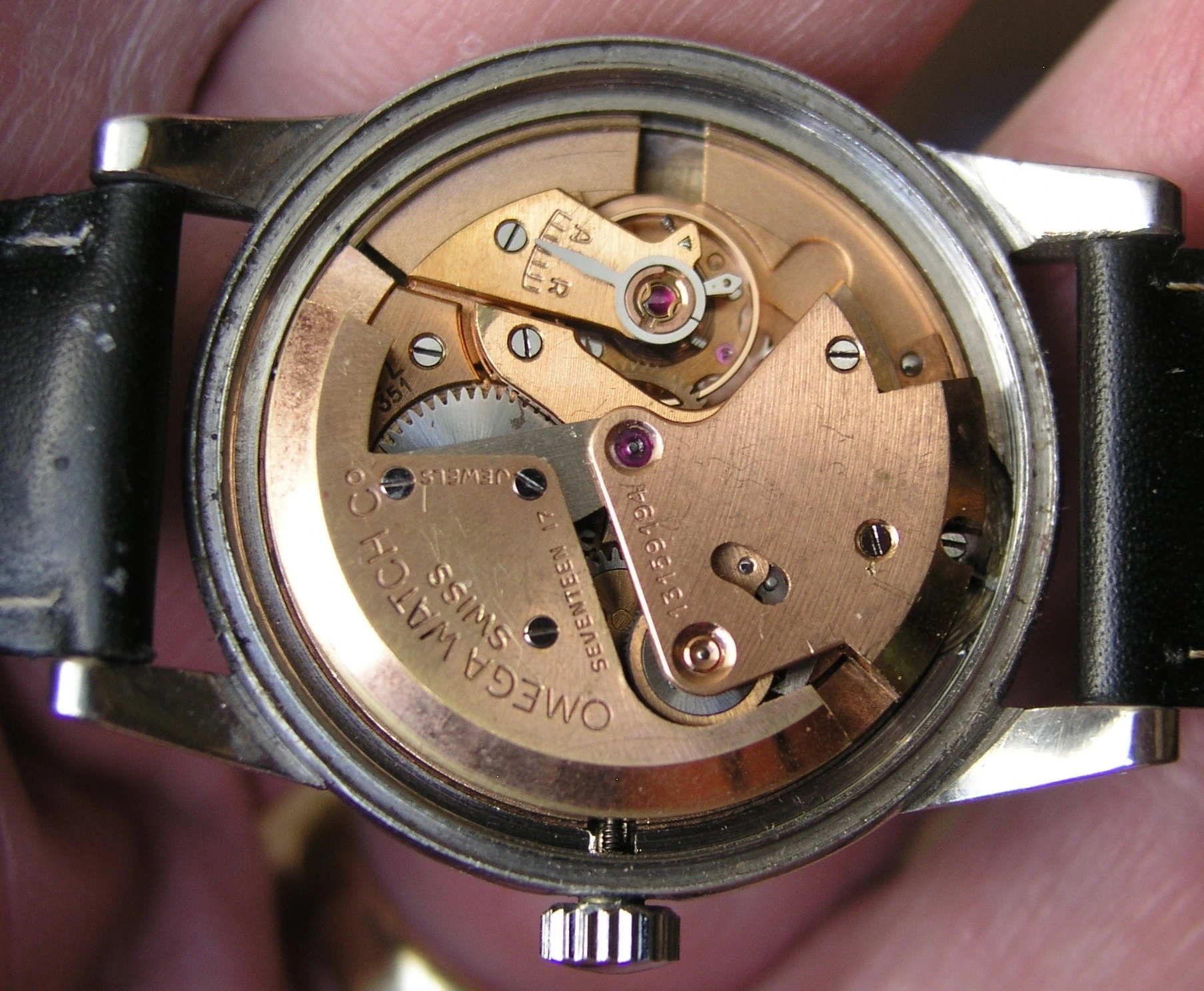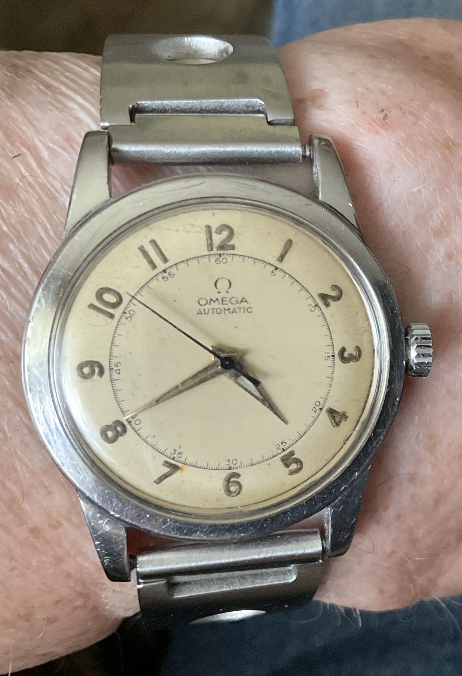 Irrational, I know, but it has been some time since I have worn a bumper automatic. So I decided I’d cure the itch by putting on my mid 1950s “survivor” Omega bumper automatic, calibre 351. I call this one a survivor because it appeared to me that its previous owner had done everything in his power to destroy it! As you see it, the case has been changed to a period correct Omega case, replacement (better) dial, crystal, crown (generic), hand made case clamp, mainspring, and a thorough service. Hardly a grail watch for an ardent Omega collector, but it continues to amaze me at its performance.