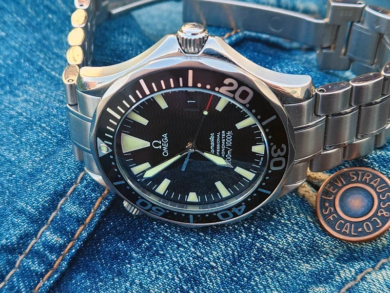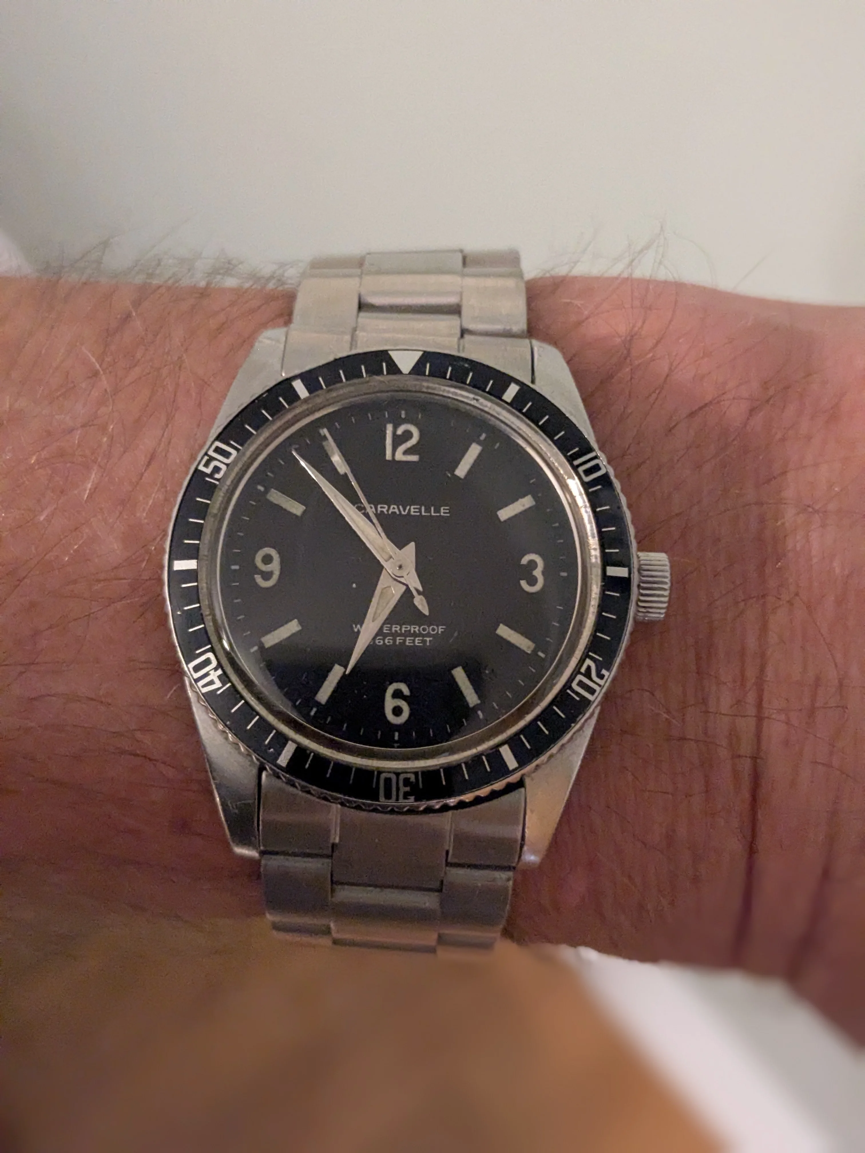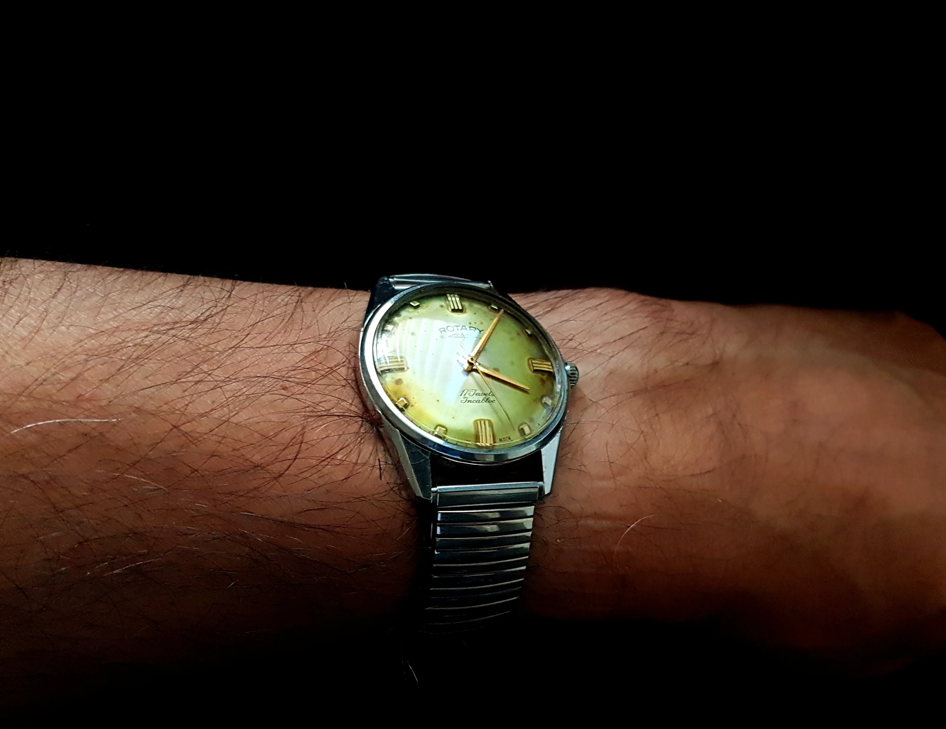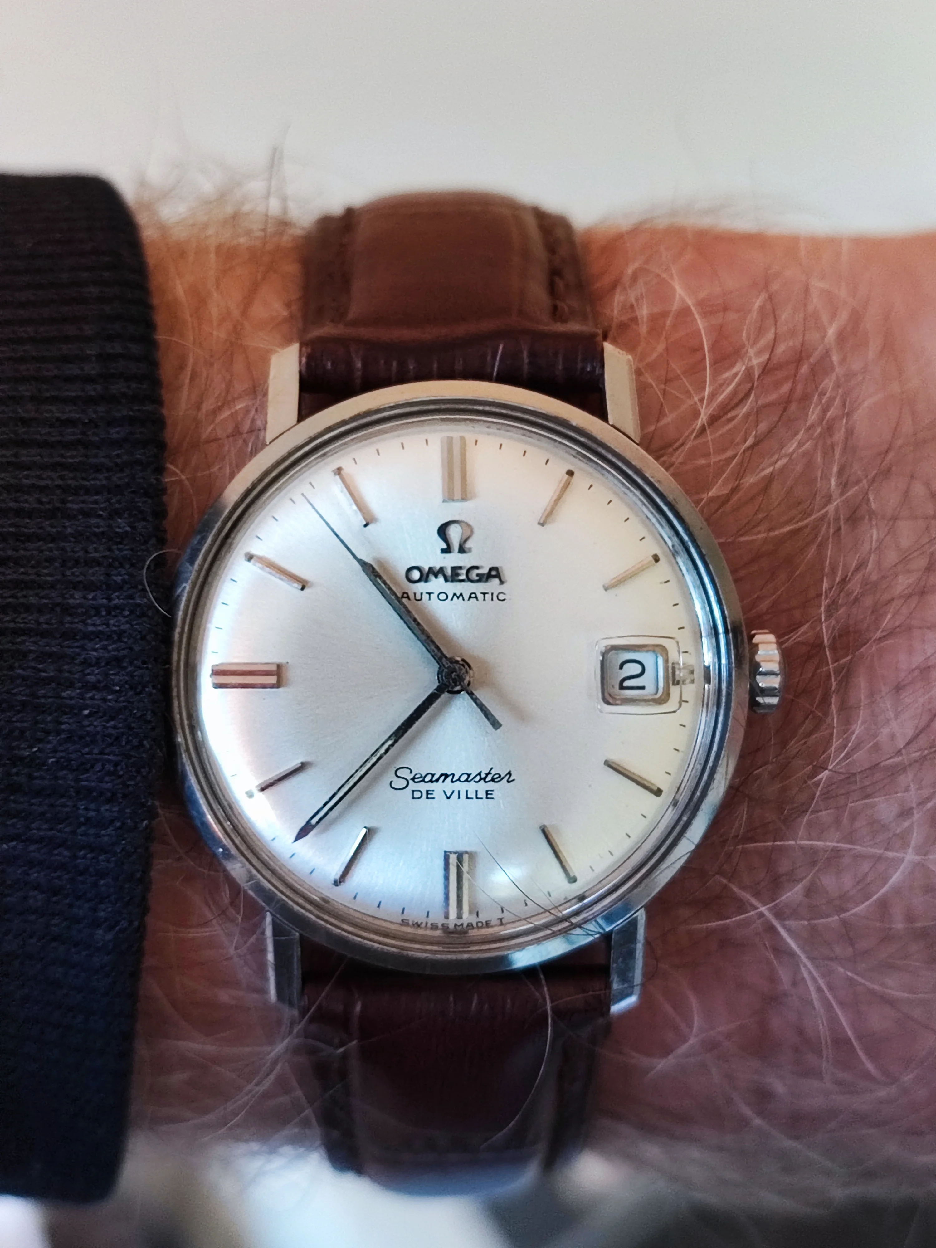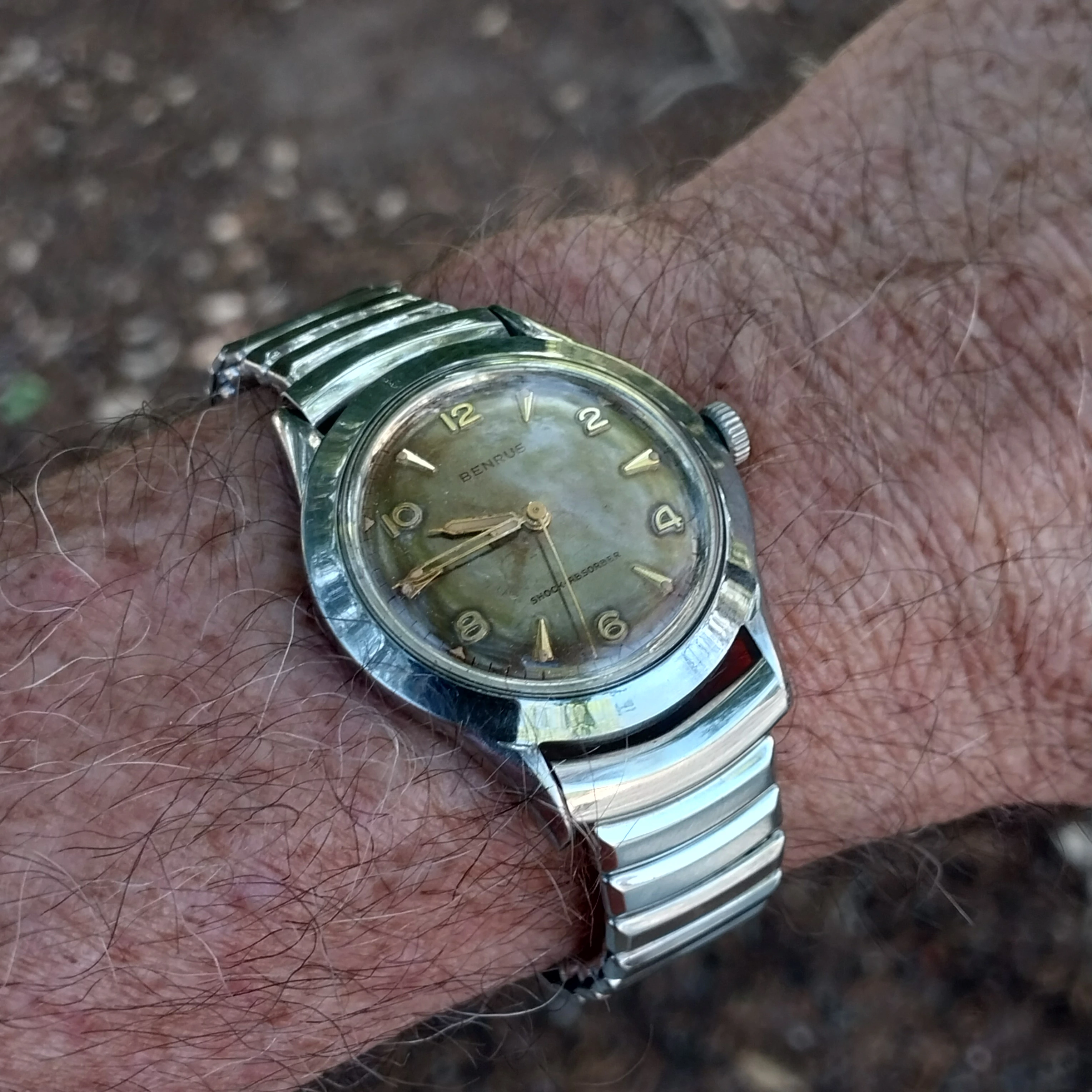 Irrational, I know, but it has been some time since I have worn a bumper automatic. So I decided I’d cure the itch by putting on my mid 1950s “survivor” Omega bumper automatic, calibre 351. I call this one a survivor because it appeared to me that its previous owner had done everything in his power to destroy it! As you see it, the case has been changed to a period correct Omega case, replacement (better) dial, crystal, crown (generic), hand made case clamp, mainspring, and a thorough service. Hardly a grail watch for an ardent Omega collector, but it continues to amaze me at its performance.