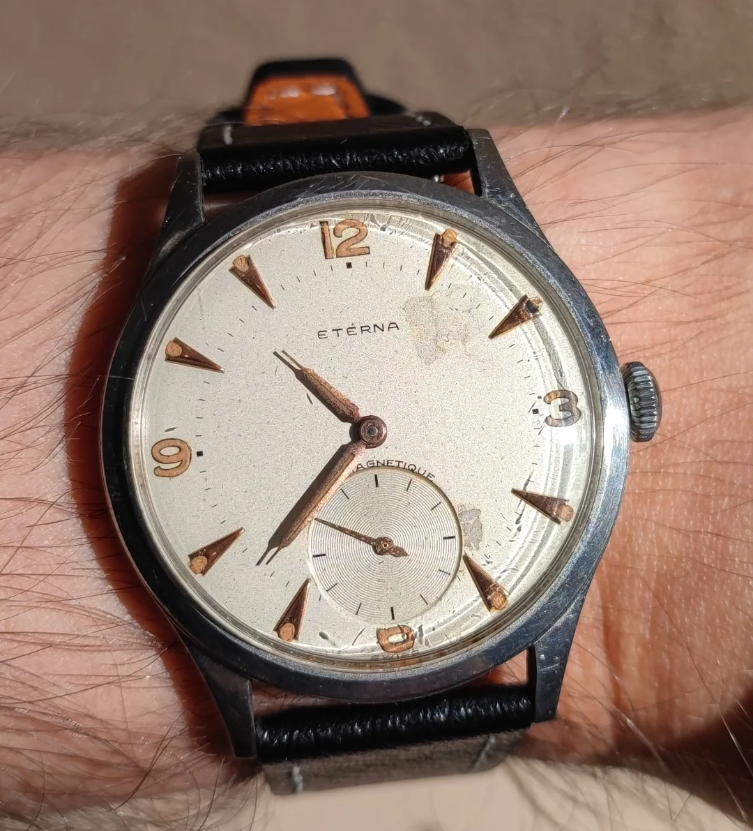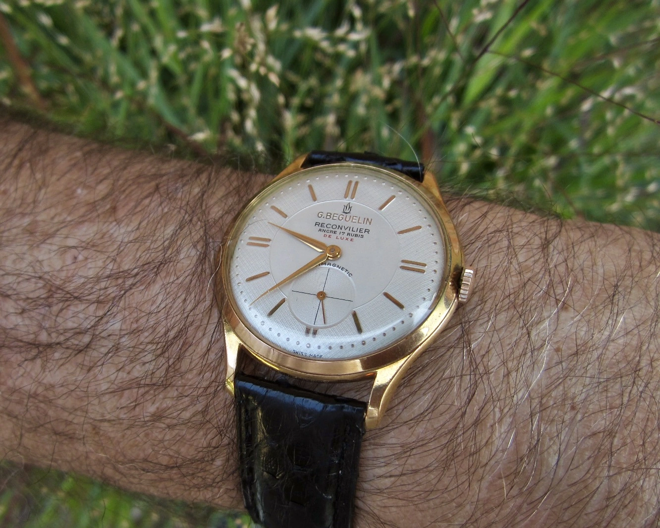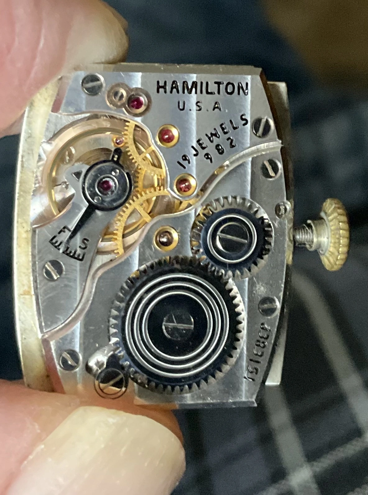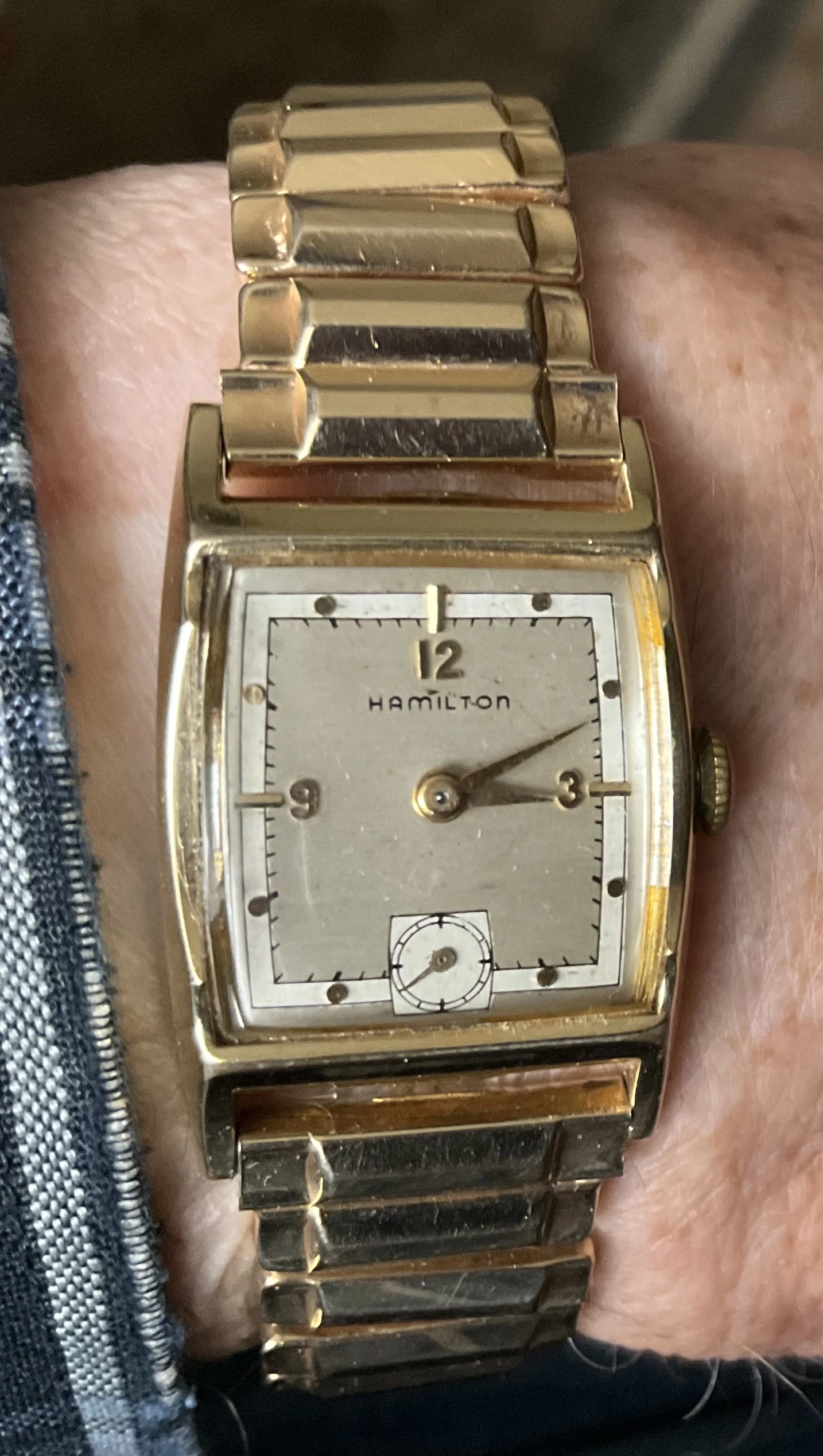 ·It’s Speedy Tuesday, so I’m wearing my ……………! You can say what you like about mass produced, machine made watches, but I think this is about as pretty a movement as you’ll find. A 1947 calibre 982, 19-jewel movement. Hamilton Kirby, 14-karat gold filled case with 14-karat gold filled case back. My Speedmasters will have to wait their turn!