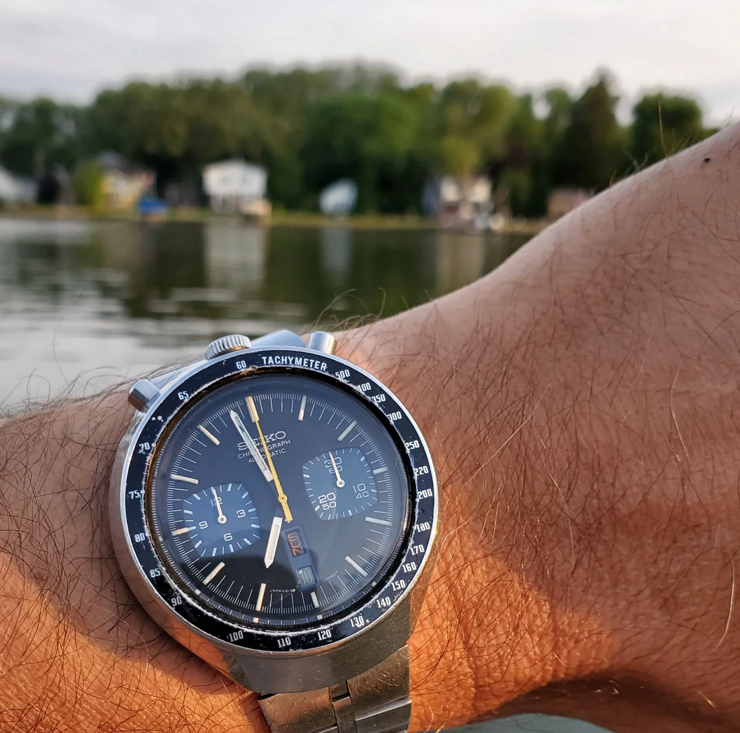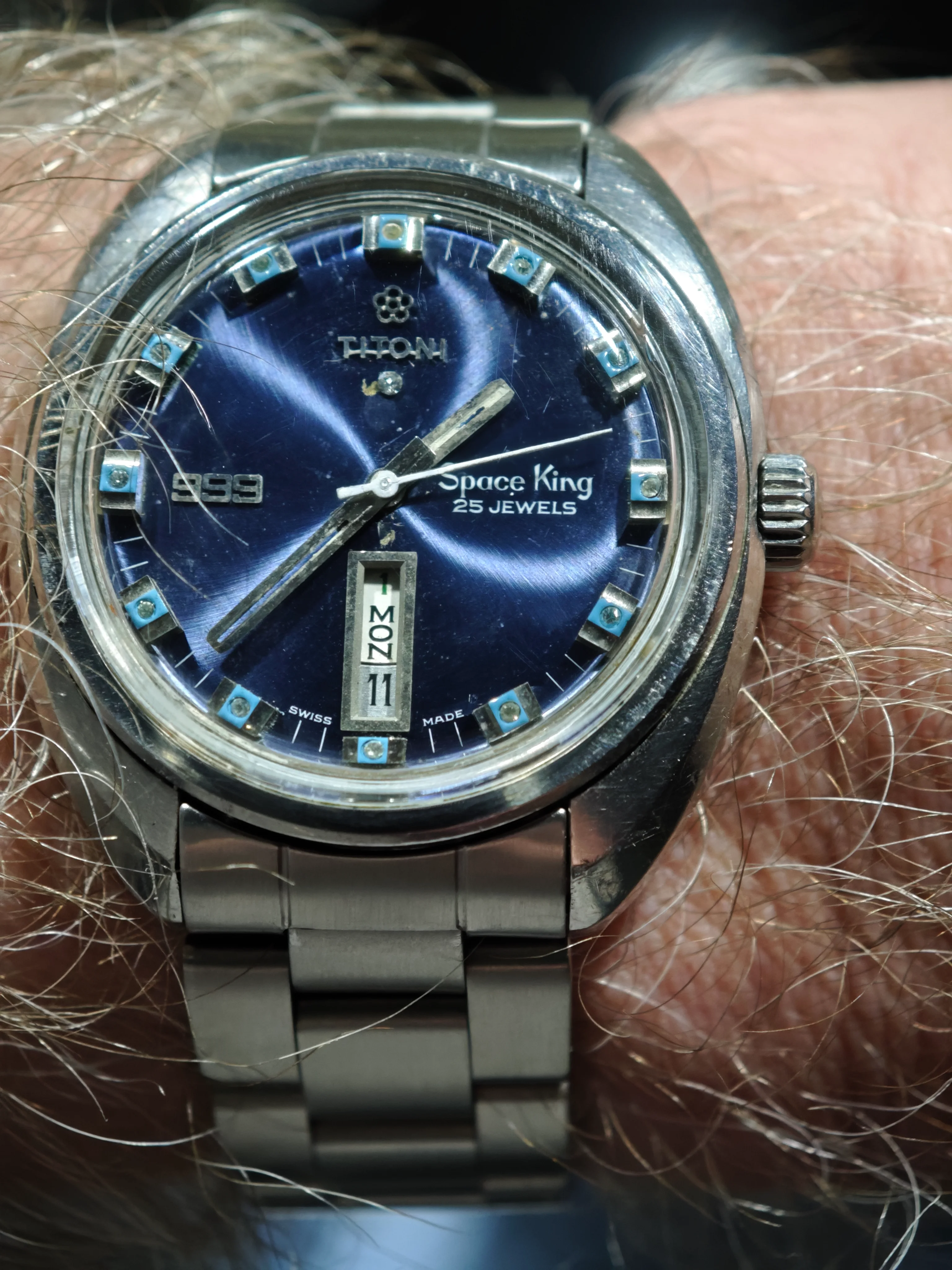 I don't know how it does it but this Space Kings dark blue dial just seems to shine when the light hits it commanding your attention.