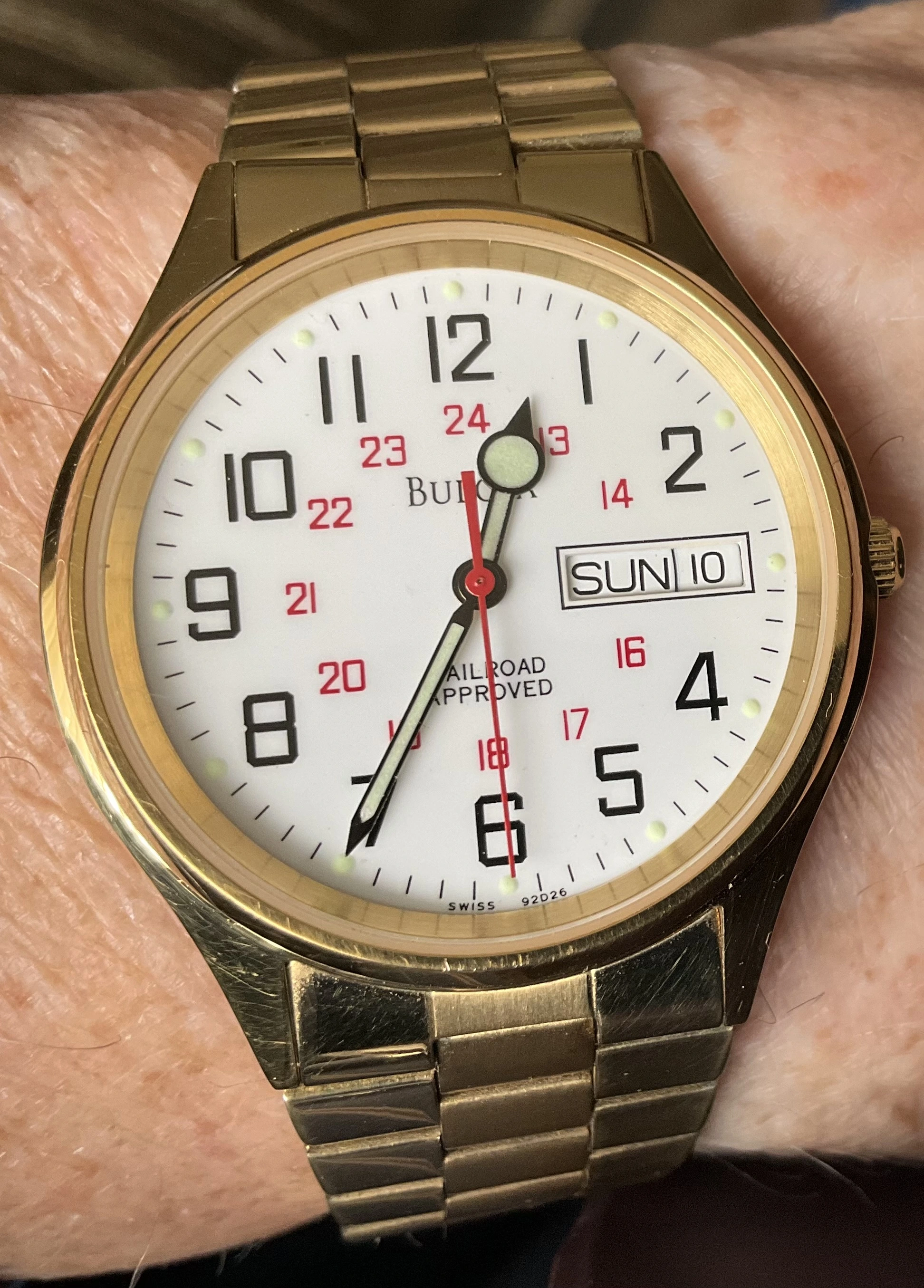 I posted this one a few days ago. My 27 year old quartz Bulova Railroader. Later that day I found it to be 5 minutes slow! I rarely wear it, so this was a surprise. I stripped it and cleaned on Saturday, and it has returned to being its customarily reliable self.