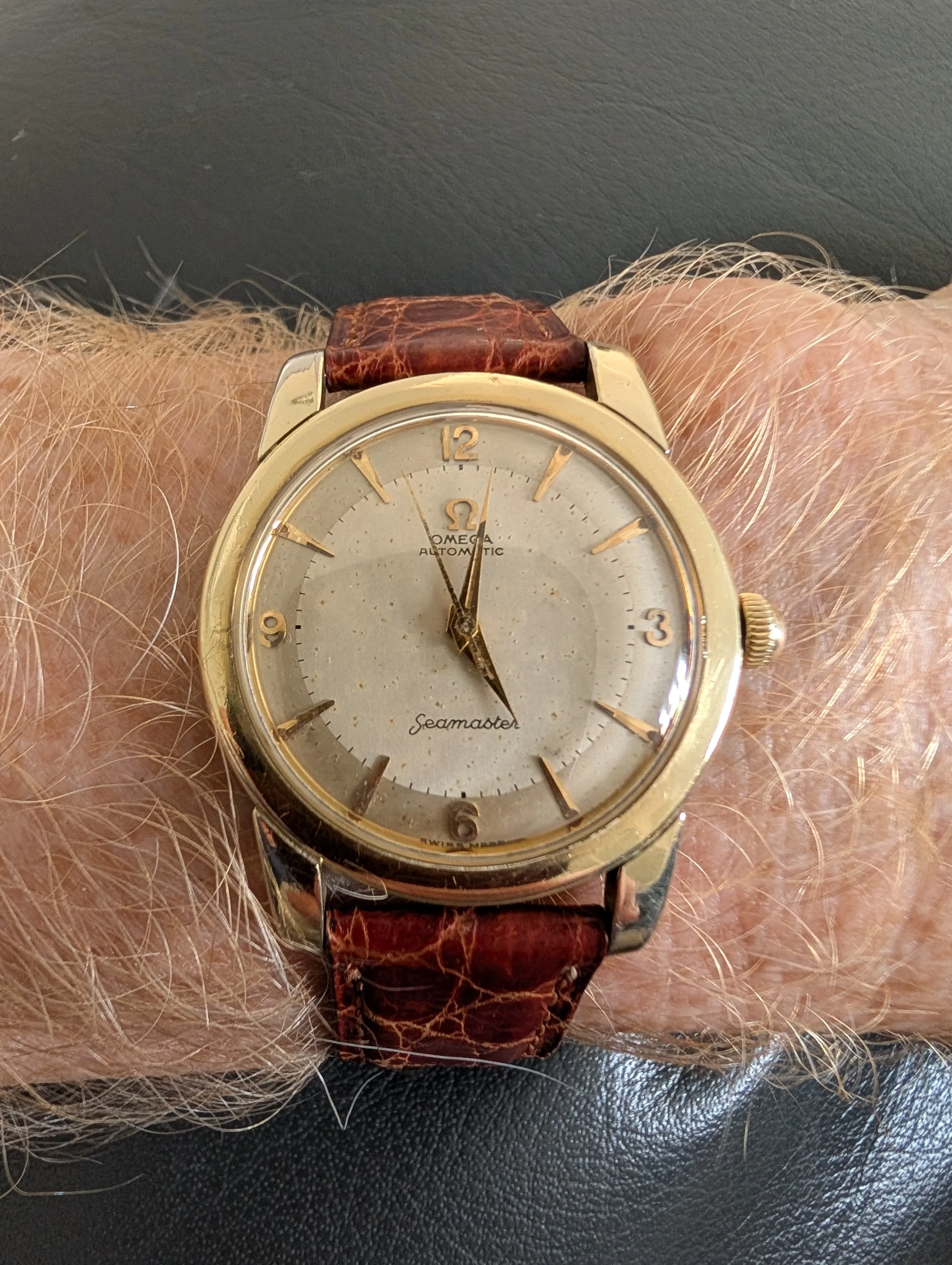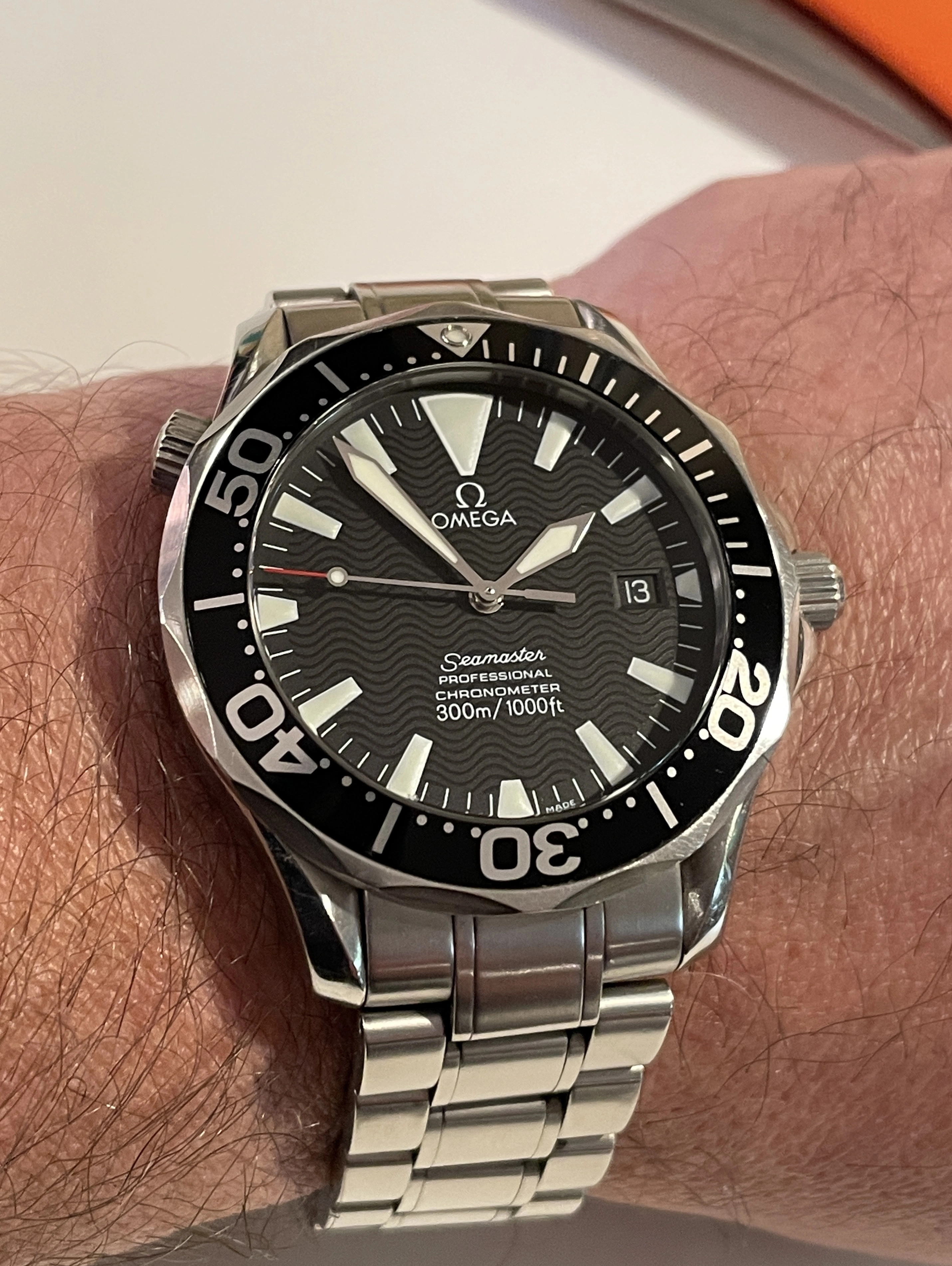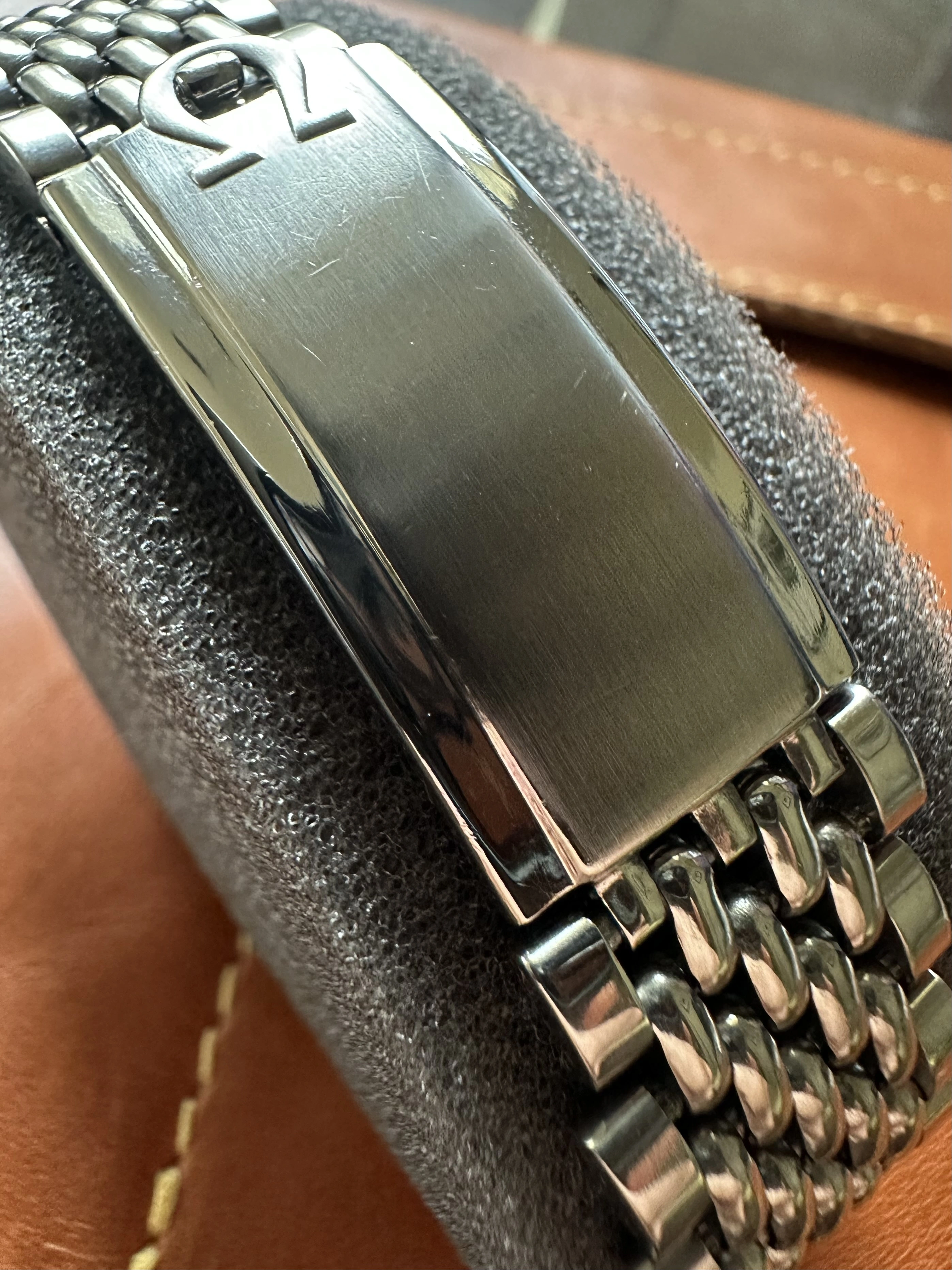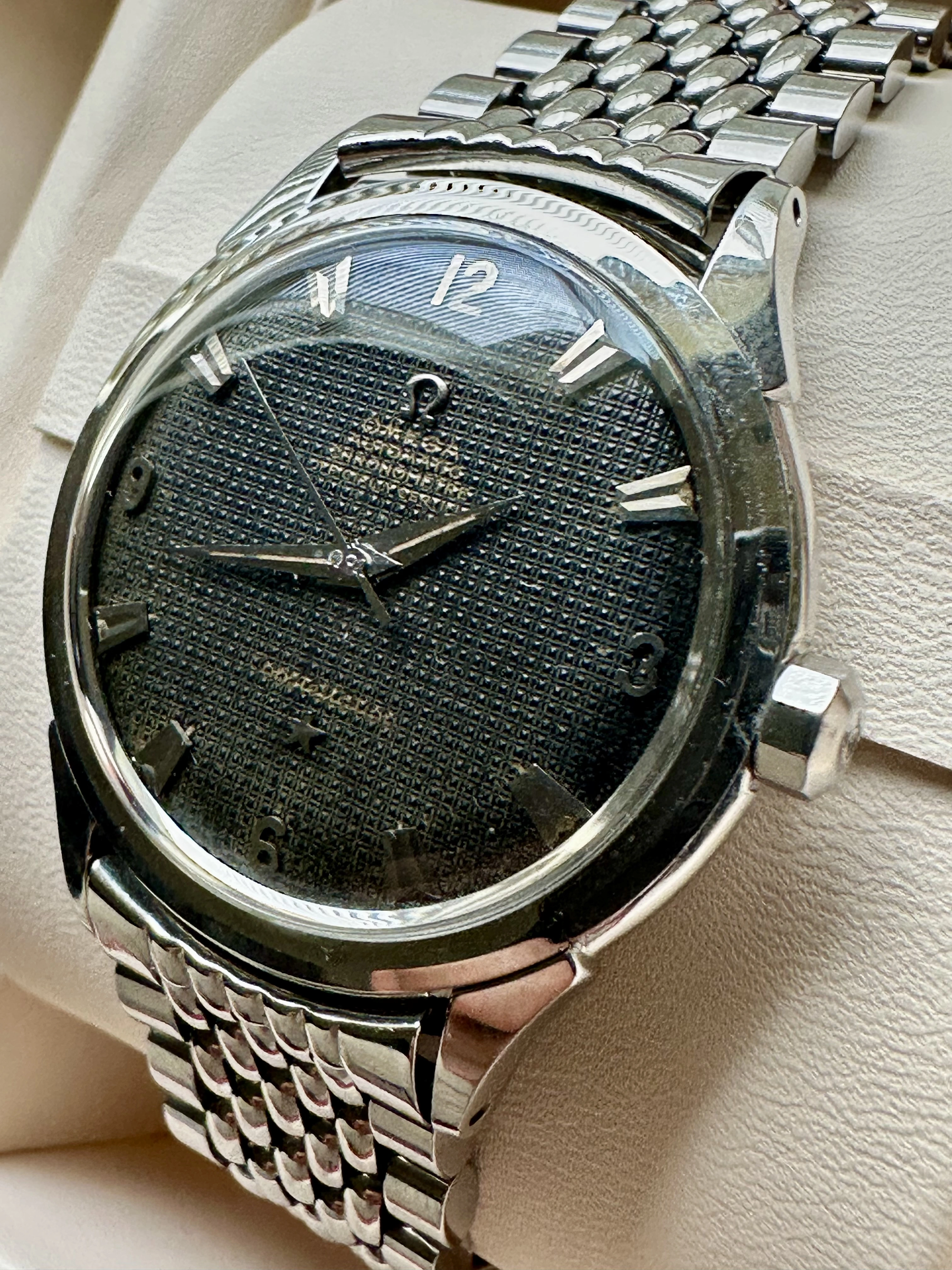 And finally, it’s finished, and it’s spectacular. Constellation 2652 with black hobnail dial and the first type of the Omega rice bracelet with the ratchet clasp.