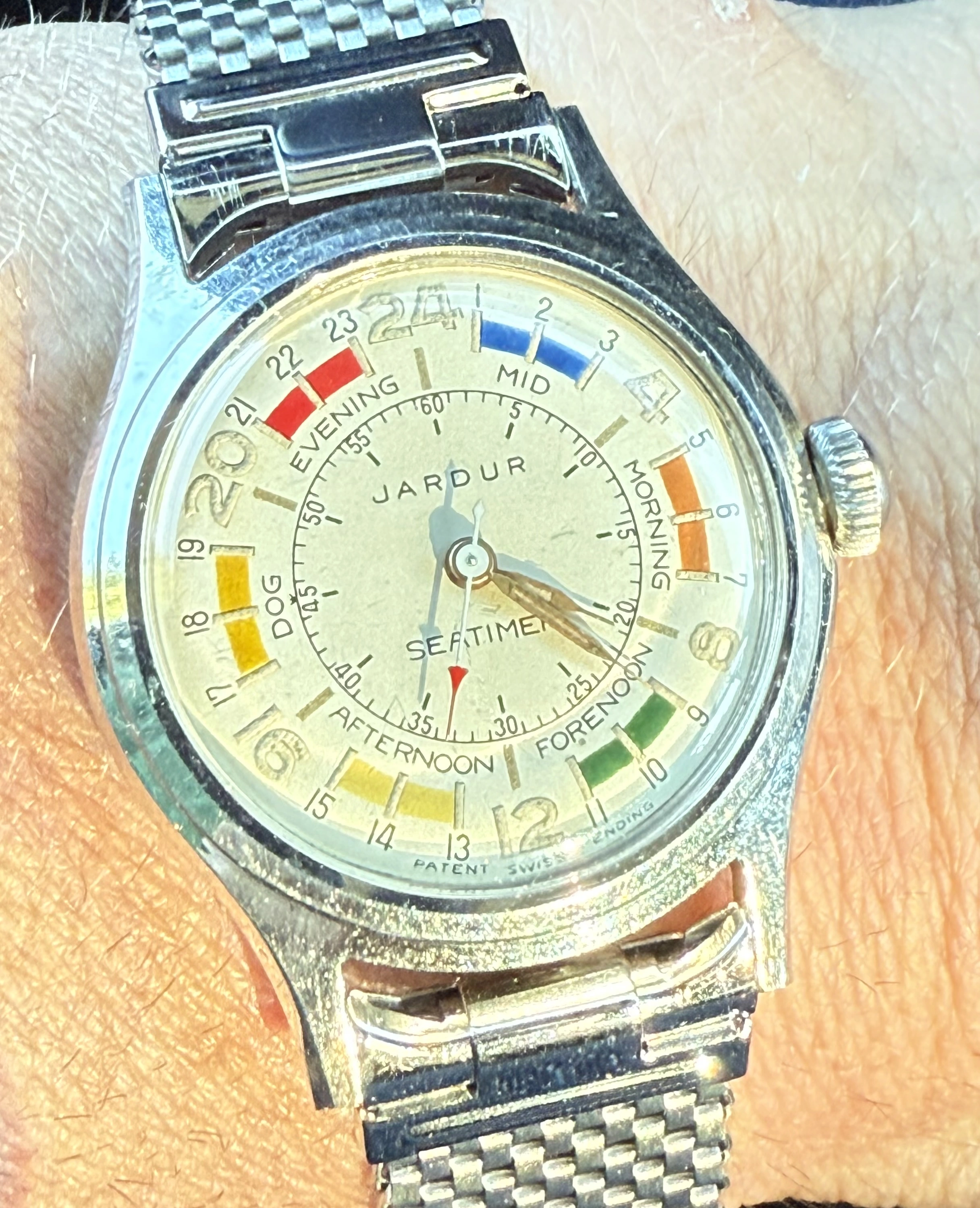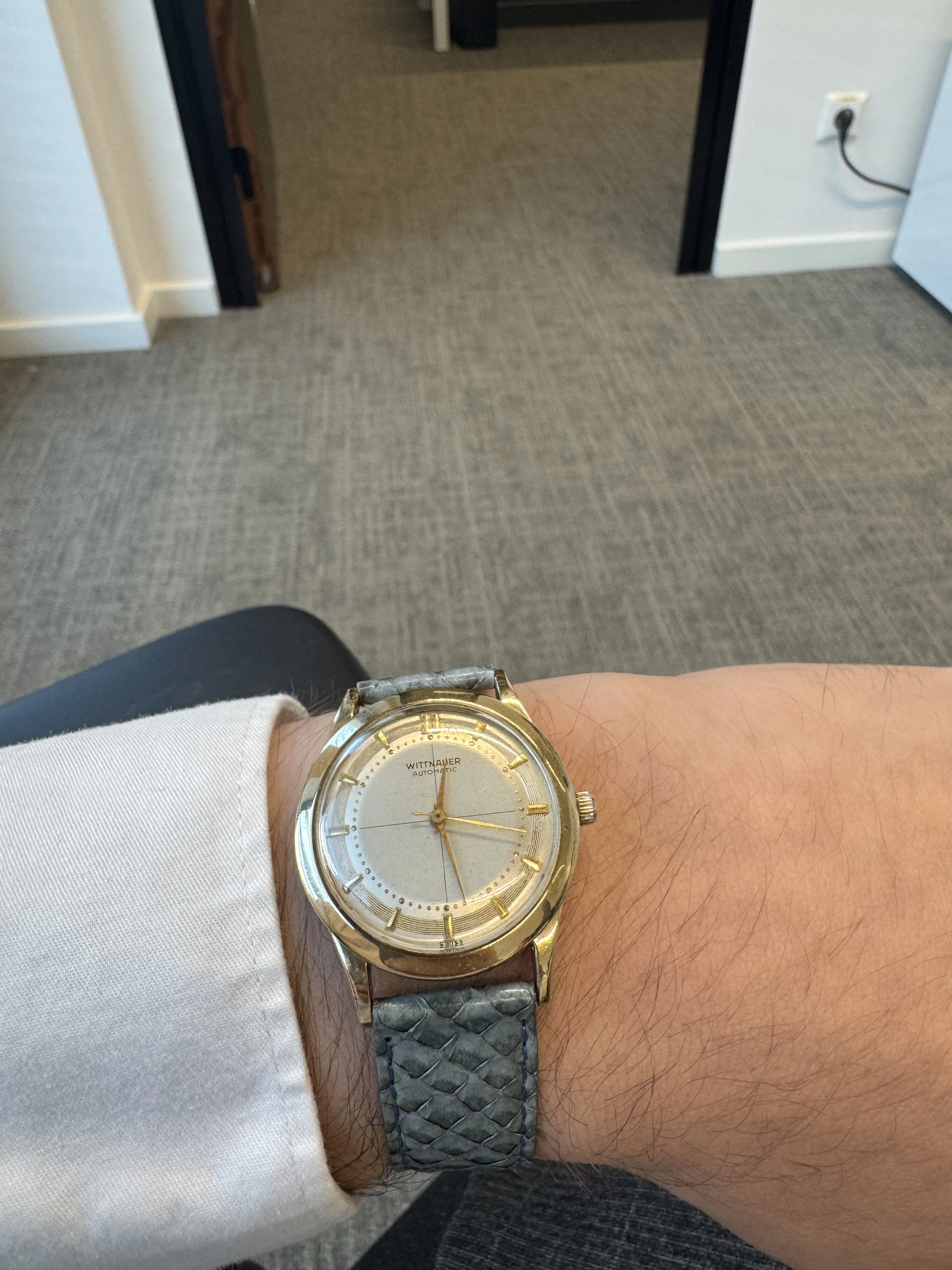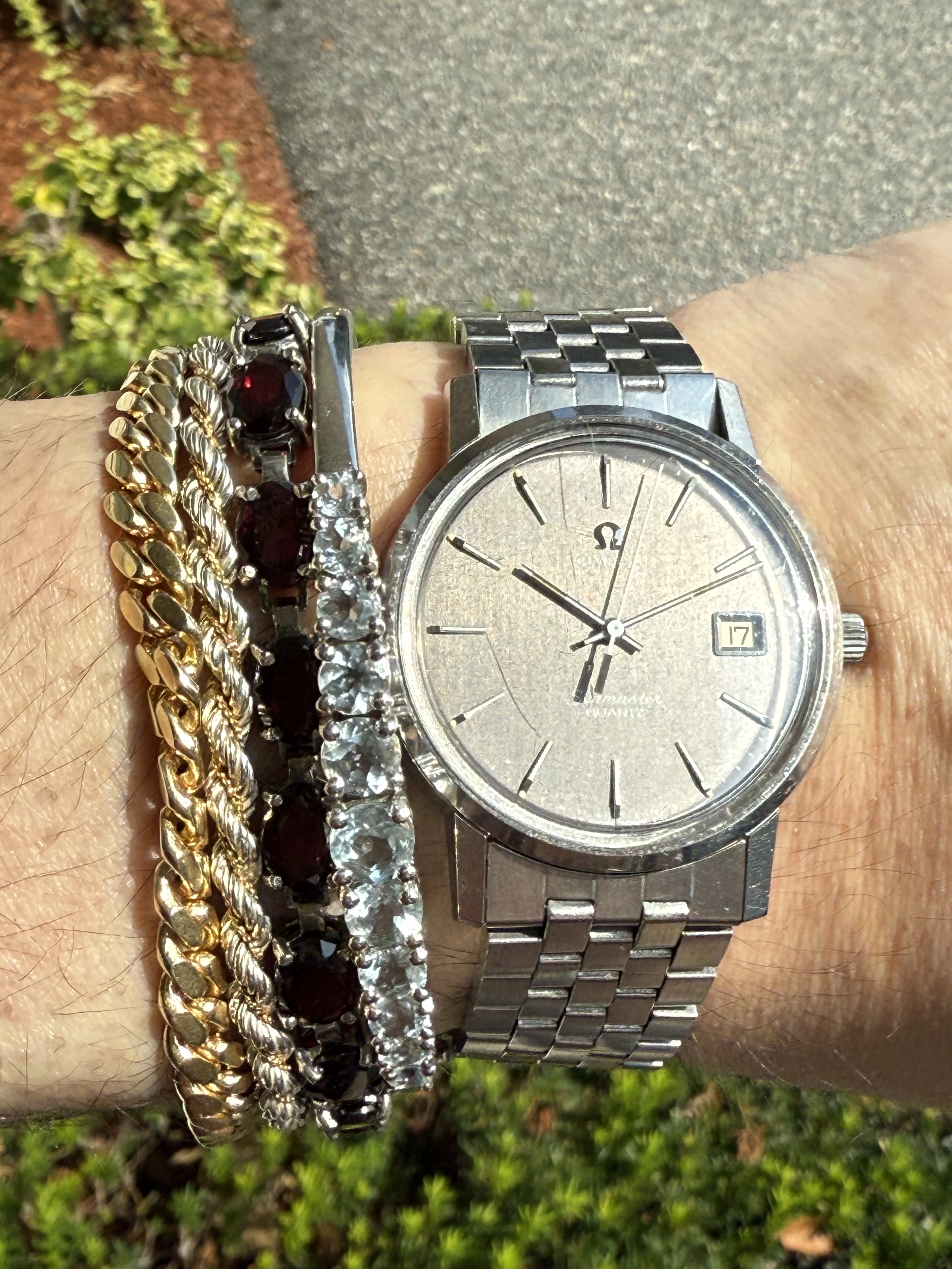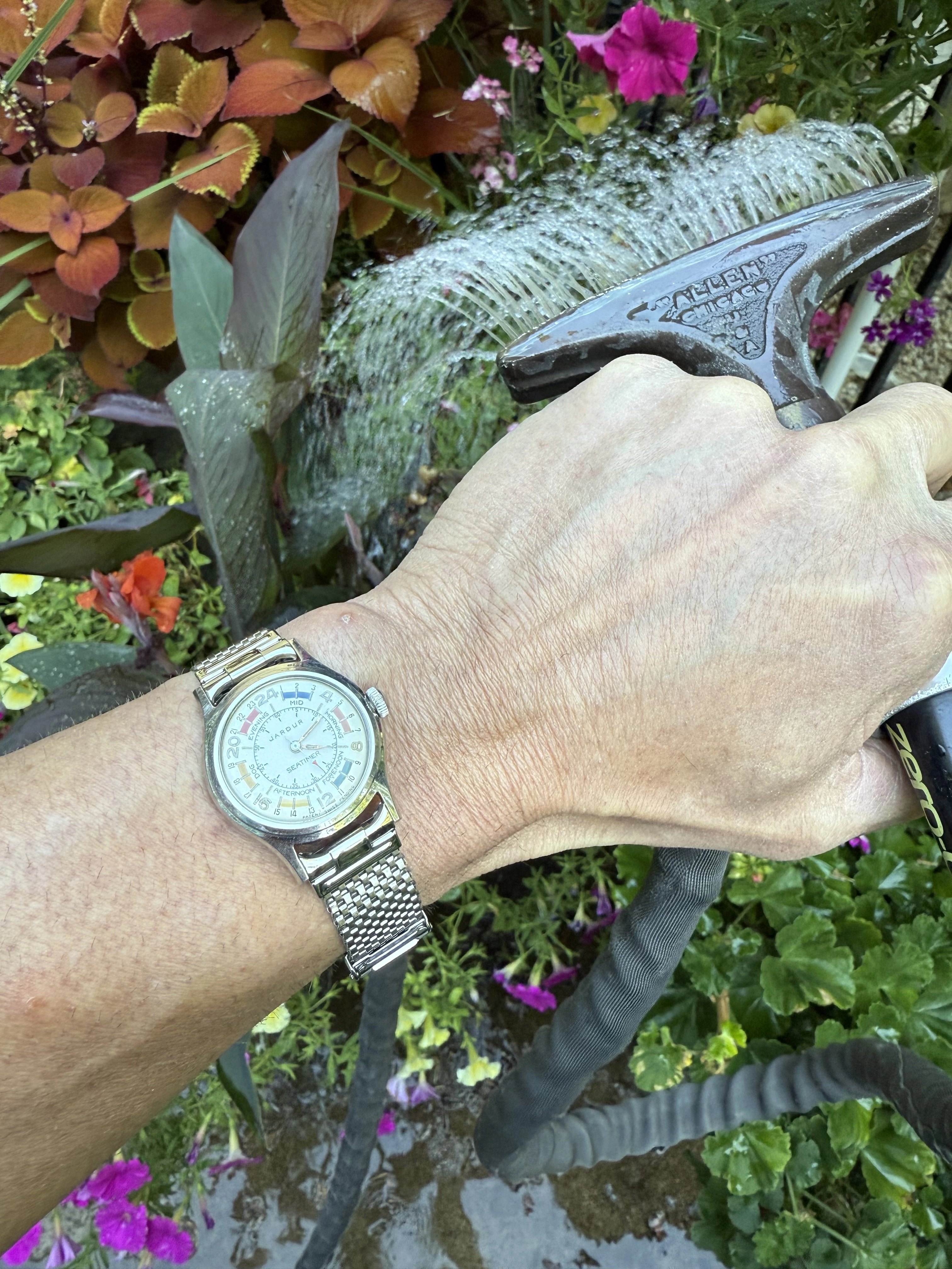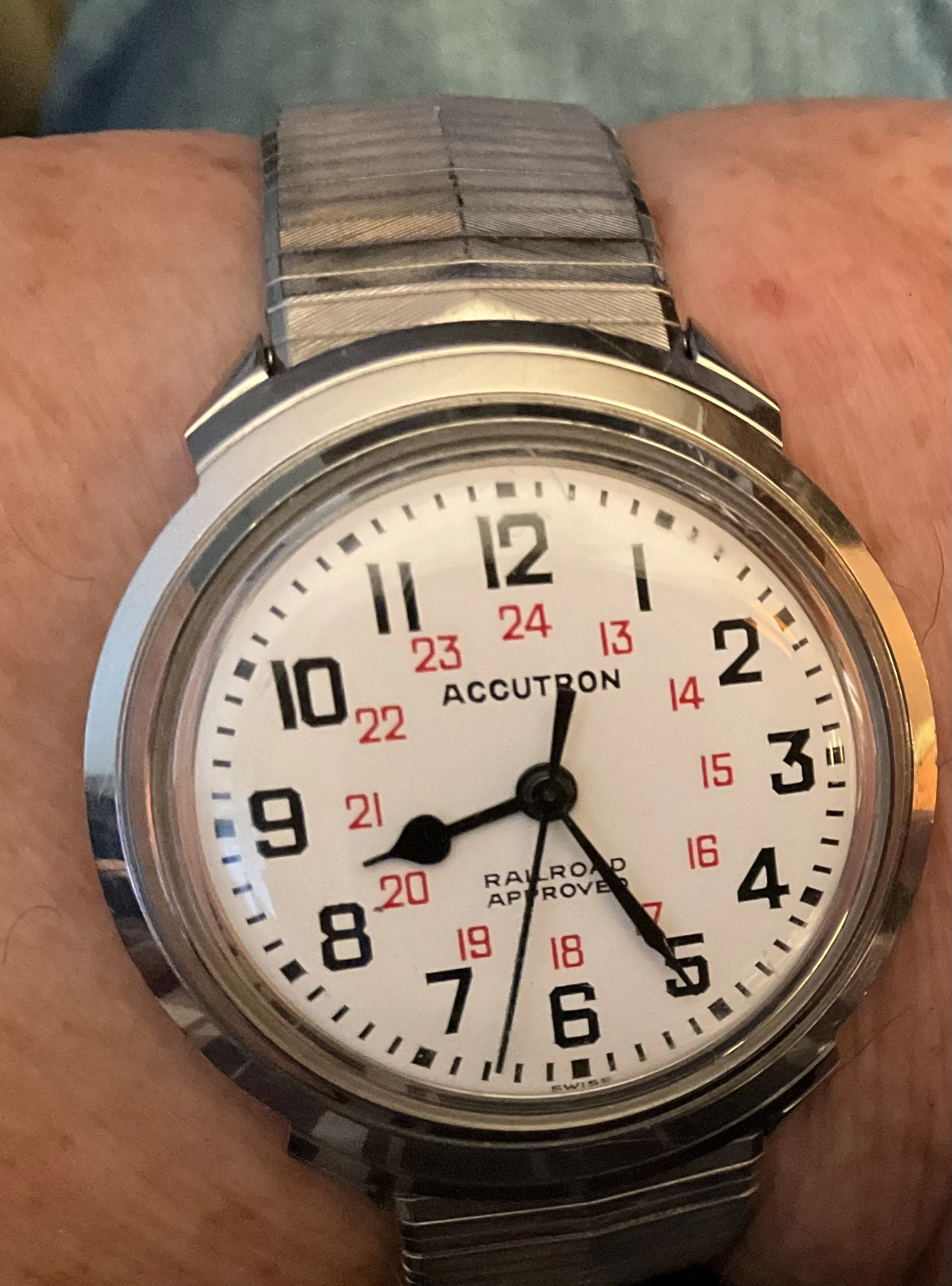 A group of us do an exhibit of pocket watches (mostly railroad grade and railroad approved) at train shows in our area, each year. One exhibit we do comprises railroad approved wrist watches by Bulova (Accutrons), Elgin, Rodania, and Hamilton Electric. Time to resurrect the Accutrons to evaluate performance, and make certain they have new cells. This Accutron 214 Railroader in from 1968. I acquired it in a trade about 30 years ago. The watch has hardly been worn and is virtually as new. Last time it was exhibited (April this year), it was set to time. Today, when I put it on, it is within SECONDS of the correct time, without resetting.