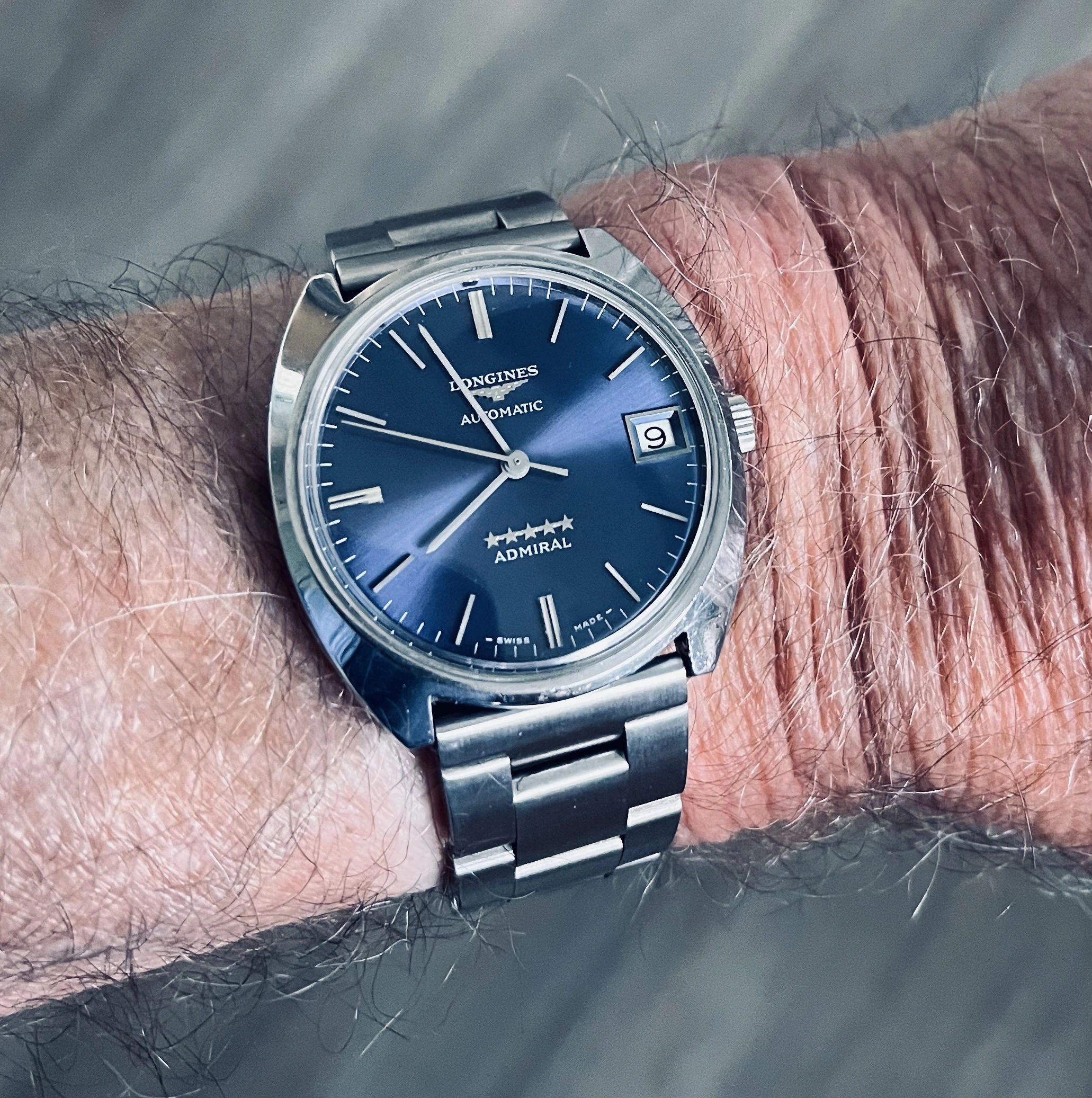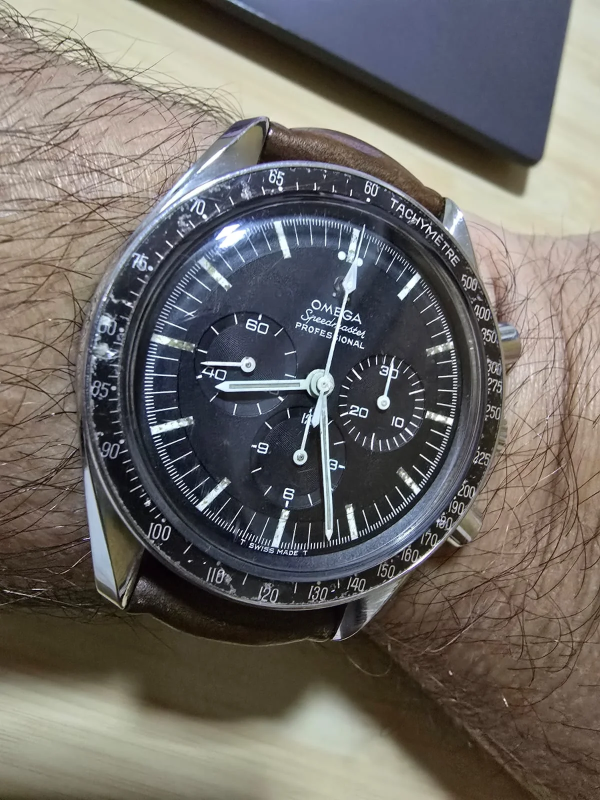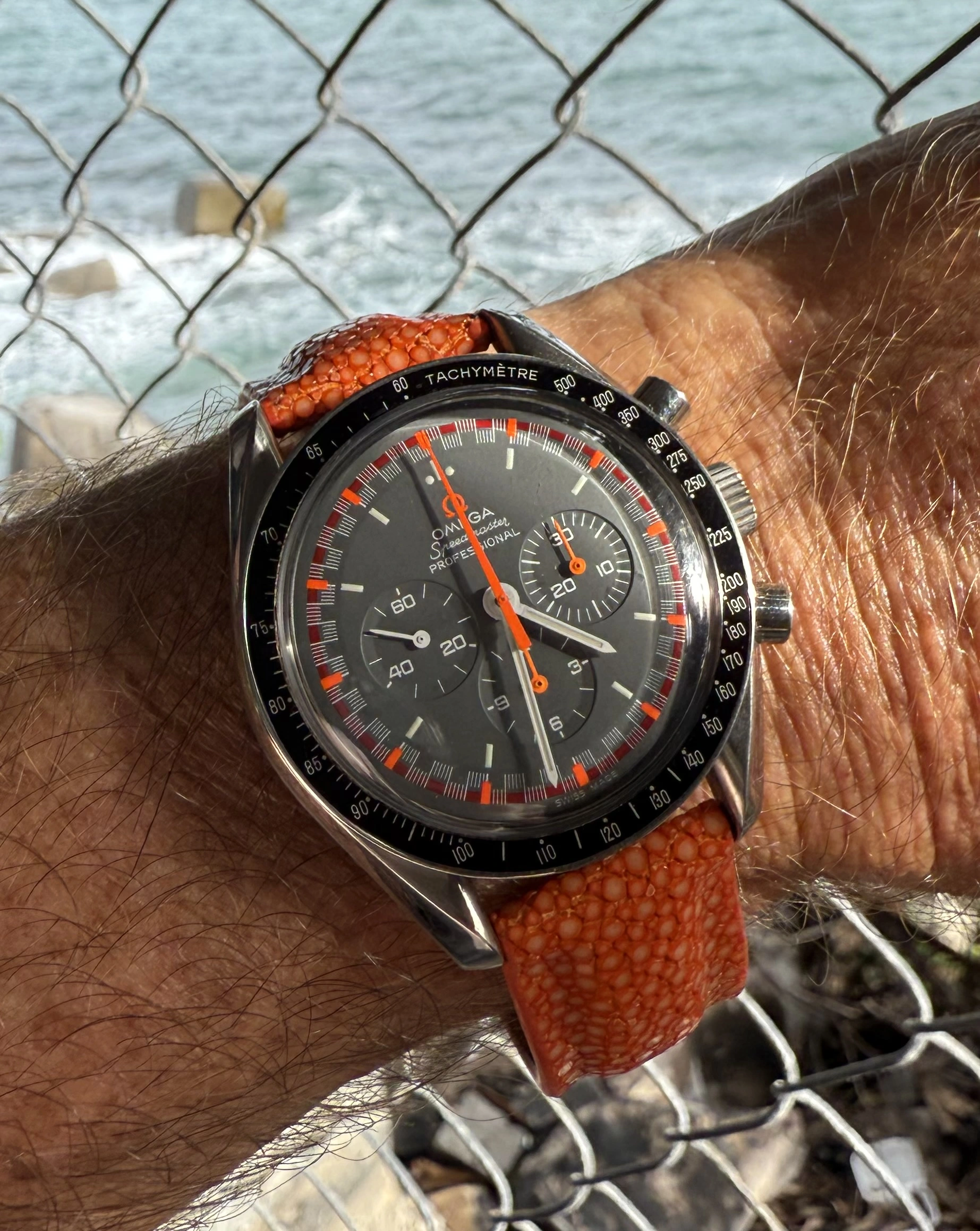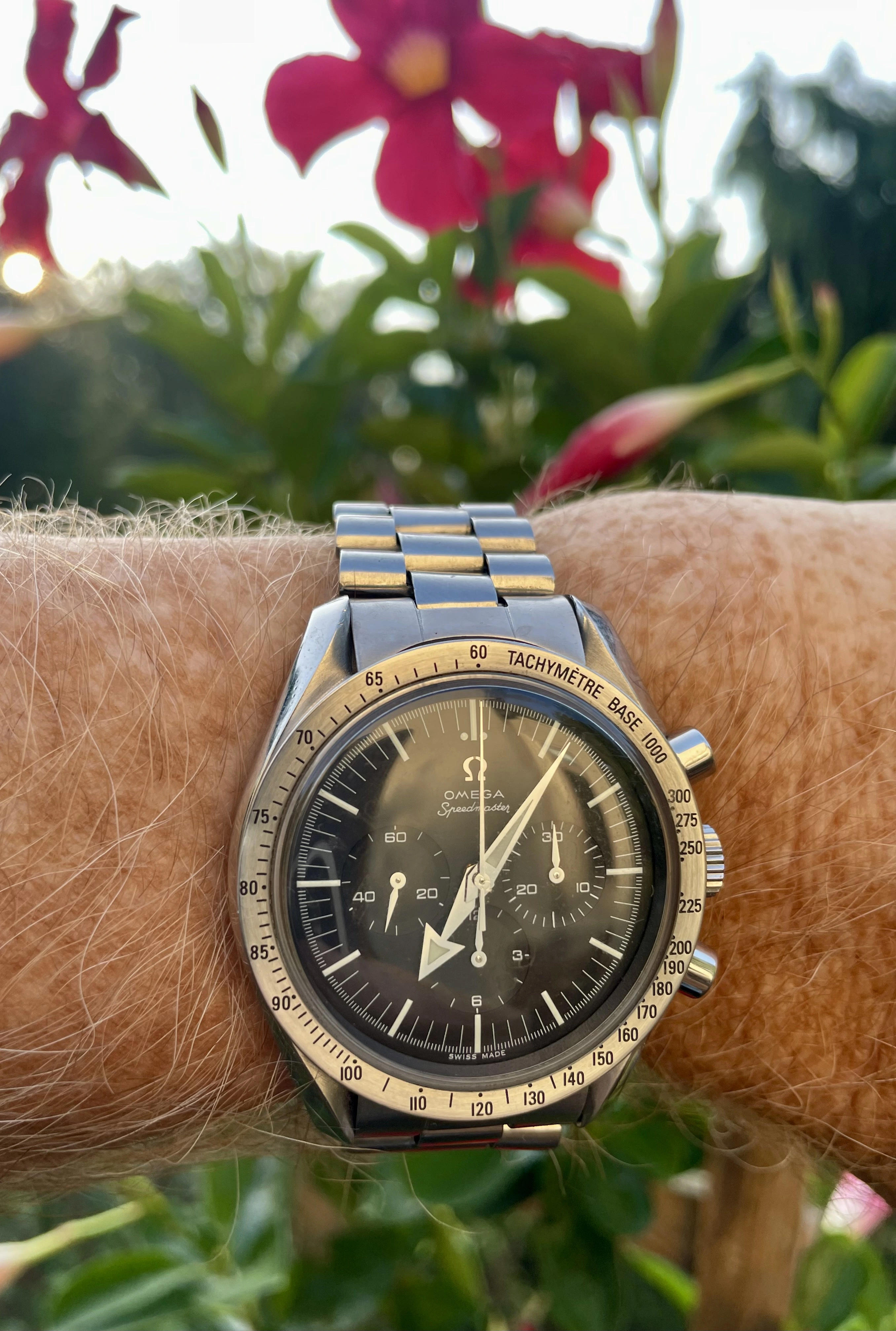 Most of my collection is tied up, organized for our watch exhibit this coming week end. So I’ll wear the Speedmaster, on accounta it’s Tuesday, tomorrow. I realize it is Tuesday already, for many of you. One owner, (me), 35 years old. The 345.0808 was the first Speedmaster to be made with a sapphire back (1980.) Hence the gold plated movement.