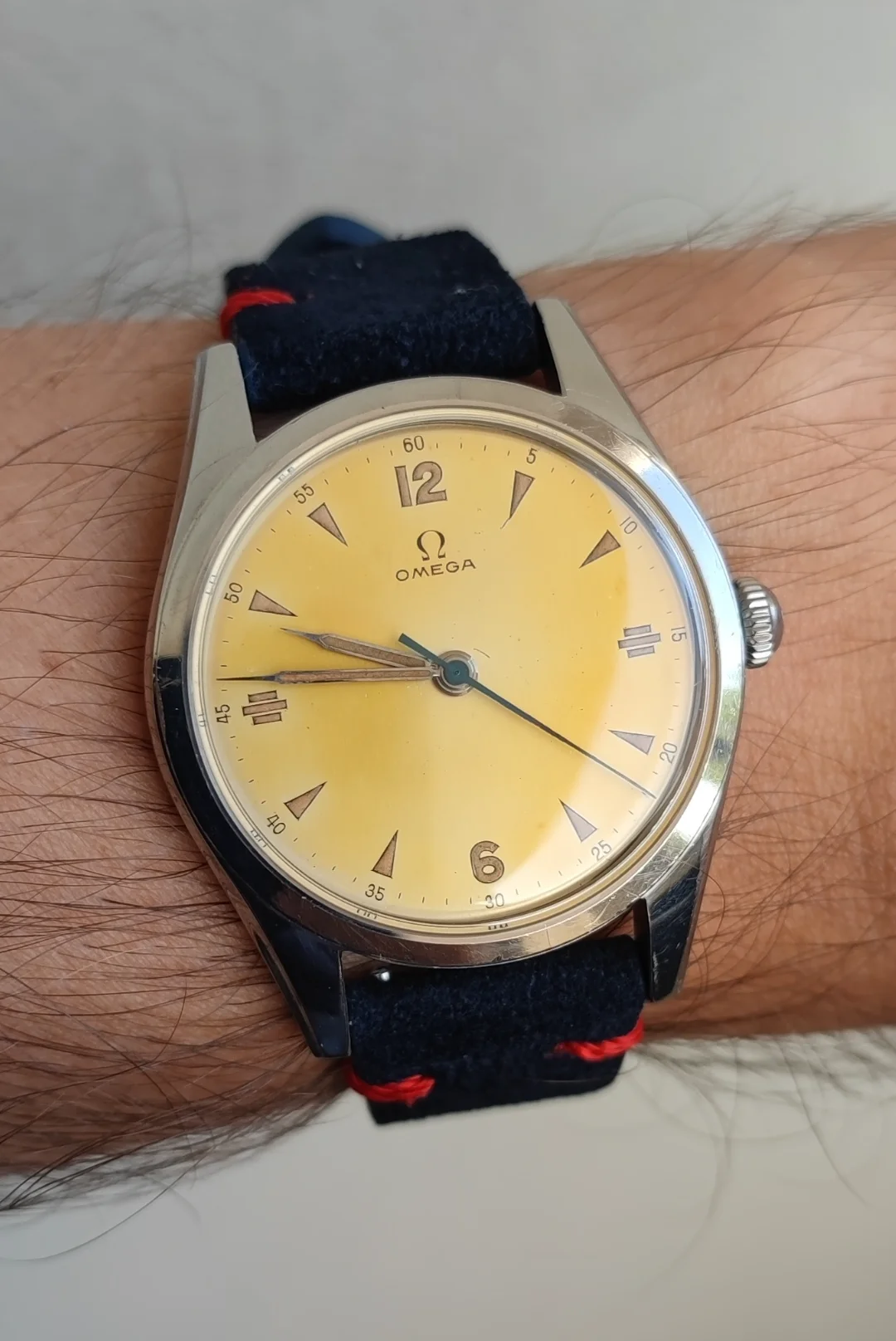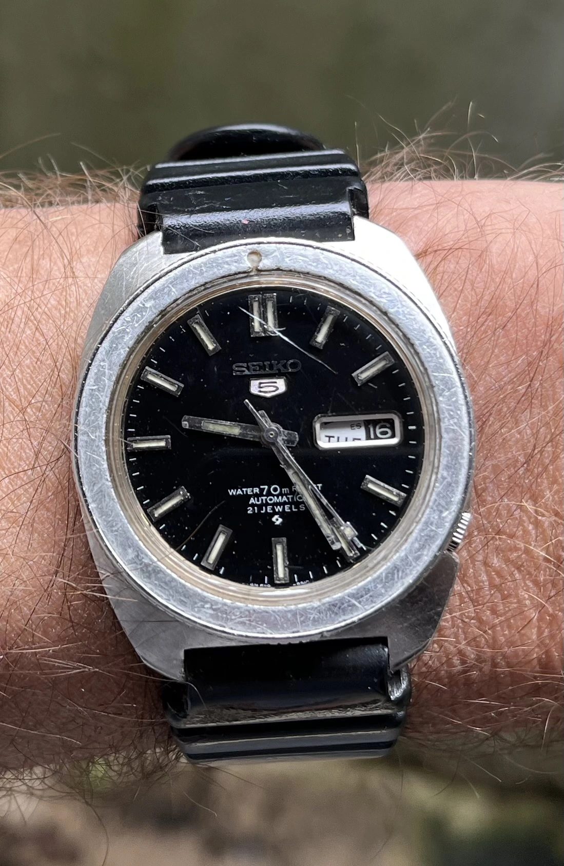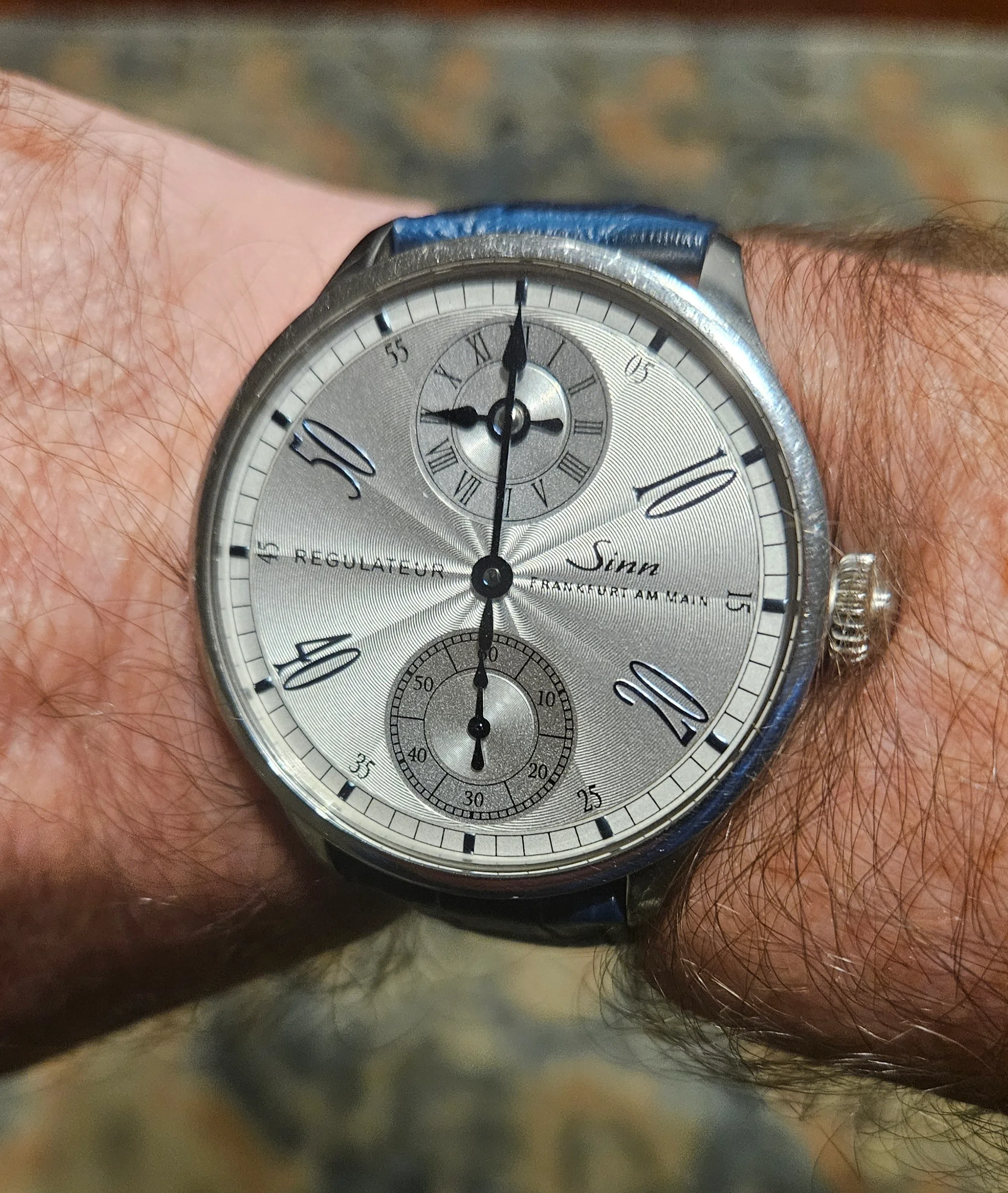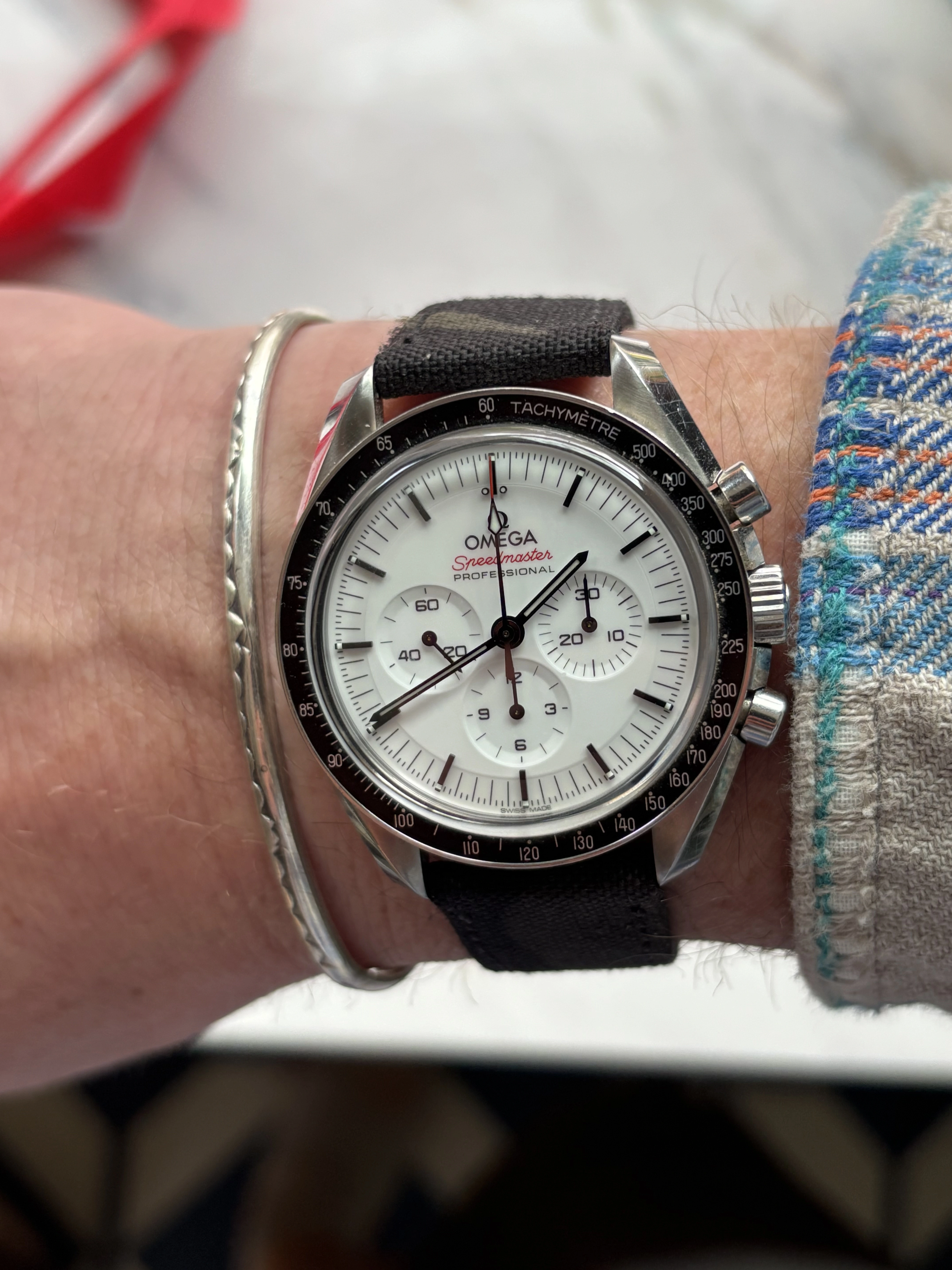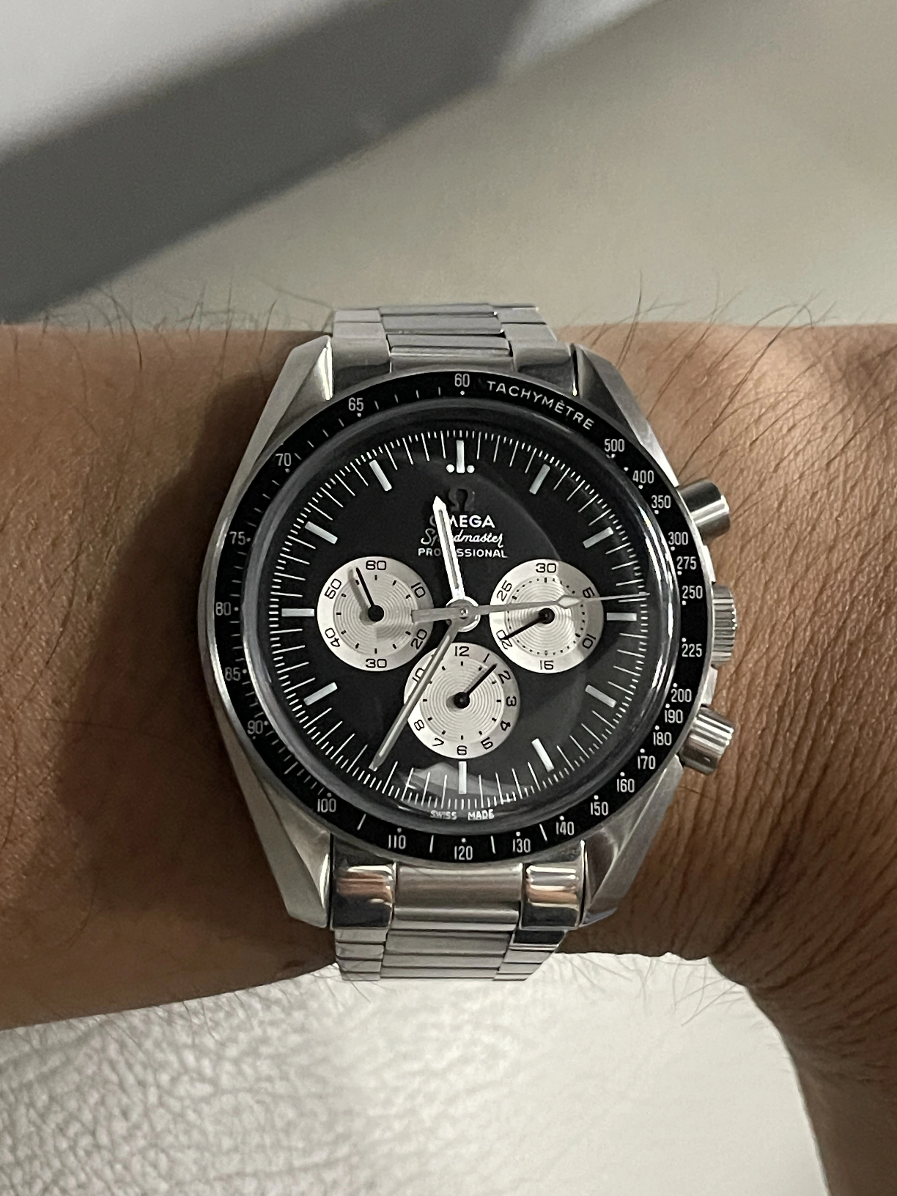 Most of my collection is tied up, organized for our watch exhibit this coming week end. So I’ll wear the Speedmaster, on accounta it’s Tuesday, tomorrow. I realize it is Tuesday already, for many of you. One owner, (me), 35 years old. The 345.0808 was the first Speedmaster to be made with a sapphire back (1980.) Hence the gold plated movement.