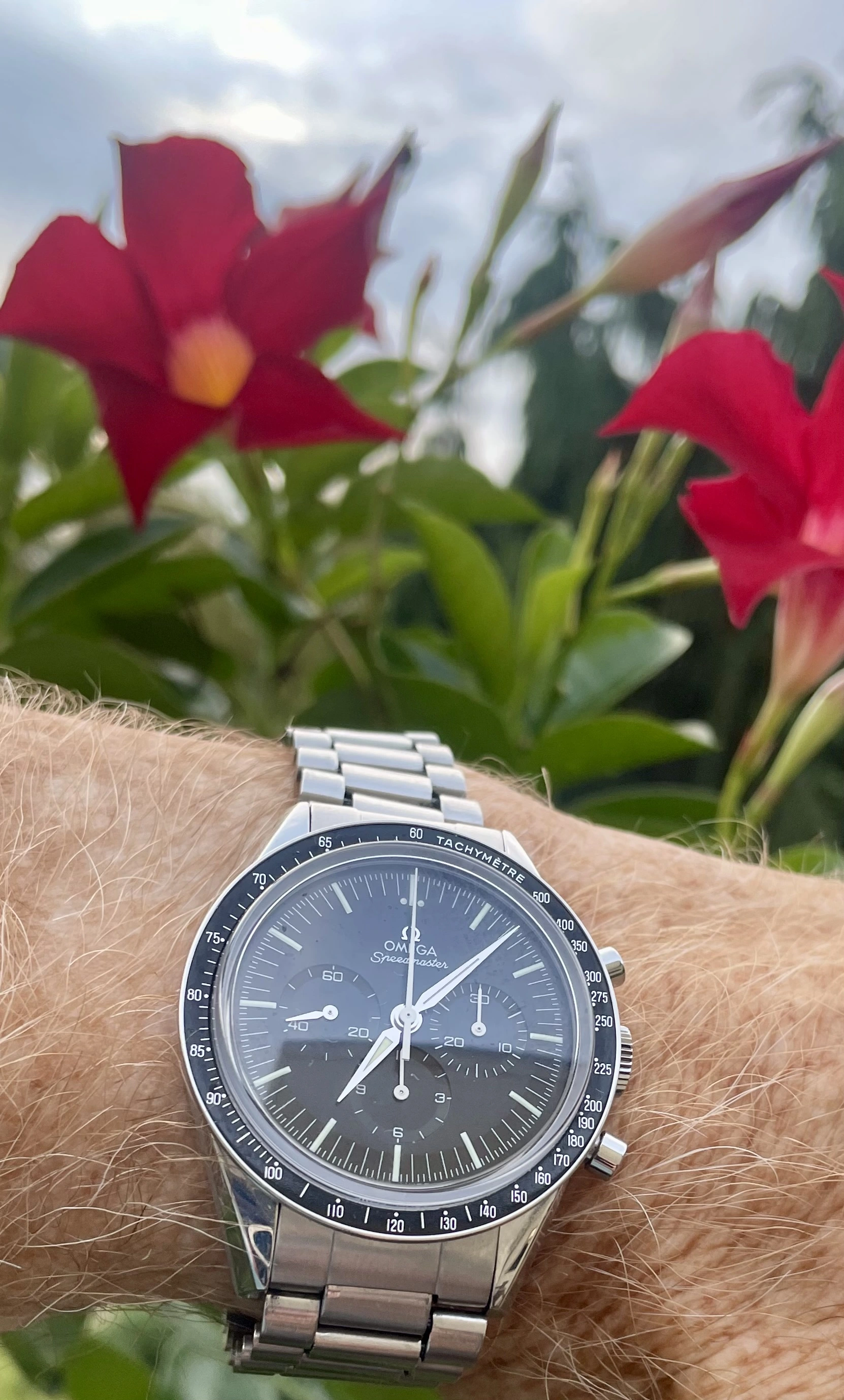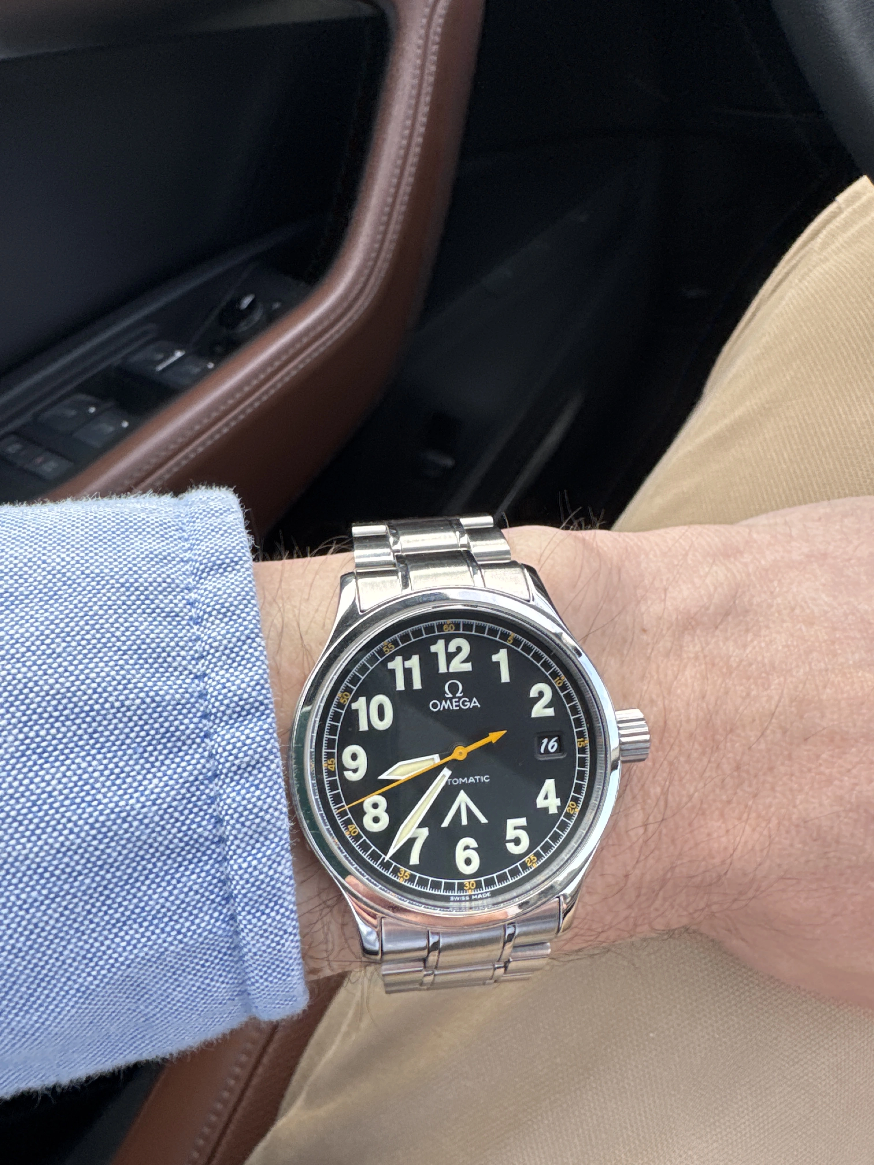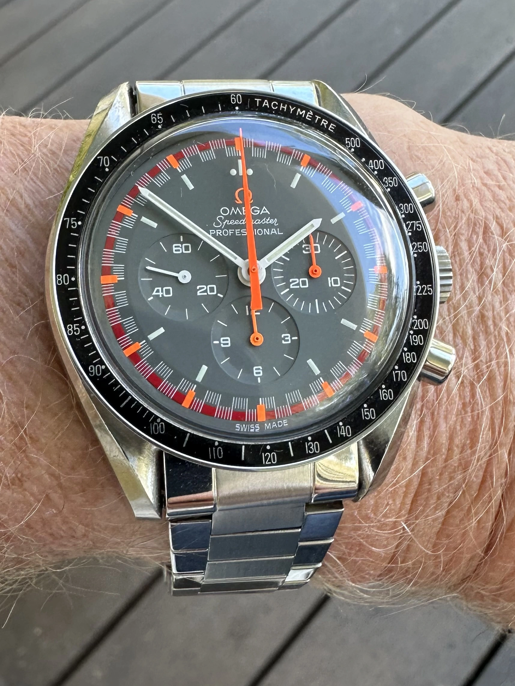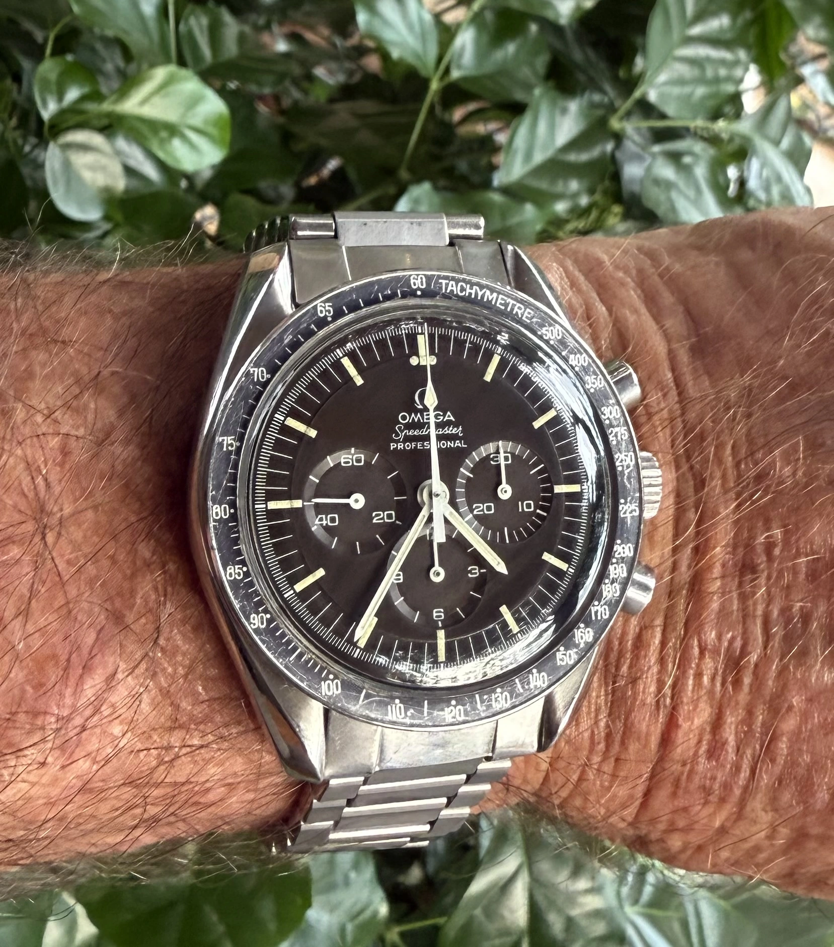 My 145.022 from 1969 with a JR dial/hands and bezel swap done a few years back. I first had it on a brown leather strap which looked “meh” at best. A maddening color mash-up… Then on to a Forstner mesh which was a good improvement. But I just now fitted the repro flat link bracelet, and it really brings it all together as a design “package” IMHO. Happy Speedy Tuesday.